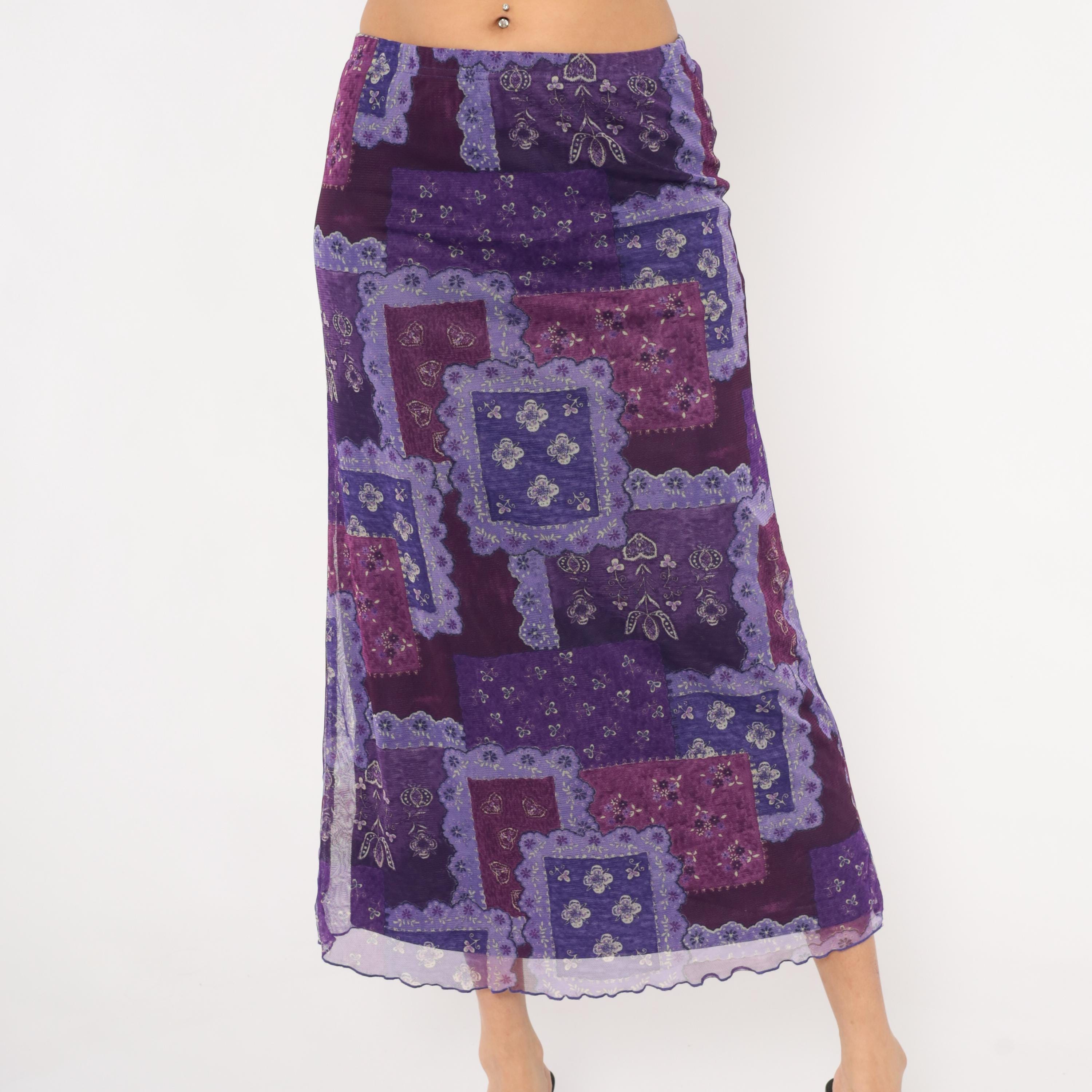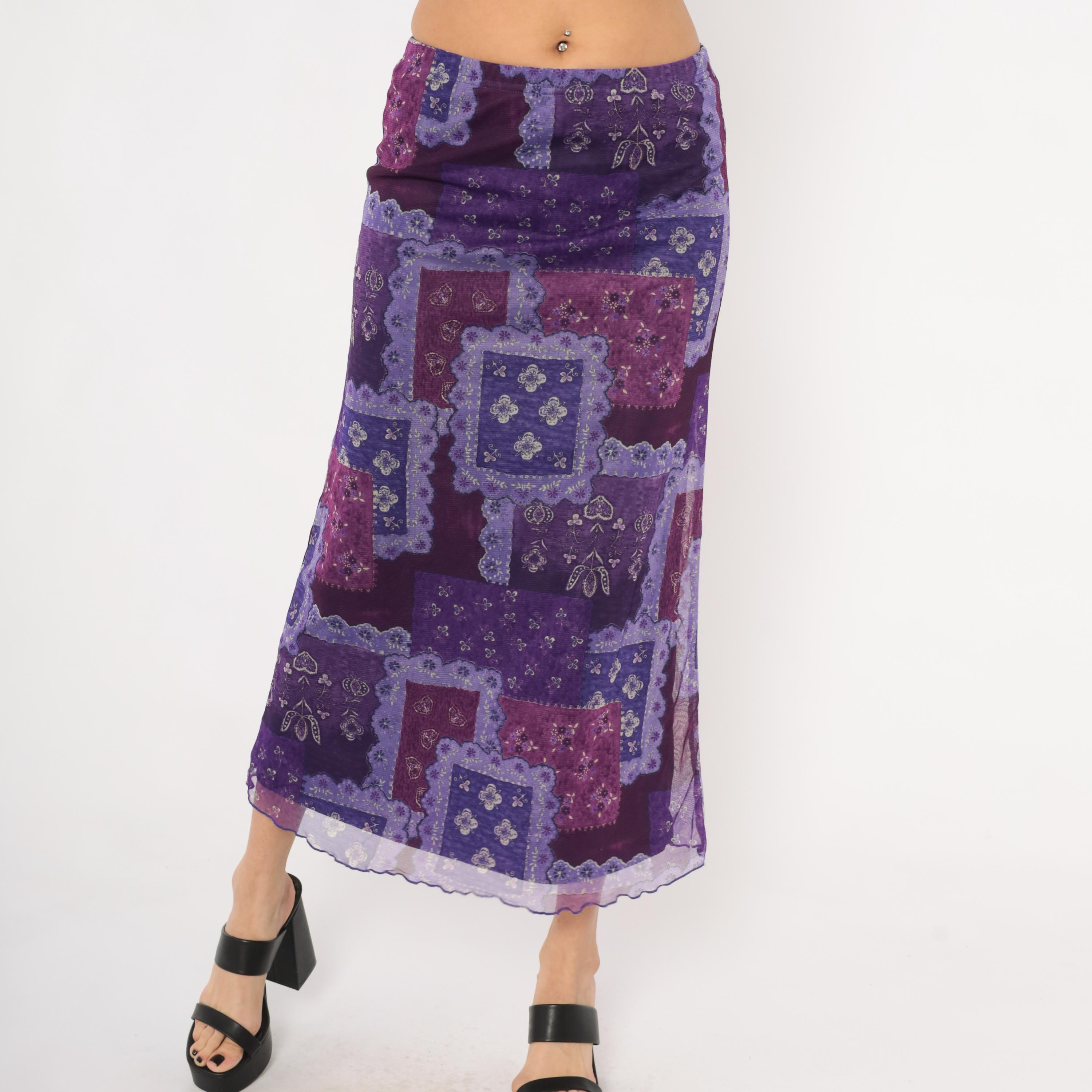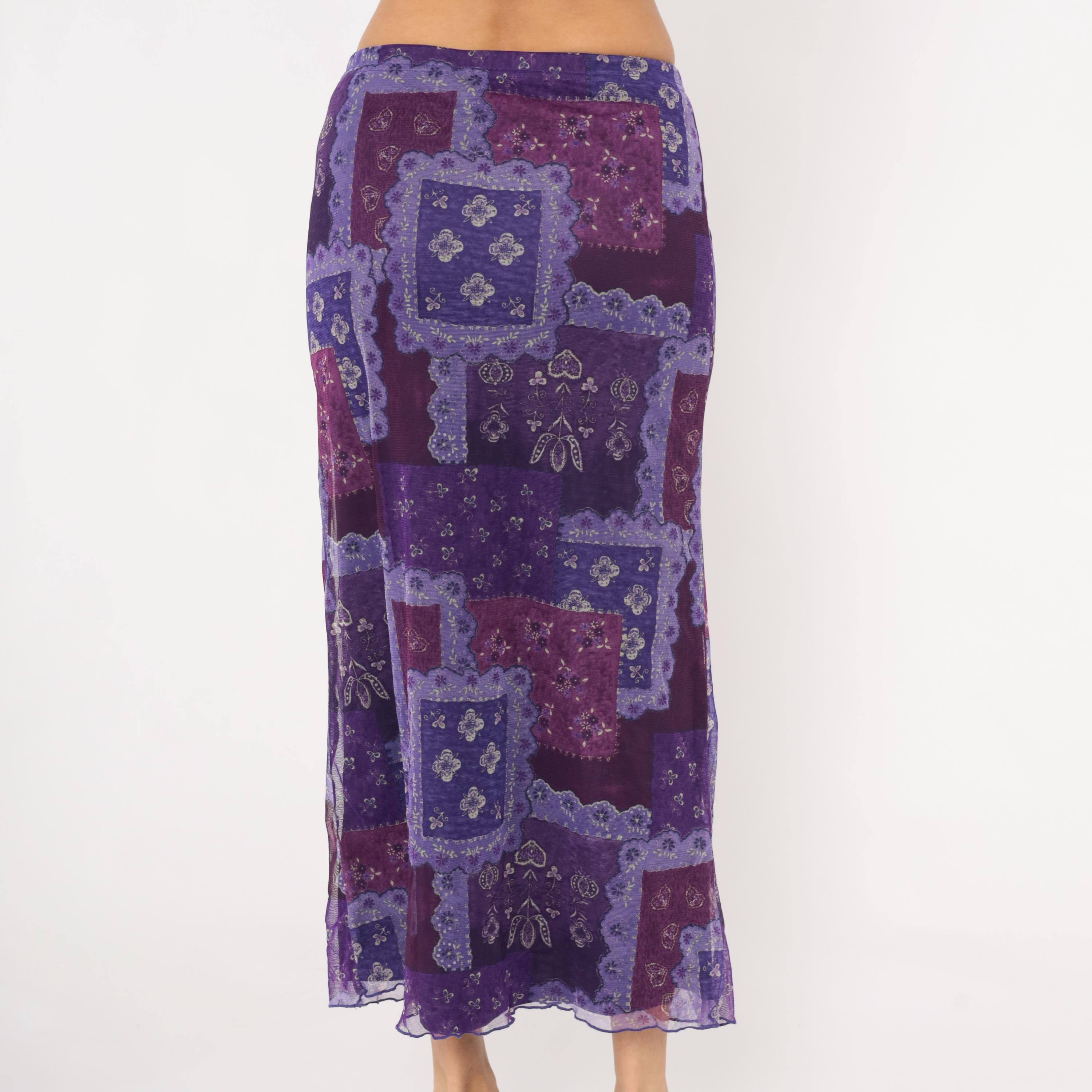 90s purple patchwork-print maxi skirt from Zoey with a bandana-inspired pattern in layered shades of violet, lavender, plum, and magenta. Sheer mesh overlay with a lettuce-edge hem and elastic waistband.