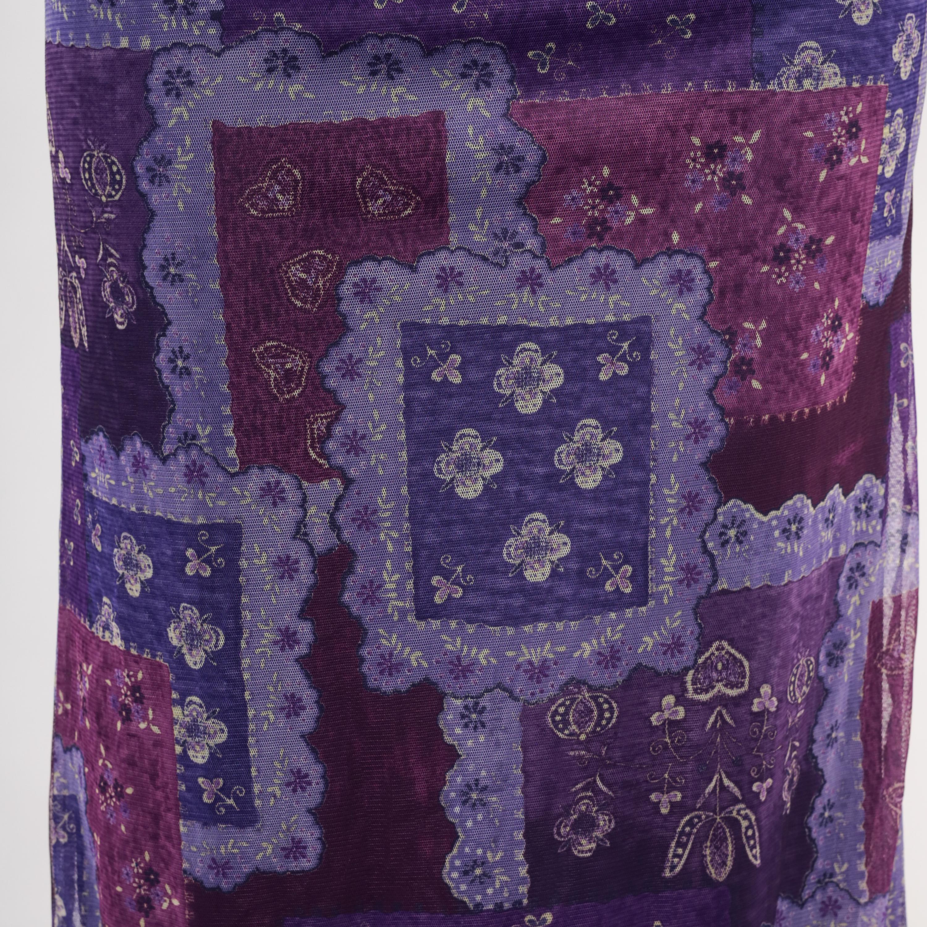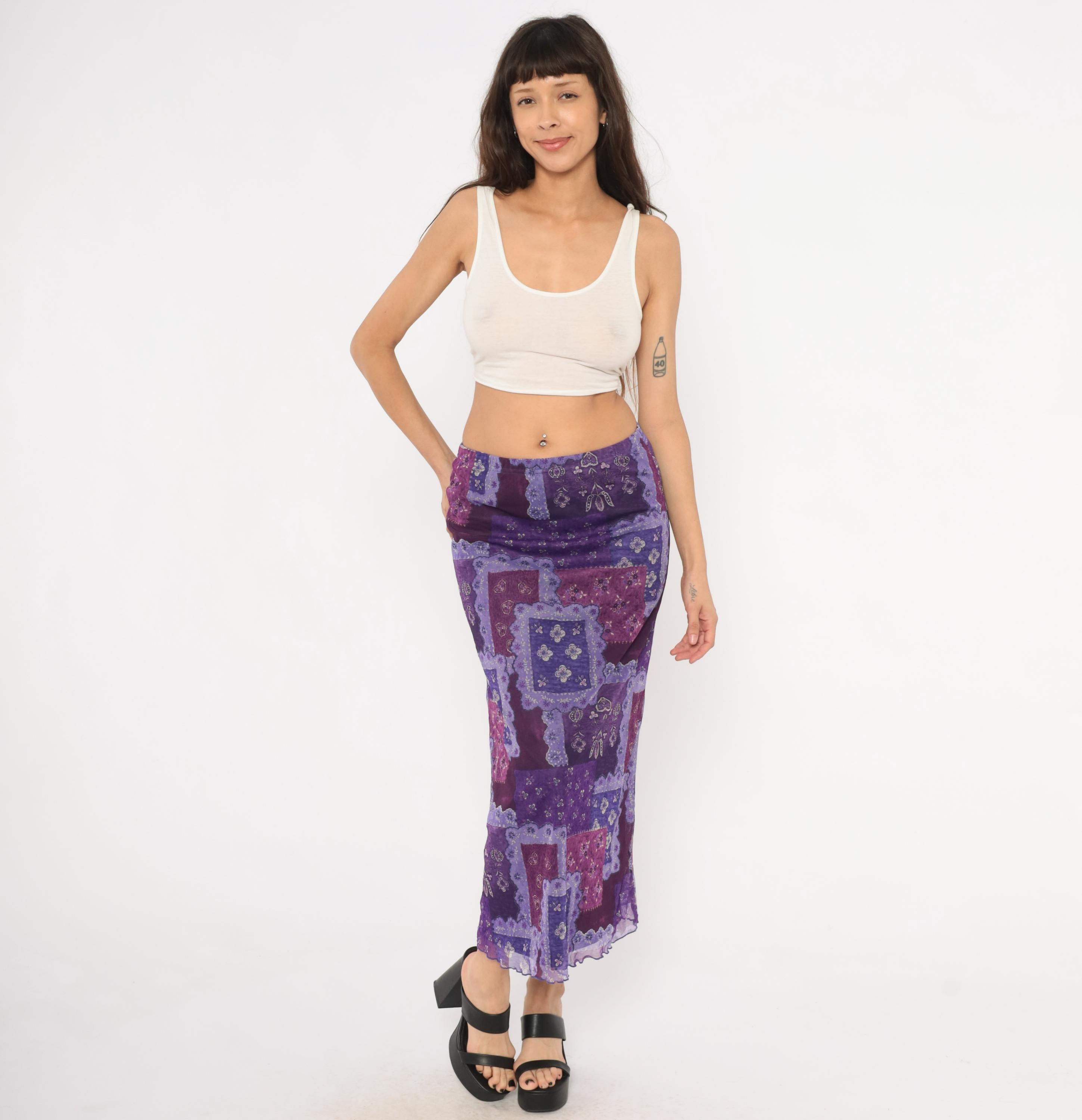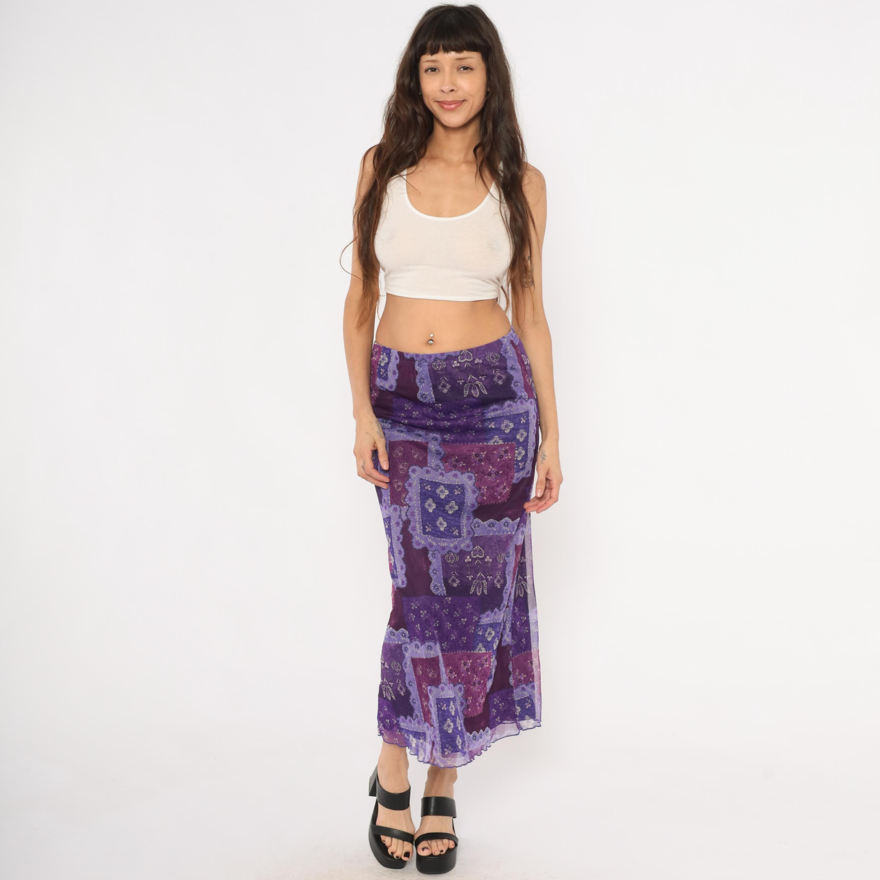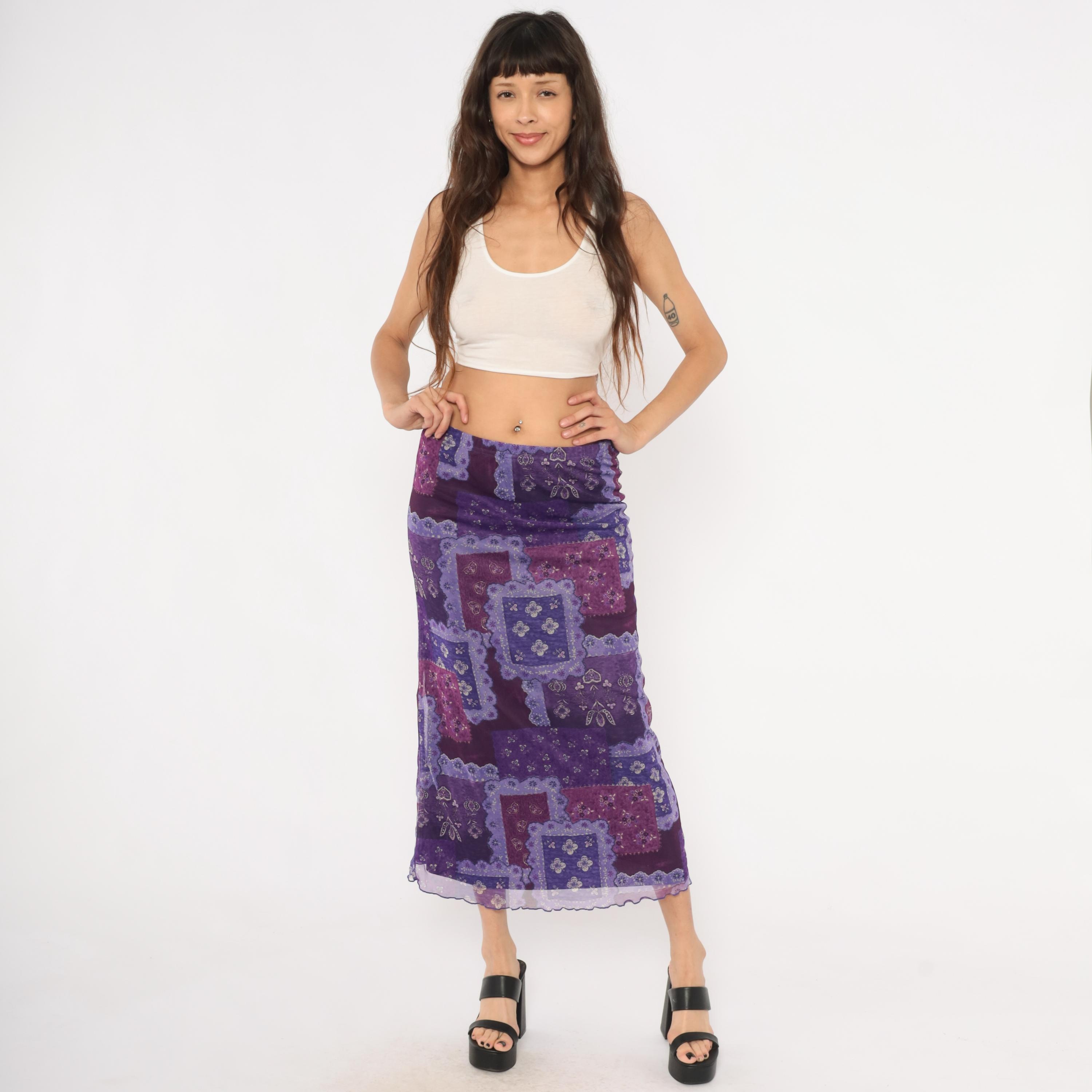 90s purple patchwork-print maxi skirt from Zoey with a bandana-inspired pattern in layered shades of violet, lavender, plum, and magenta. Sheer mesh overlay with a lettuce-edge hem and elastic waistband.