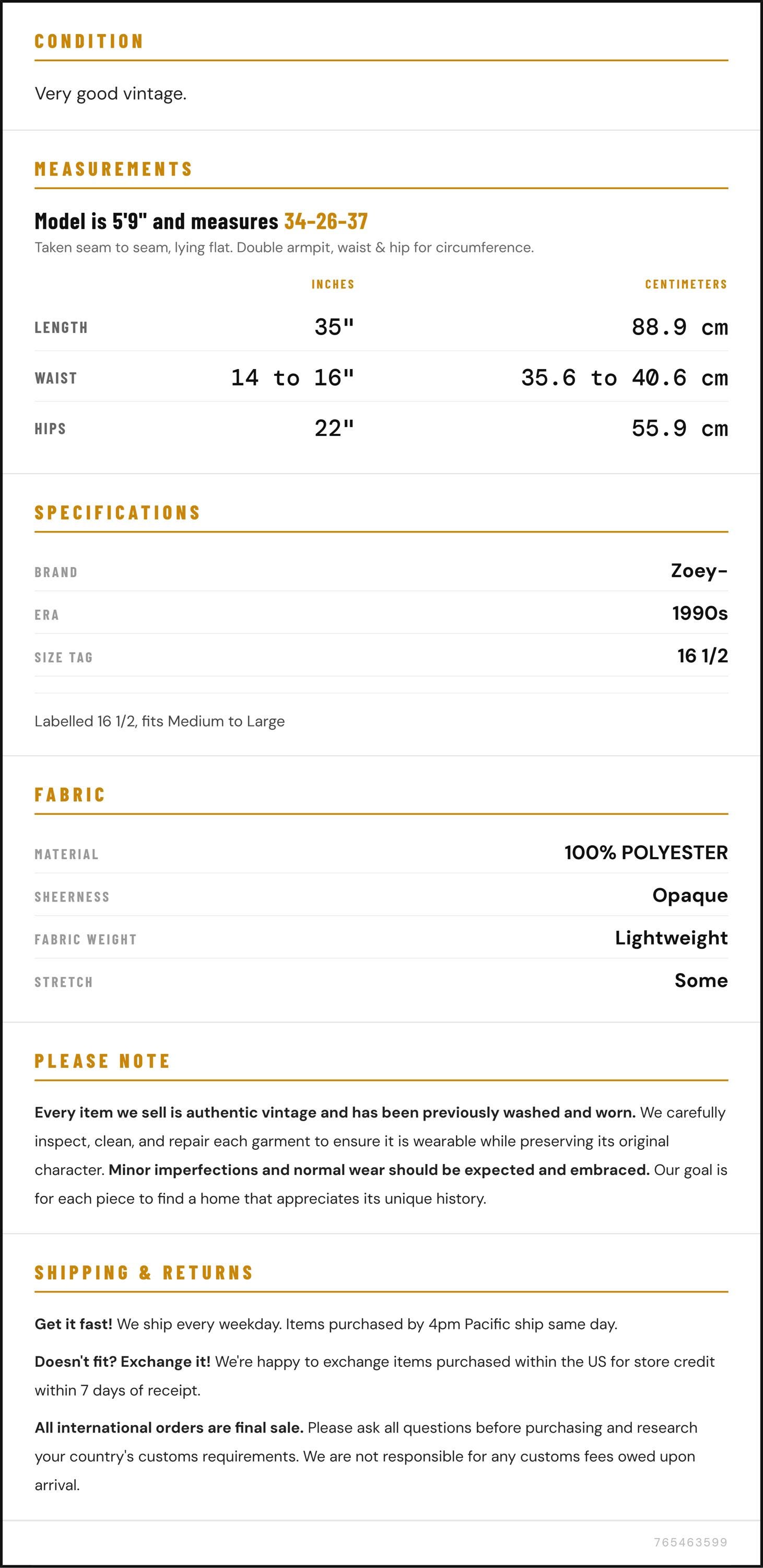 Vintage denim was usually made without any stretch, unlike modern jeans. Check the measurements to ensure proper fit, and remember to give yourself a little wiggle room in the waist and hips, depending on your preferred fit.