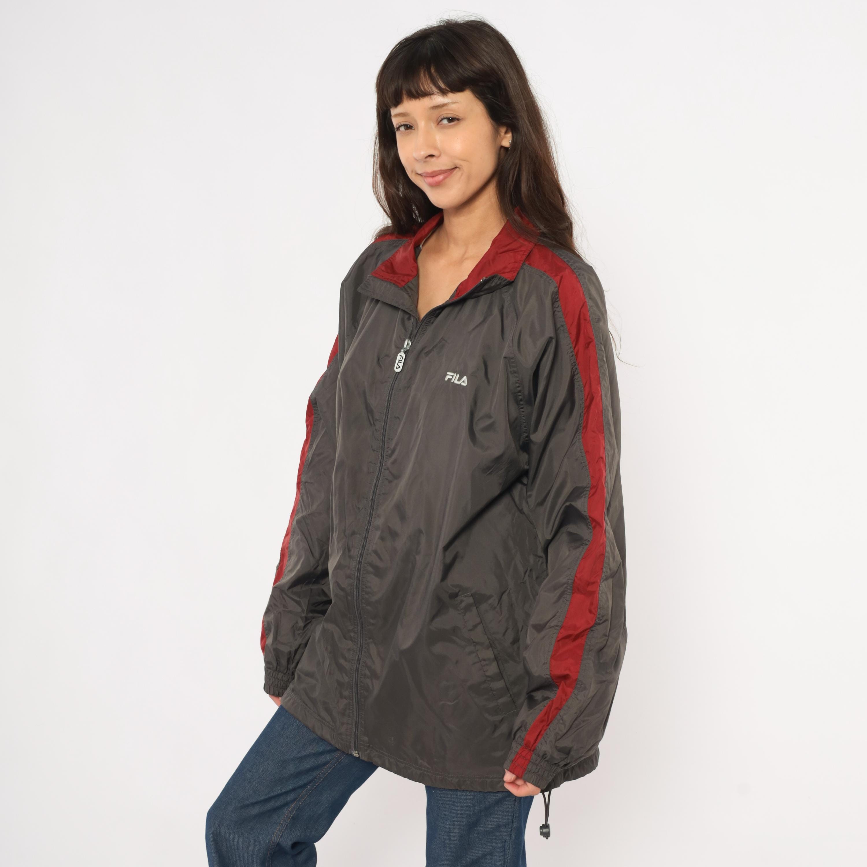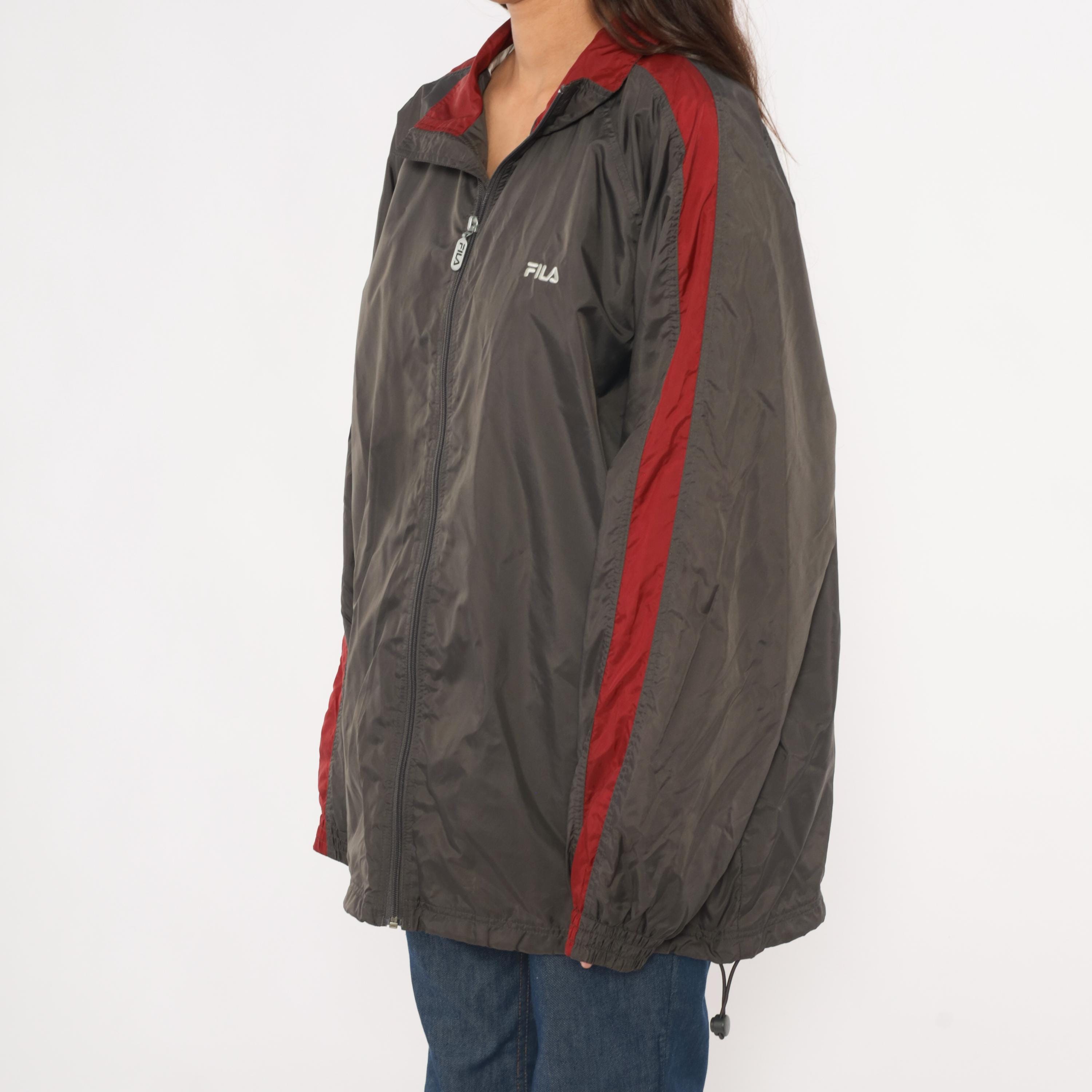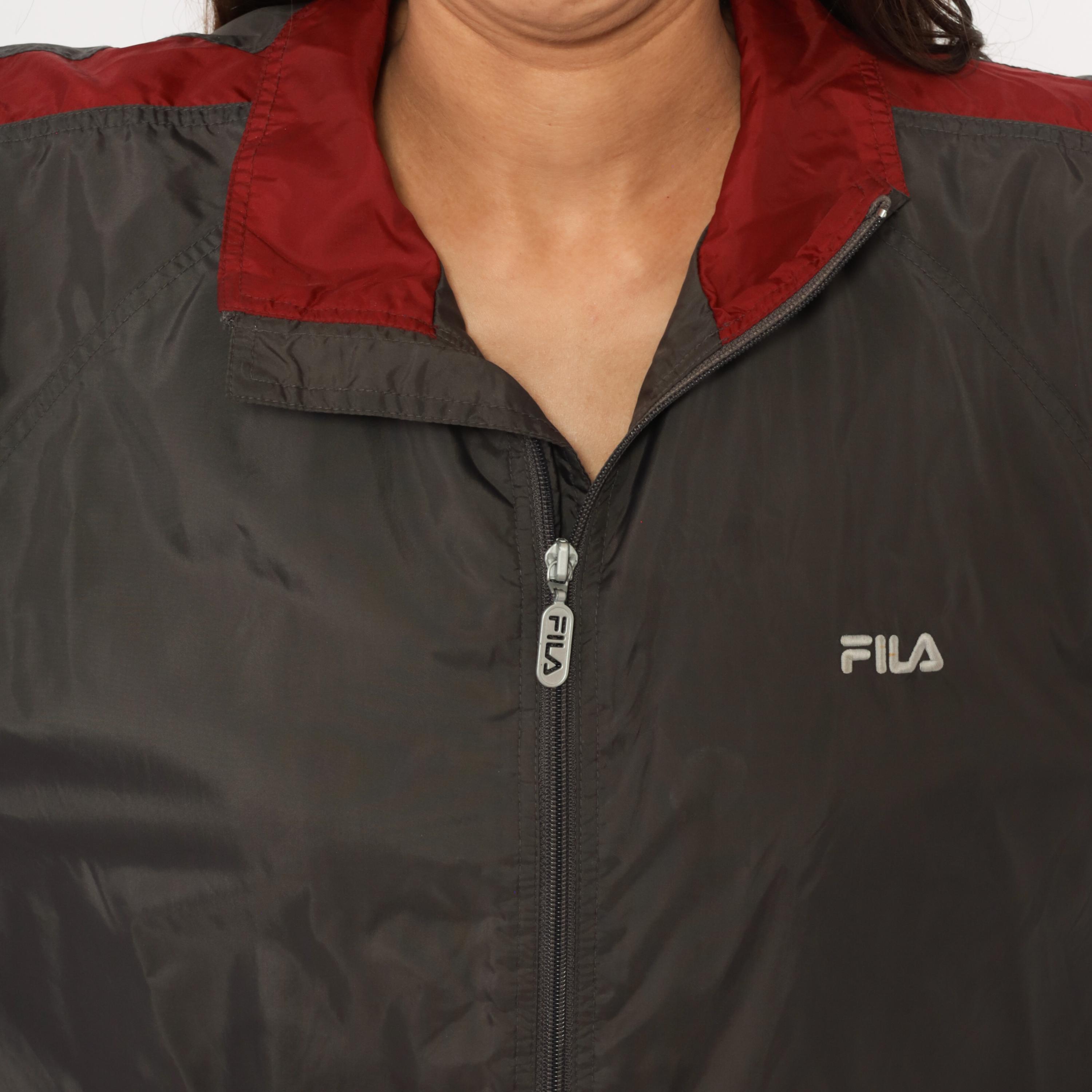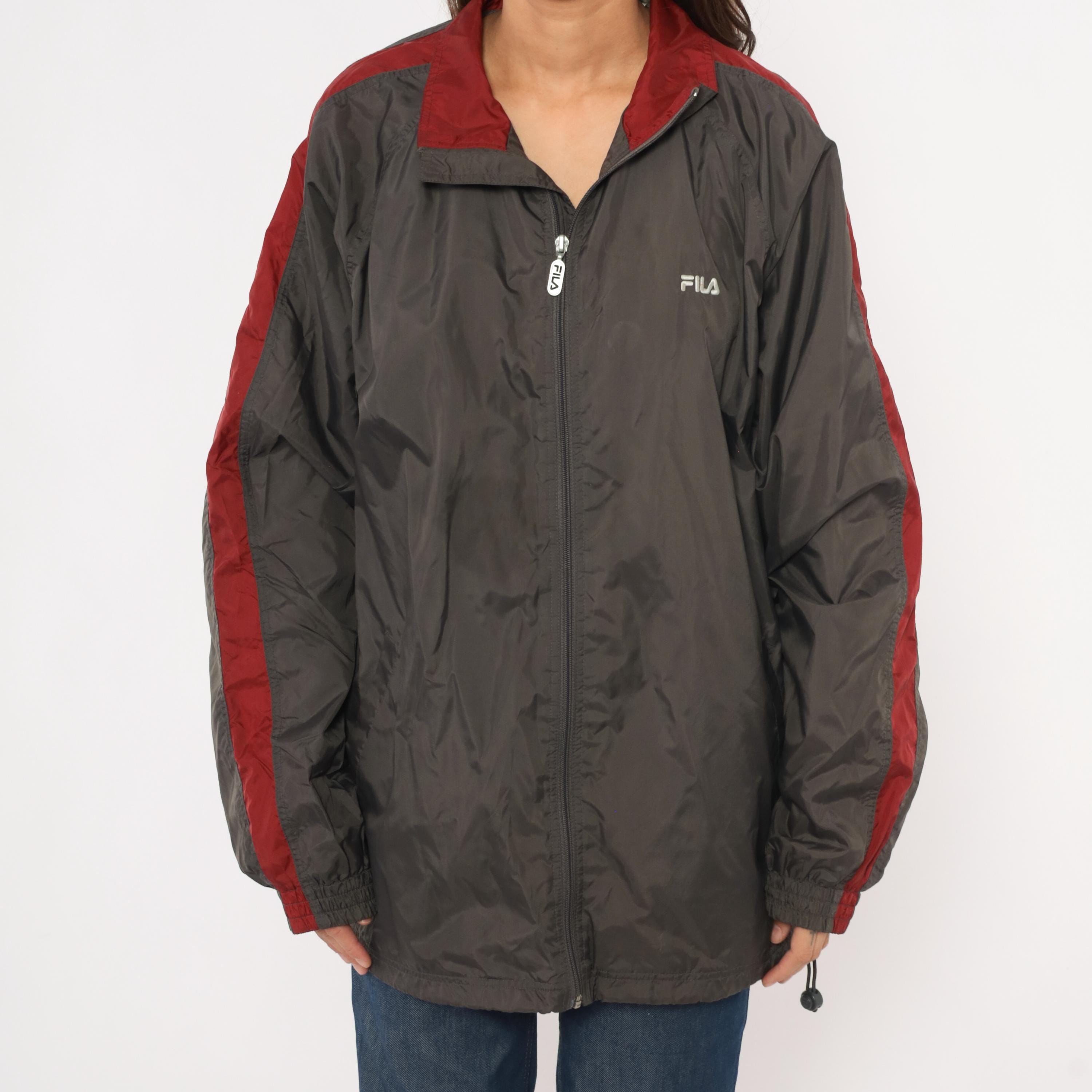 2000s Fila windbreaker in charcoal grey with burgundy color blocking along the shoulders, collar, and sleeve panels. Full front zipper with branded Fila pull tab and embroidered Fila logo on the left chest. Fold-down collar with wine-colored inner lining, elastic cuffs, waist pockets, and a drawcord toggle at the hem.