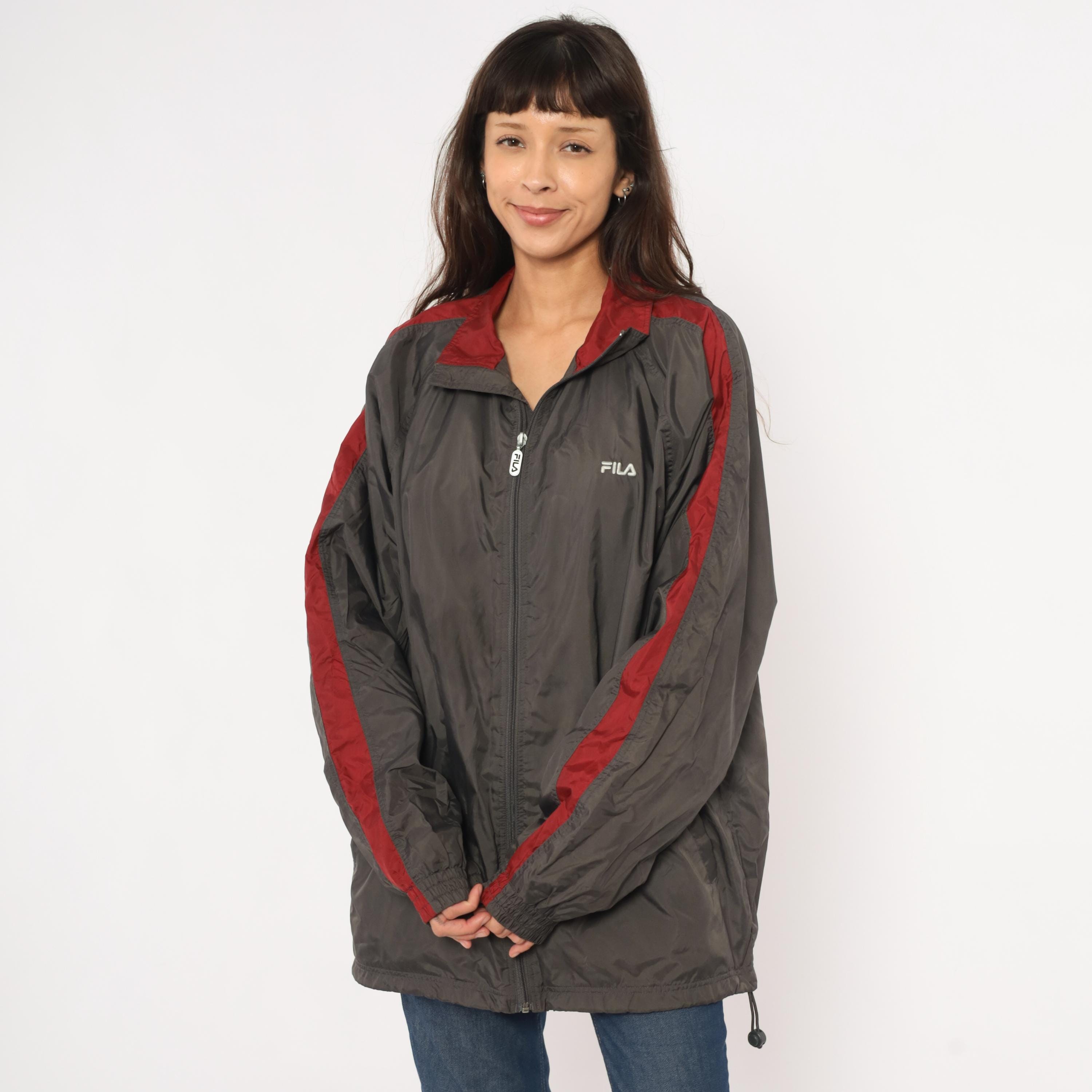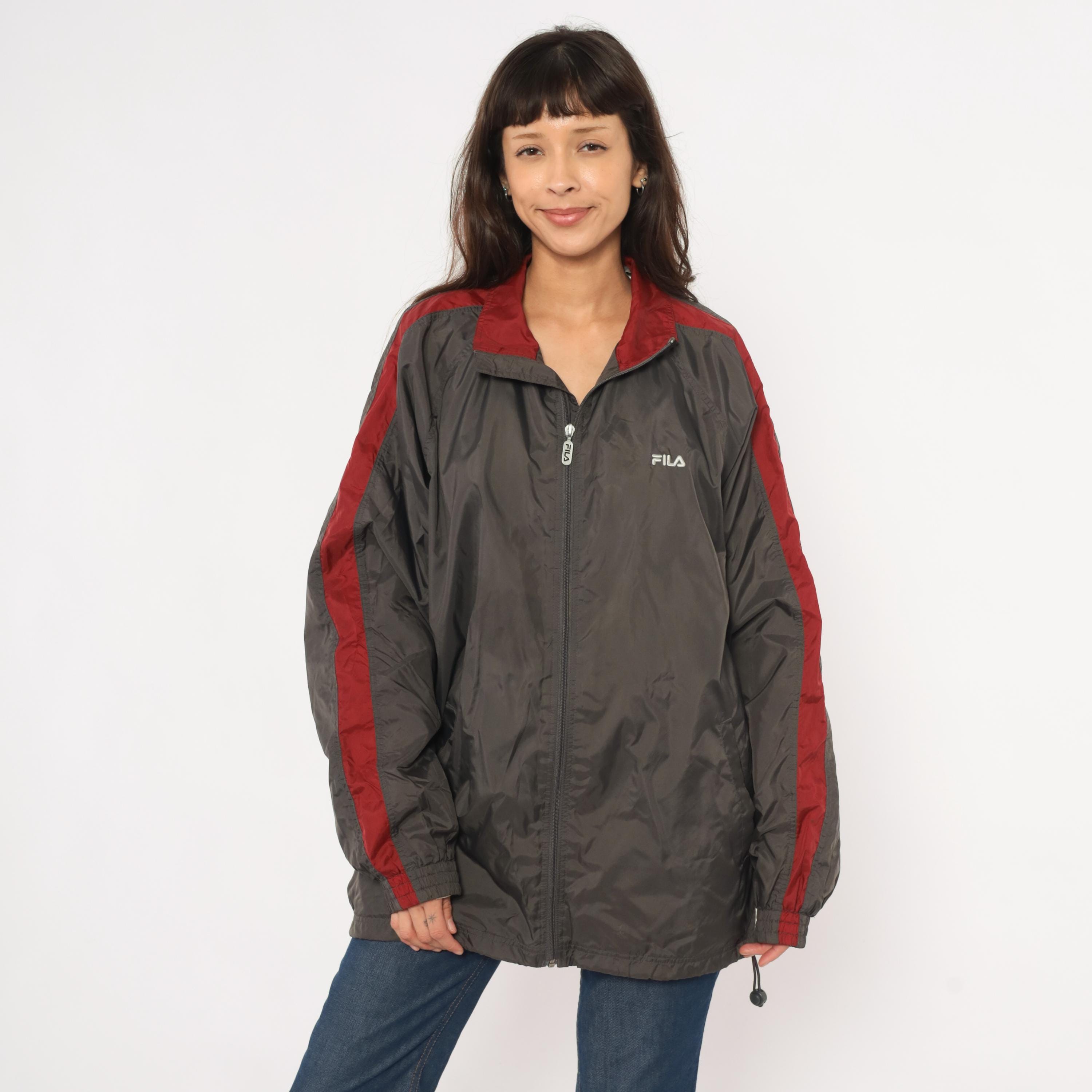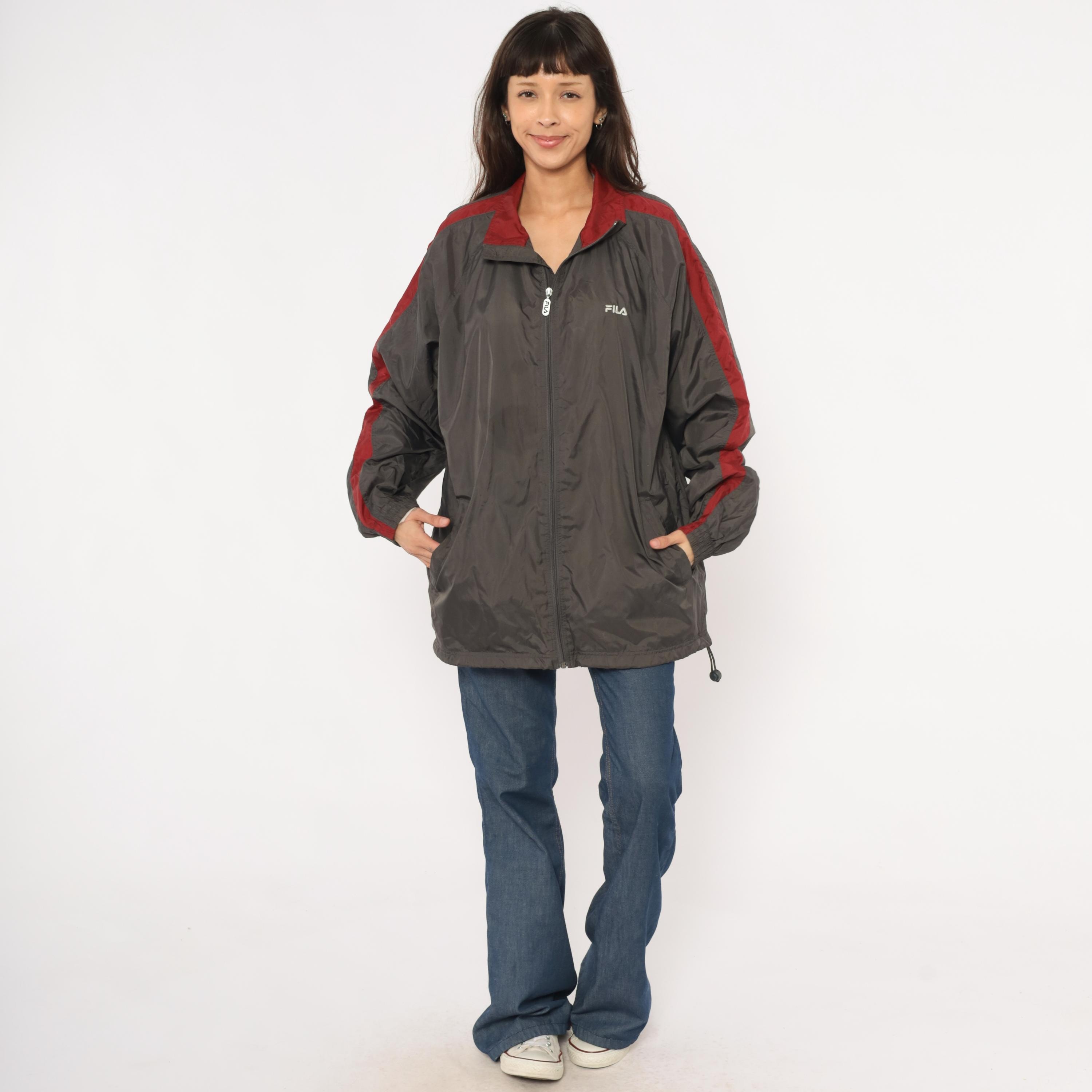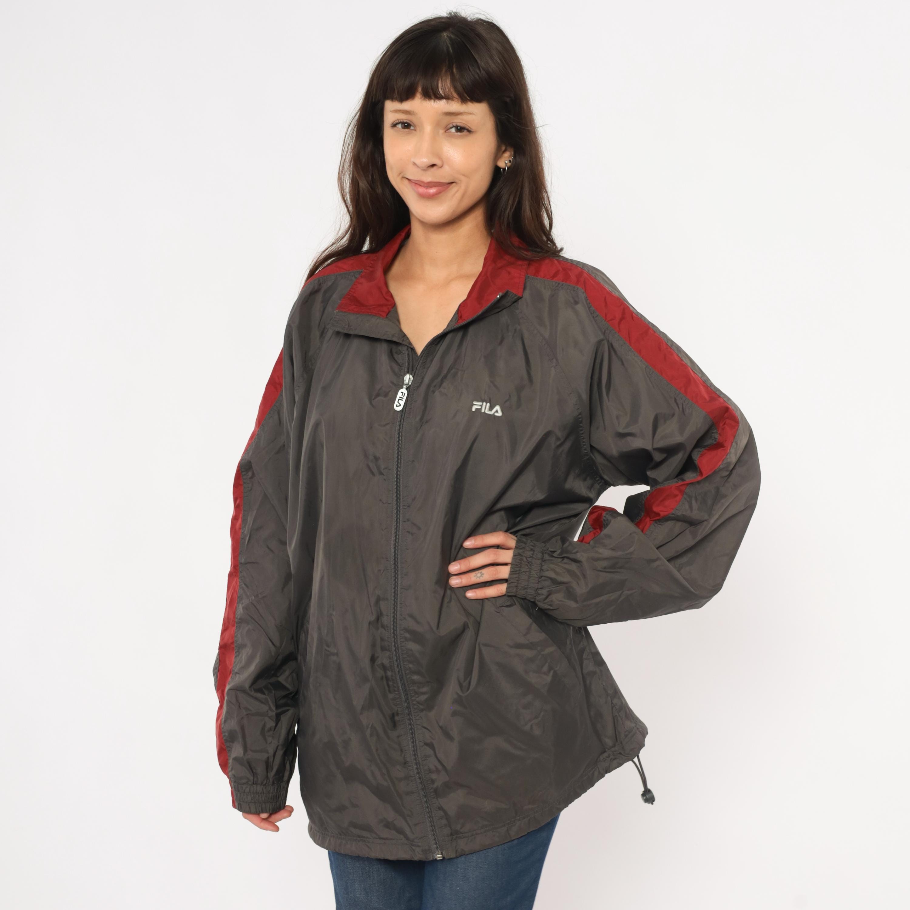 2000s Fila windbreaker in charcoal grey with burgundy color blocking along the shoulders, collar, and sleeve panels. Full front zipper with branded Fila pull tab and embroidered Fila logo on the left chest. Fold-down collar with wine-colored inner lining, elastic cuffs, waist pockets, and a drawcord toggle at the hem.