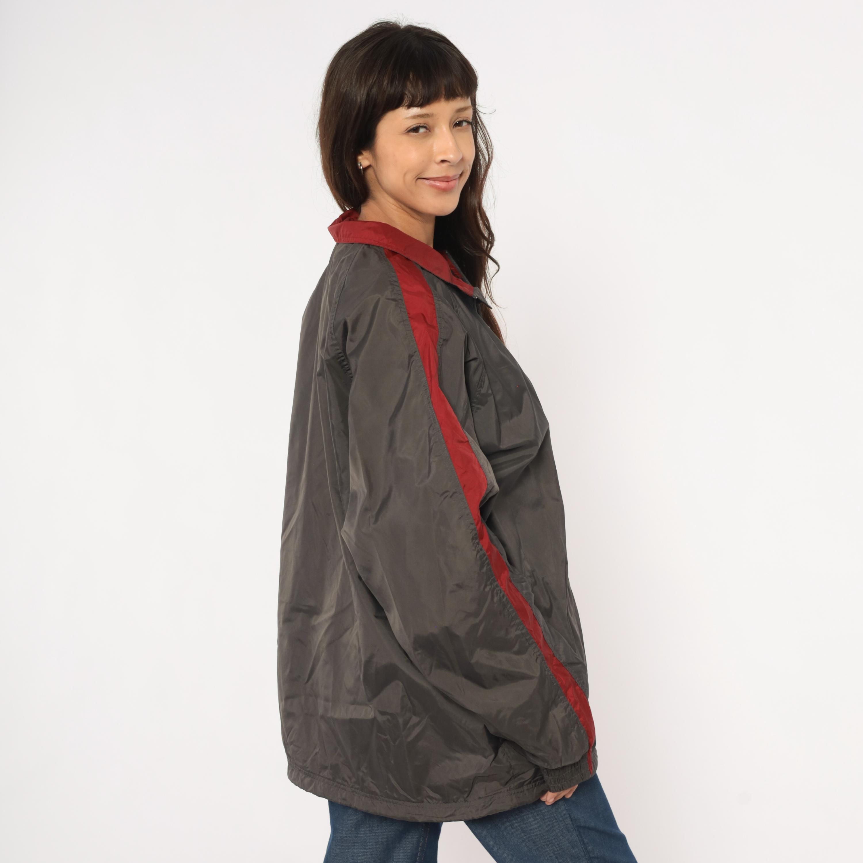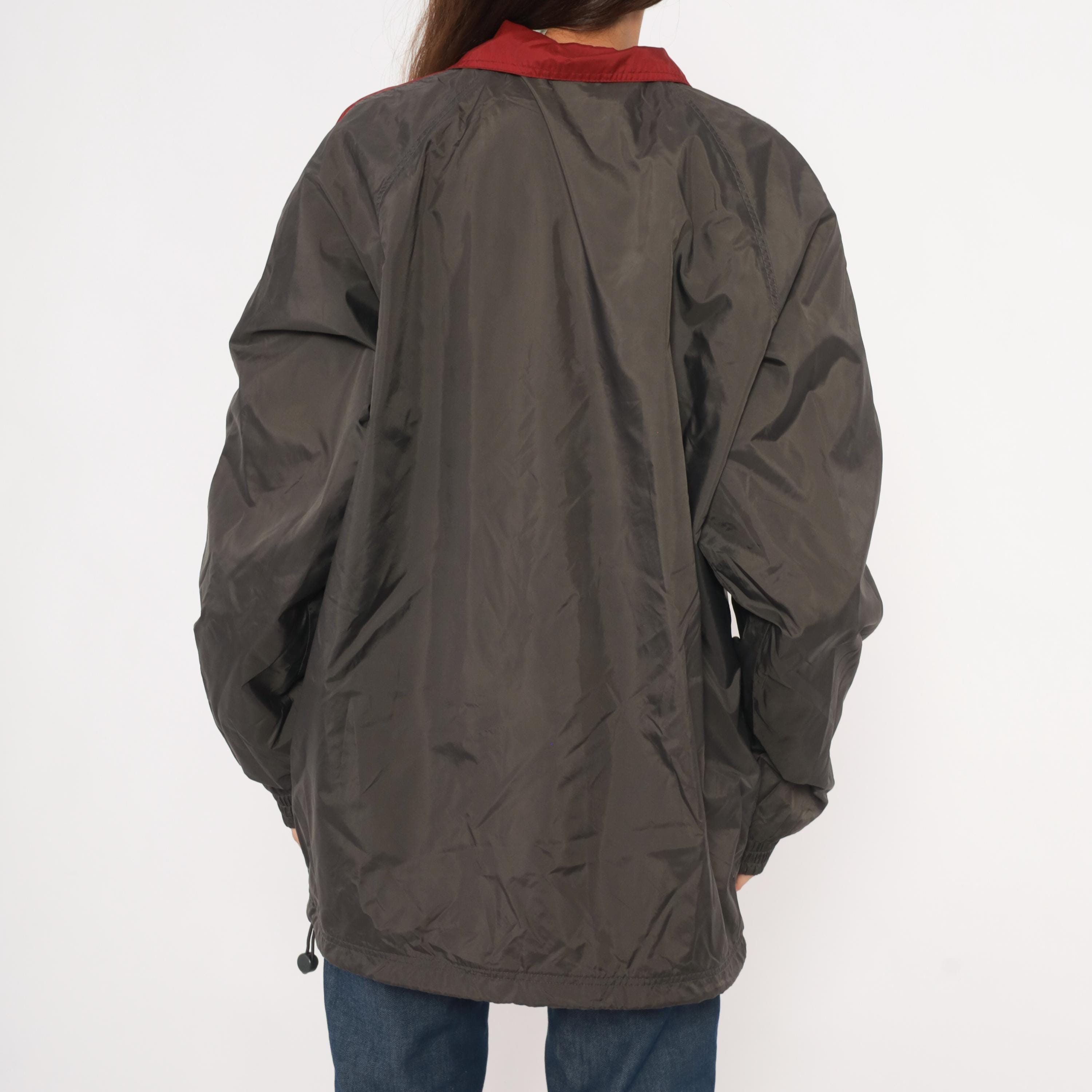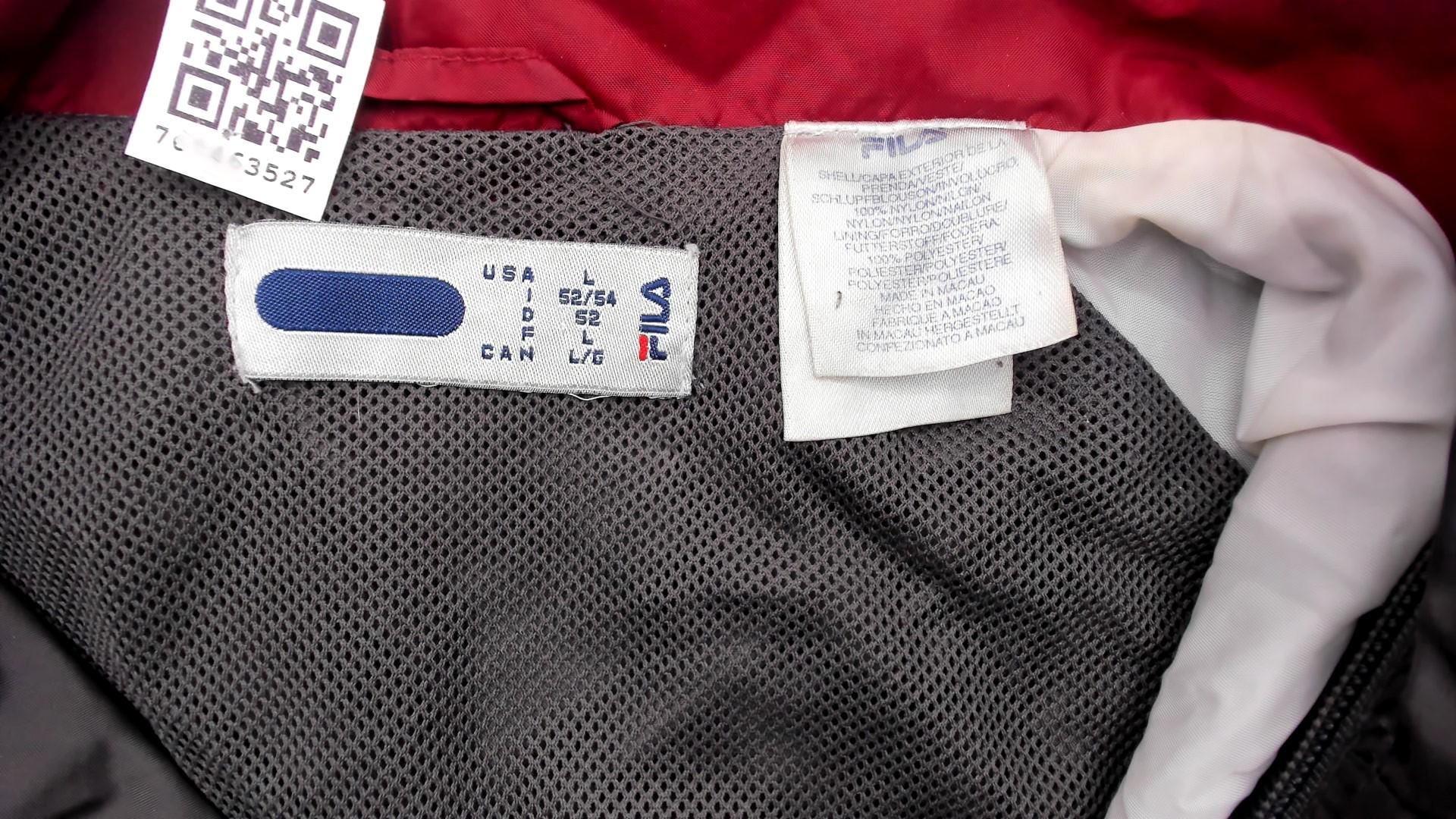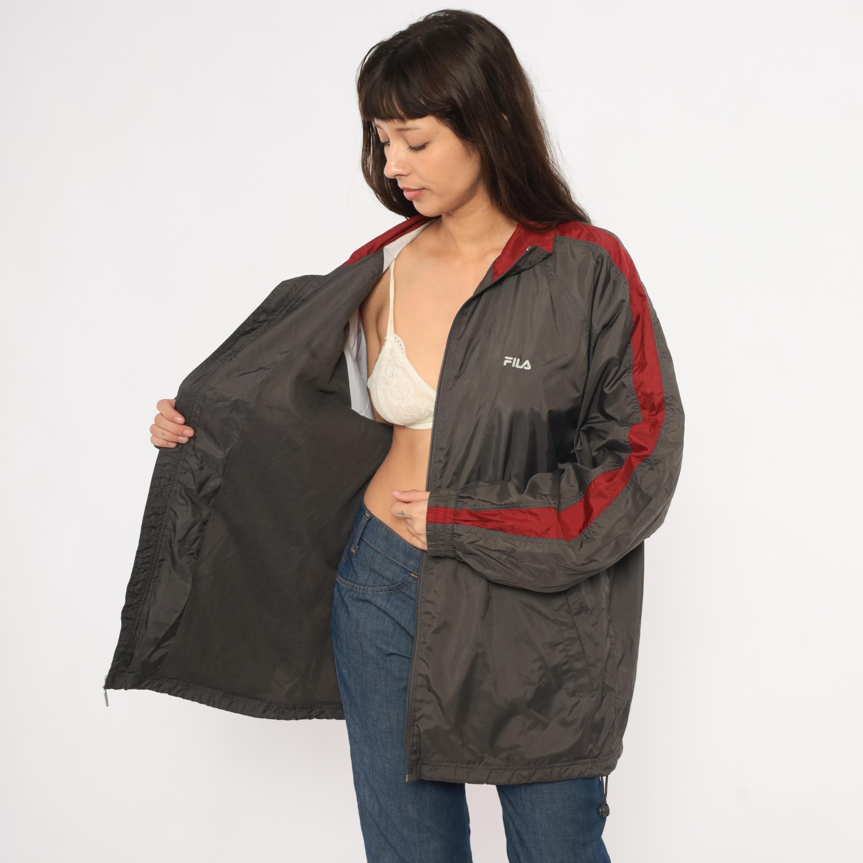 2000s Fila windbreaker in charcoal grey with burgundy color blocking along the shoulders, collar, and sleeve panels. Full front zipper with branded Fila pull tab and embroidered Fila logo on the left chest. Fold-down collar with wine-colored inner lining, elastic cuffs, waist pockets, and a drawcord toggle at the hem.