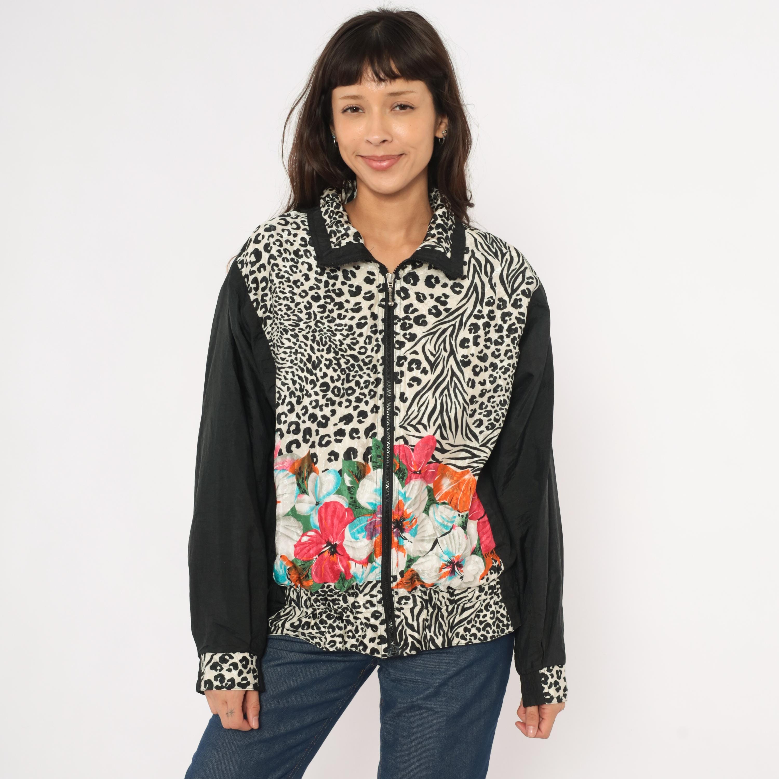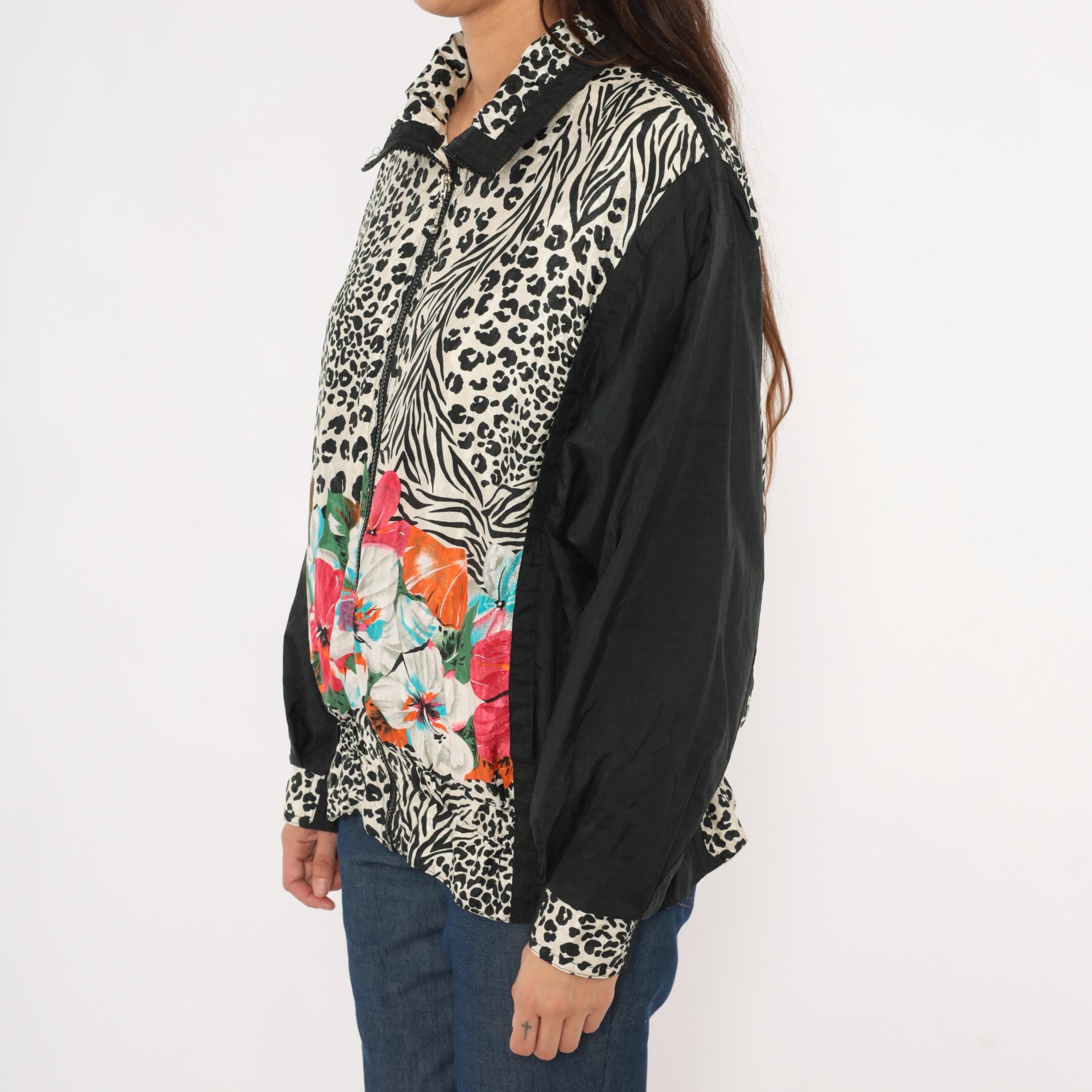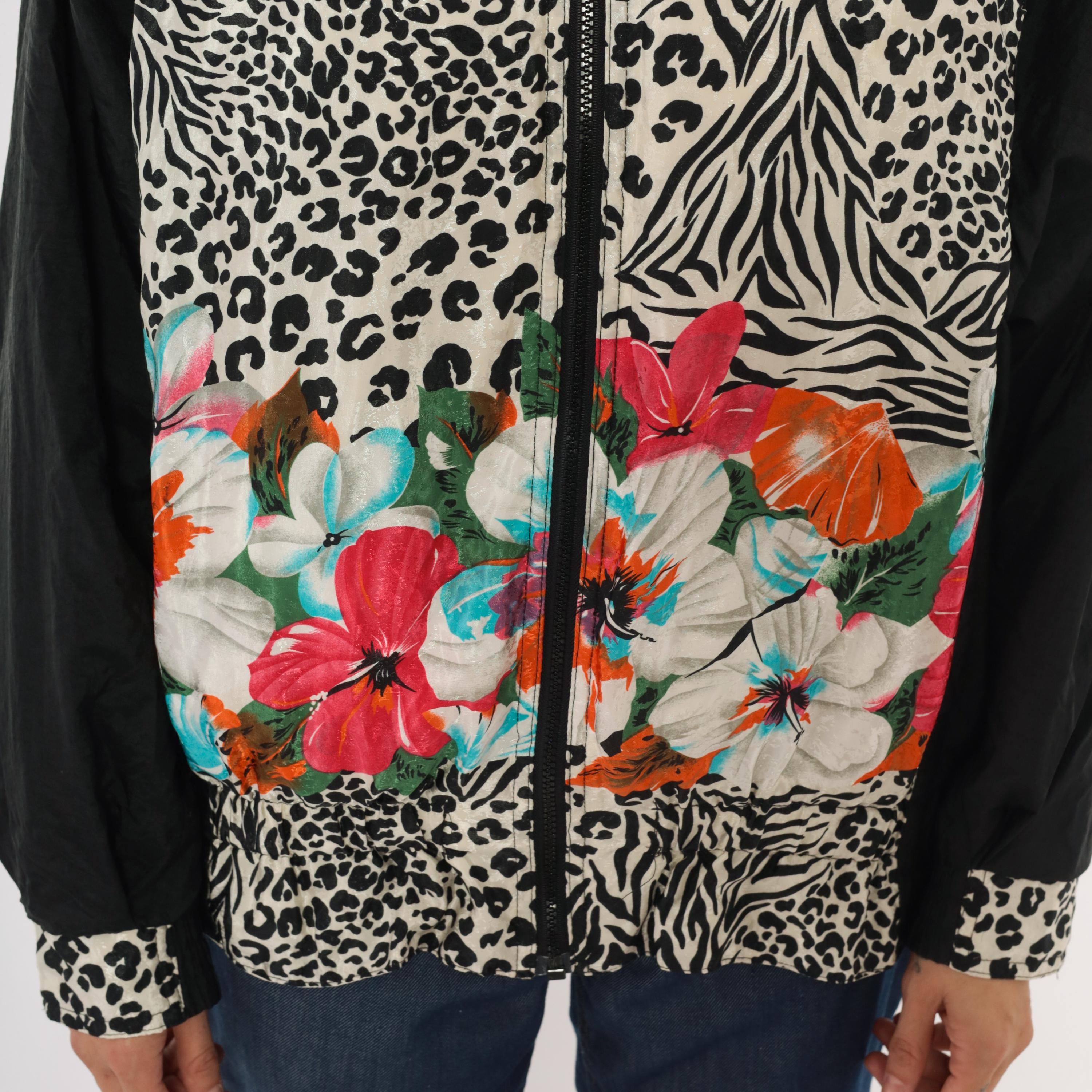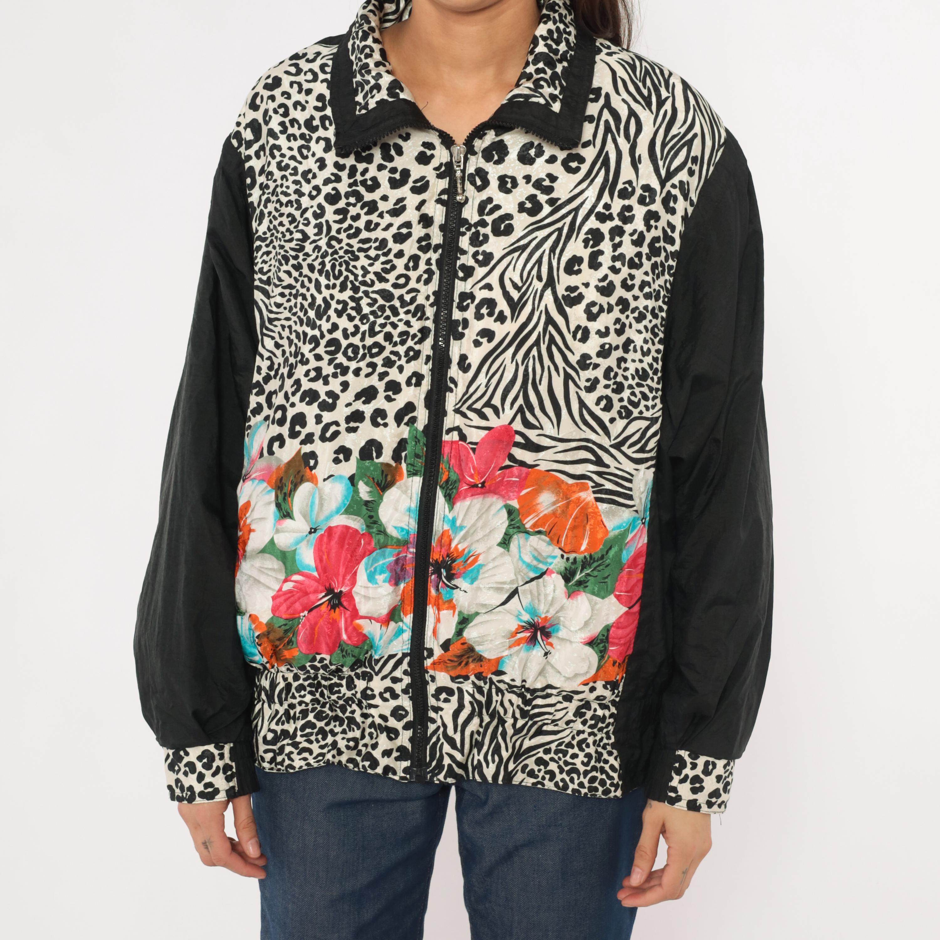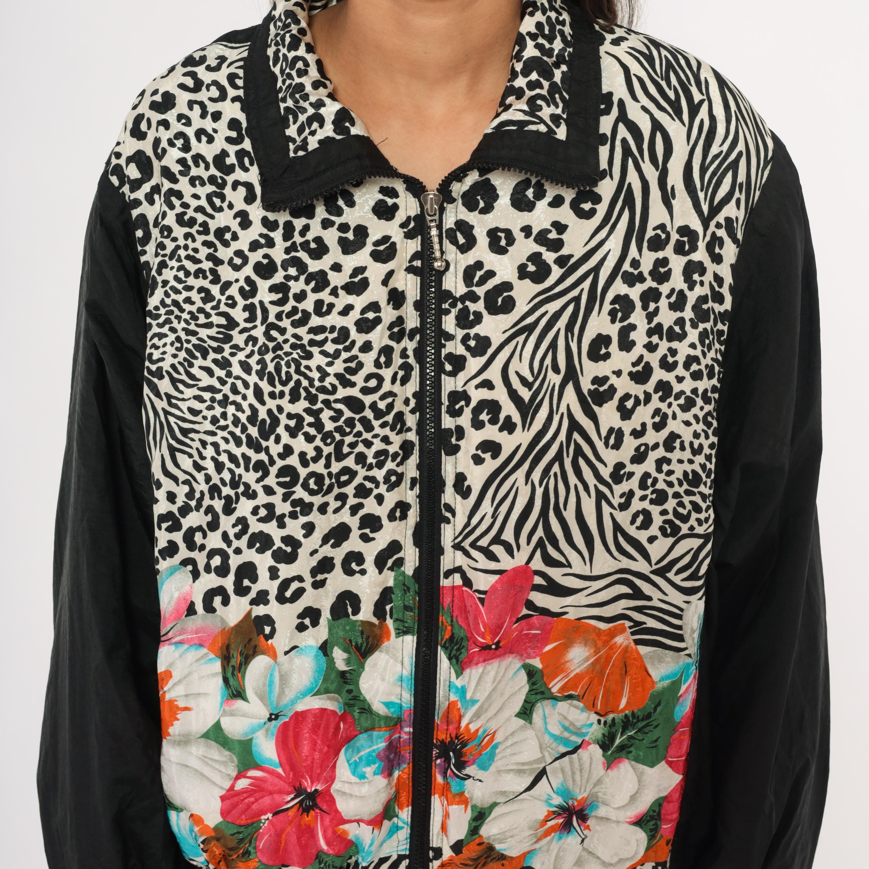 90s zip front windbreaker from East West with a mixed animal print body combining leopard and zebra patterns in black and cream, with tropical hibiscus flowers in pink, orange, turquoise, and white across the lower front. Solid black sleeves with leopard print cuffs and a pointed collar with black trim.