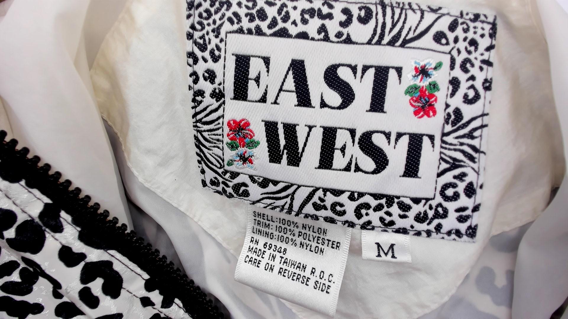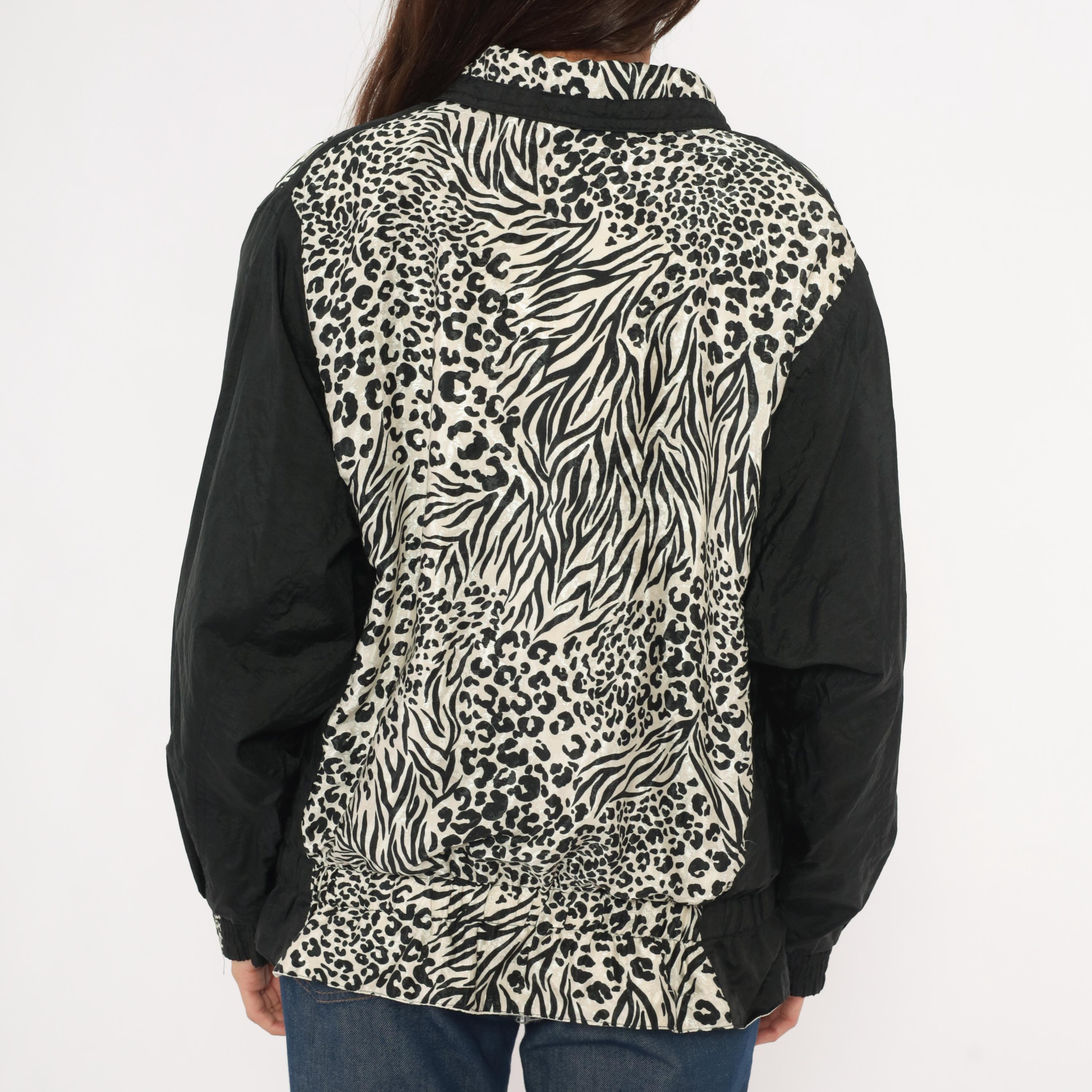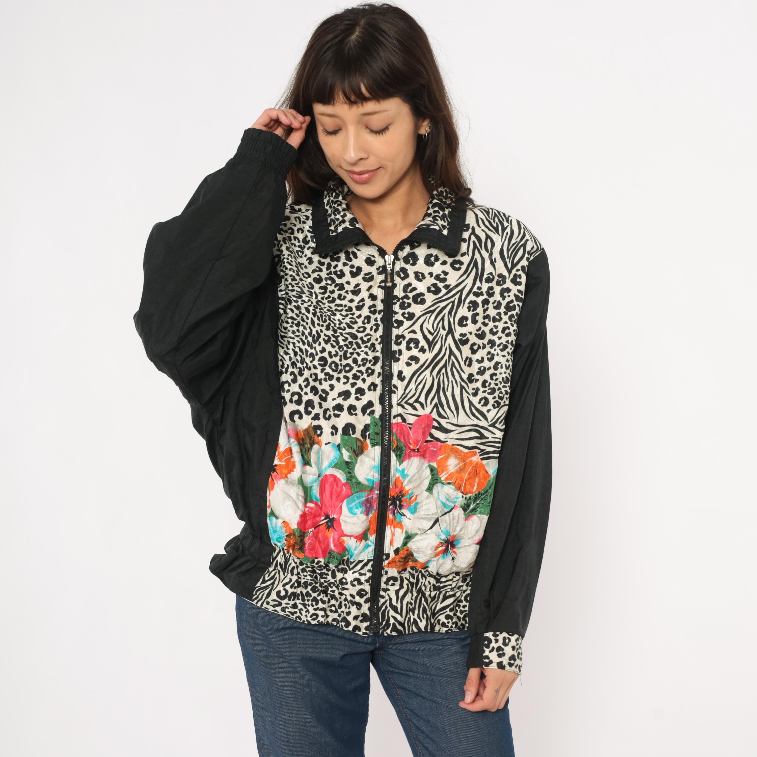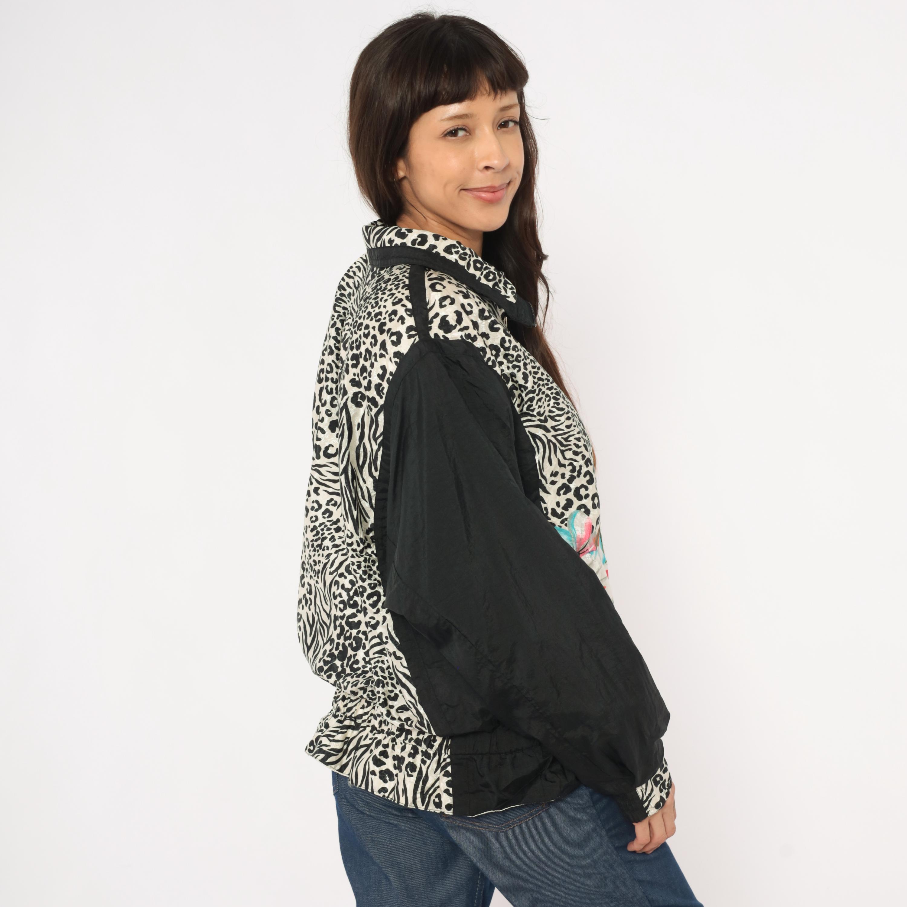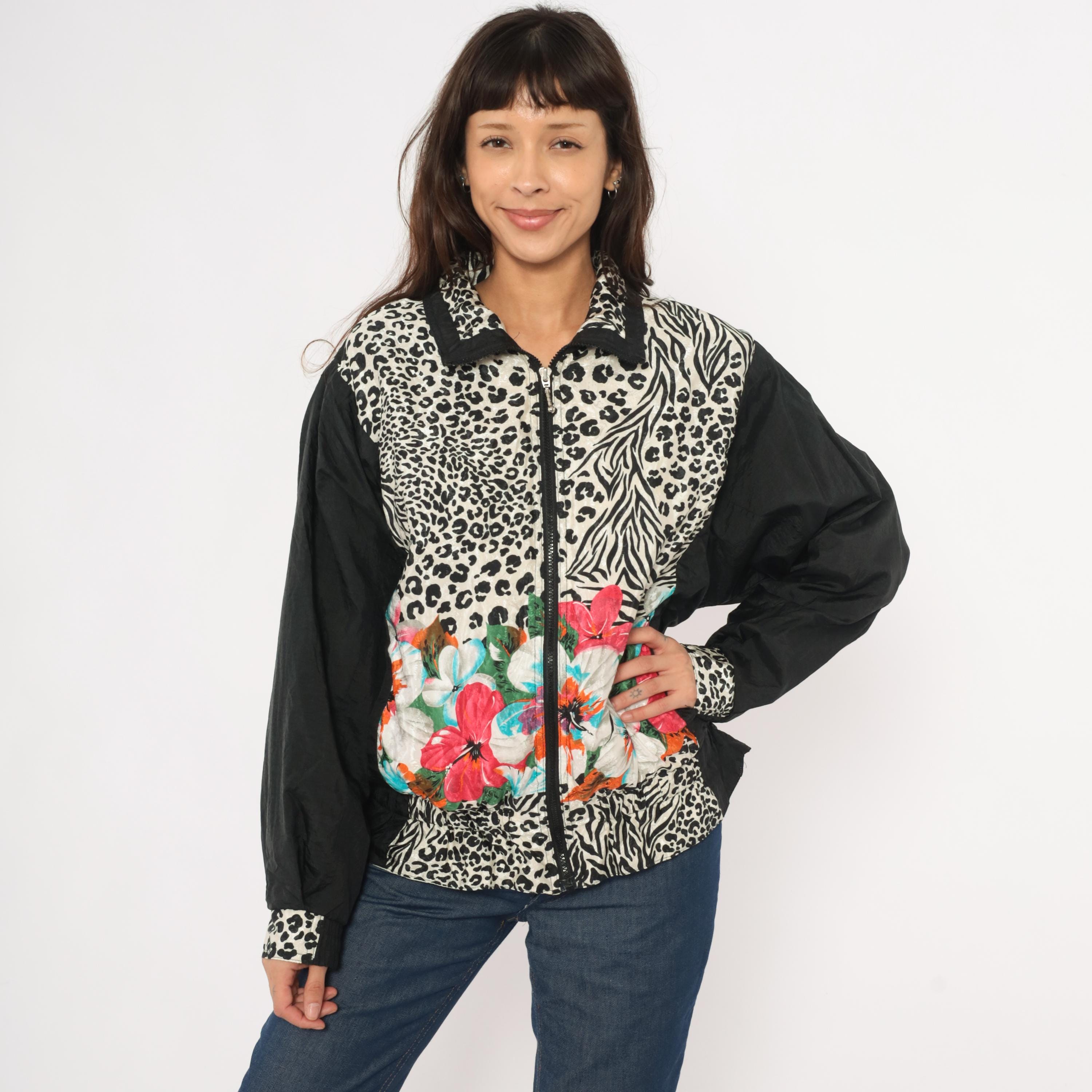90s zip front windbreaker from East West with a mixed animal print body combining leopard and zebra patterns in black and cream, with tropical hibiscus flowers in pink, orange, turquoise, and white across the lower front. Solid black sleeves with leopard print cuffs and a pointed collar with black trim.