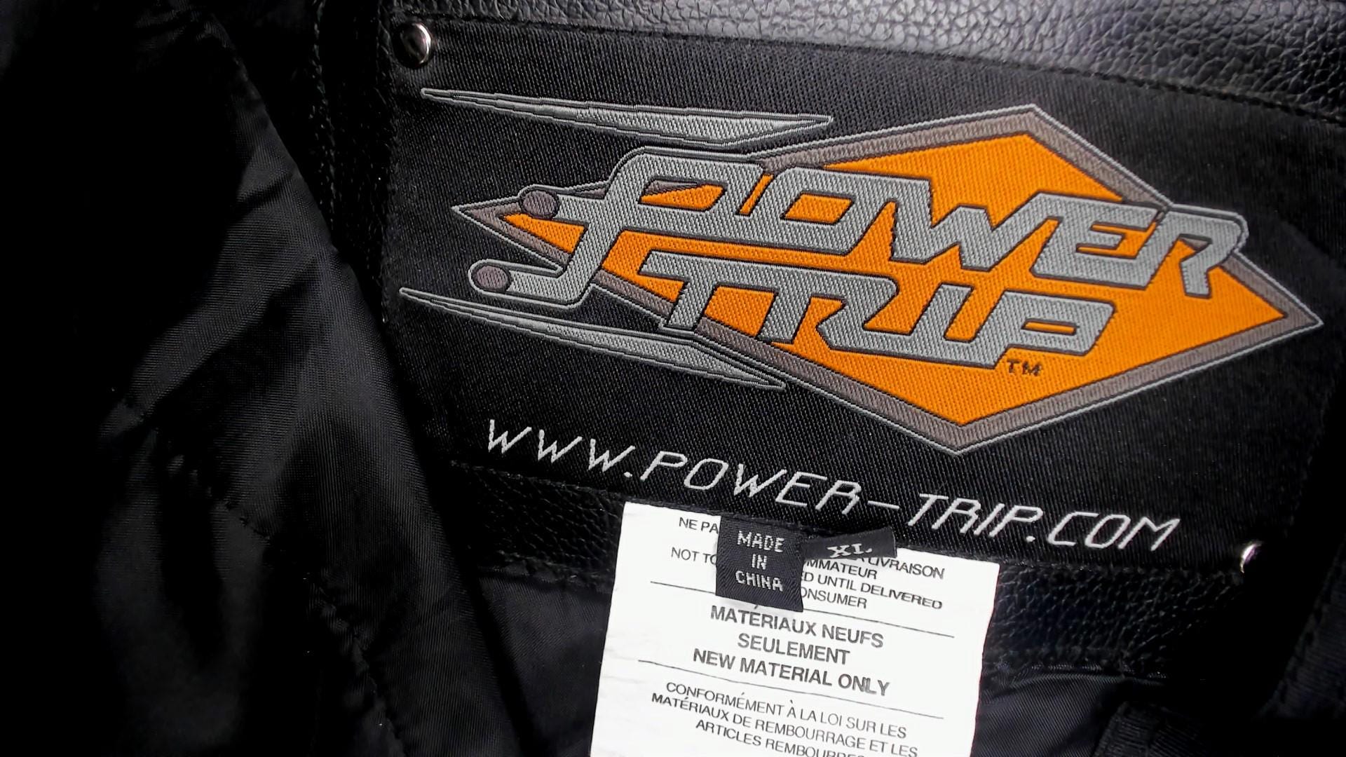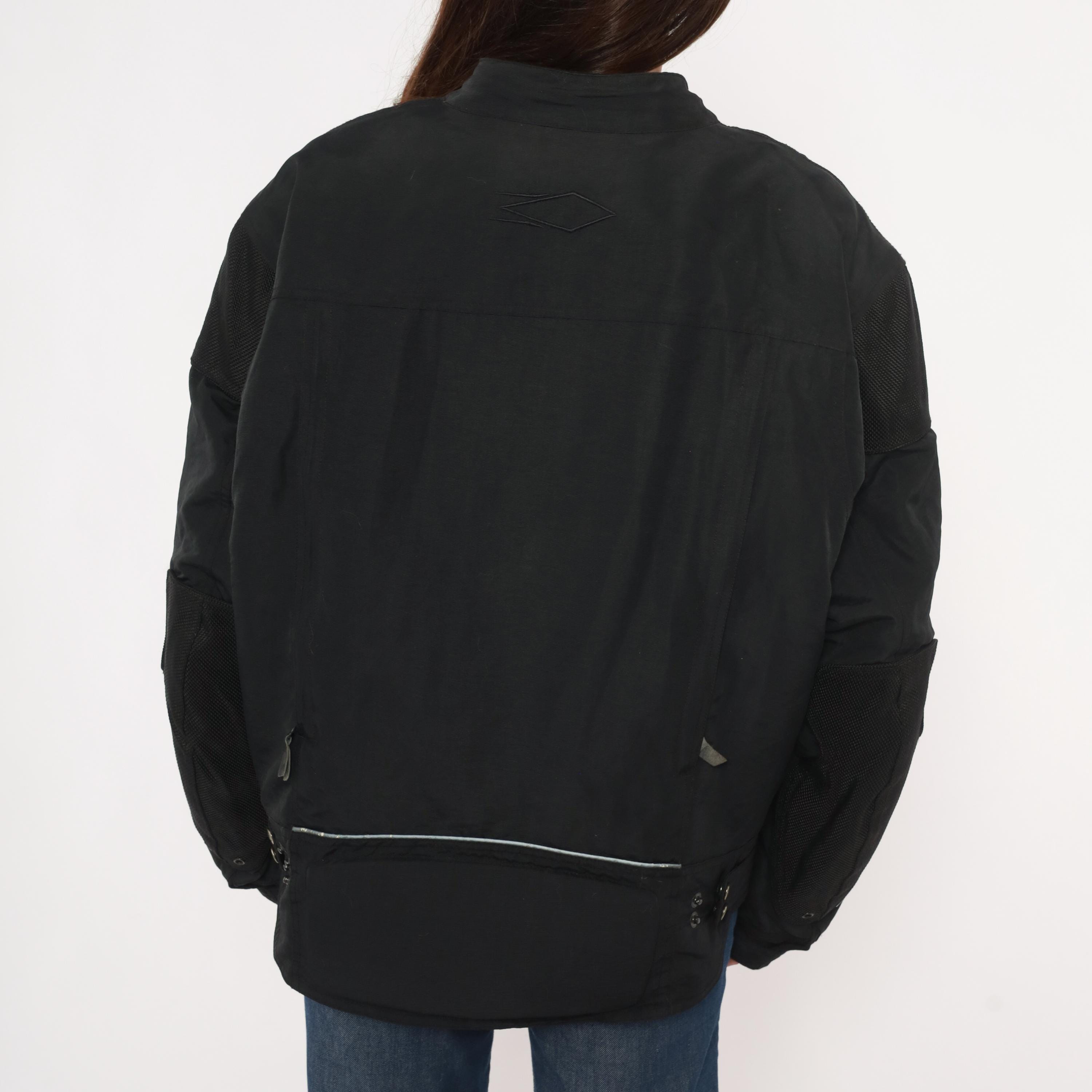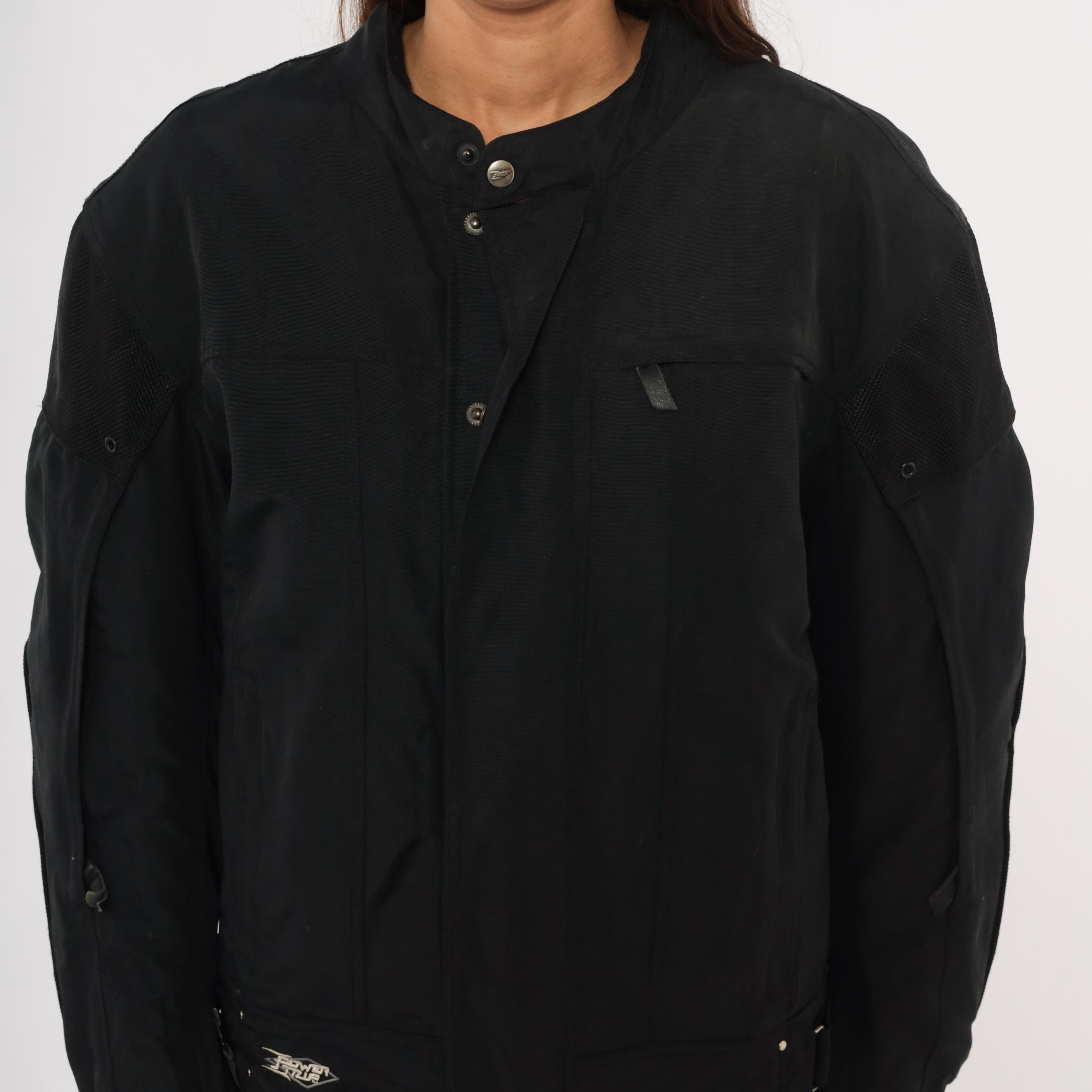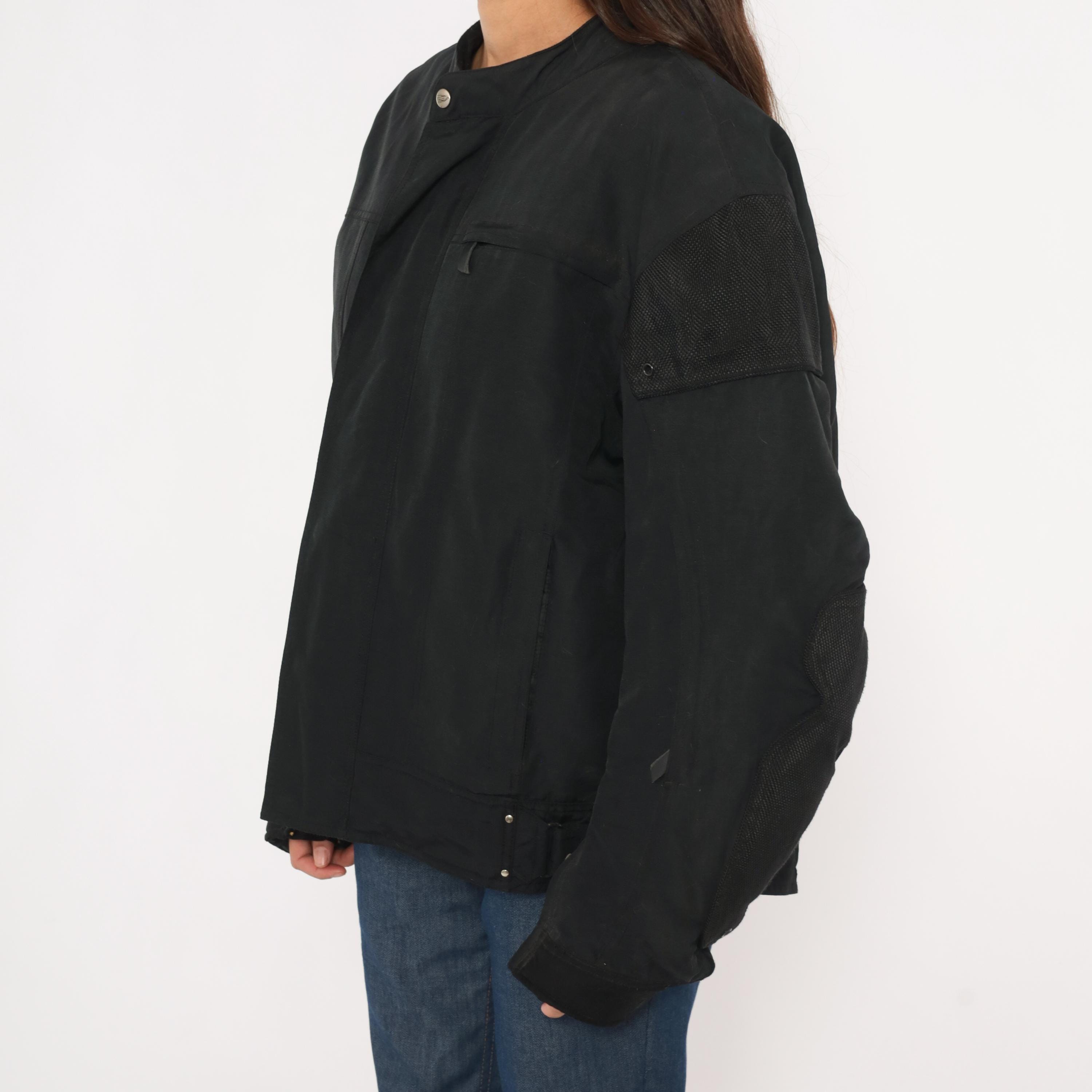 2000s black motorcycle jacket from Power Trip with snap-closure mandarin collar and full zip front. Mesh ventilation panels on the upper sleeves and forearms, with a zippered pocket across the lower back. Quilted lining with branded interior label, snap-tab cuffs, and a small chest pocket with flap closure. Has shoulder and arm padding for rider safety.