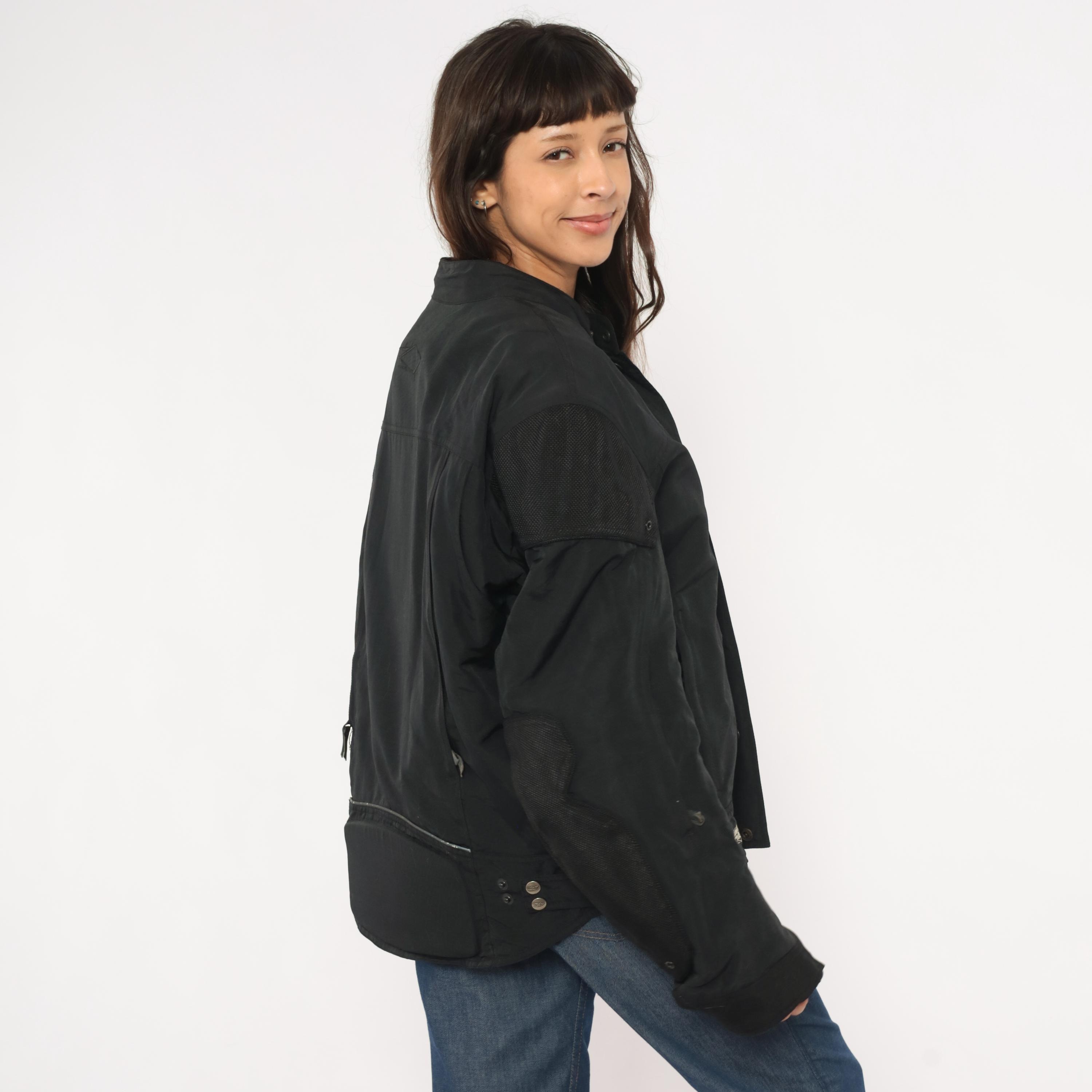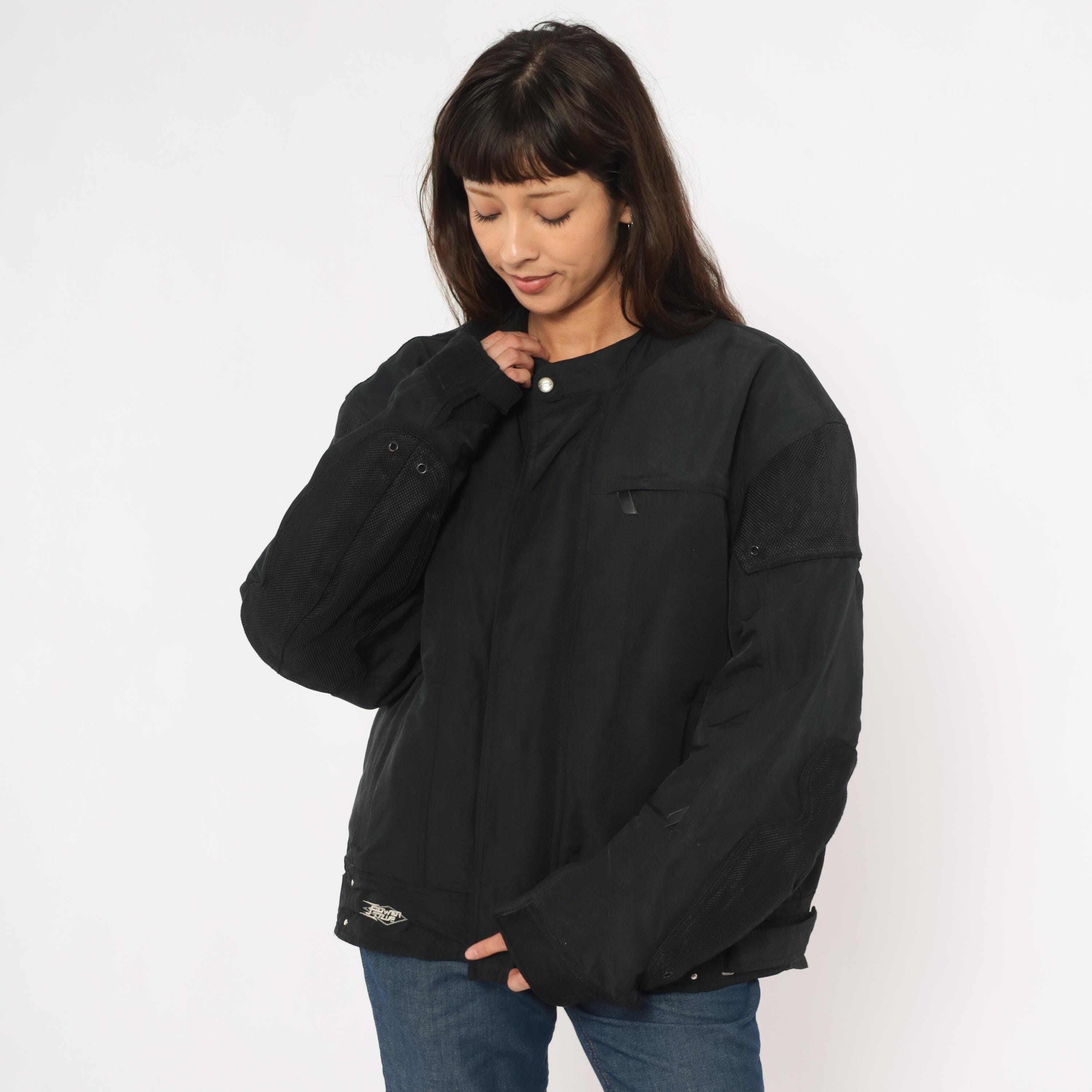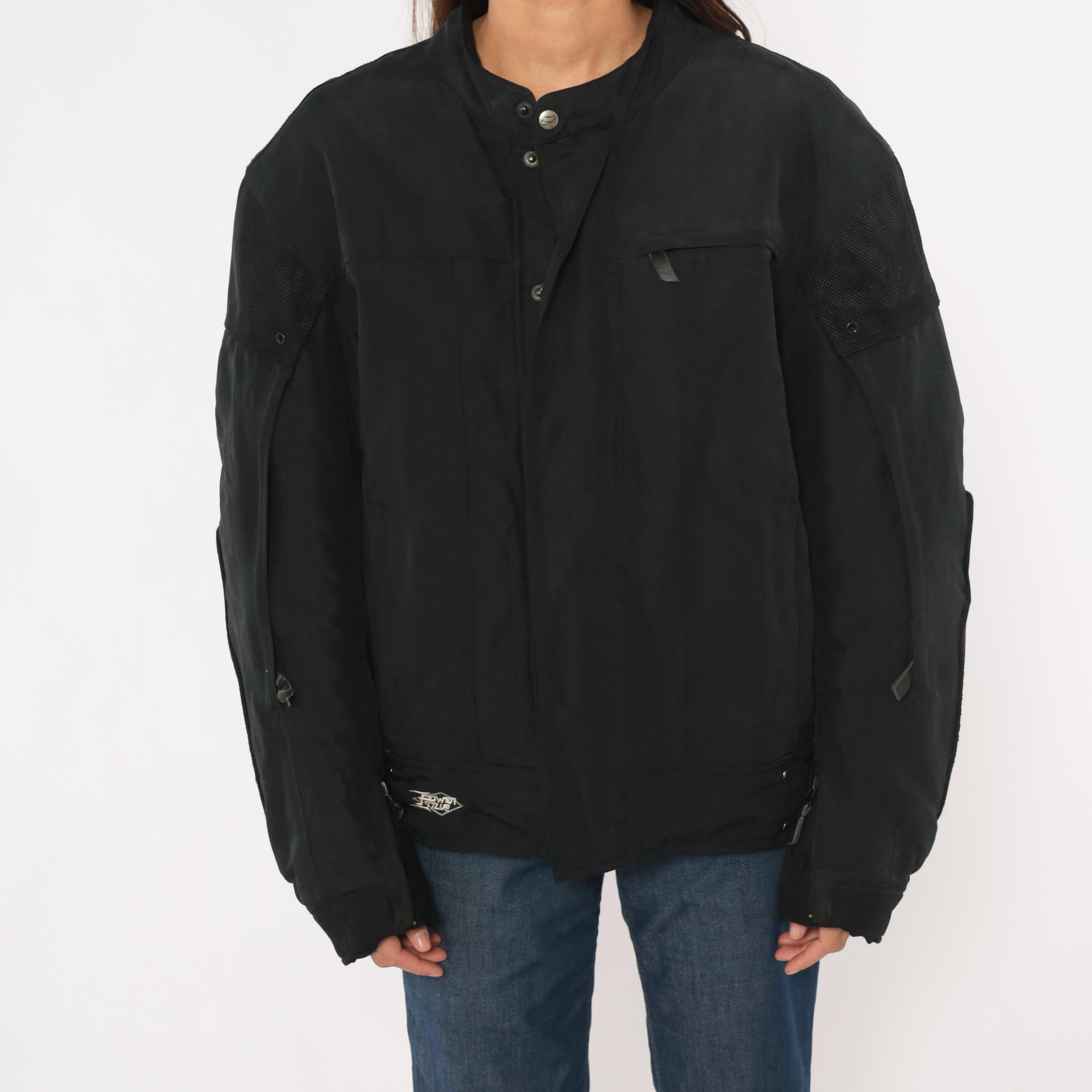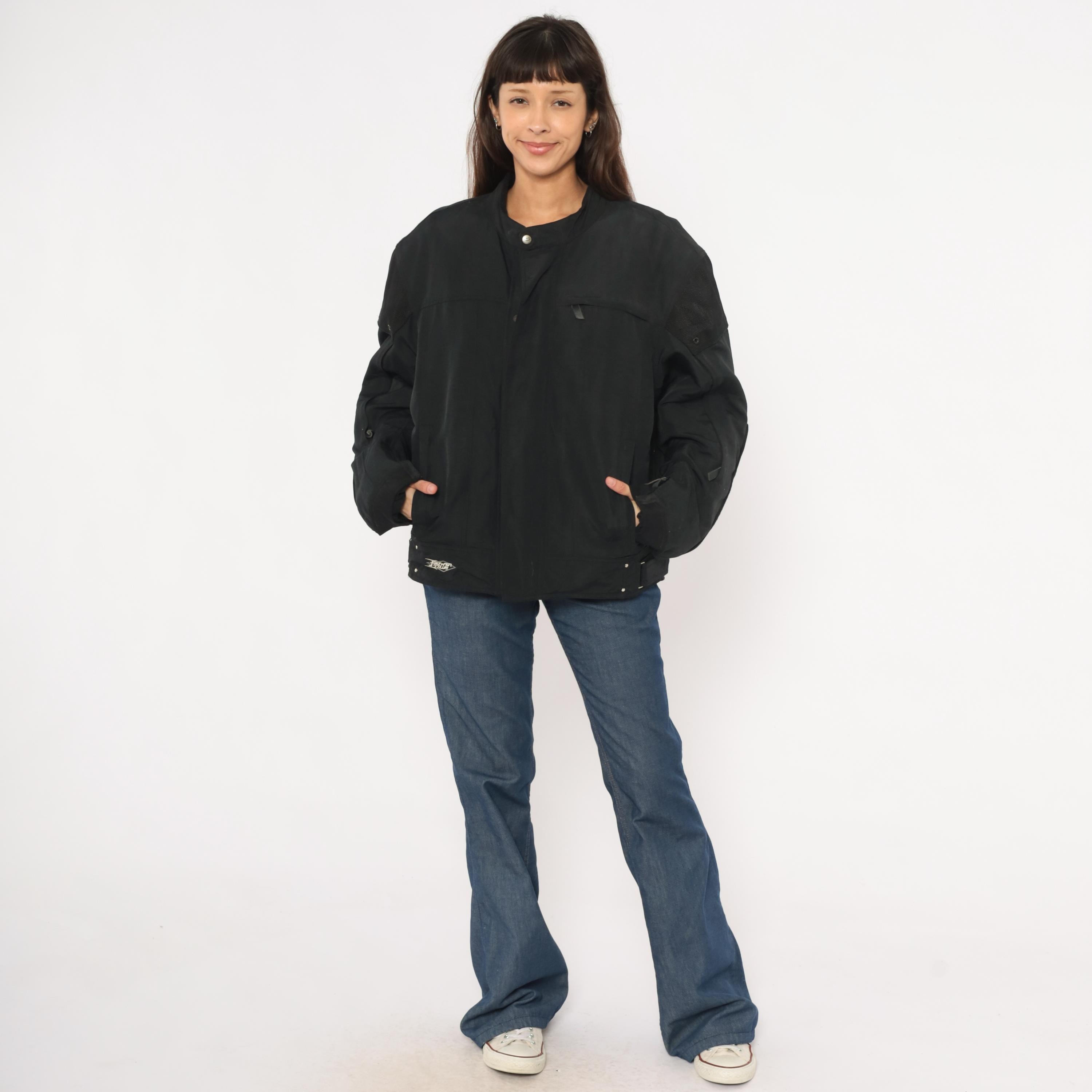 2000s black motorcycle jacket from Power Trip with snap-closure mandarin collar and full zip front. Mesh ventilation panels on the upper sleeves and forearms, with a zippered pocket across the lower back. Quilted lining with branded interior label, snap-tab cuffs, and a small chest pocket with flap closure. Has shoulder and arm padding for rider safety.