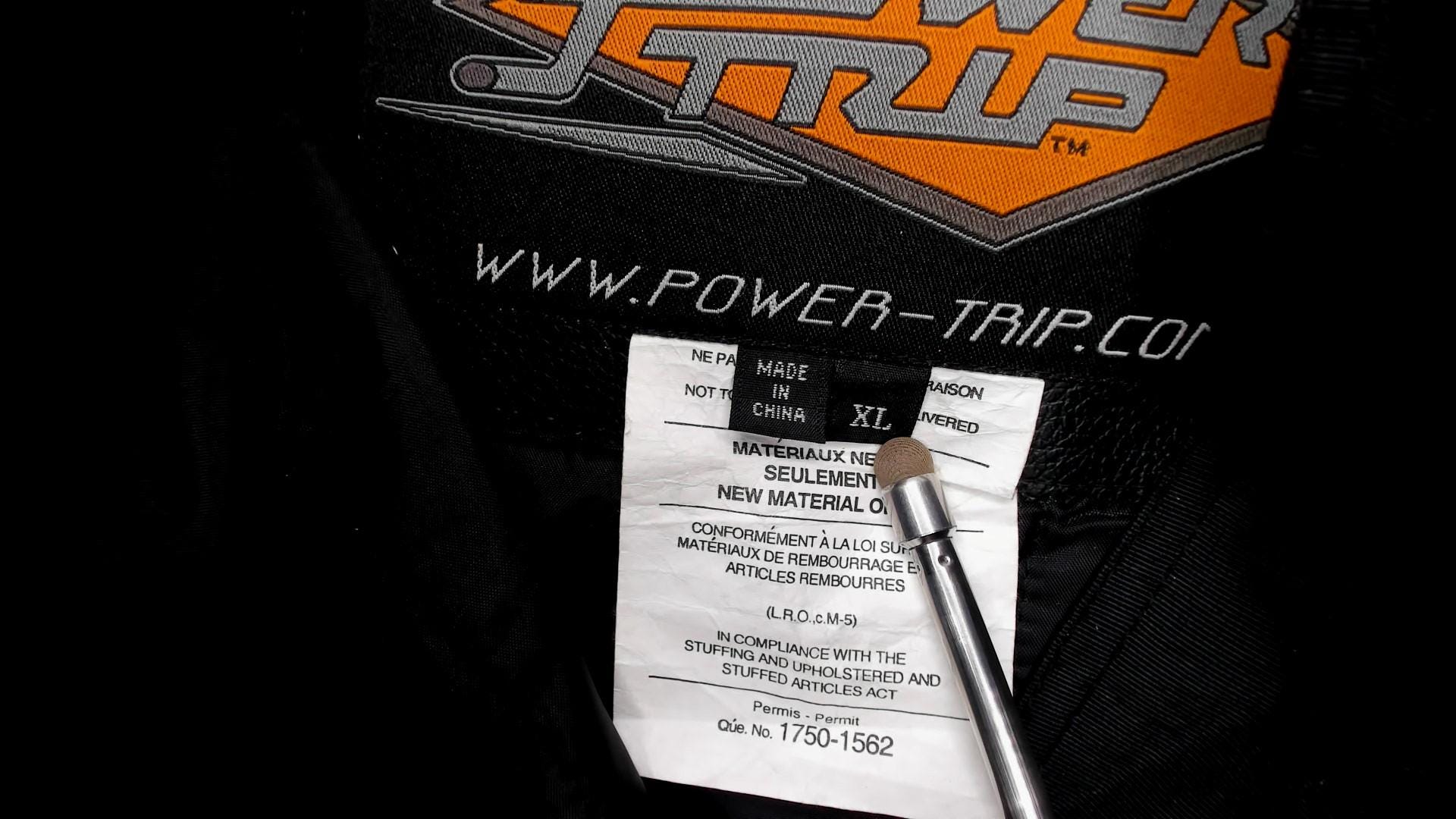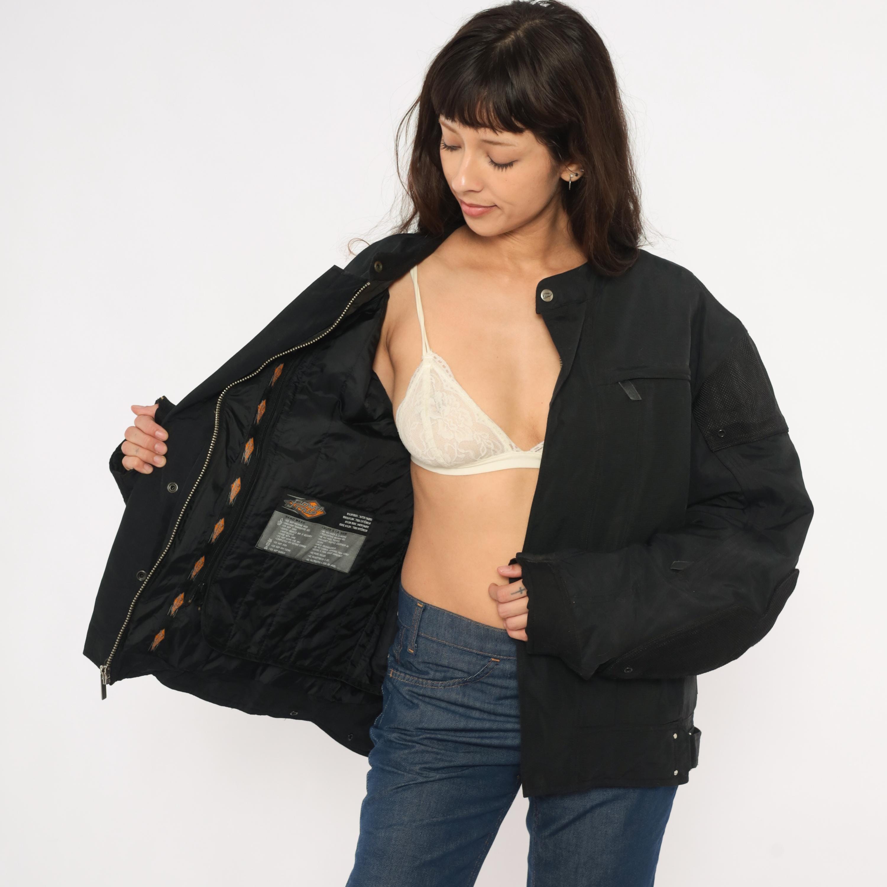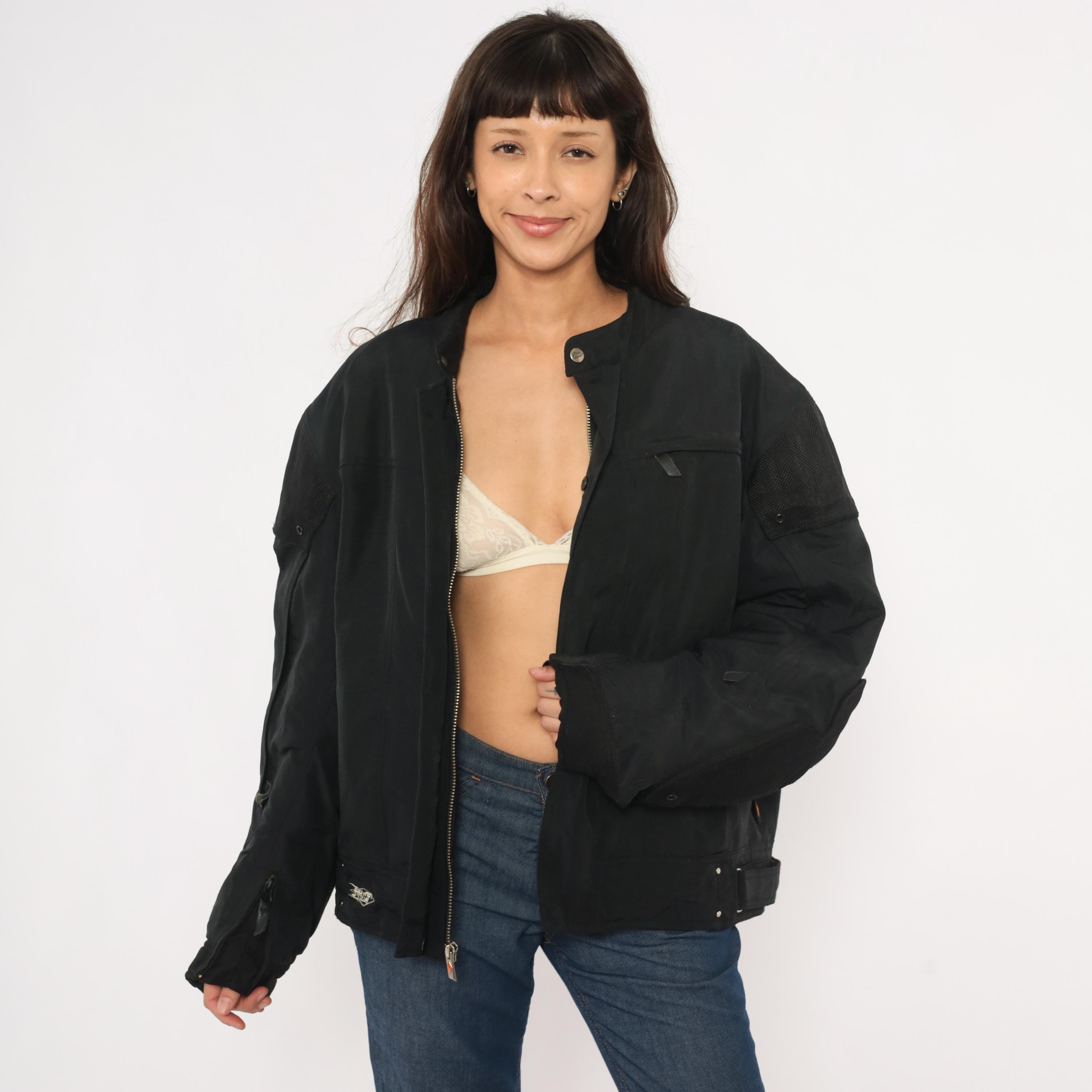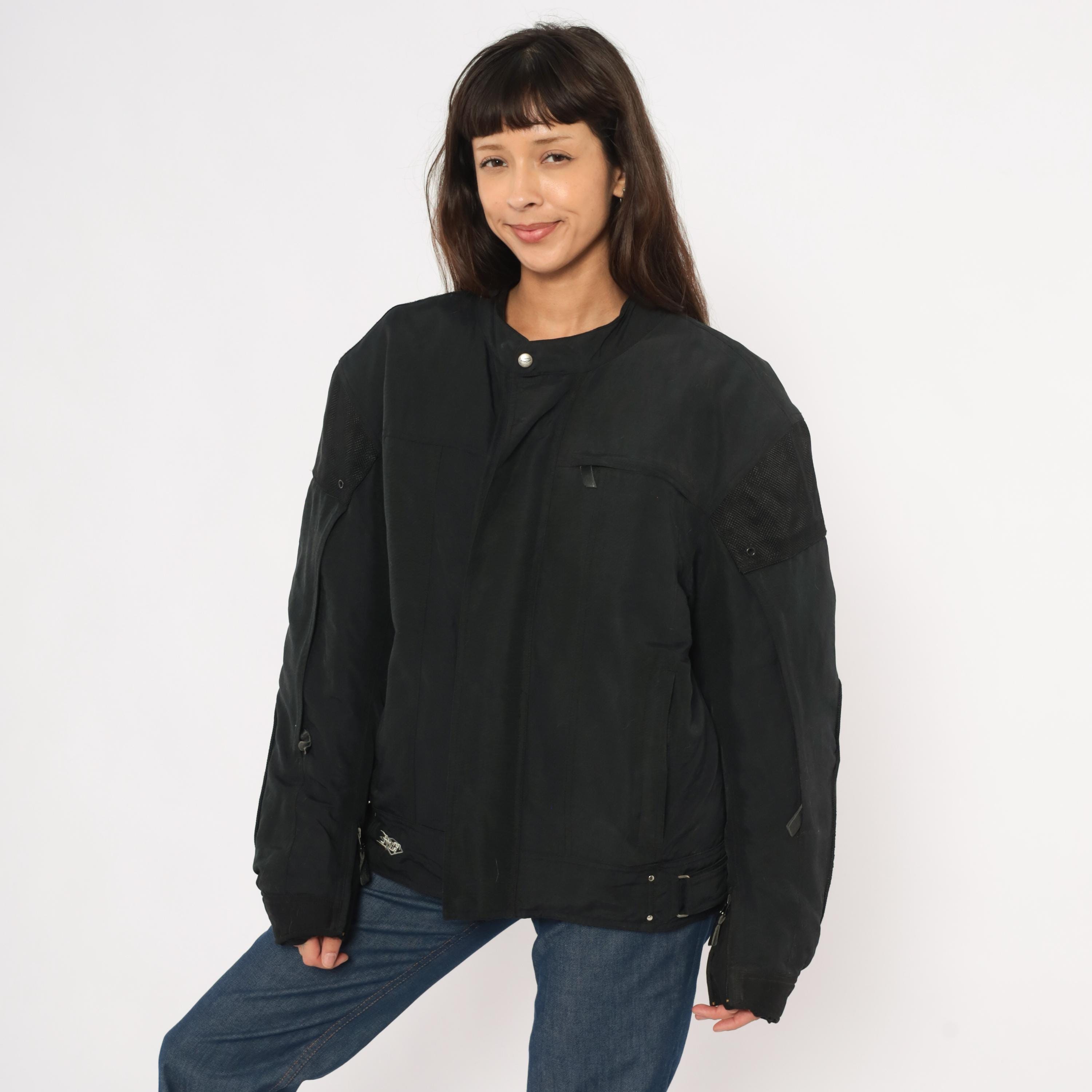 2000s black motorcycle jacket from Power Trip with snap-closure mandarin collar and full zip front. Mesh ventilation panels on the upper sleeves and forearms, with a zippered pocket across the lower back. Quilted lining with branded interior label, snap-tab cuffs, and a small chest pocket with flap closure. Has shoulder and arm padding for rider safety.