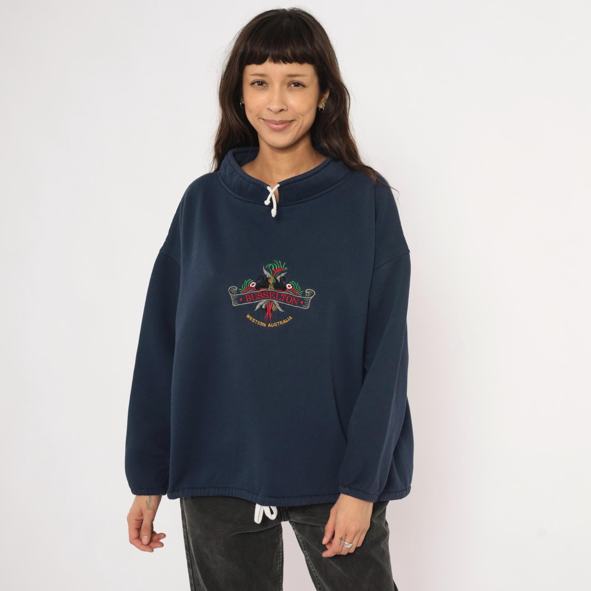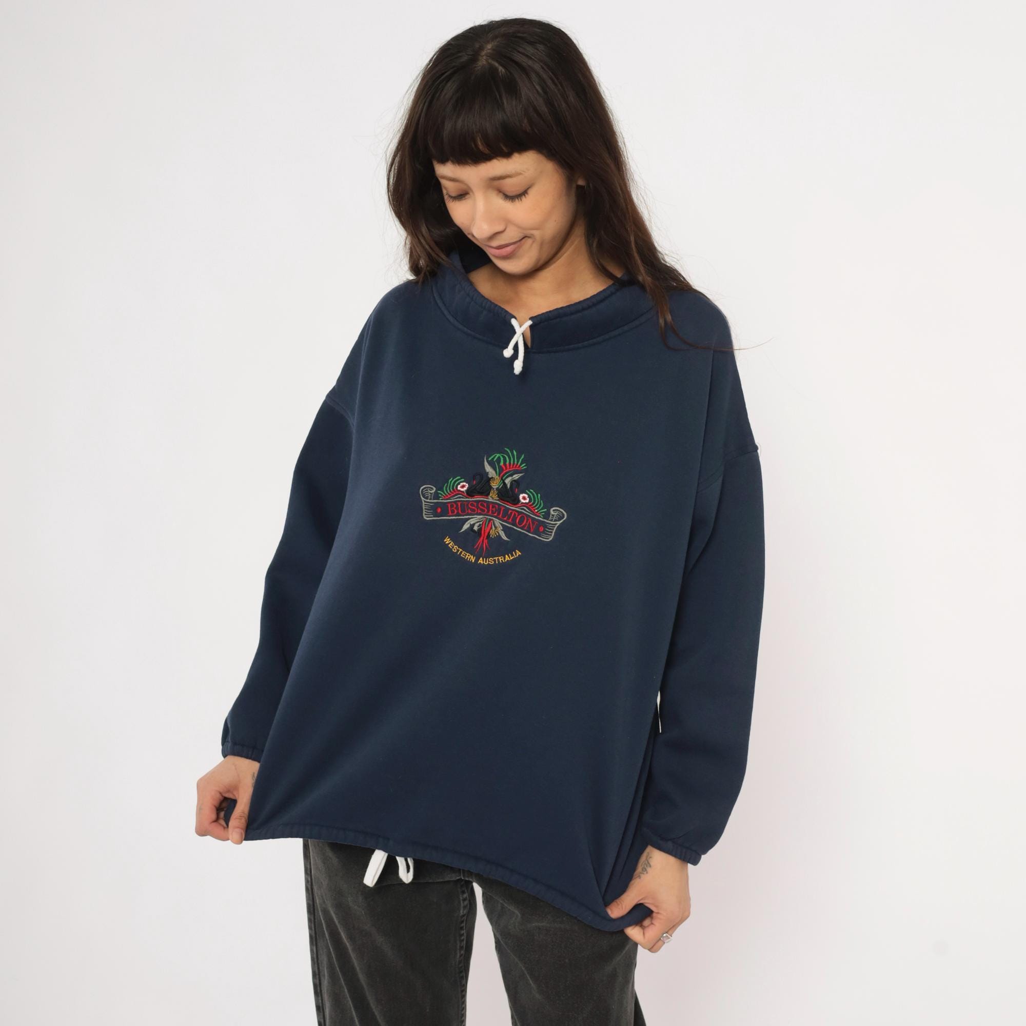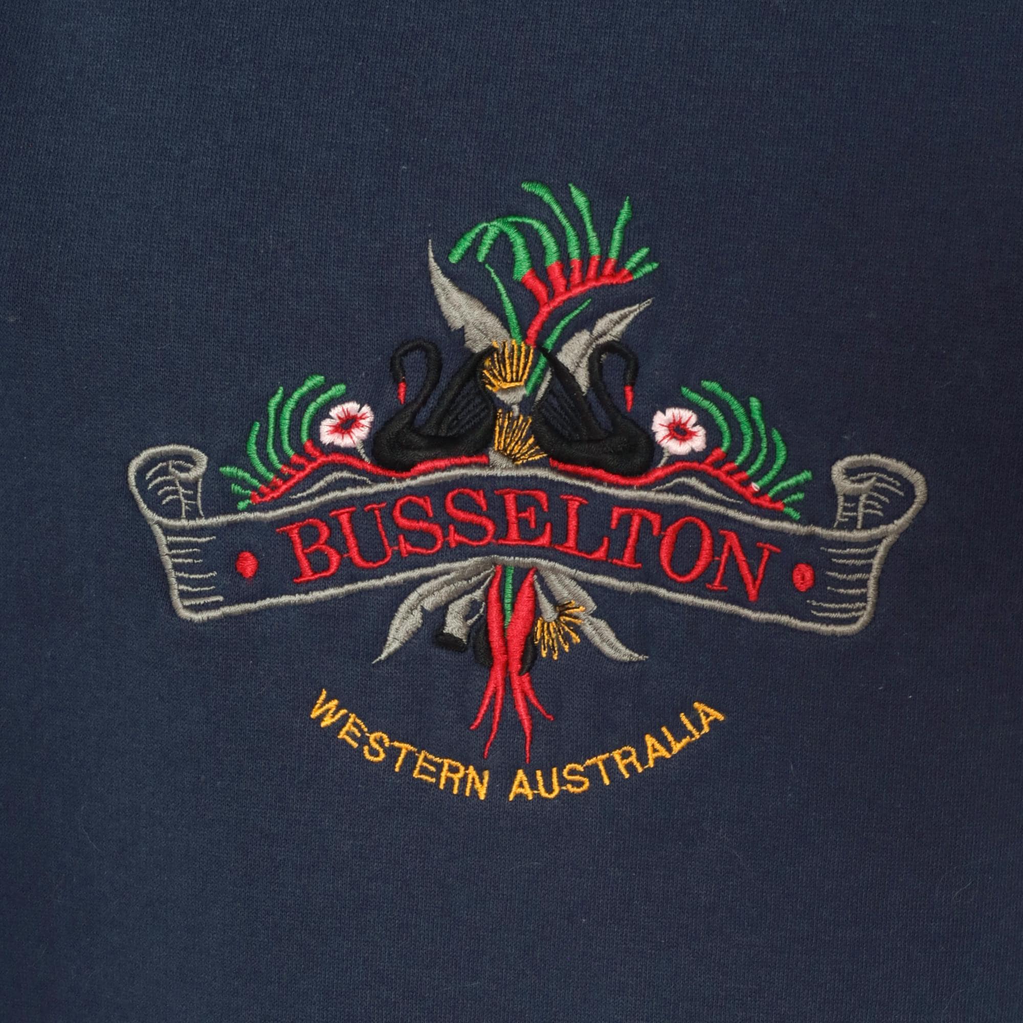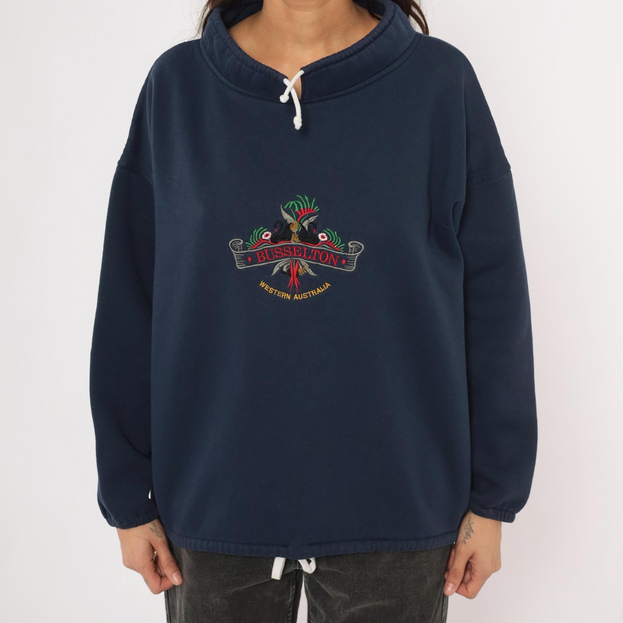 Navy blue 90s pullover sweatshirt with a stand collar, white drawstring closure at the neck, and a matching drawstring hem. Multicolor embroidered design on the chest depicting black swans, native flora, and a scroll banner reading "Busselton, Western Australia." Drop shoulder seams, elasticized cuffs, and a plain back.