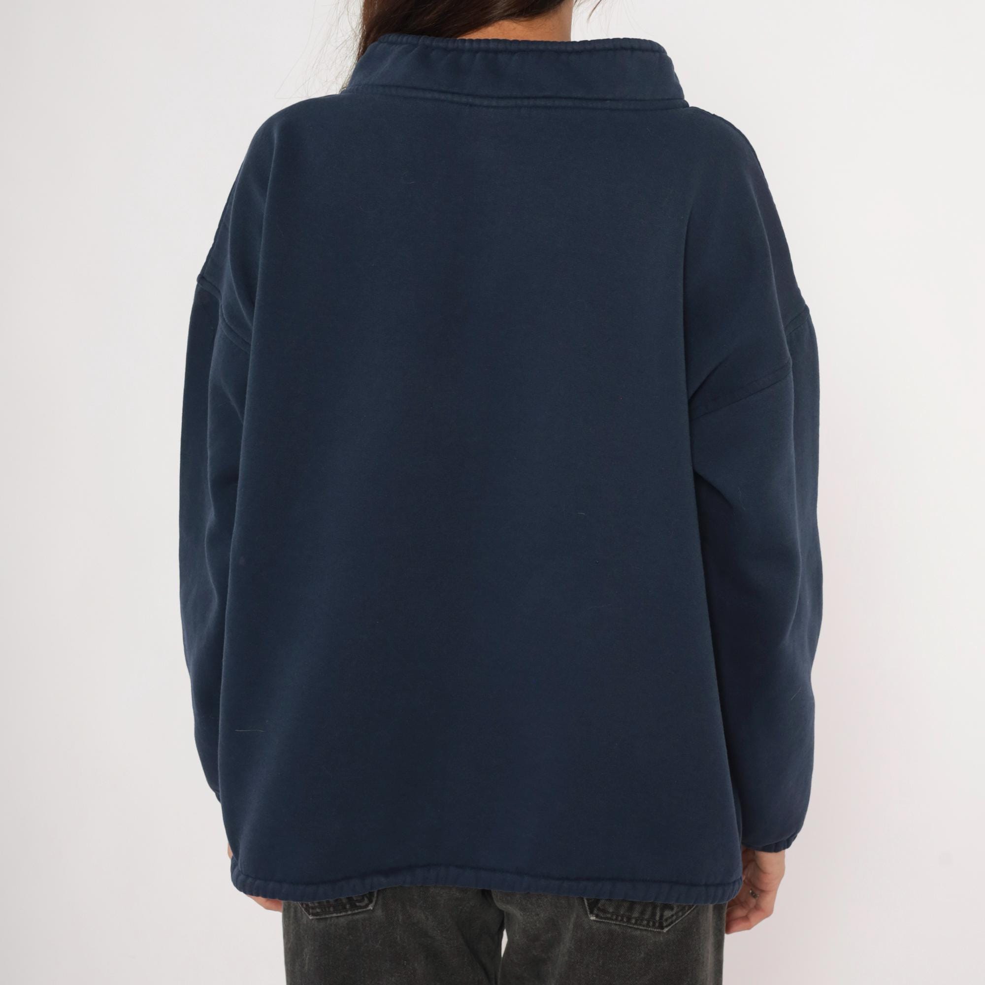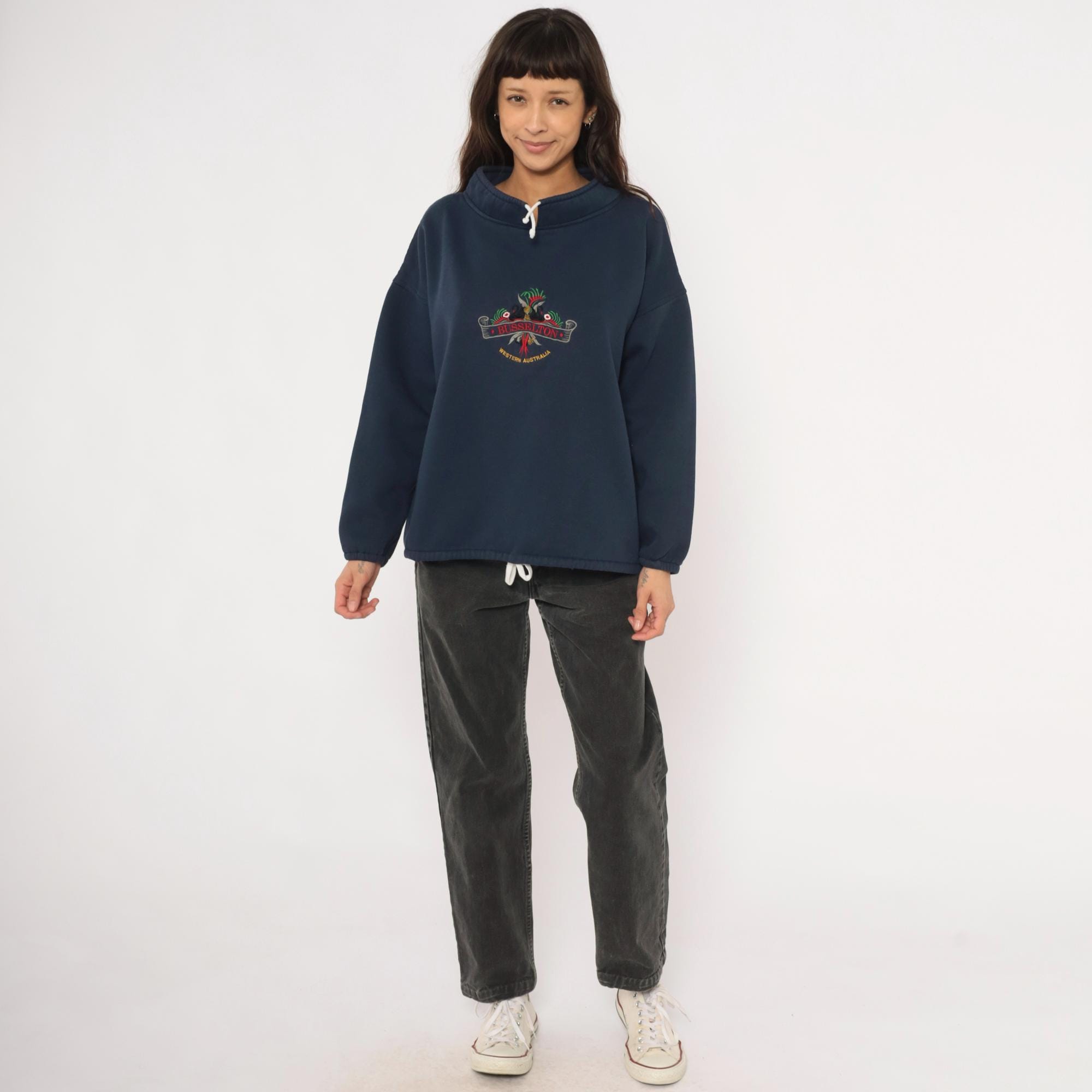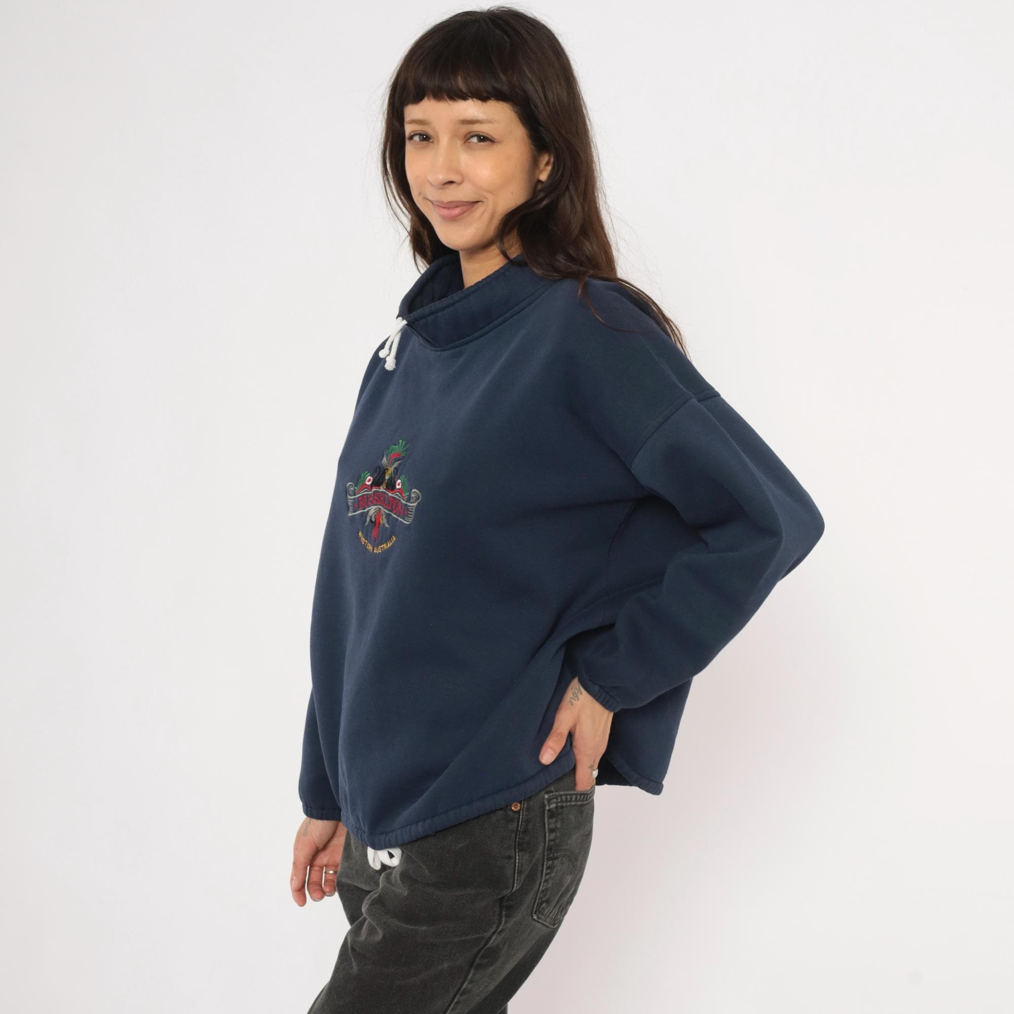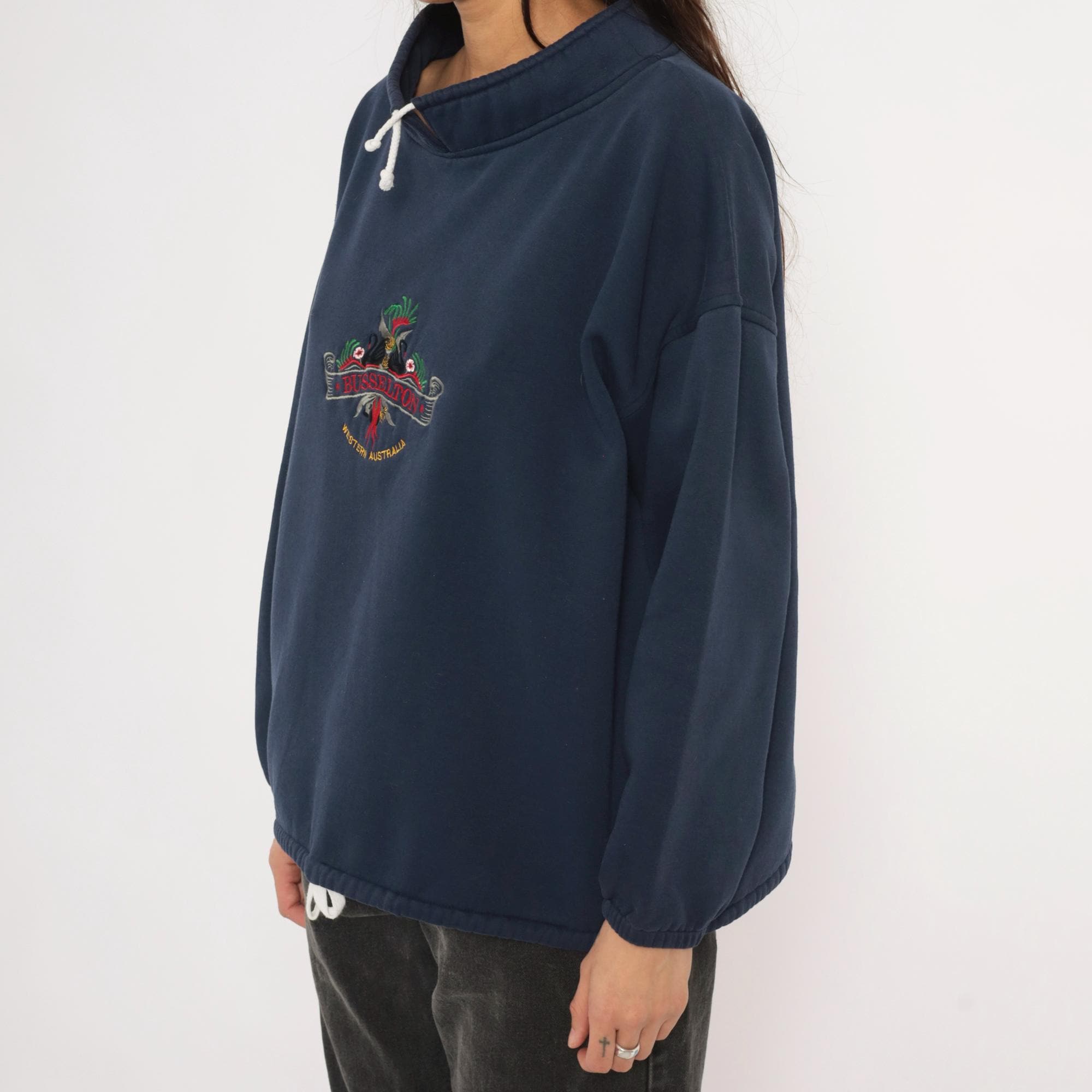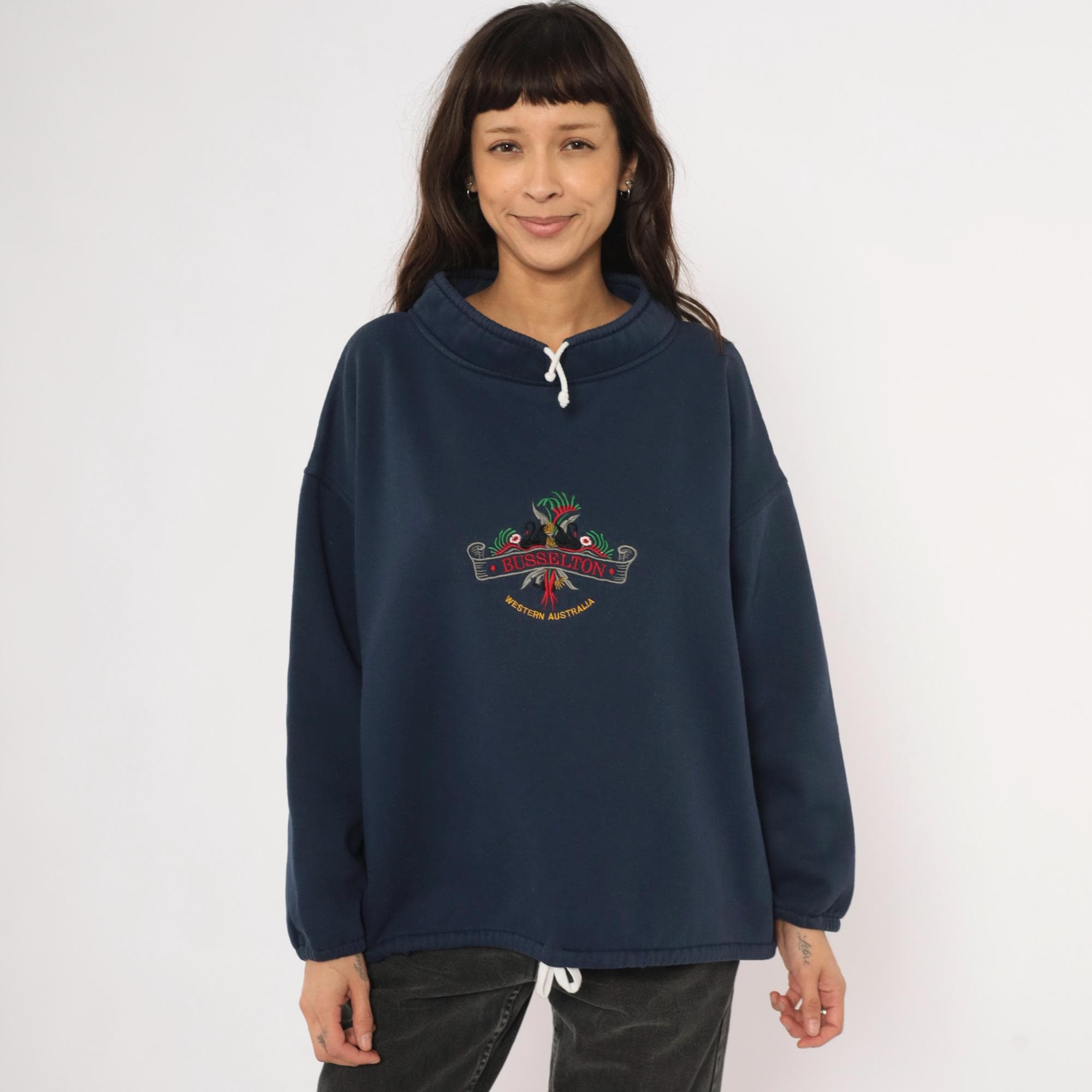 Navy blue 90s pullover sweatshirt with a stand collar, white drawstring closure at the neck, and a matching drawstring hem. Multicolor embroidered design on the chest depicting black swans, native flora, and a scroll banner reading "Busselton, Western Australia." Drop shoulder seams, elasticized cuffs, and a plain back.