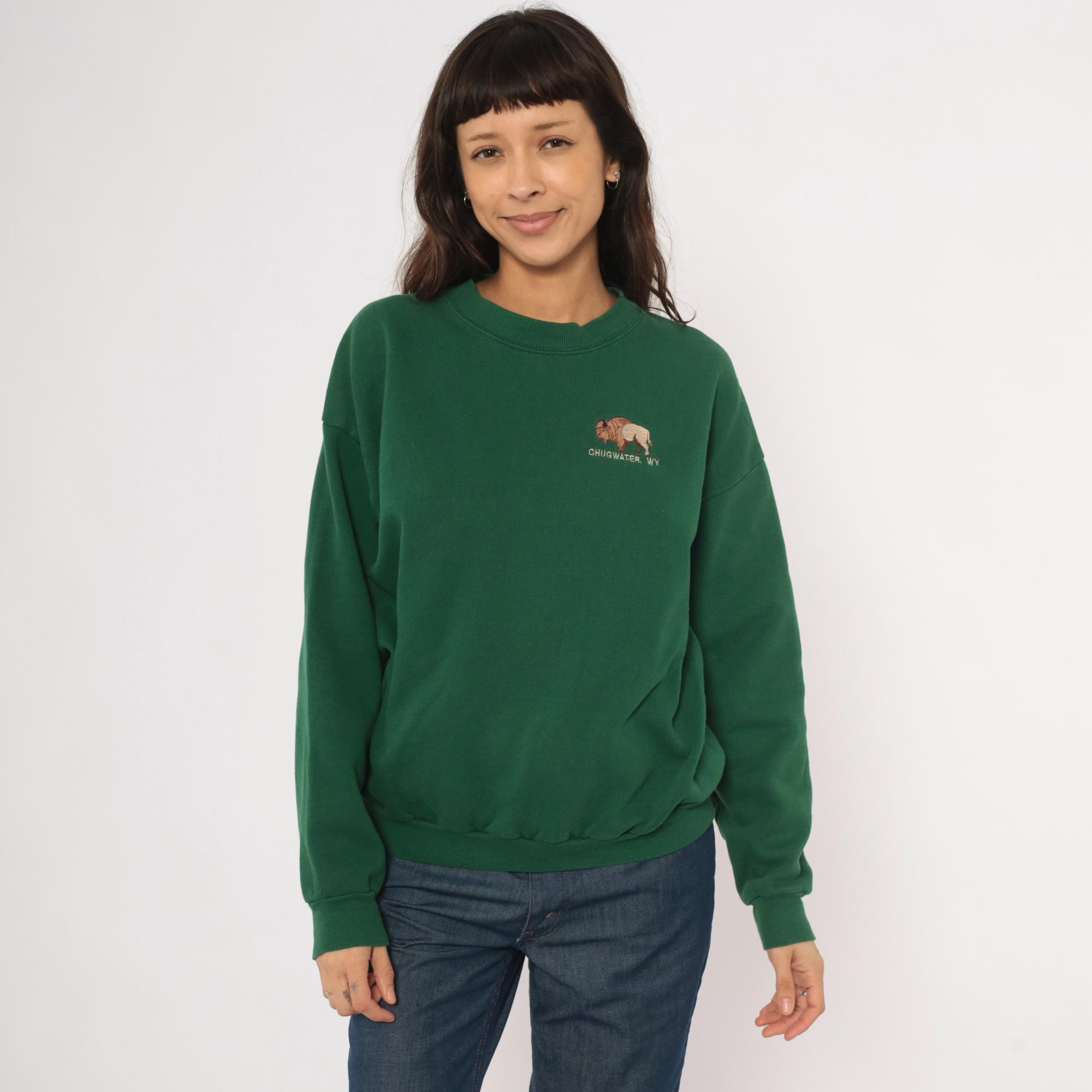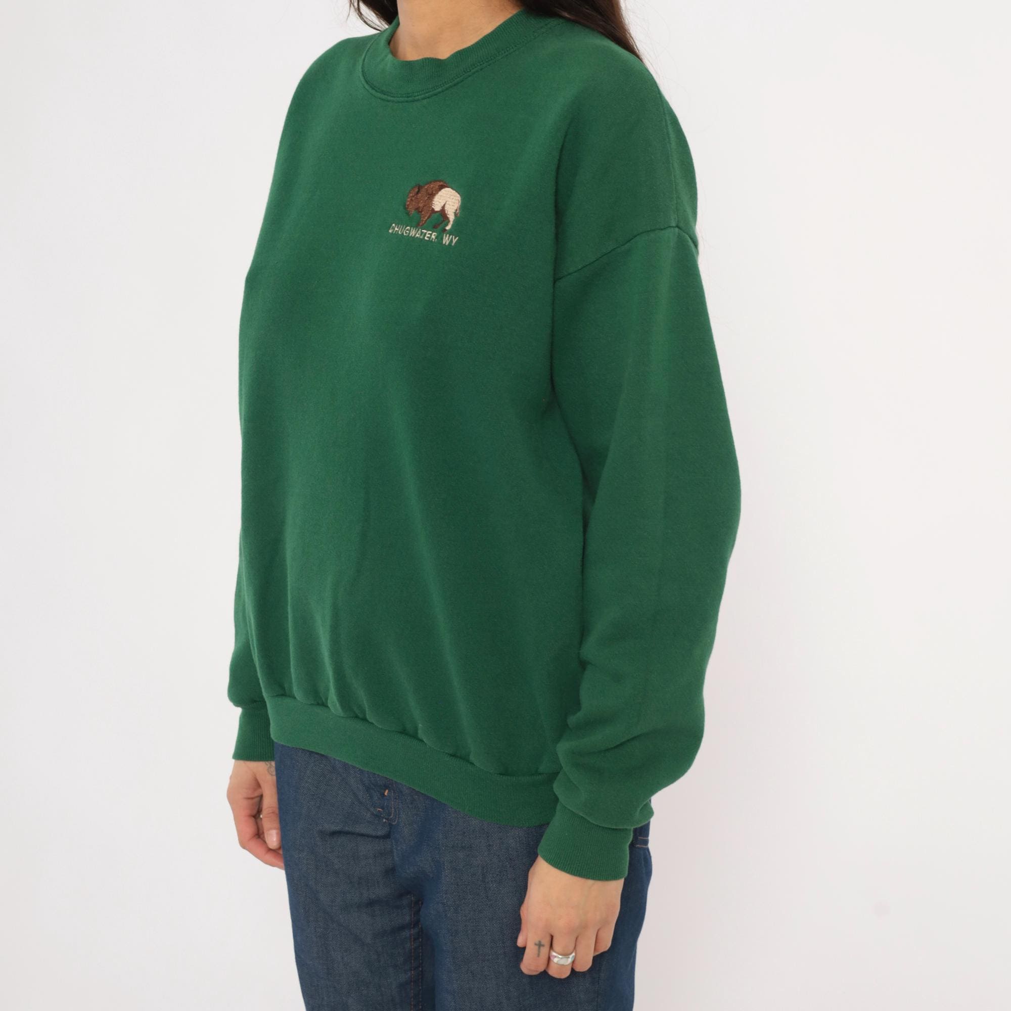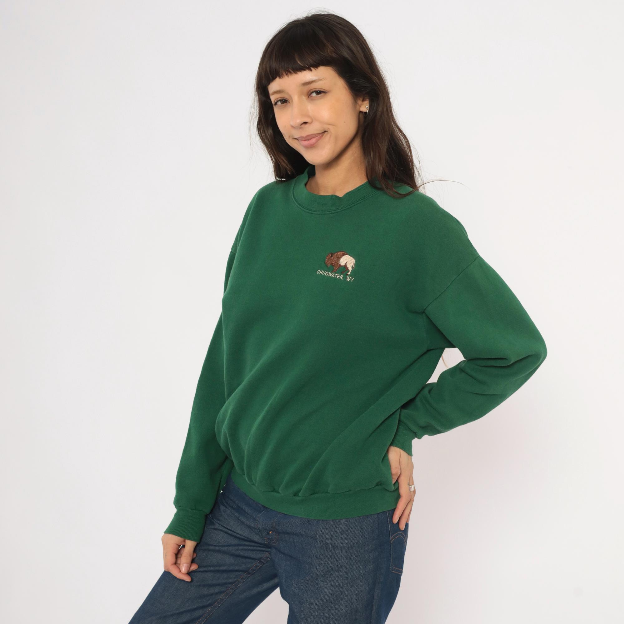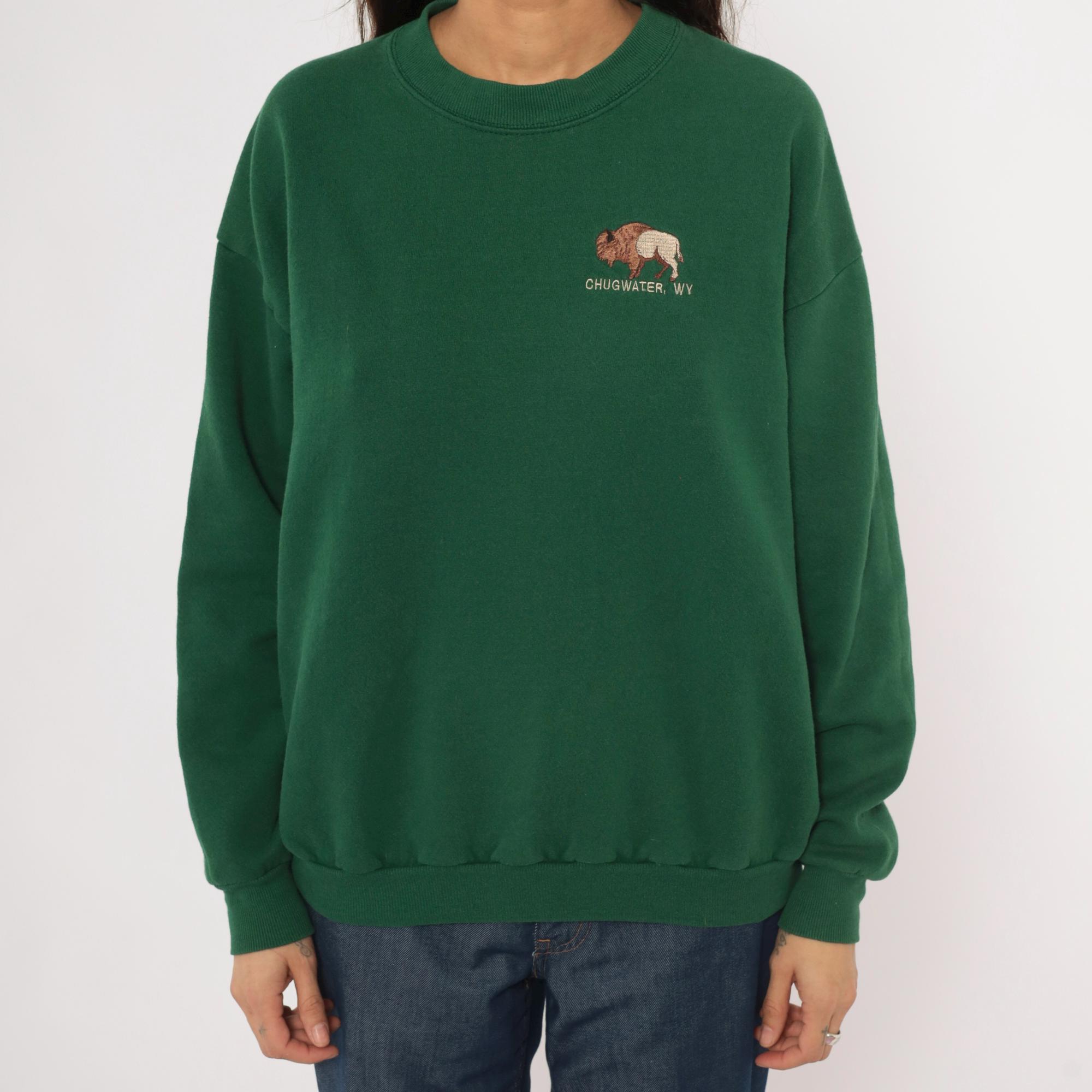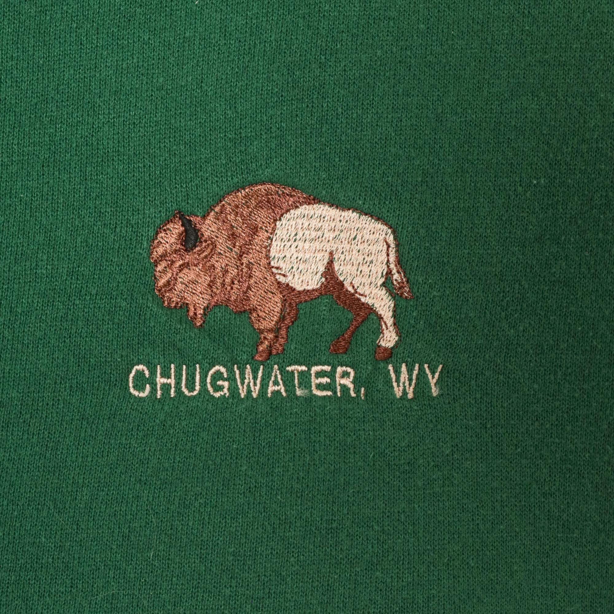 90s forest green crewneck sweatshirt from Lee with an embroidered bison graphic on the left chest and "Chugwater, WY" text beneath it. Ribbed crew neckline, cuffs, and waistband with a relaxed, boxy silhouette. Plain back with dropped shoulder seams and long sleeves.