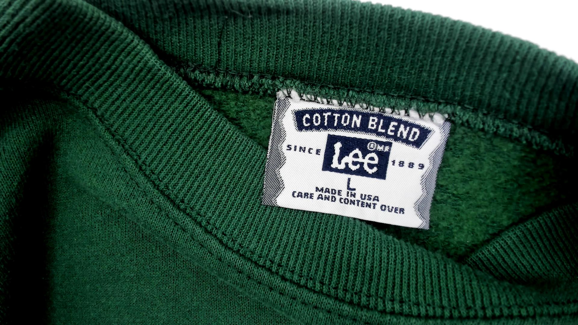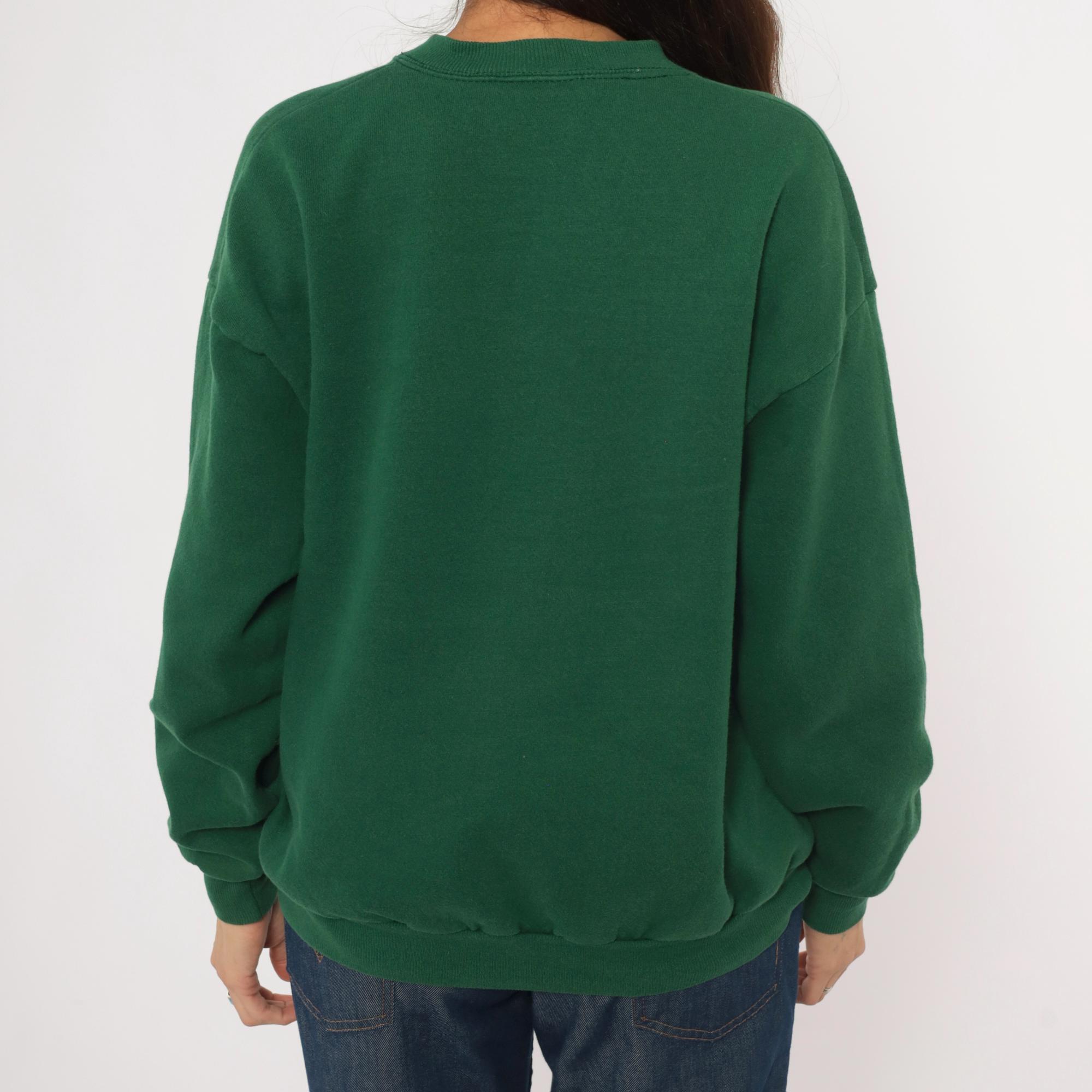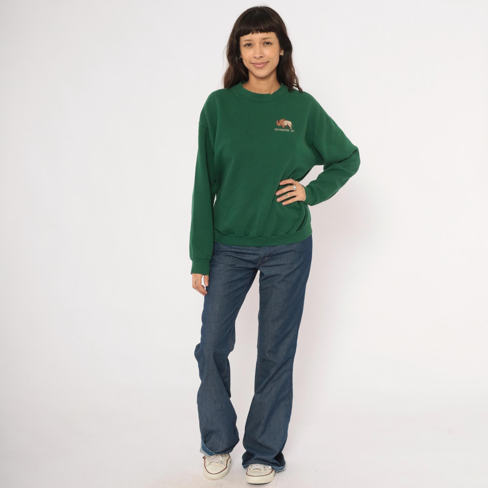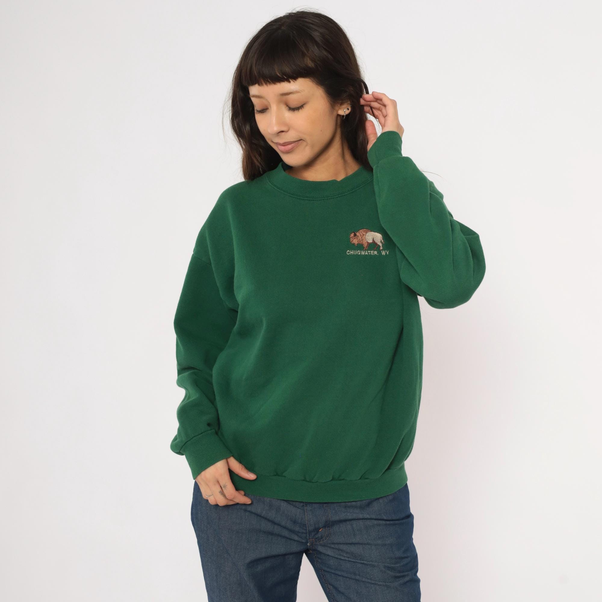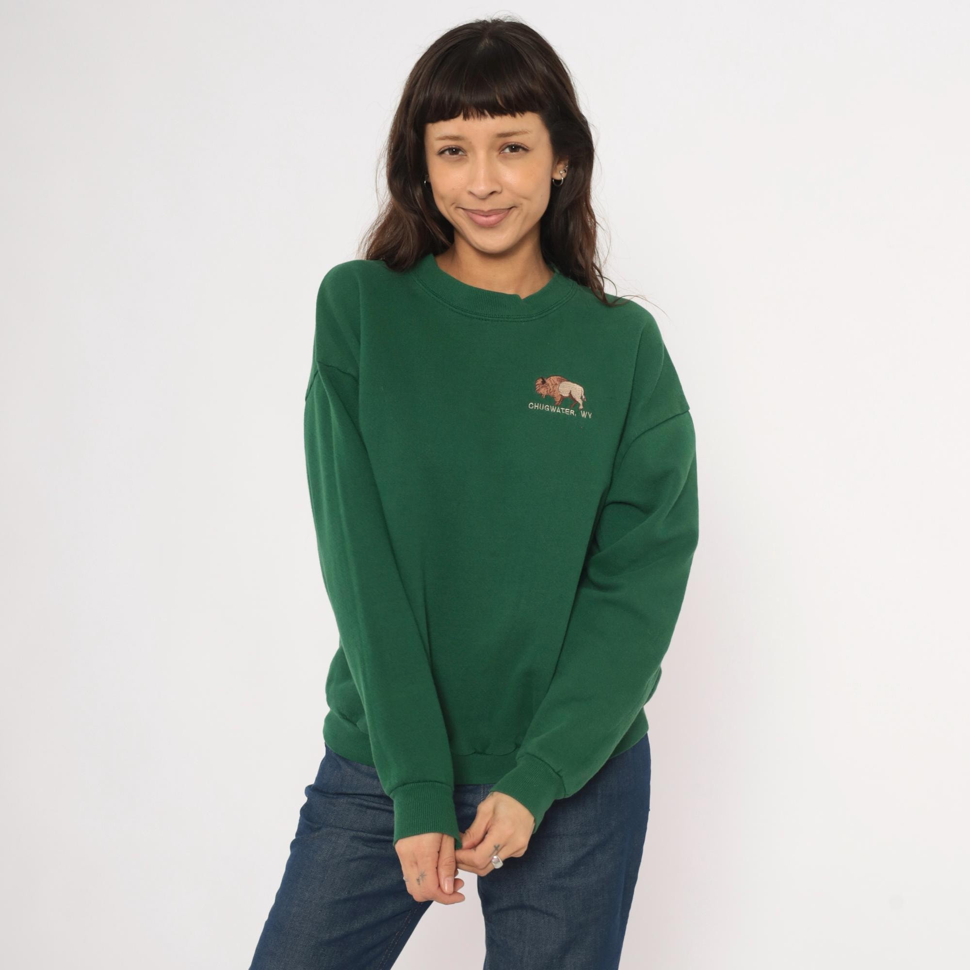 90s forest green crewneck sweatshirt from Lee with an embroidered bison graphic on the left chest and "Chugwater, WY" text beneath it. Ribbed crew neckline, cuffs, and waistband with a relaxed, boxy silhouette. Plain back with dropped shoulder seams and long sleeves.