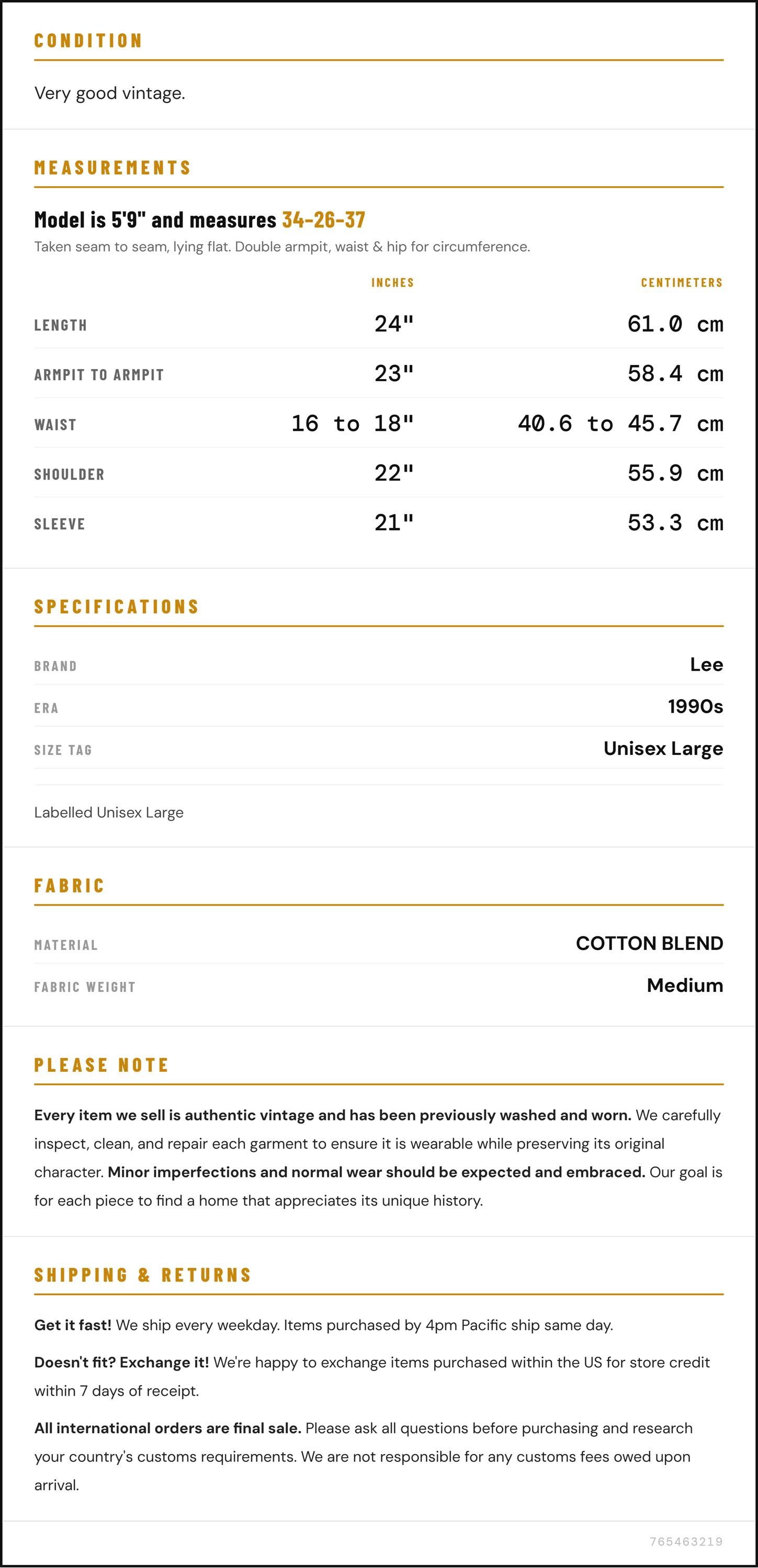 Vintage denim was usually made without any stretch, unlike modern jeans. Check the measurements to ensure proper fit, and remember to give yourself a little wiggle room in the waist and hips, depending on your preferred fit.