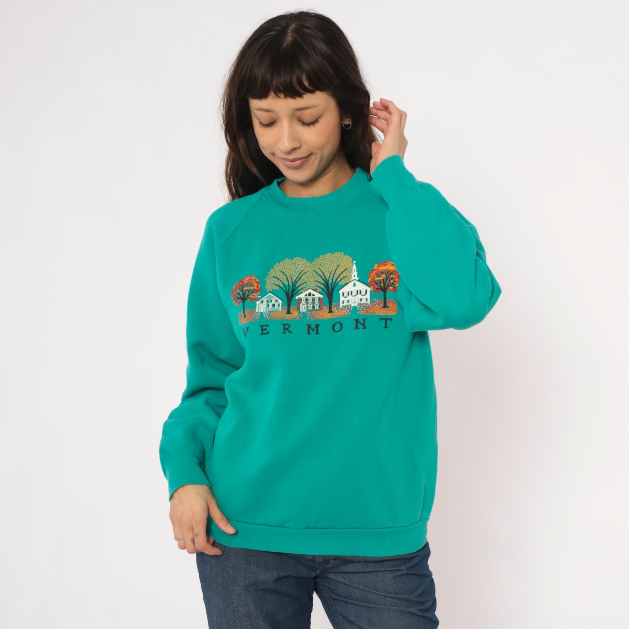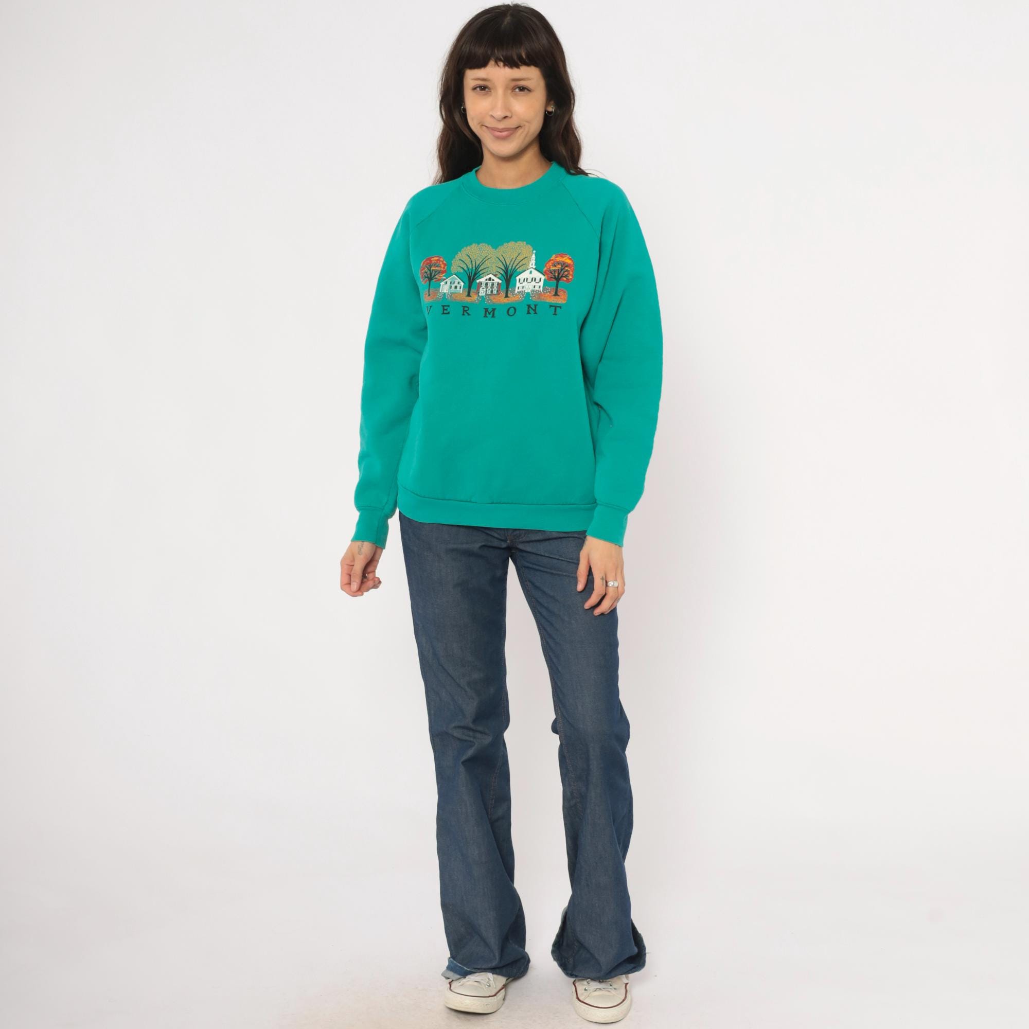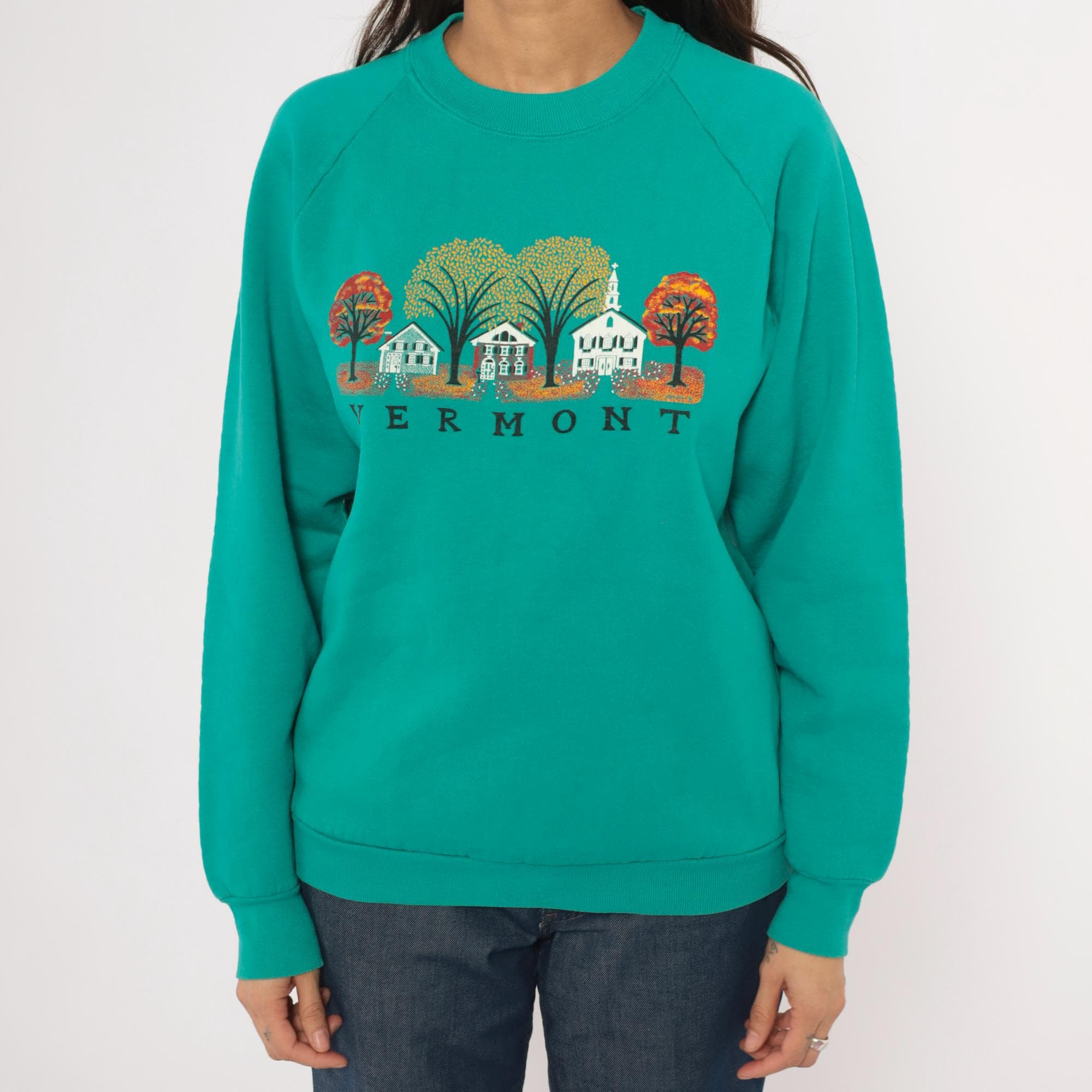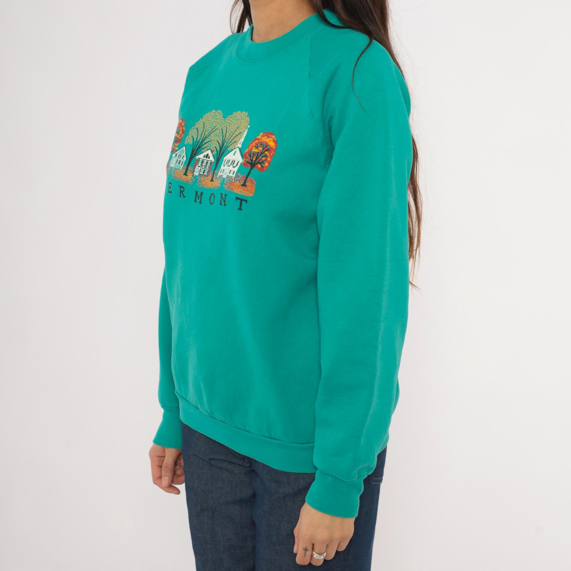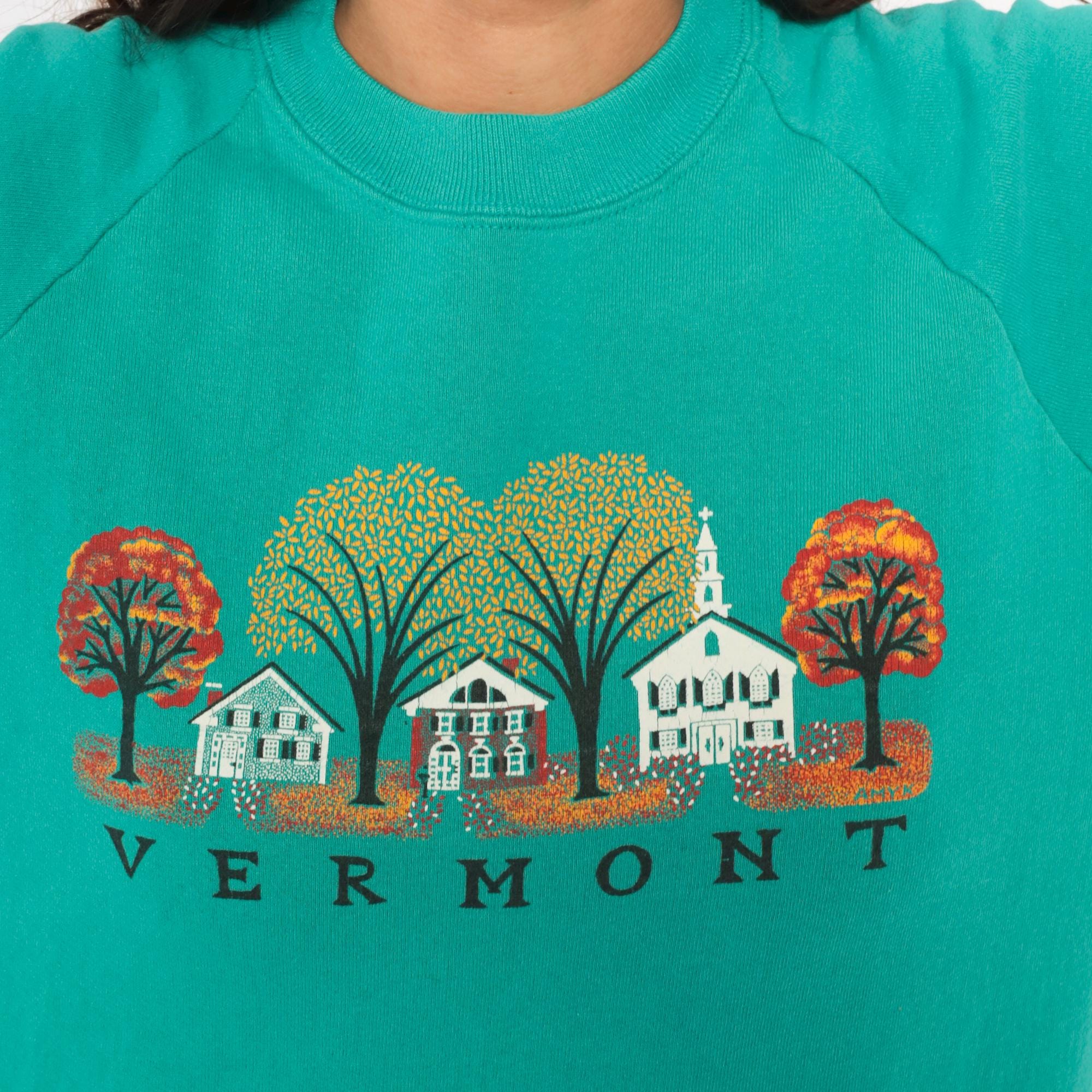 Teal crewneck sweatshirt from the 90s with a printed autumn village scene across the chest, depicting New England-style houses, a church steeple, and trees in fall foliage colors of red, orange, and gold. "VERMONT" is printed in dark serif lettering below the illustration.