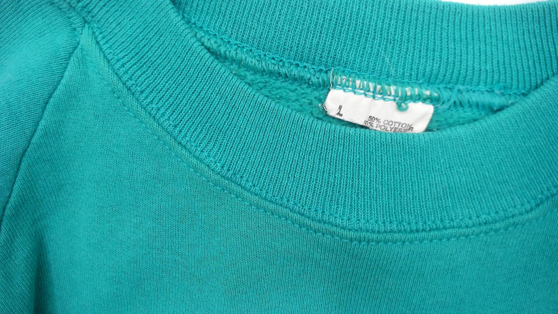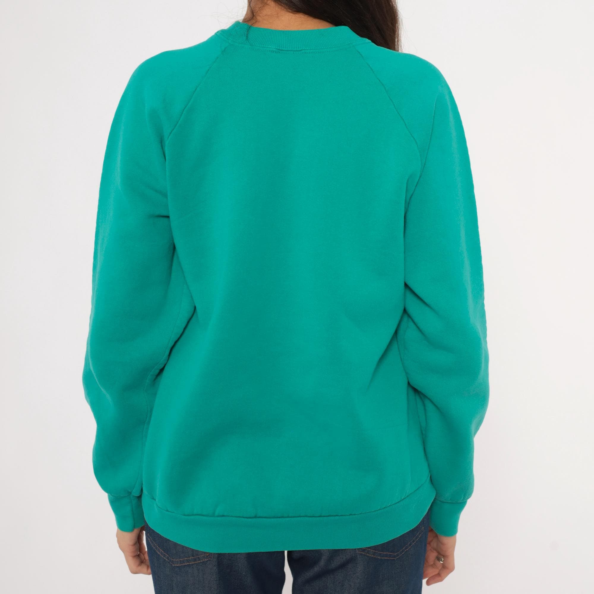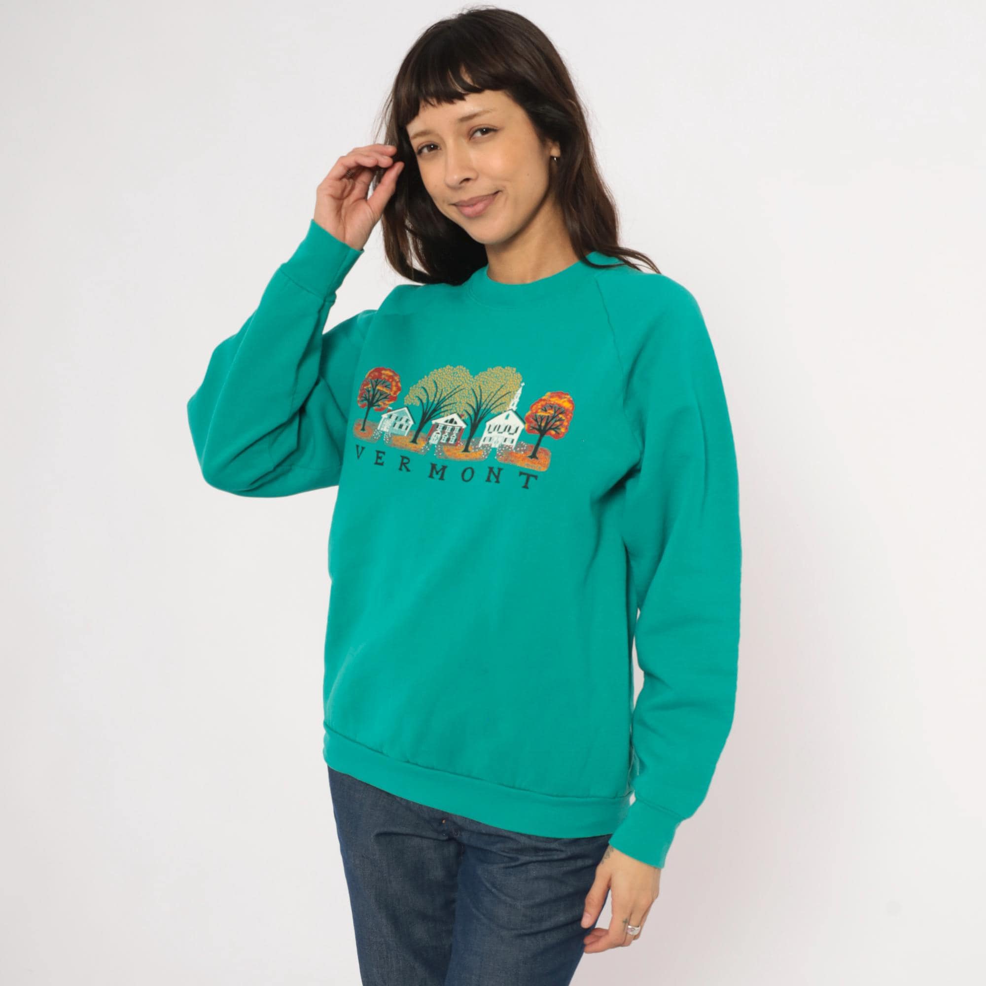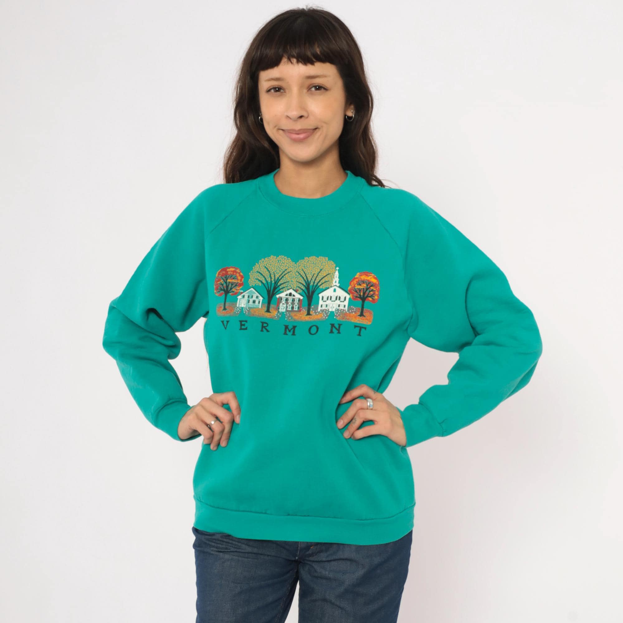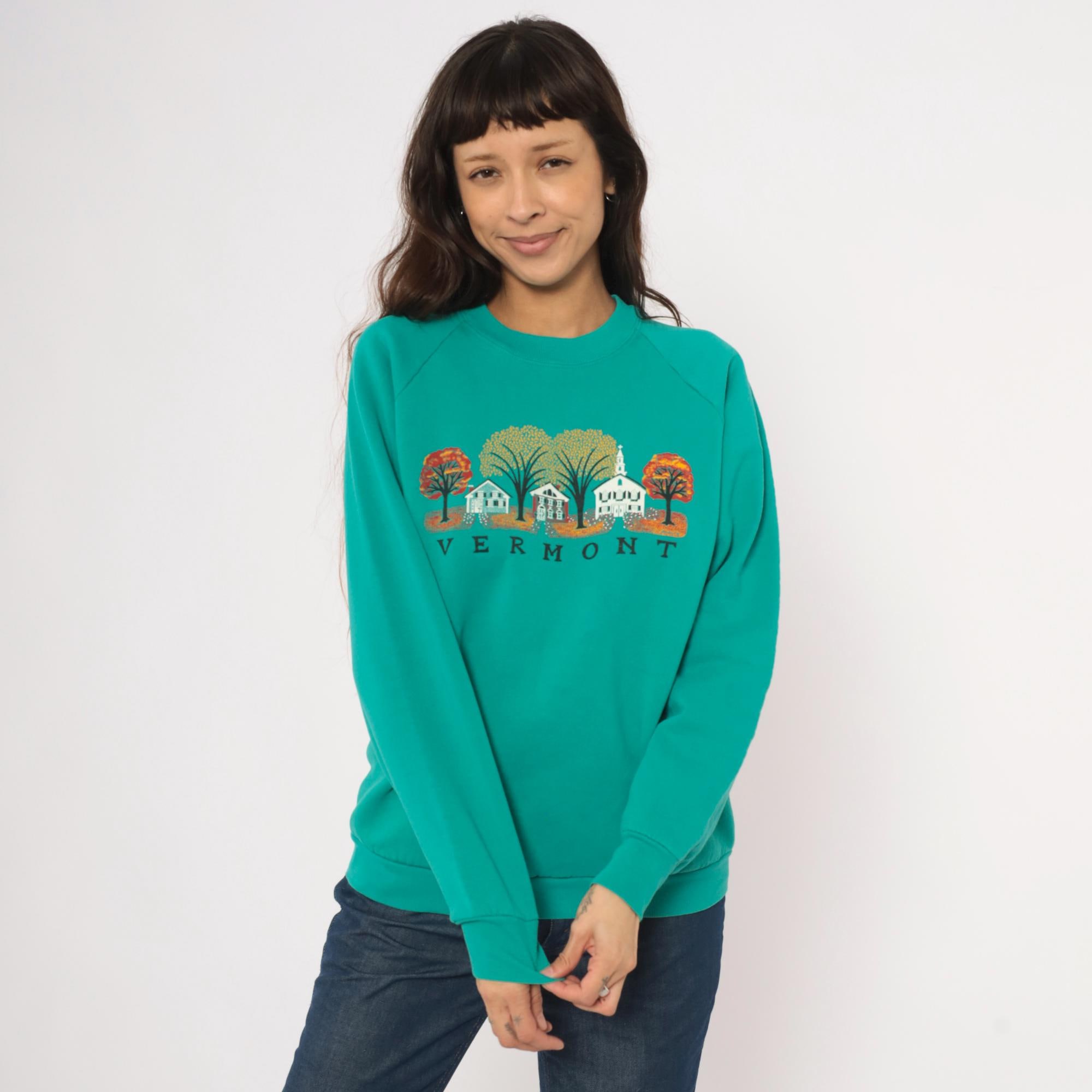 Teal crewneck sweatshirt from the 90s with a printed autumn village scene across the chest, depicting New England-style houses, a church steeple, and trees in fall foliage colors of red, orange, and gold. "VERMONT" is printed in dark serif lettering below the illustration.