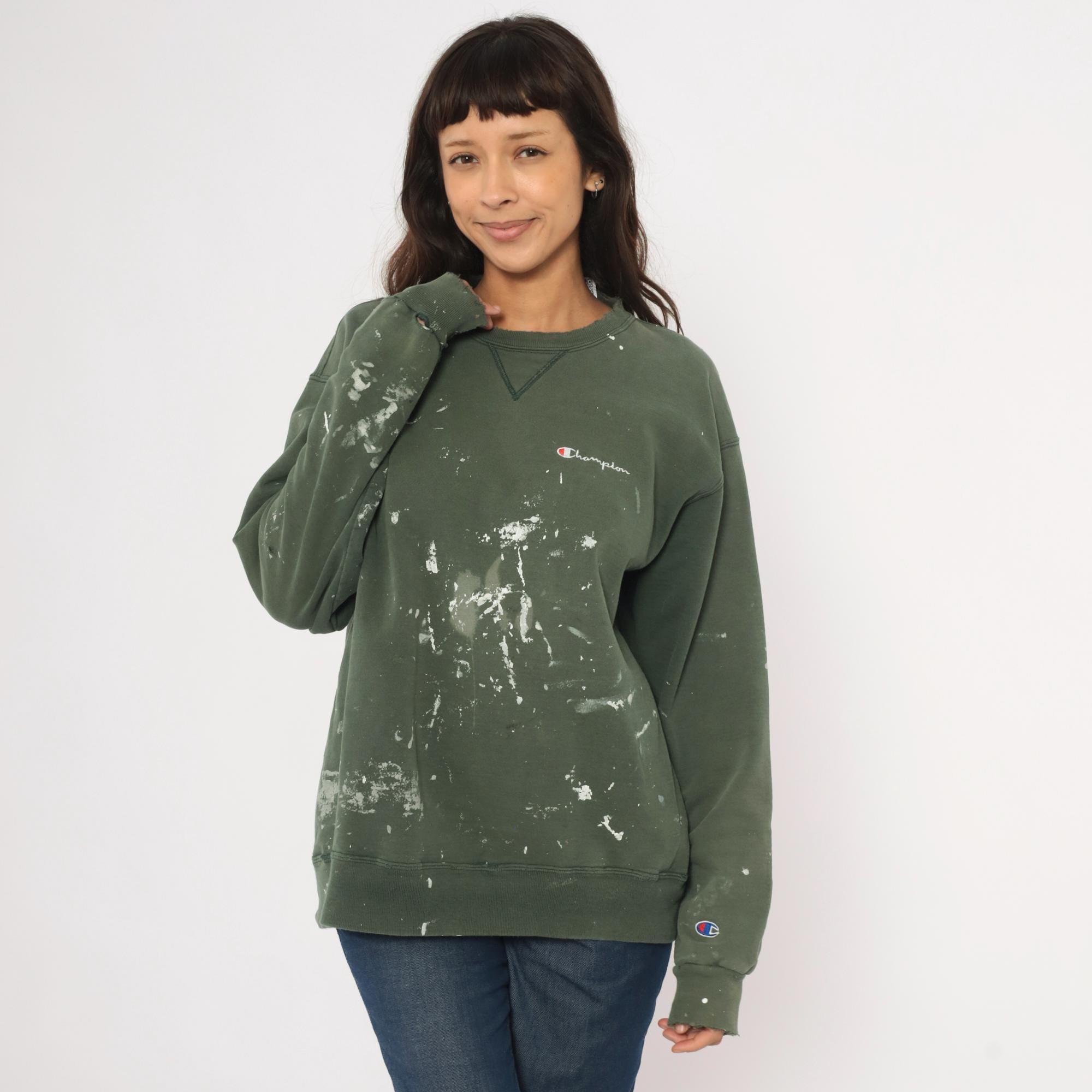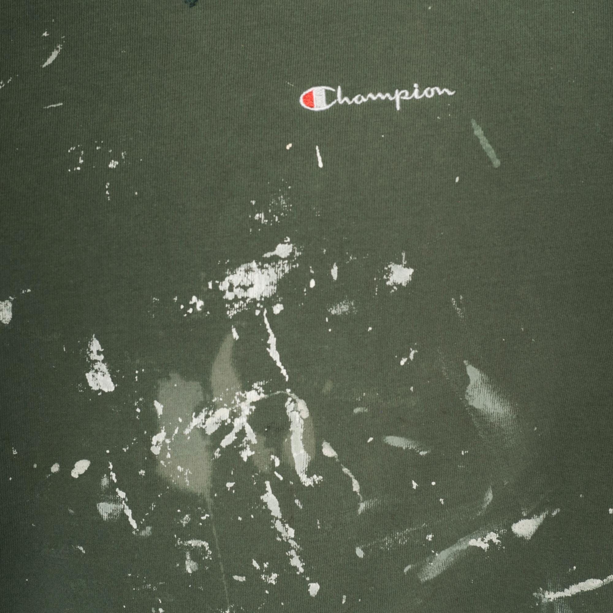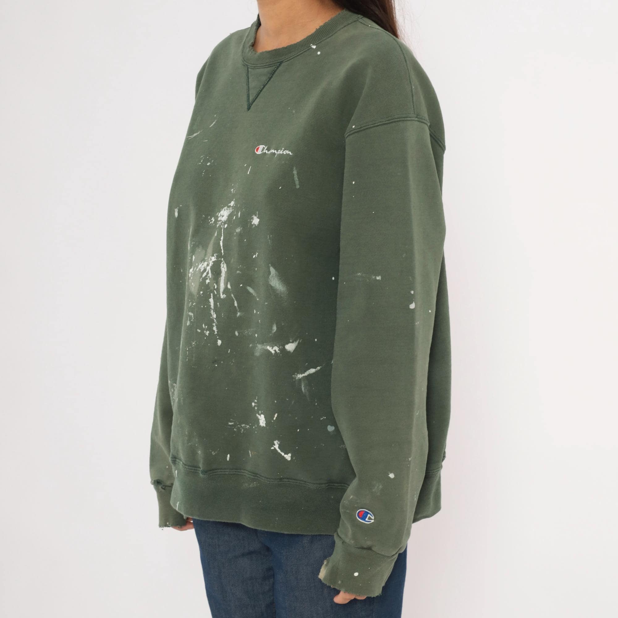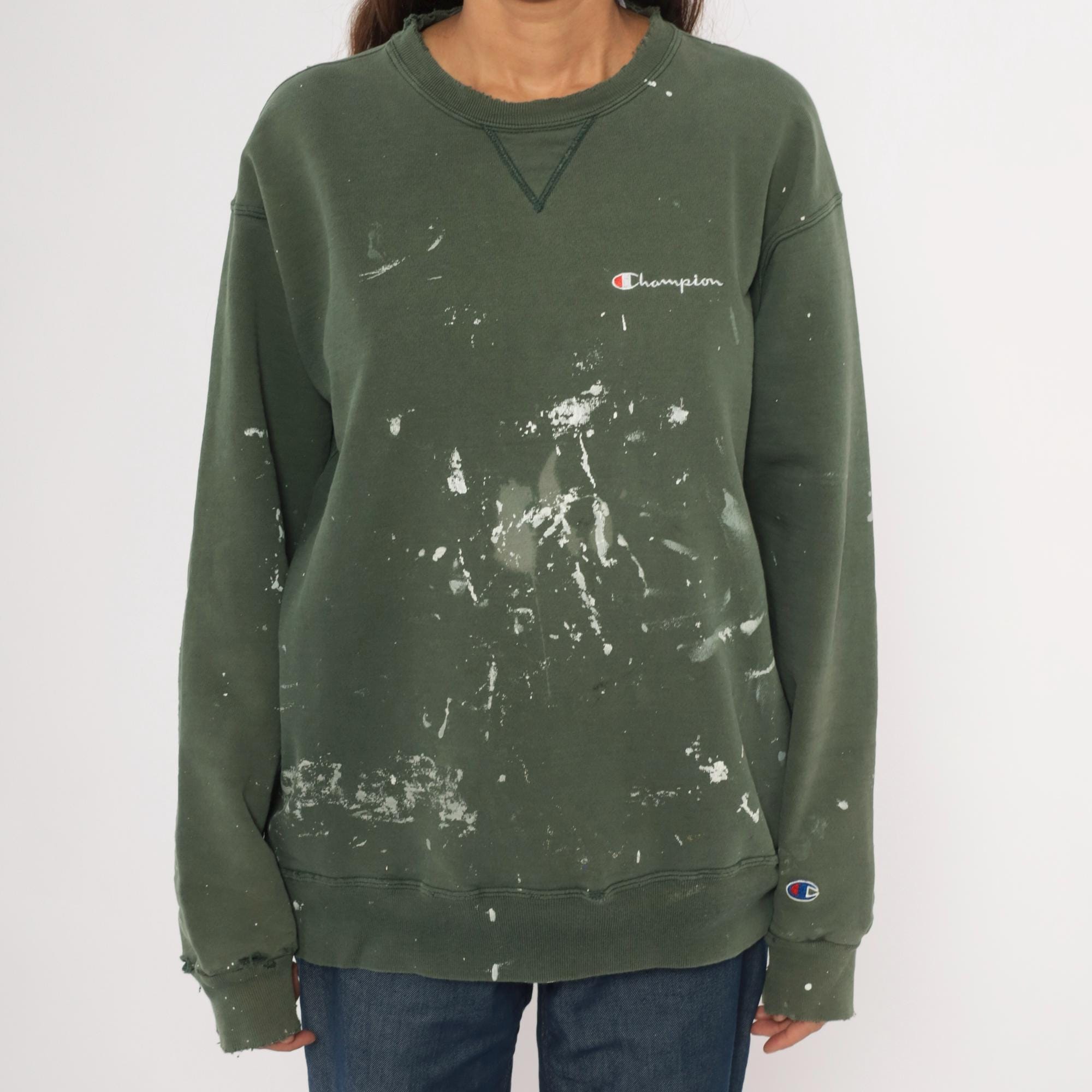 Olive green Champion crewneck sweatshirt from the 2000s with white paint splatter and splatches across the front, sleeves, and back. Embroidered Champion script logo on the left chest with the signature "C" patch on the left cuff. Ribbed crew neckline with a V-notch detail, ribbed cuffs, and ribbed waistband with raw, frayed edges throughout.