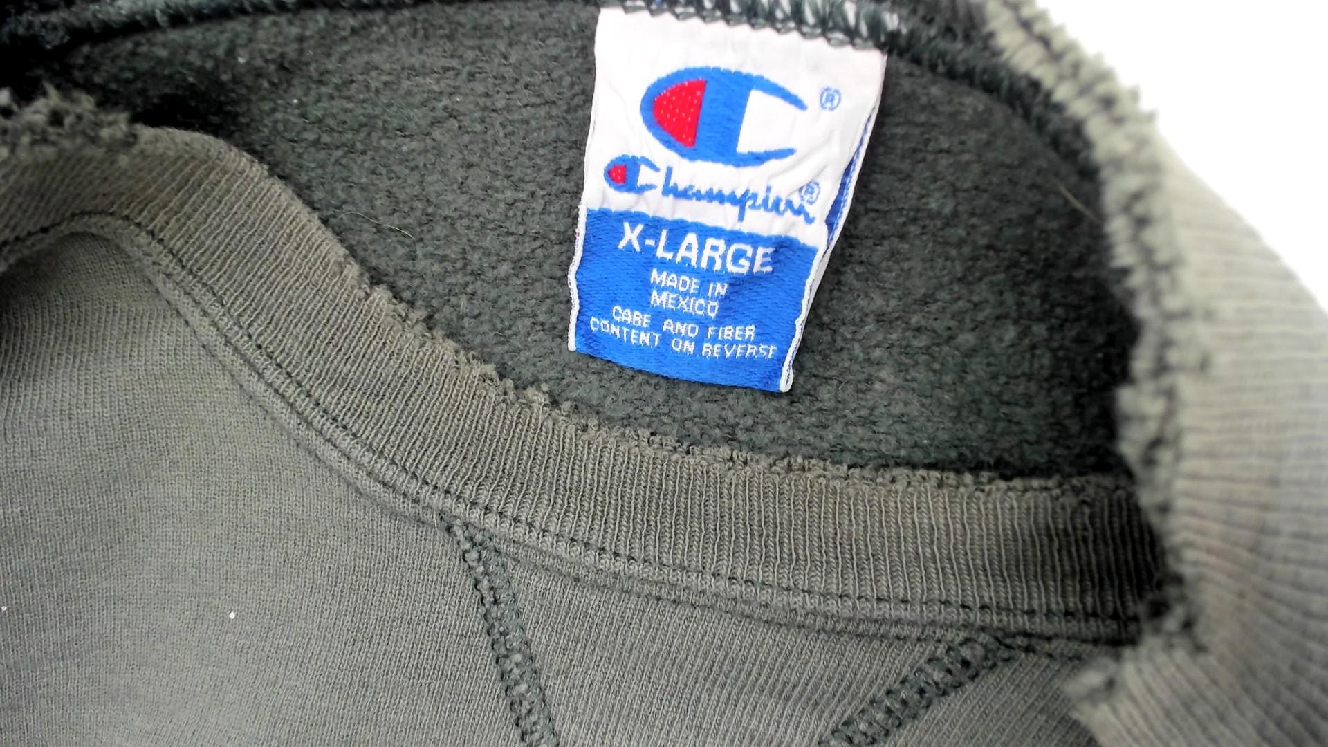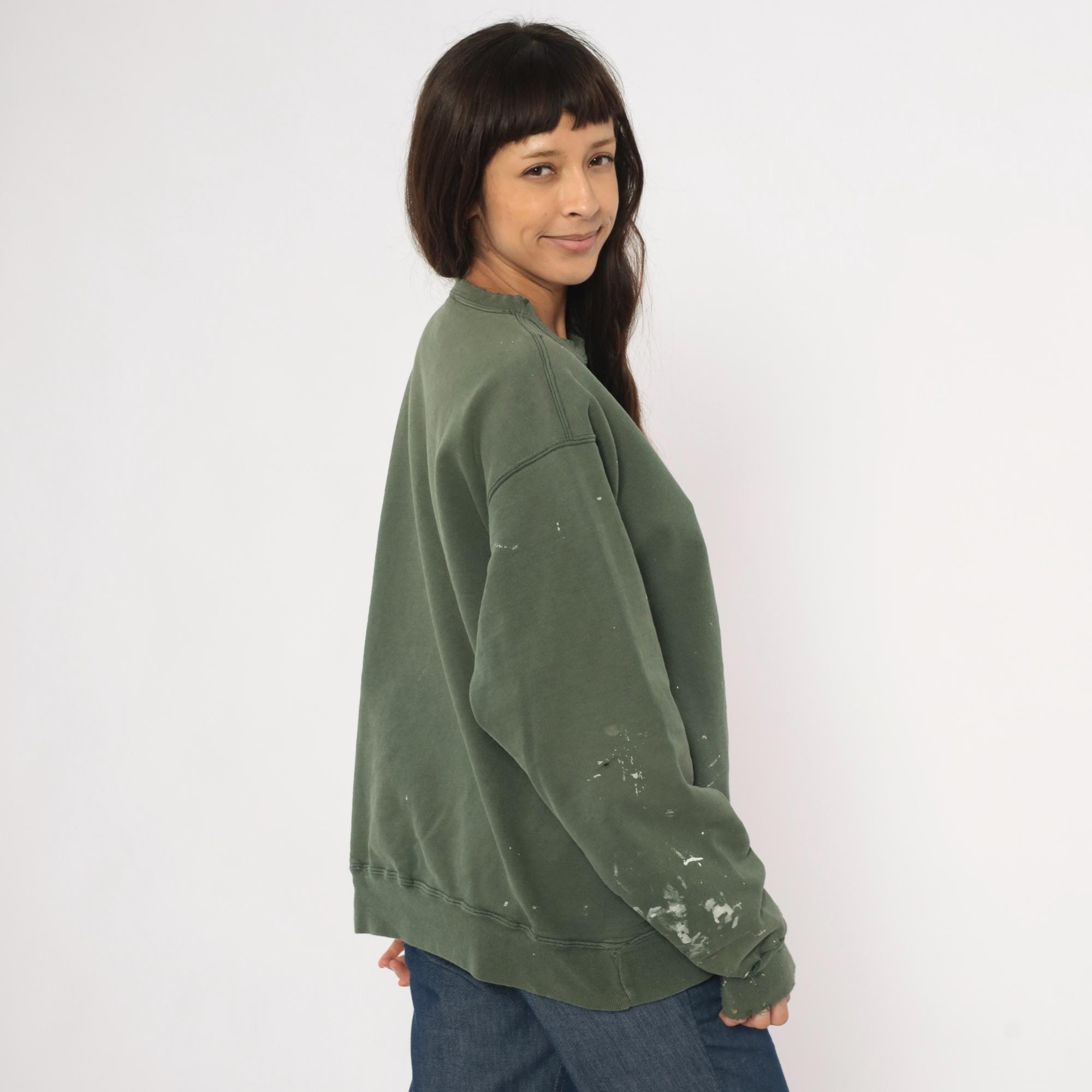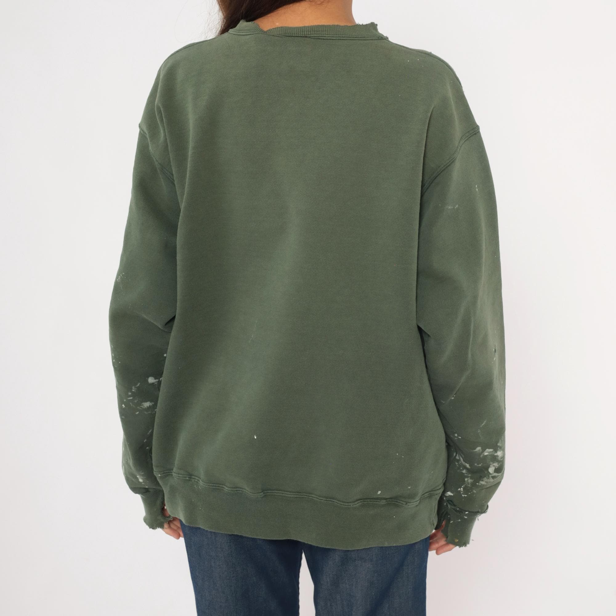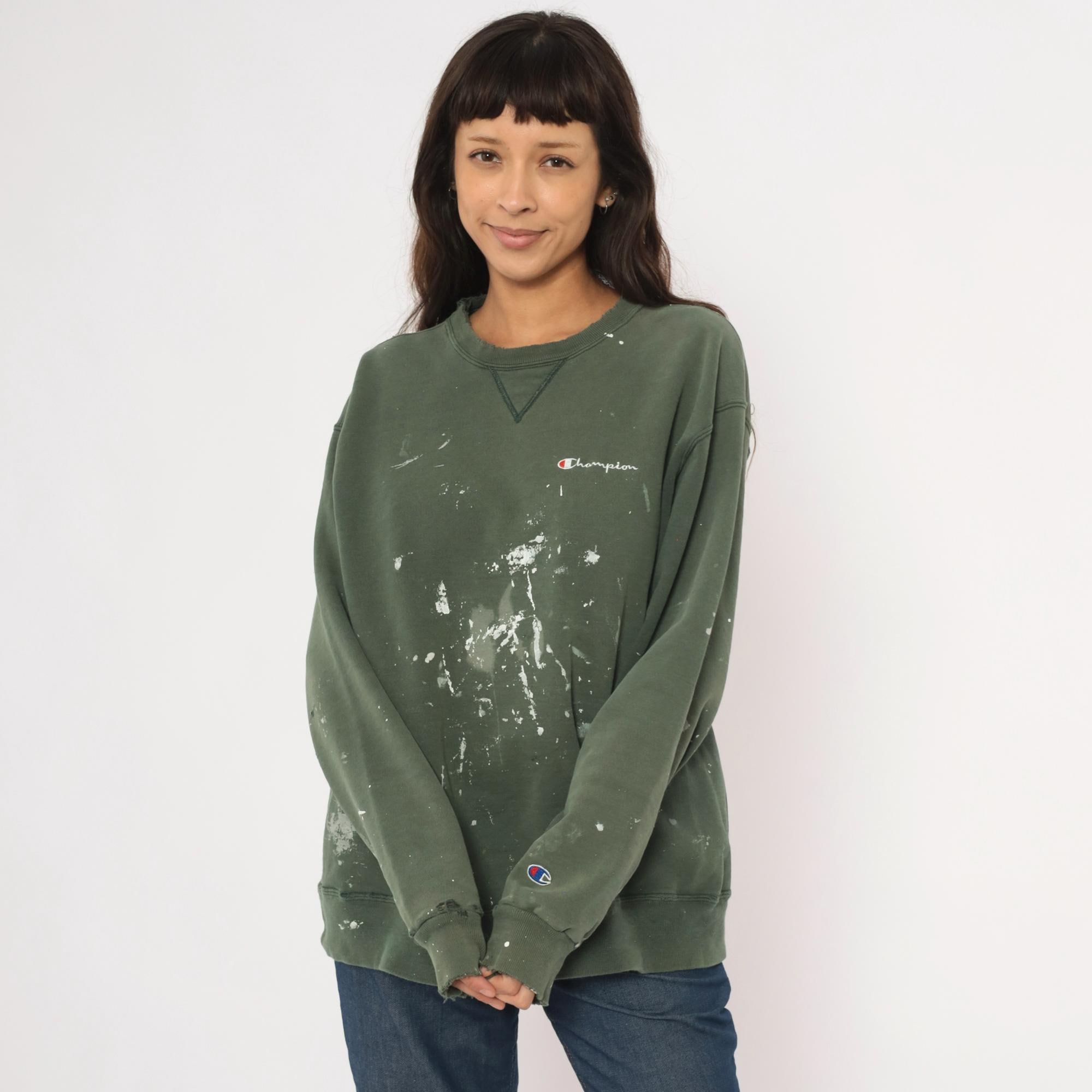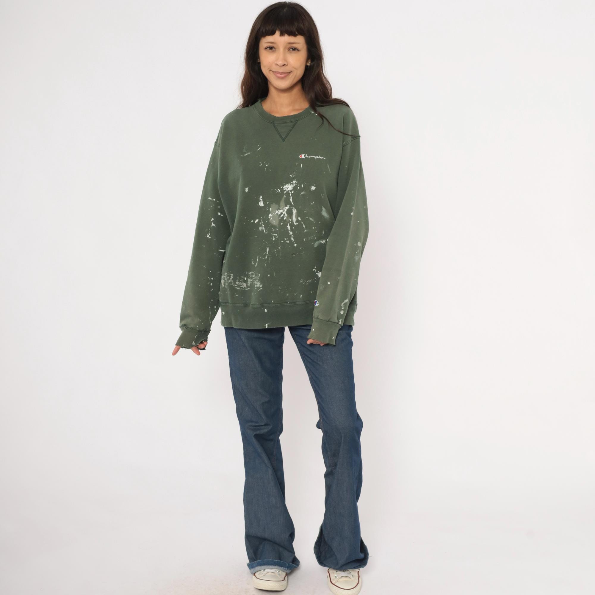 Olive green Champion crewneck sweatshirt from the 2000s with white paint splatter and splatches across the front, sleeves, and back. Embroidered Champion script logo on the left chest with the signature "C" patch on the left cuff. Ribbed crew neckline with a V-notch detail, ribbed cuffs, and ribbed waistband with raw, frayed edges throughout.