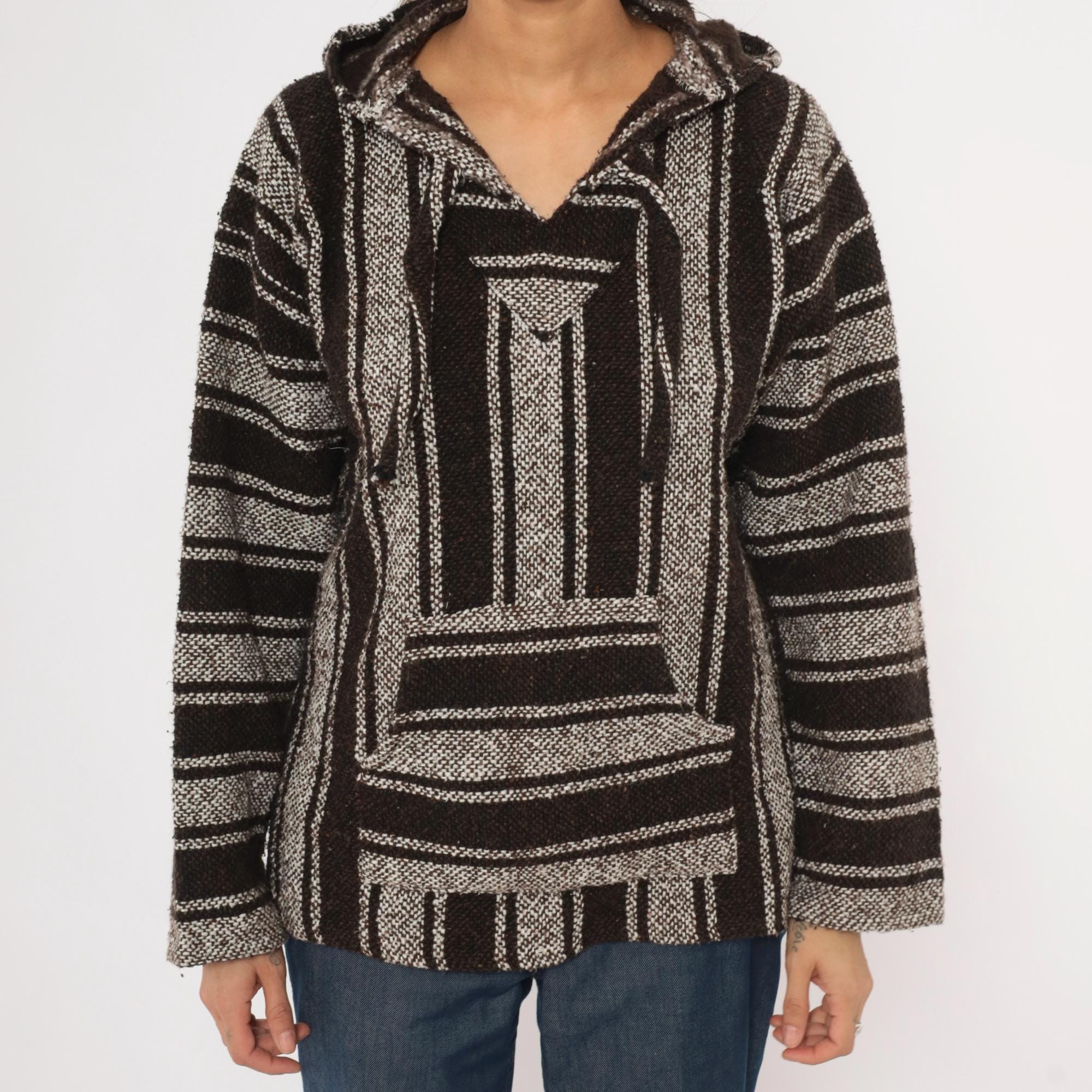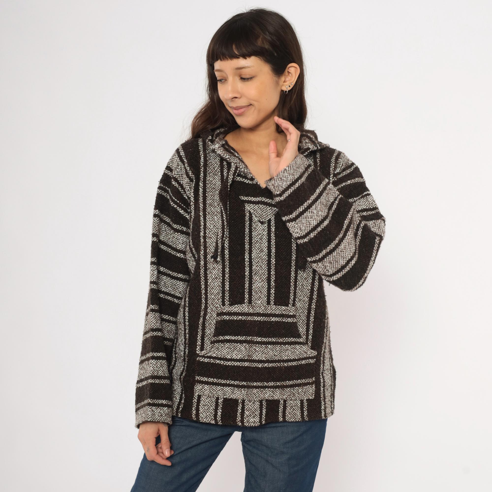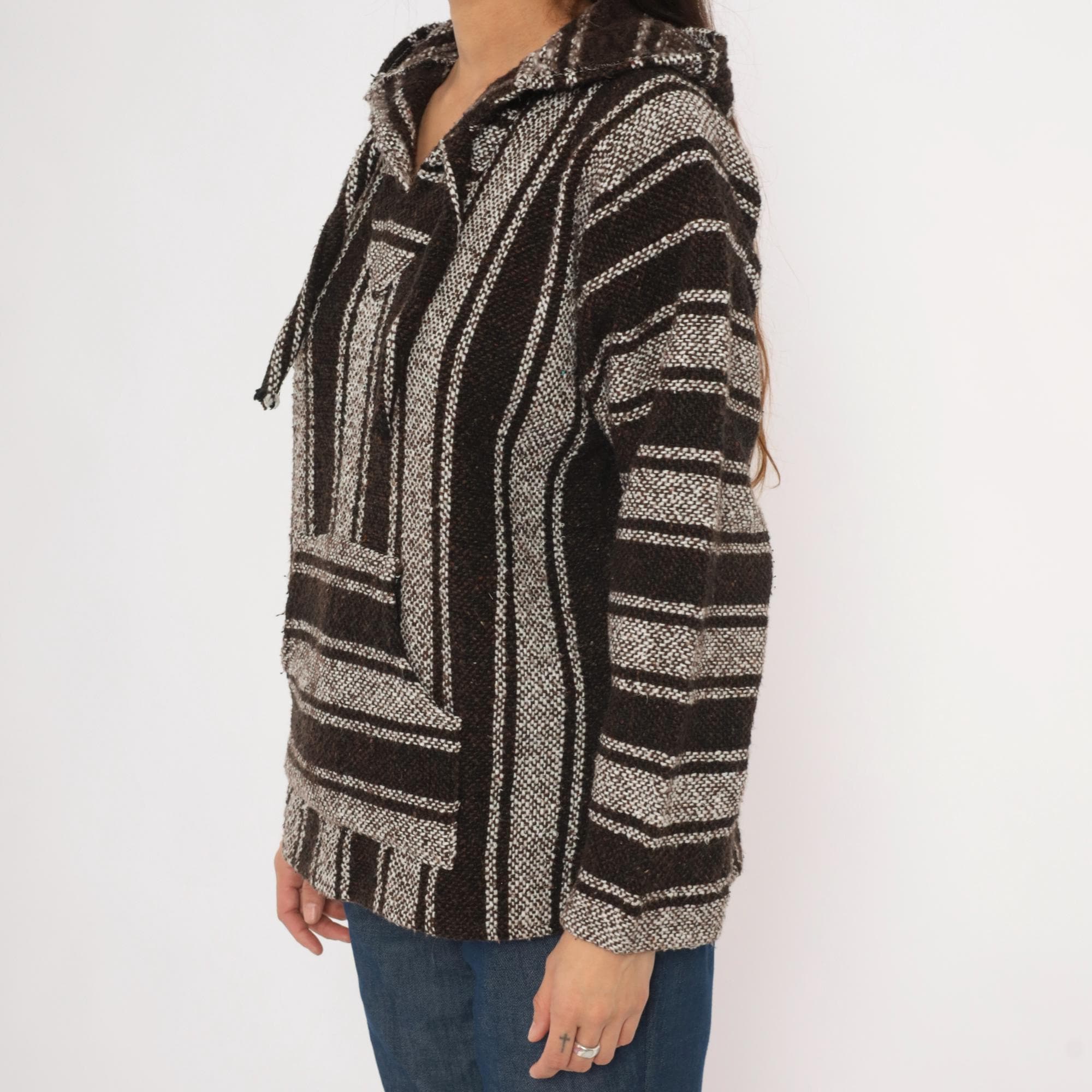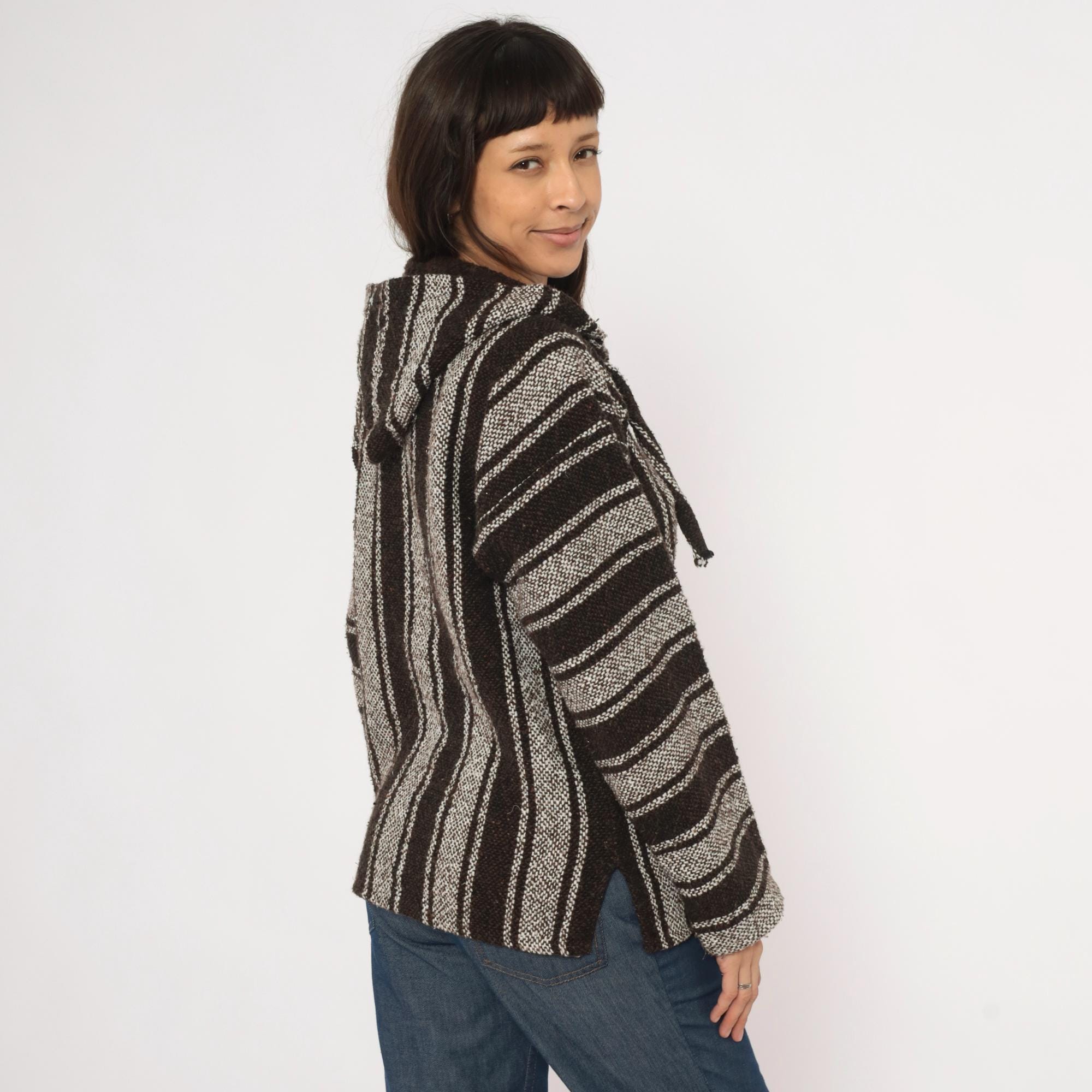 90s brown and white striped Baja hoodie from Sandy with a woven blanket-style texture and kangaroo front pocket. V-neckline, attached hood, and pullover construction with horizontal stripes on the sleeves and vertical stripes on the body and back. Chocolate and cream tones throughout in an alternating stripe pattern.