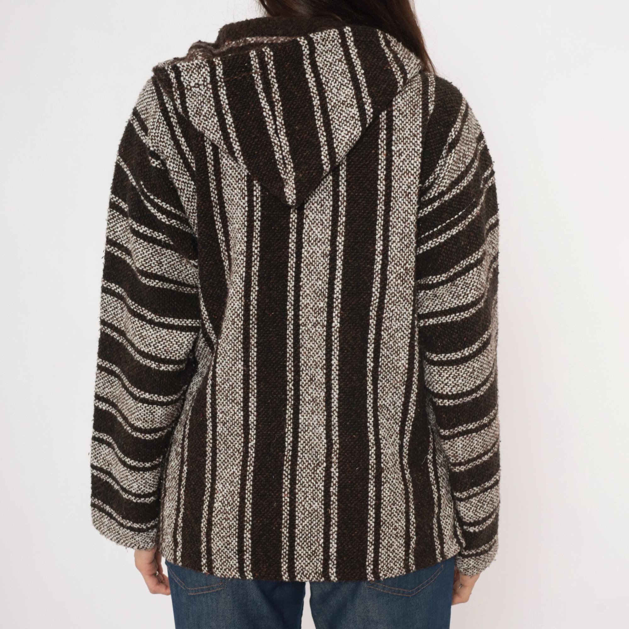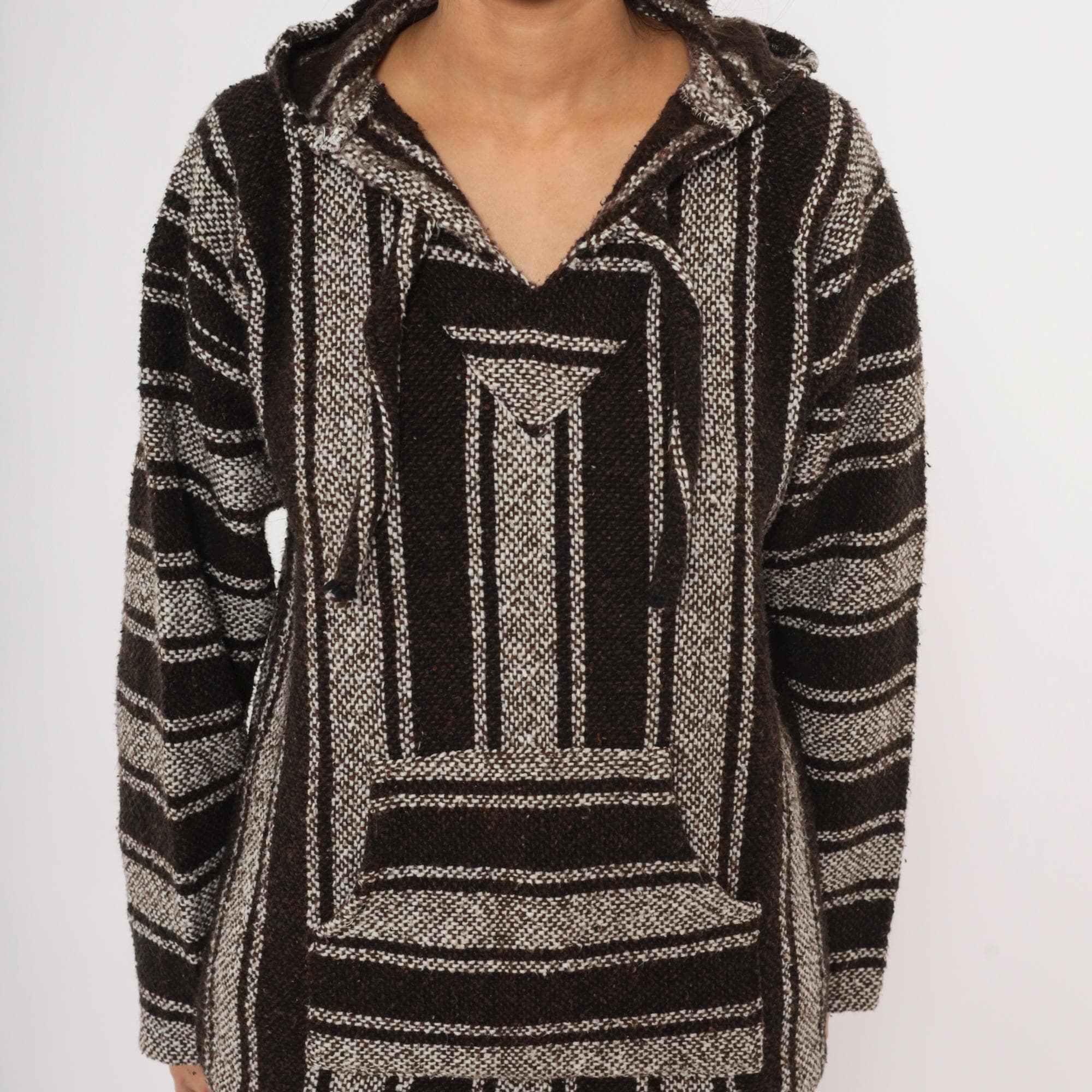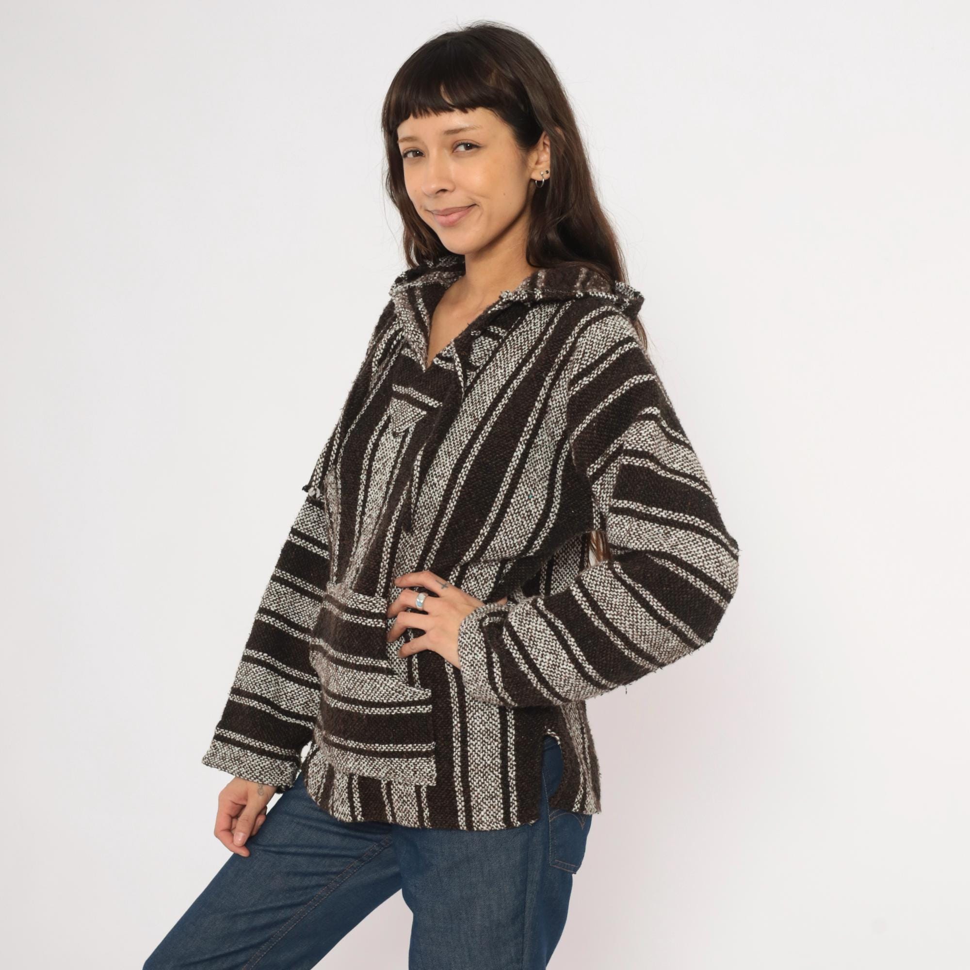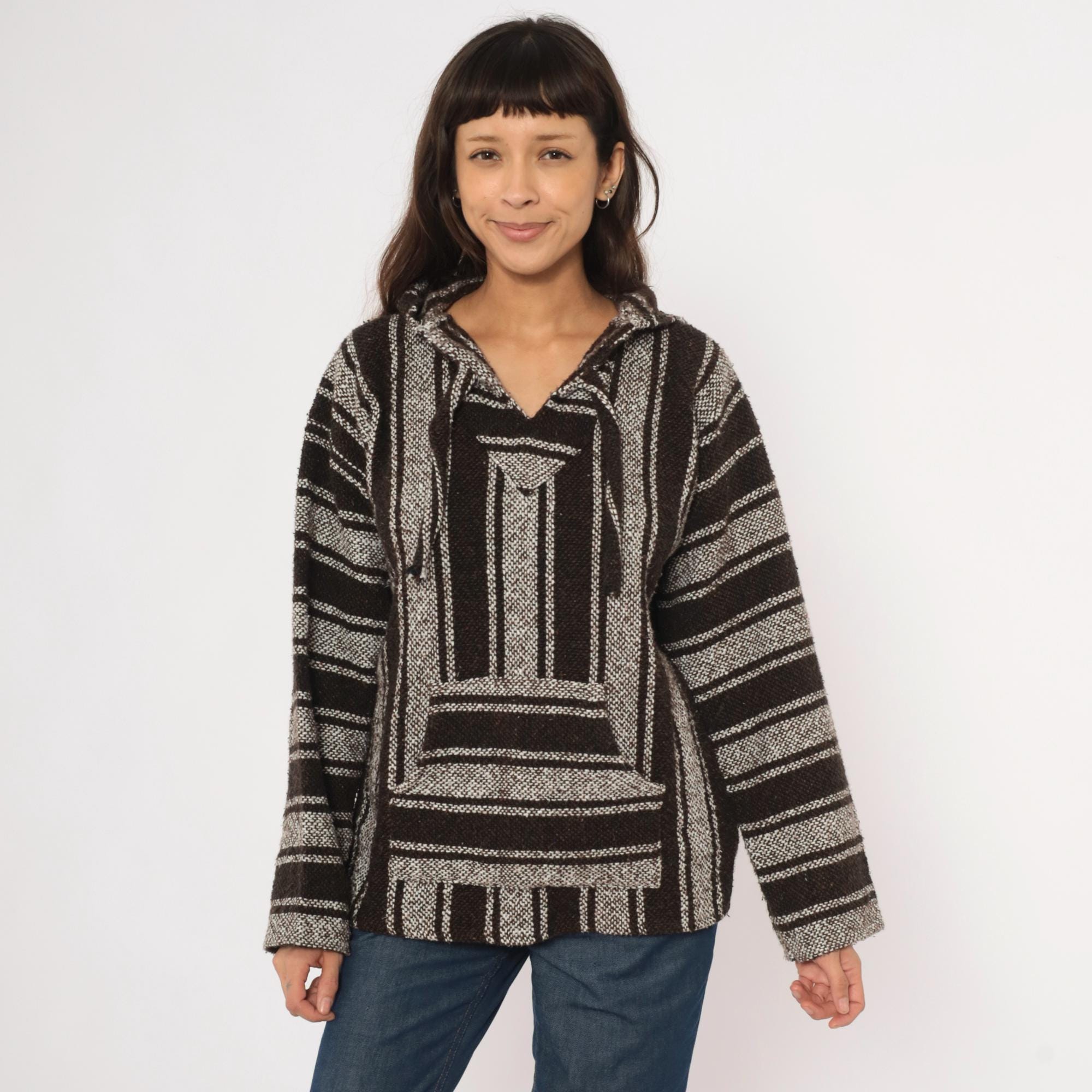 90s brown and white striped Baja hoodie from Sandy with a woven blanket-style texture and kangaroo front pocket. V-neckline, attached hood, and pullover construction with horizontal stripes on the sleeves and vertical stripes on the body and back. Chocolate and cream tones throughout in an alternating stripe pattern.
