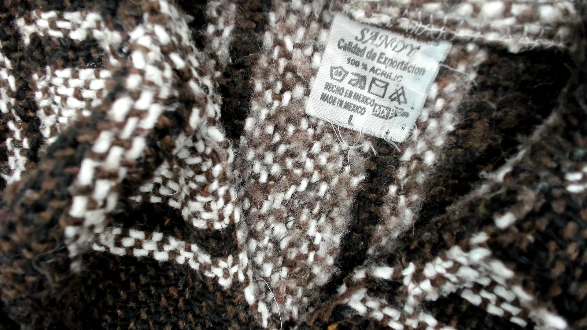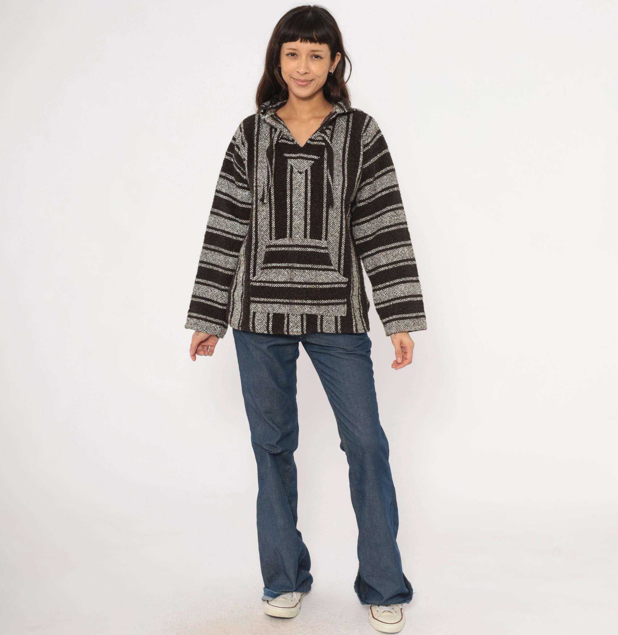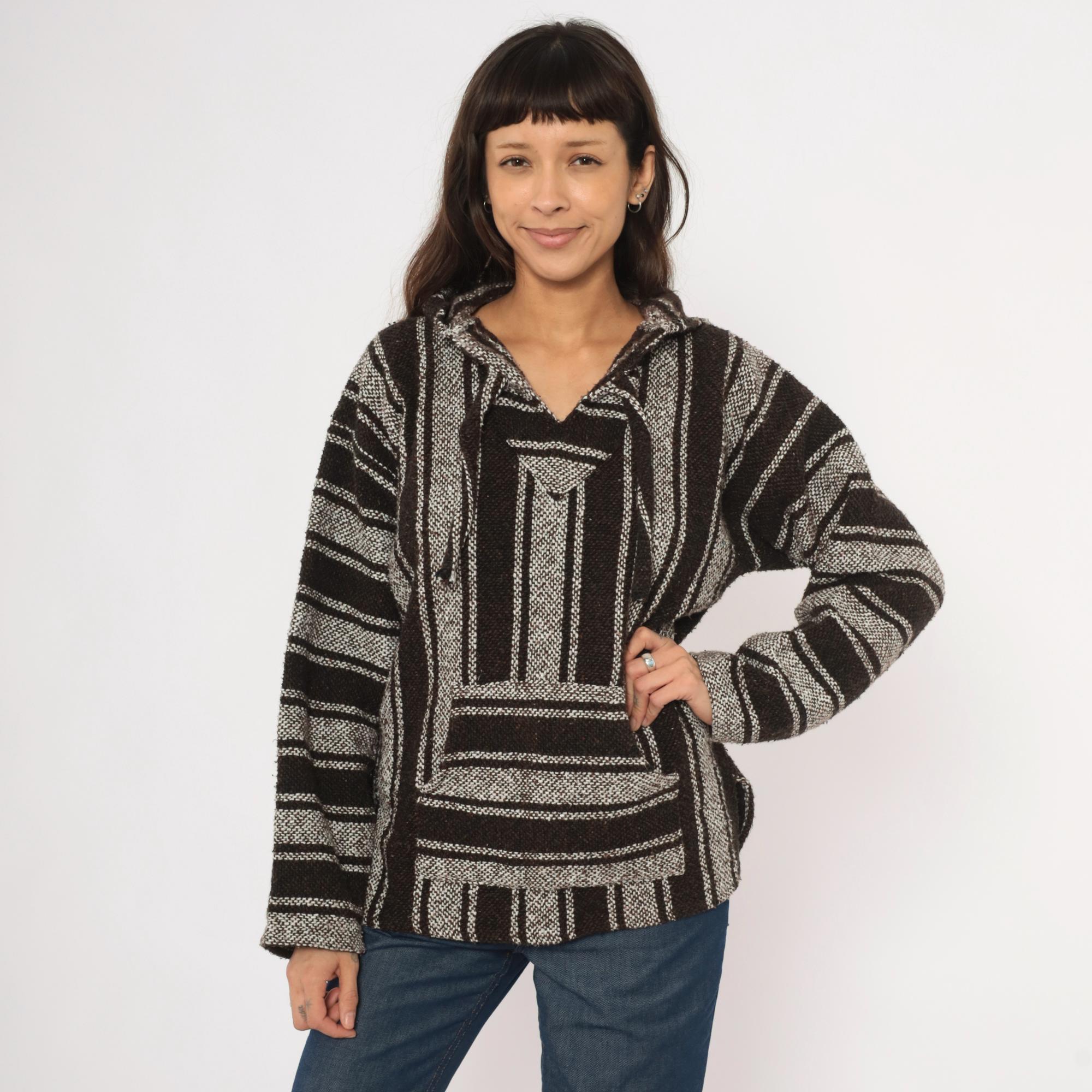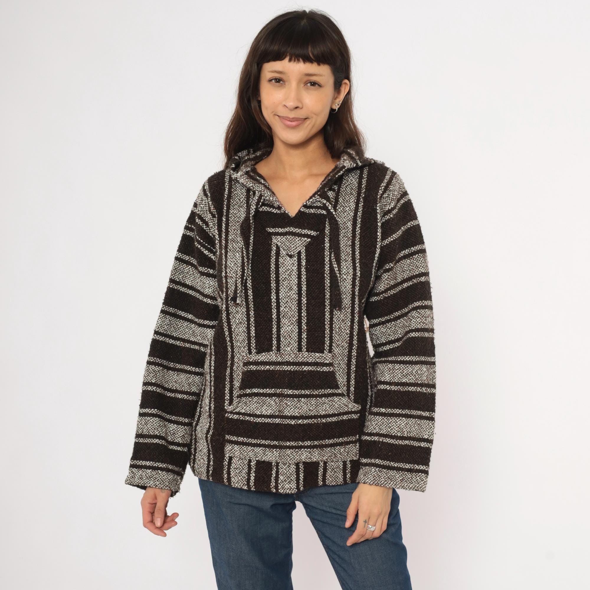 90s brown and white striped Baja hoodie from Sandy with a woven blanket-style texture and kangaroo front pocket. V-neckline, attached hood, and pullover construction with horizontal stripes on the sleeves and vertical stripes on the body and back. Chocolate and cream tones throughout in an alternating stripe pattern.