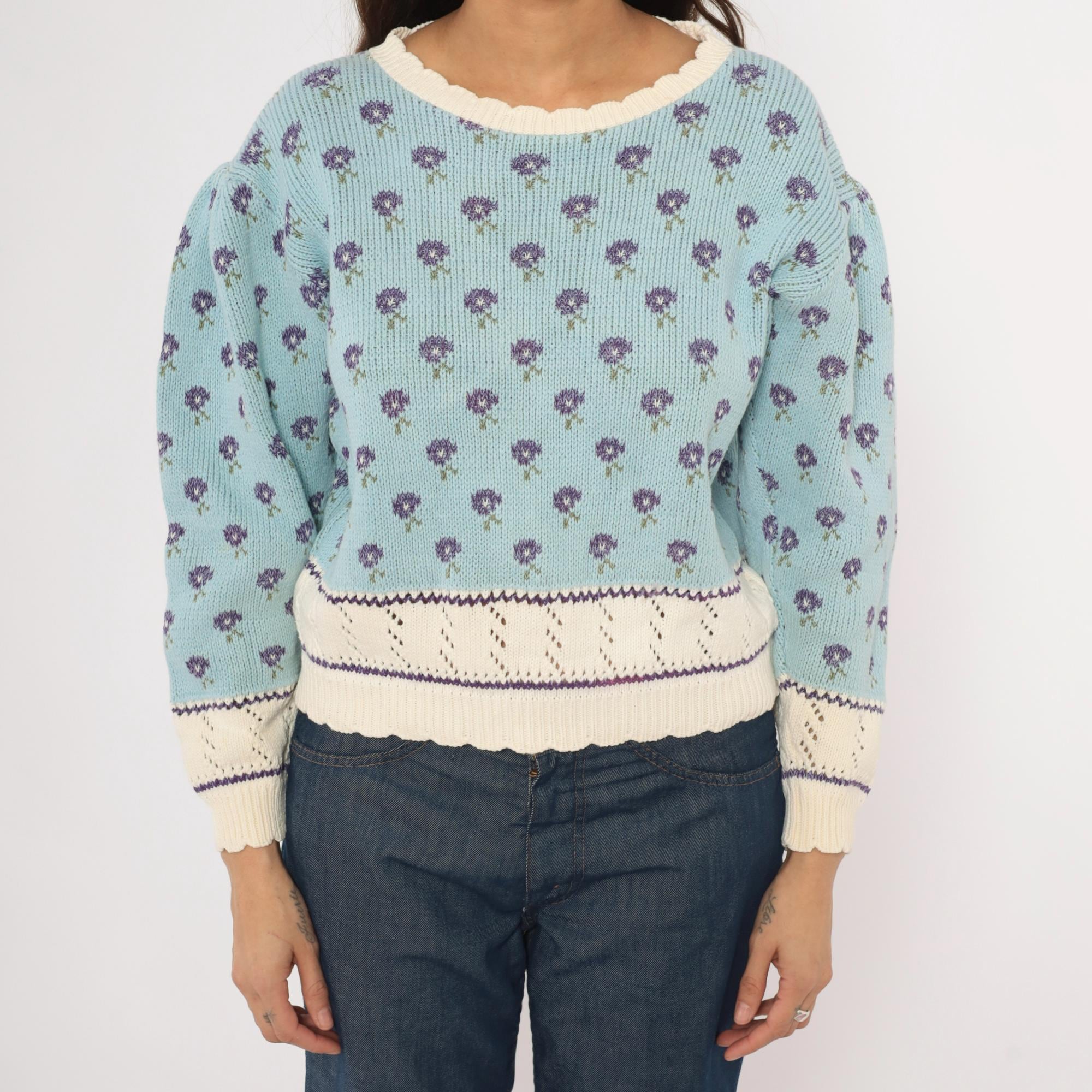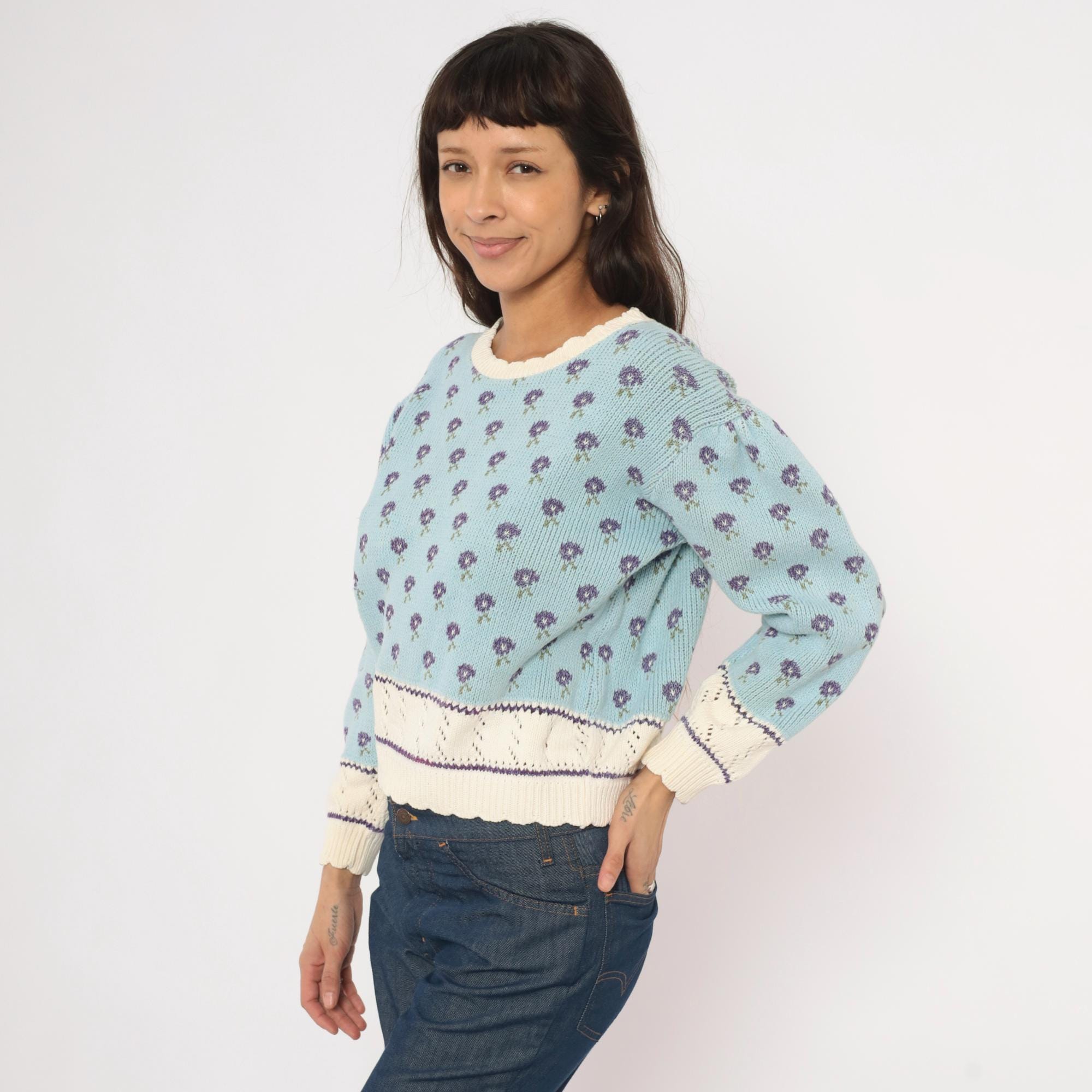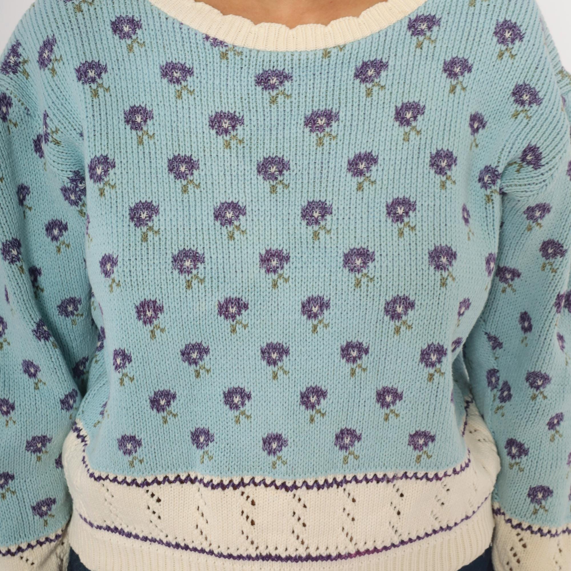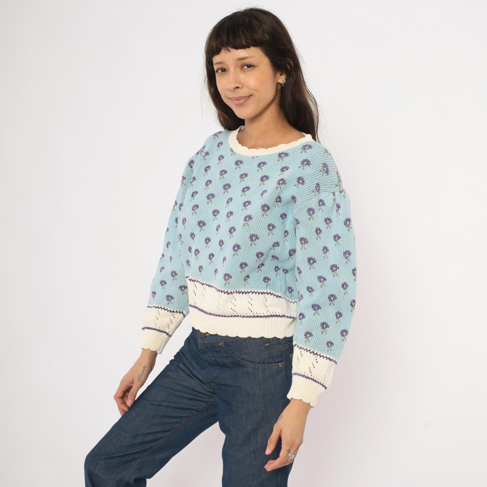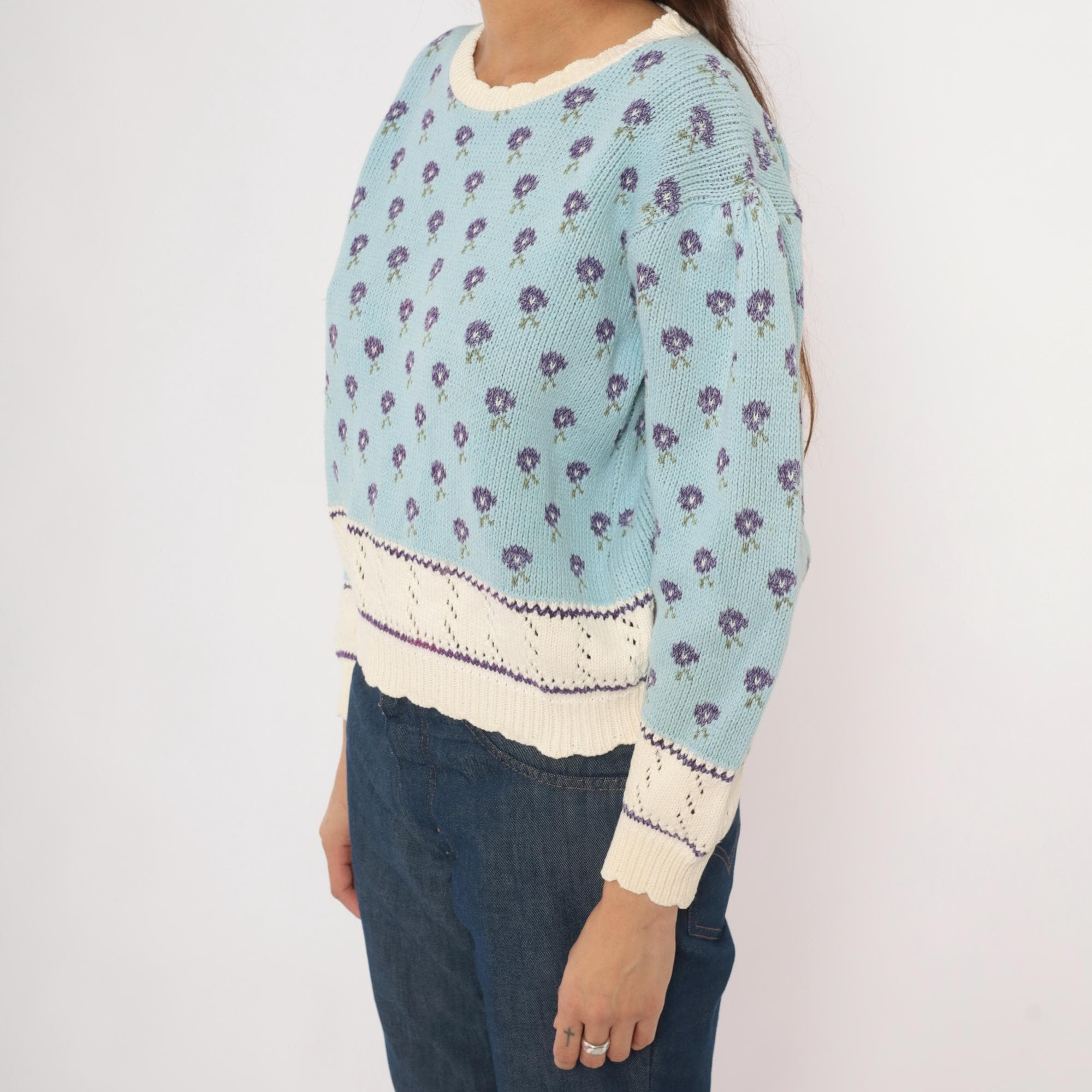 80s light blue knit pullover sweater with an allover purple floral motif in a repeating pattern across the body and sleeves. Cream scoop neckline with scalloped edging, slightly puffed shoulders, and a wide cream band at the hem with pointelle openwork detail and zigzag purple accents.