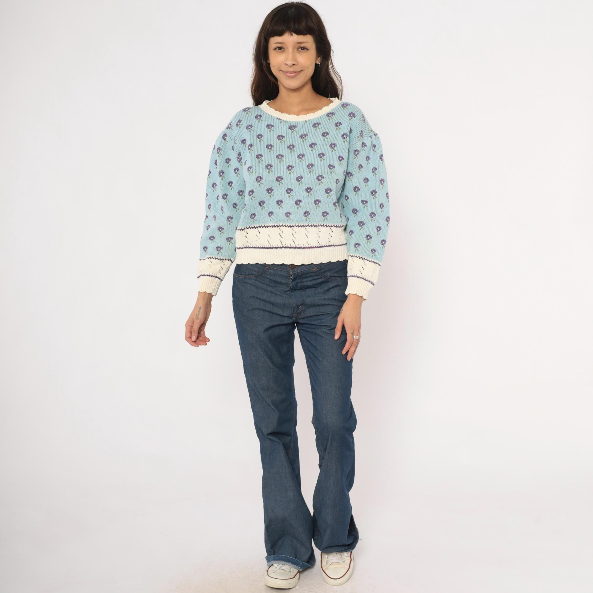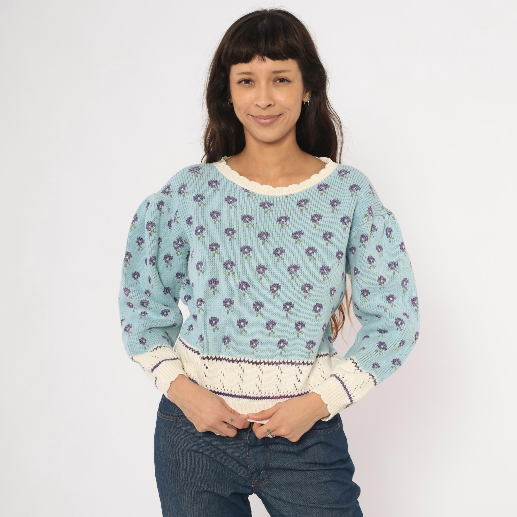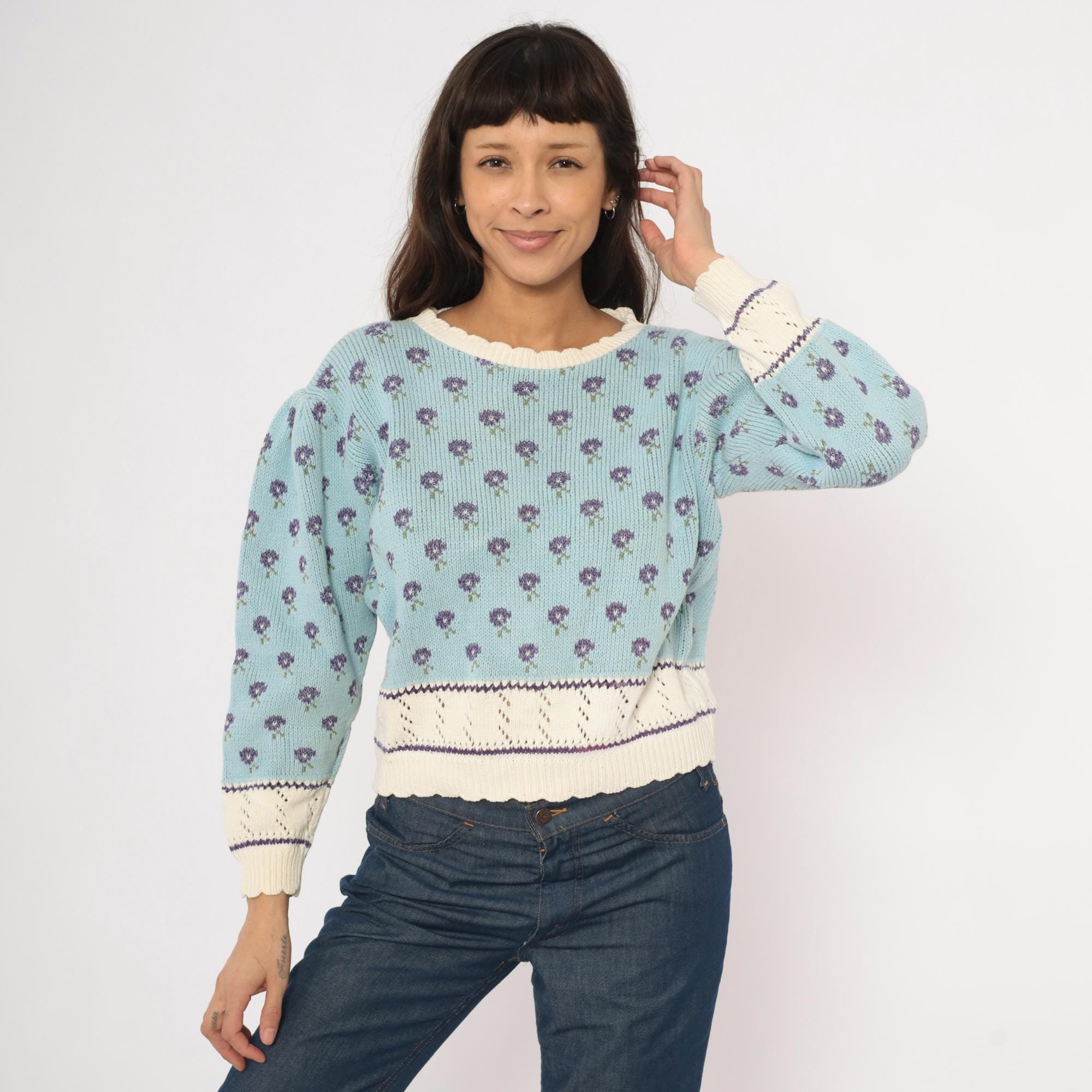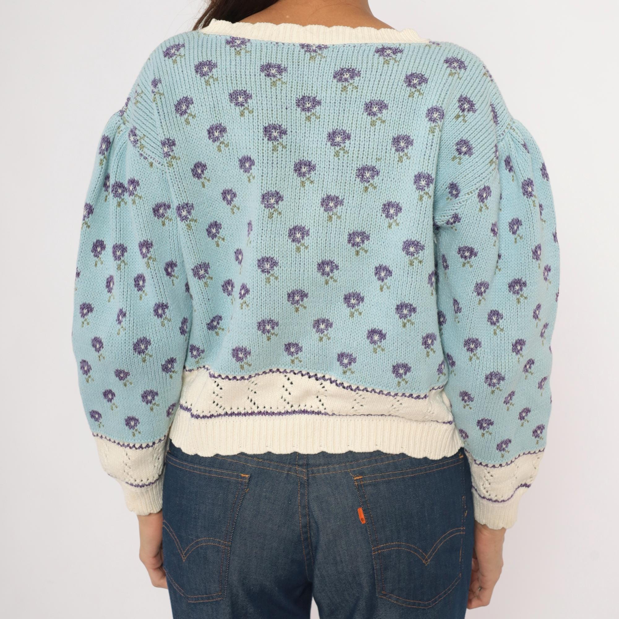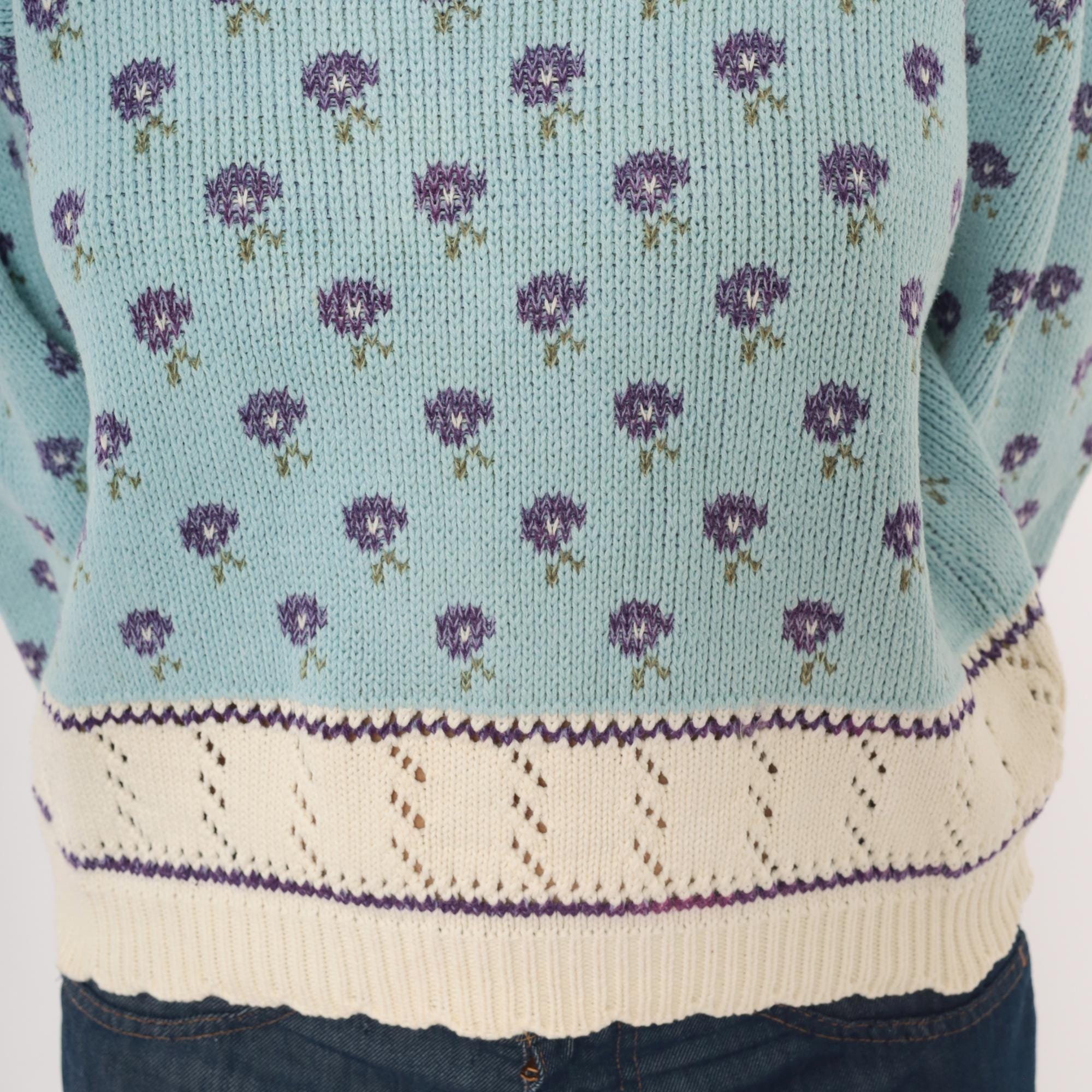 80s light blue knit pullover sweater with an allover purple floral motif in a repeating pattern across the body and sleeves. Cream scoop neckline with scalloped edging, slightly puffed shoulders, and a wide cream band at the hem with pointelle openwork detail and zigzag purple accents.