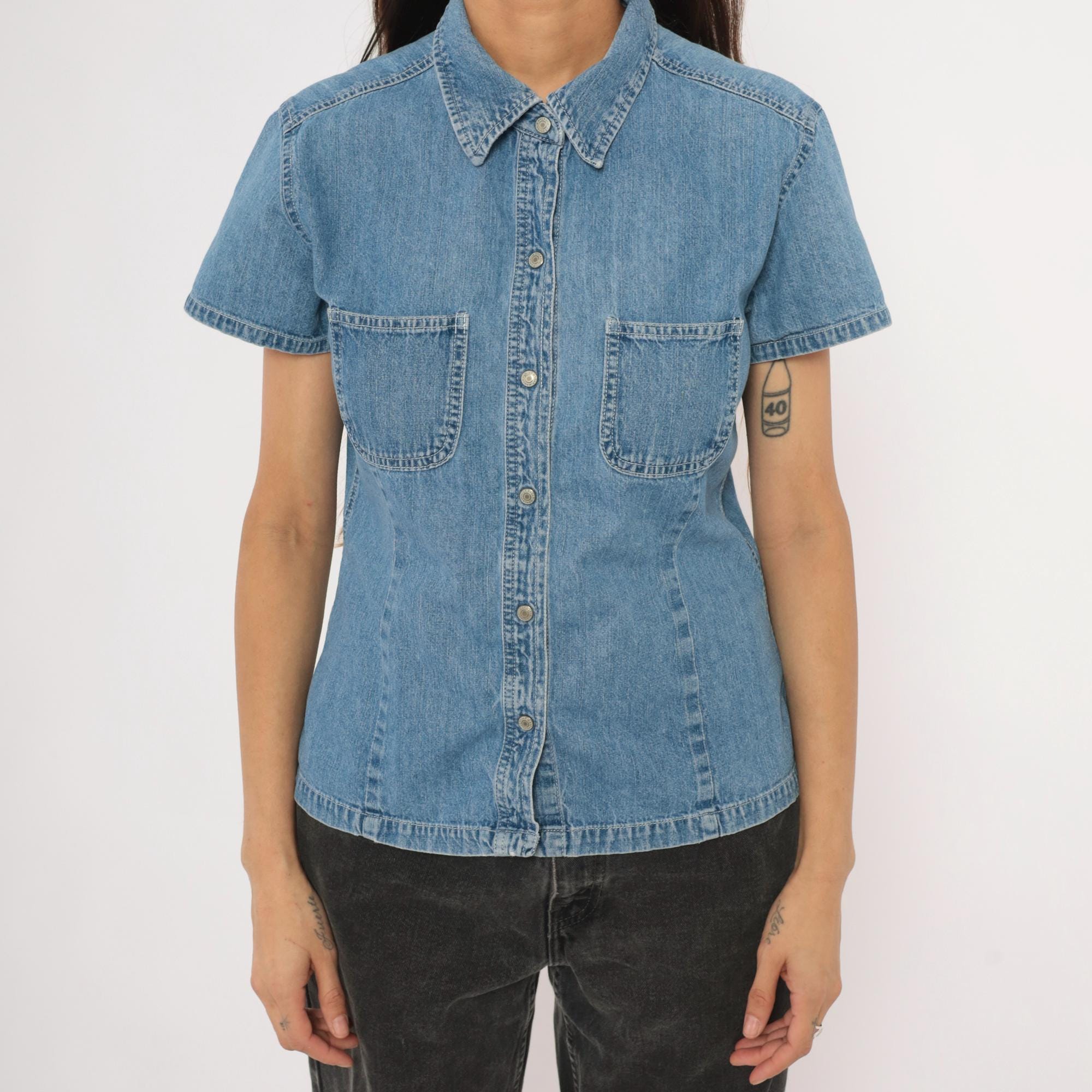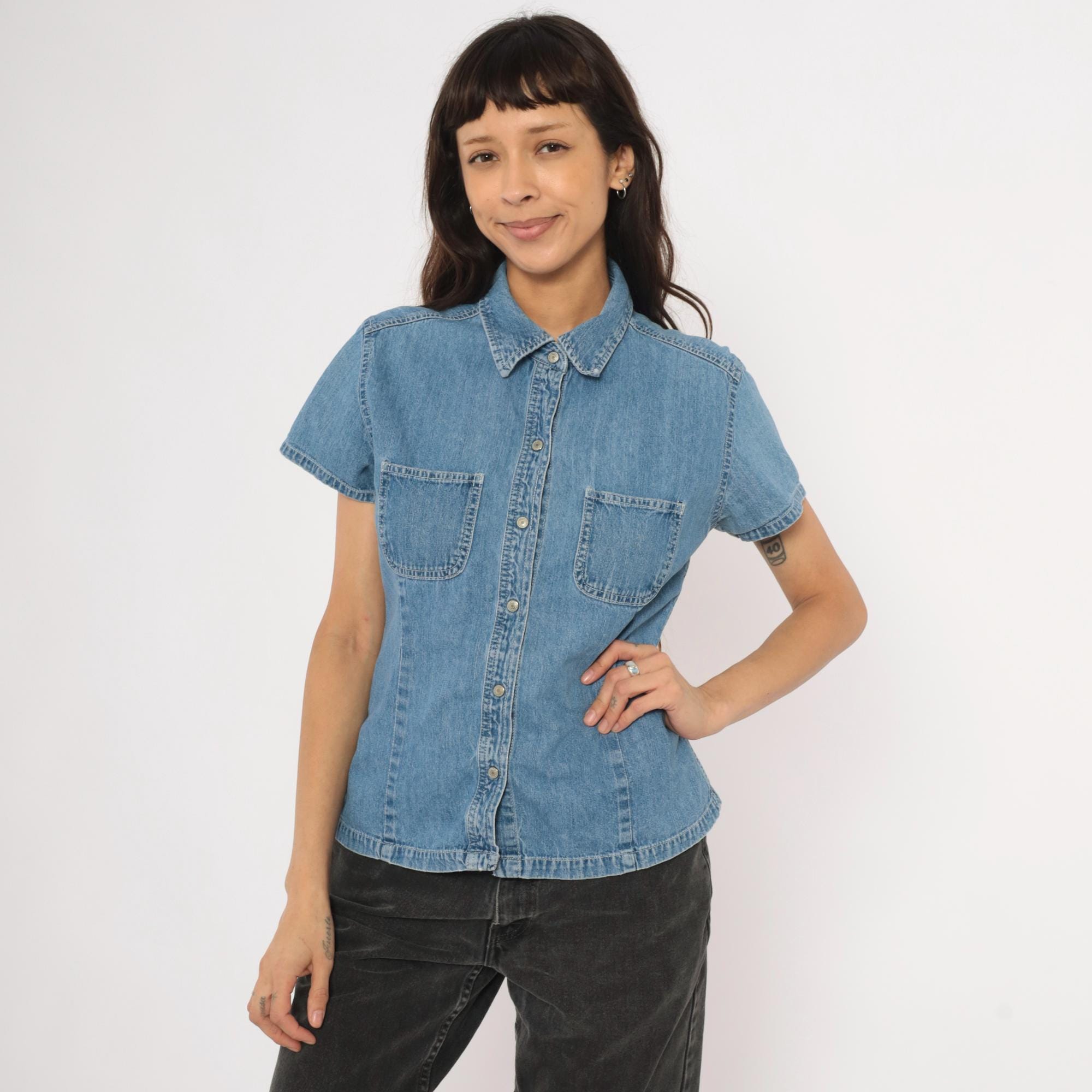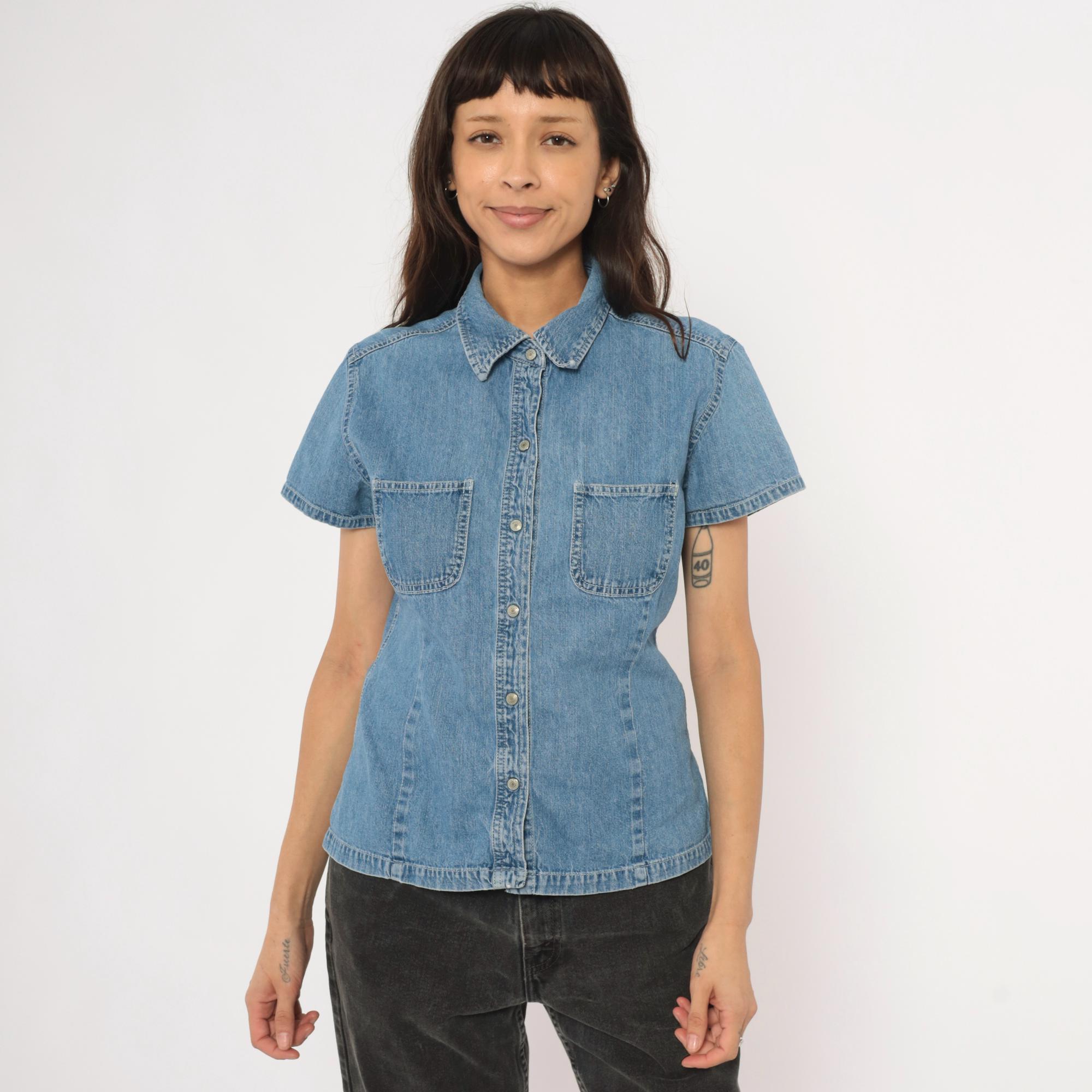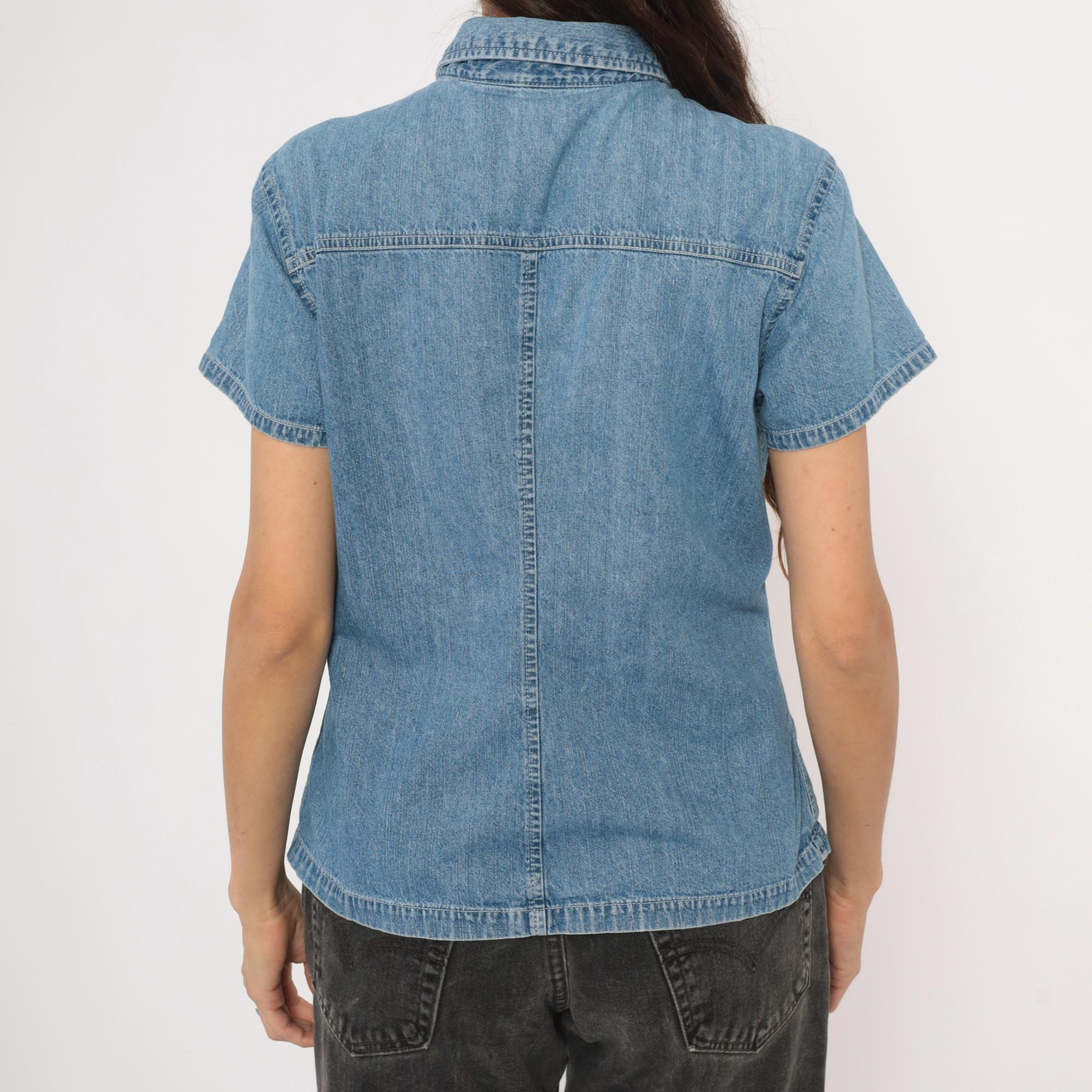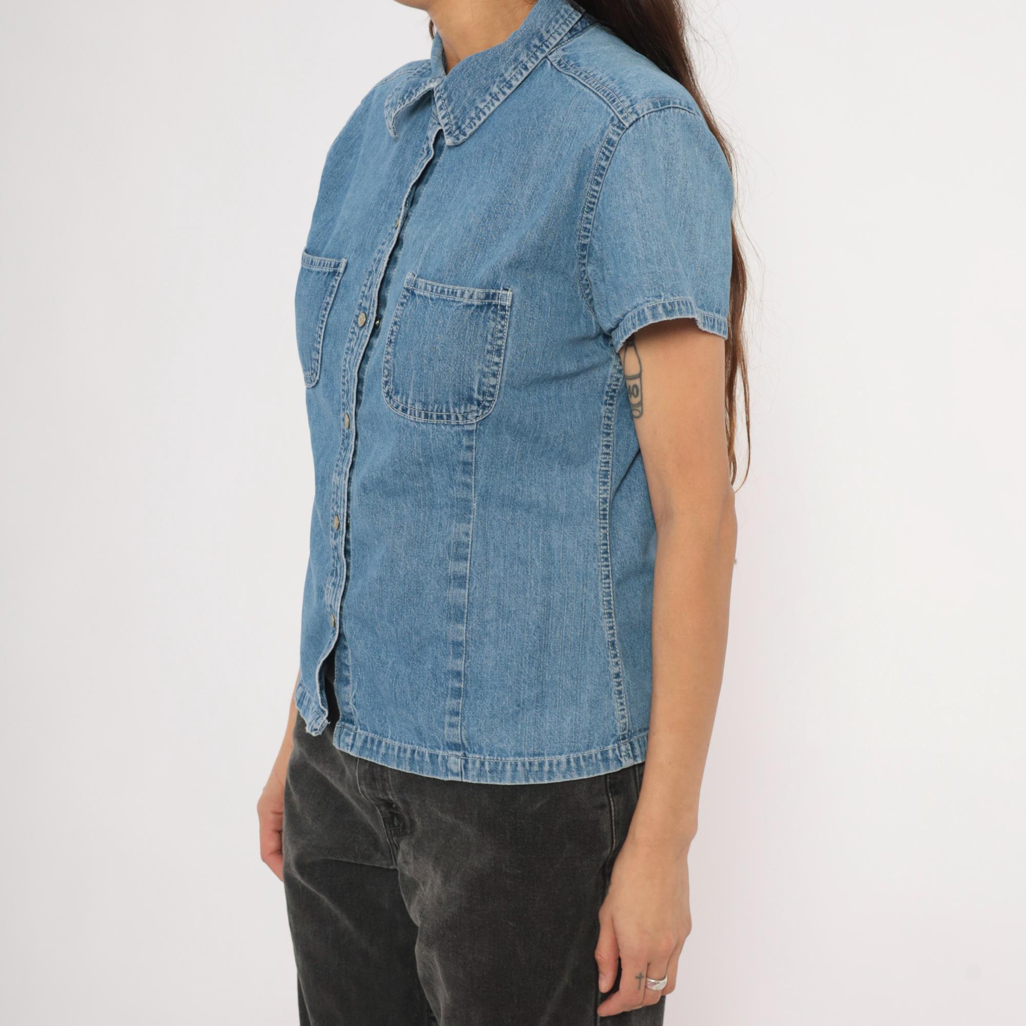 90s denim button-front shirt from Gap with a pointed collar and snap closures down the front. Two open chest pockets sit below a horizontal back yoke with visible topstitching throughout. Short sleeves with cuffed hems, fitted waist with slight shaping through the side panels, and a straight hem with small side slits.