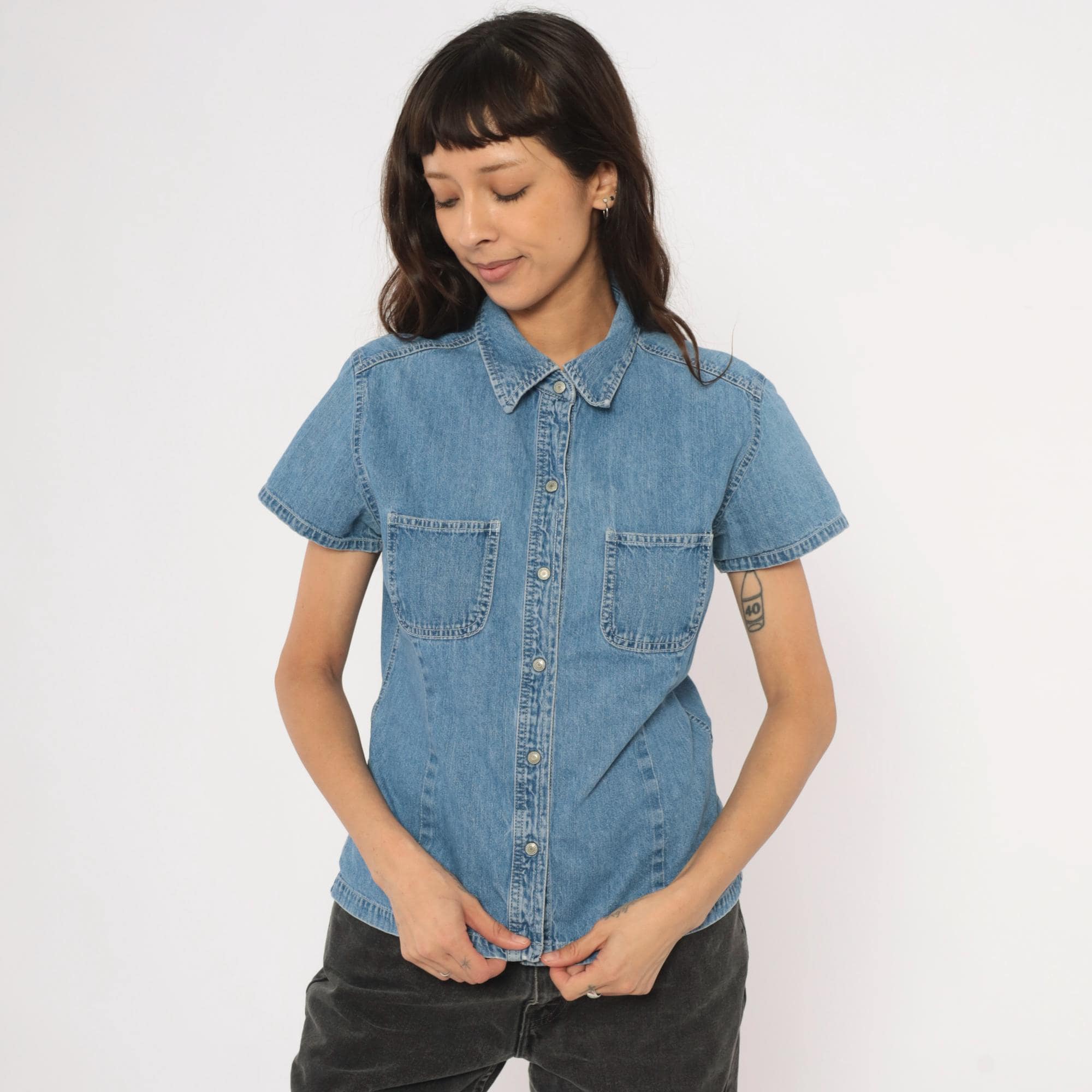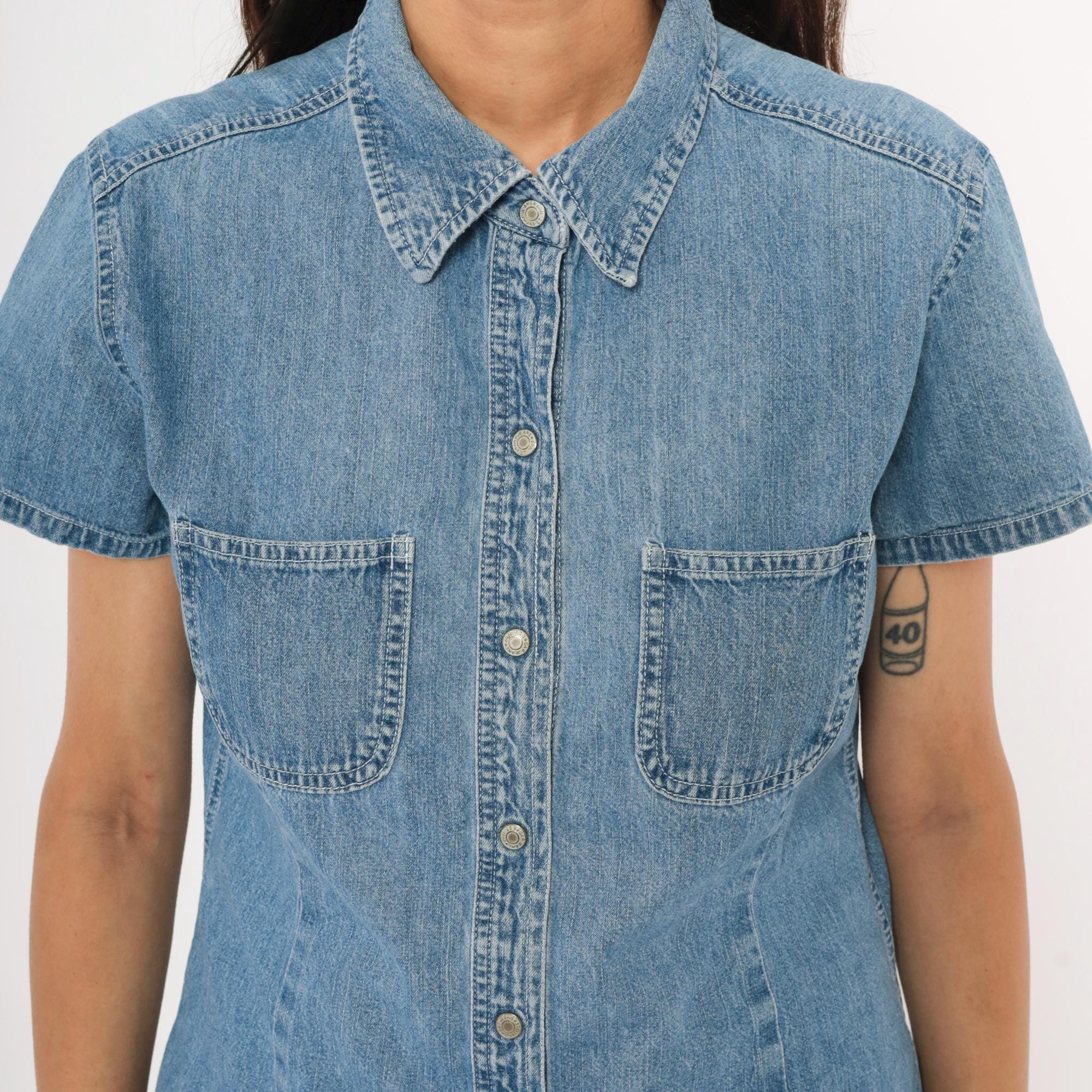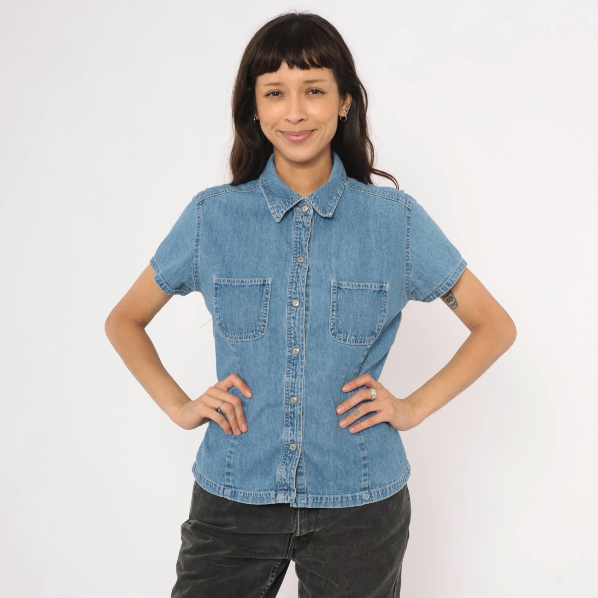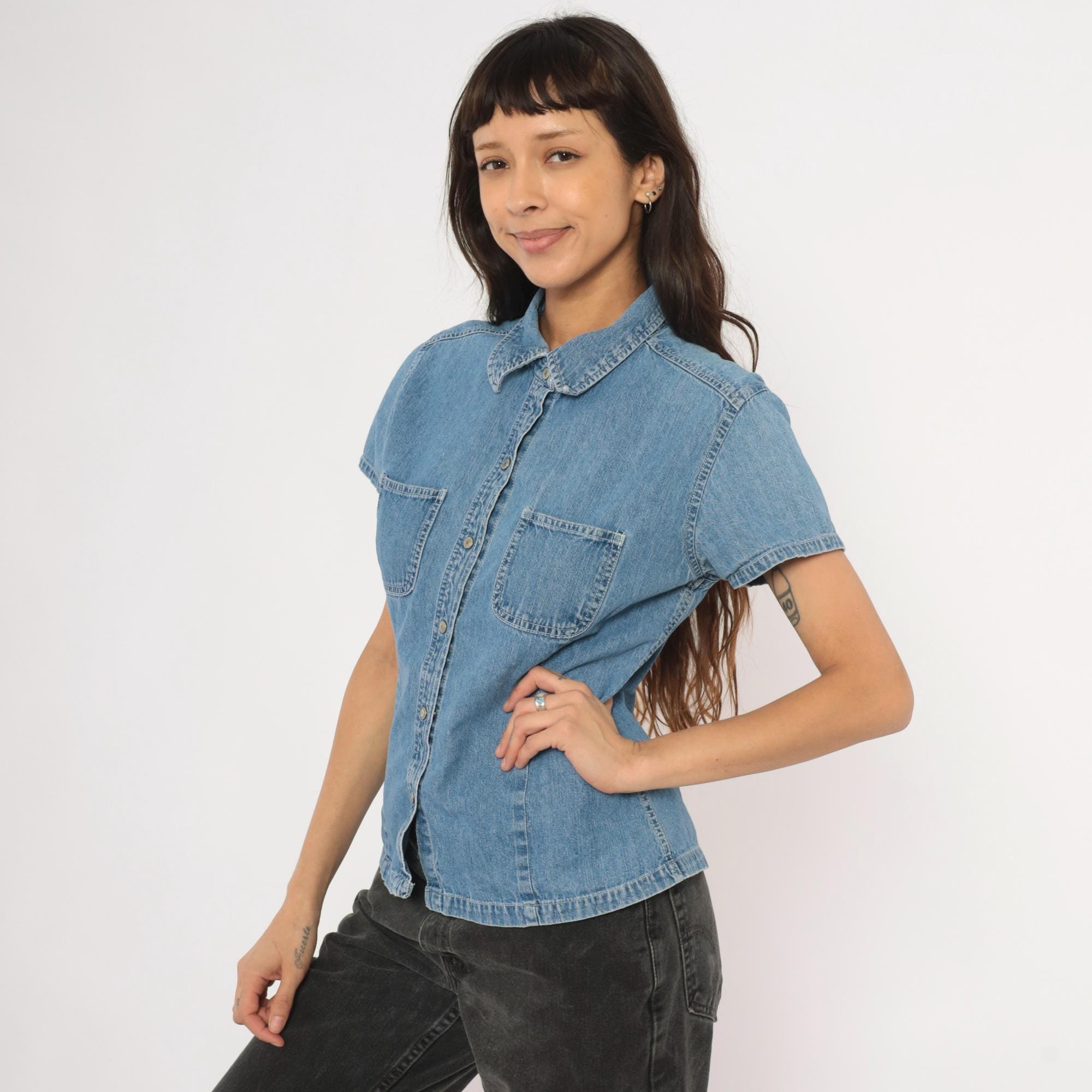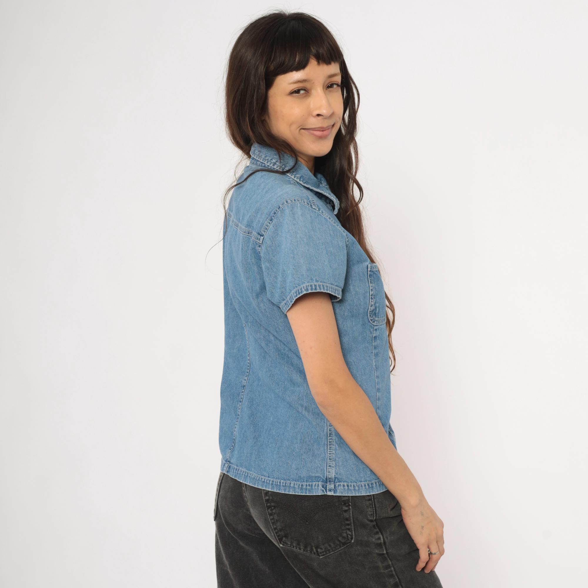 90s denim button-front shirt from Gap with a pointed collar and snap closures down the front. Two open chest pockets sit below a horizontal back yoke with visible topstitching throughout. Short sleeves with cuffed hems, fitted waist with slight shaping through the side panels, and a straight hem with small side slits.