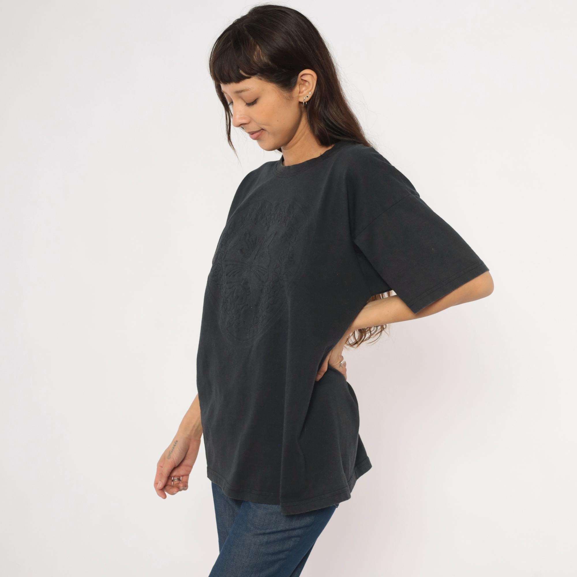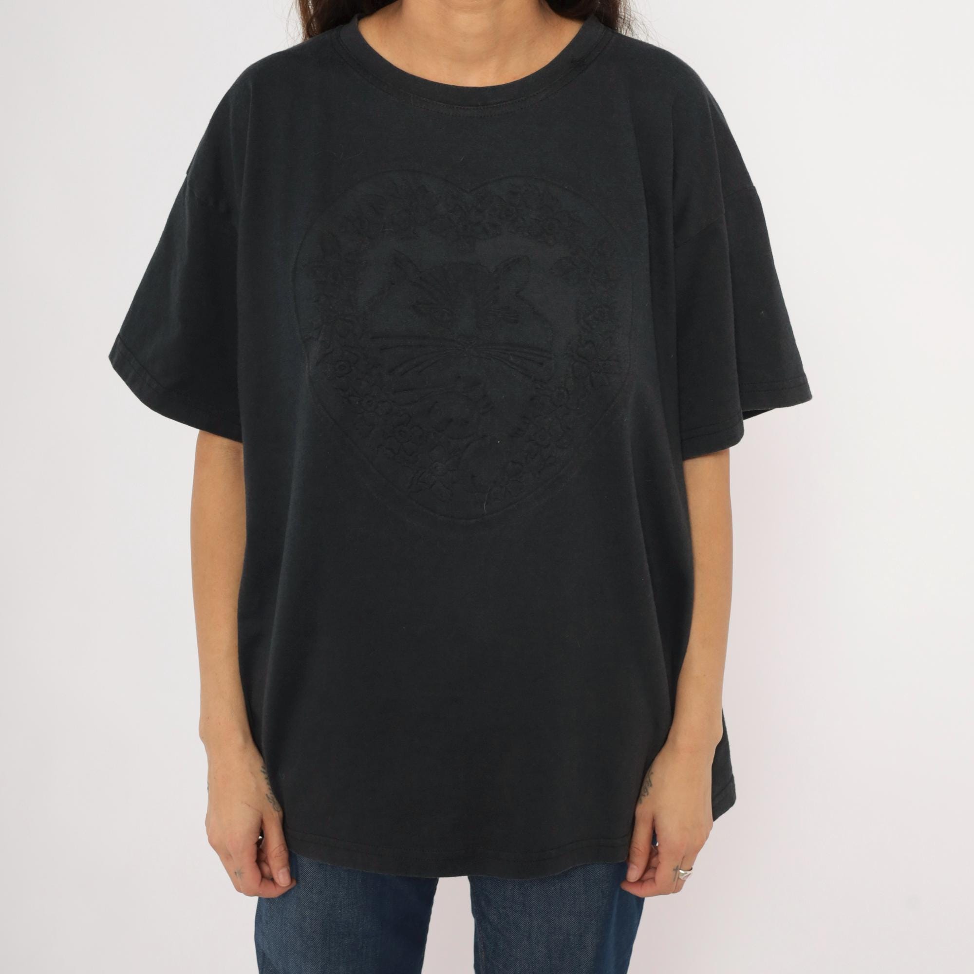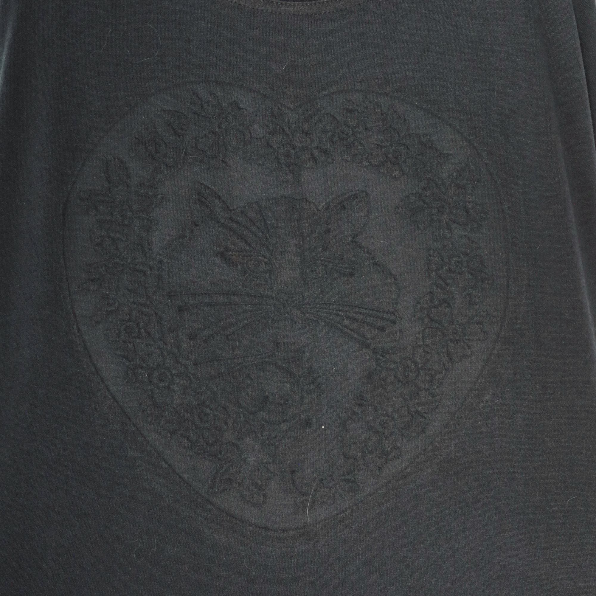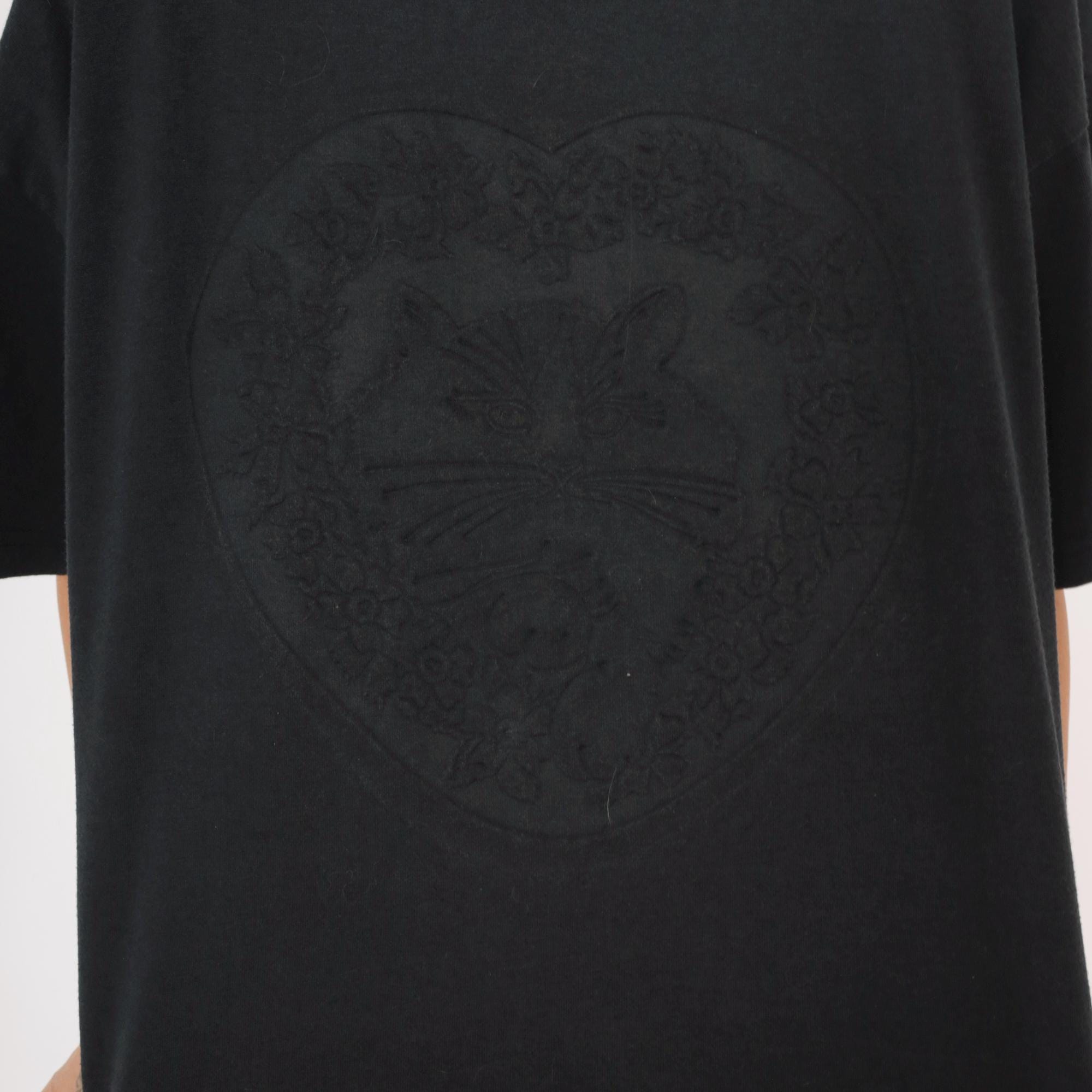 90s black crew neck tee from Kevin G Sportswear with a tonal embossed cat face graphic on the front chest, surrounded by a circular floral border design. Boxy, relaxed silhouette with dropped shoulders, short sleeves, and a straight hemline with small side slits.