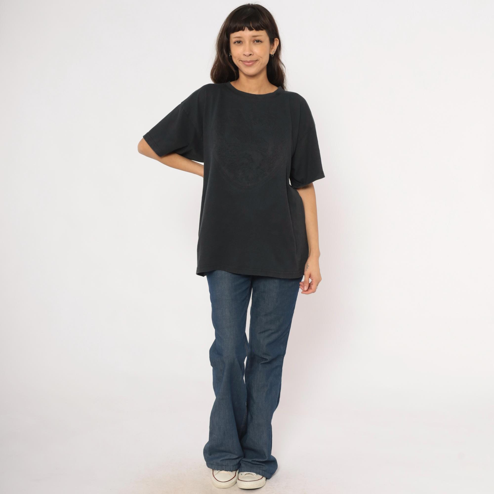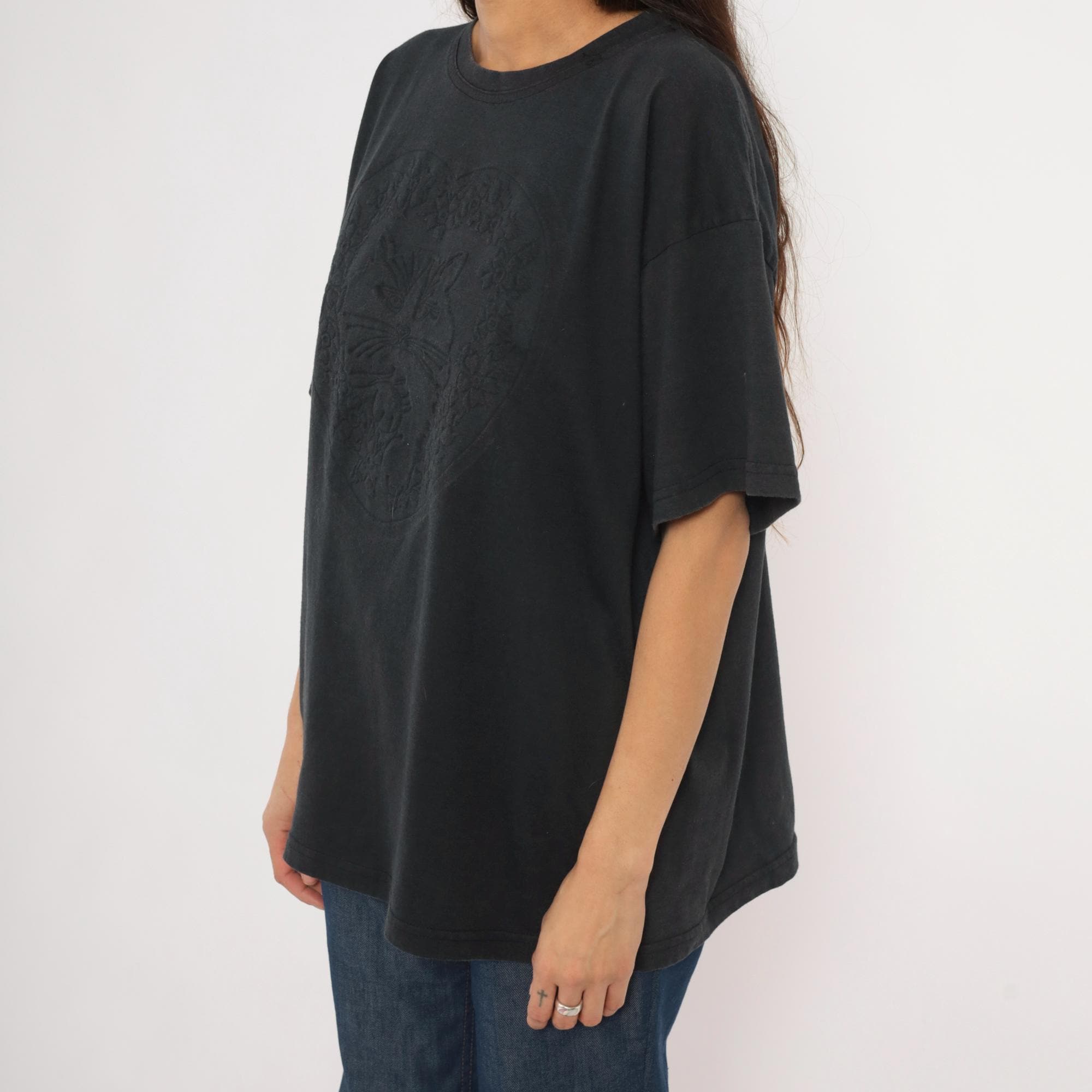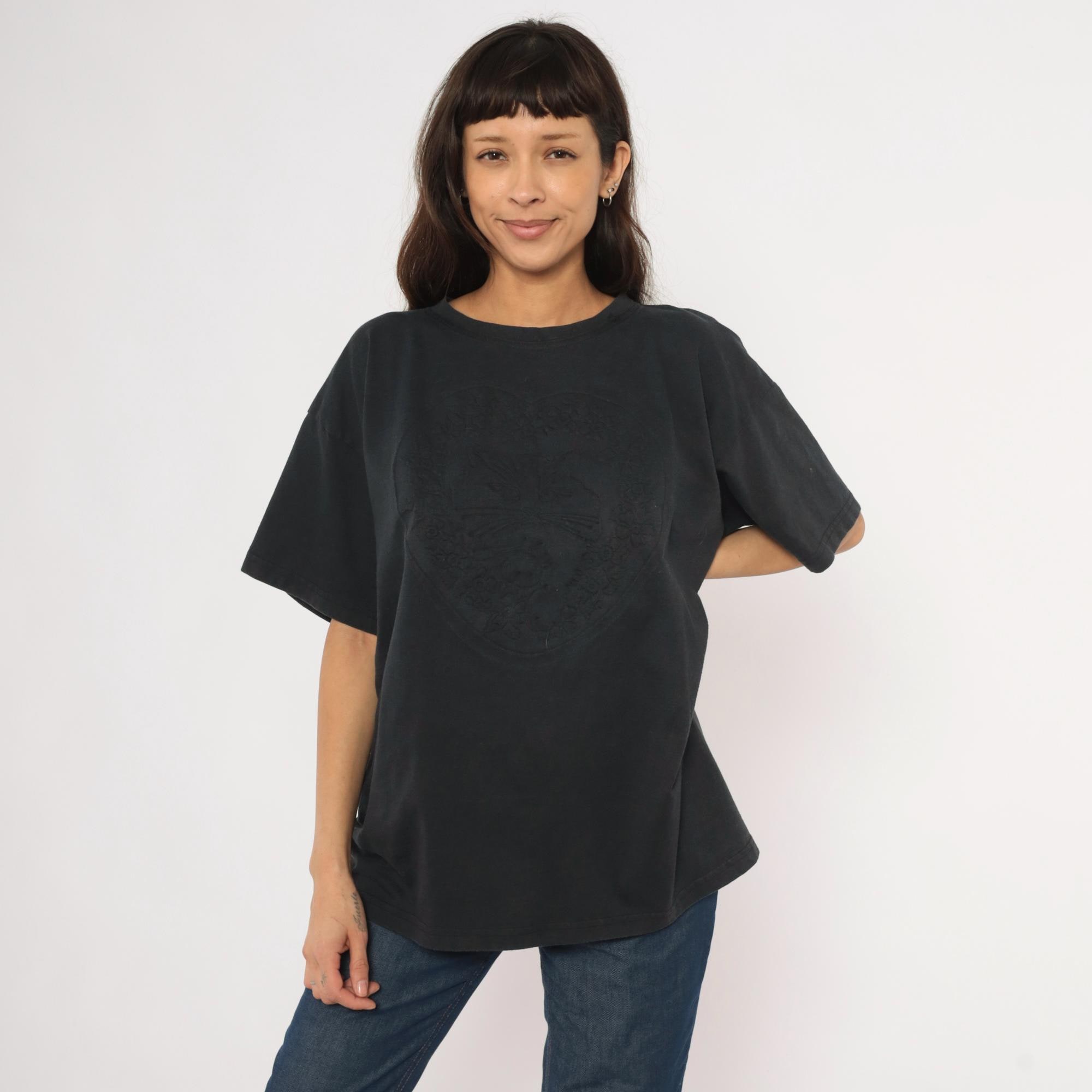 90s black crew neck tee from Kevin G Sportswear with a tonal embossed cat face graphic on the front chest, surrounded by a circular floral border design. Boxy, relaxed silhouette with dropped shoulders, short sleeves, and a straight hemline with small side slits.