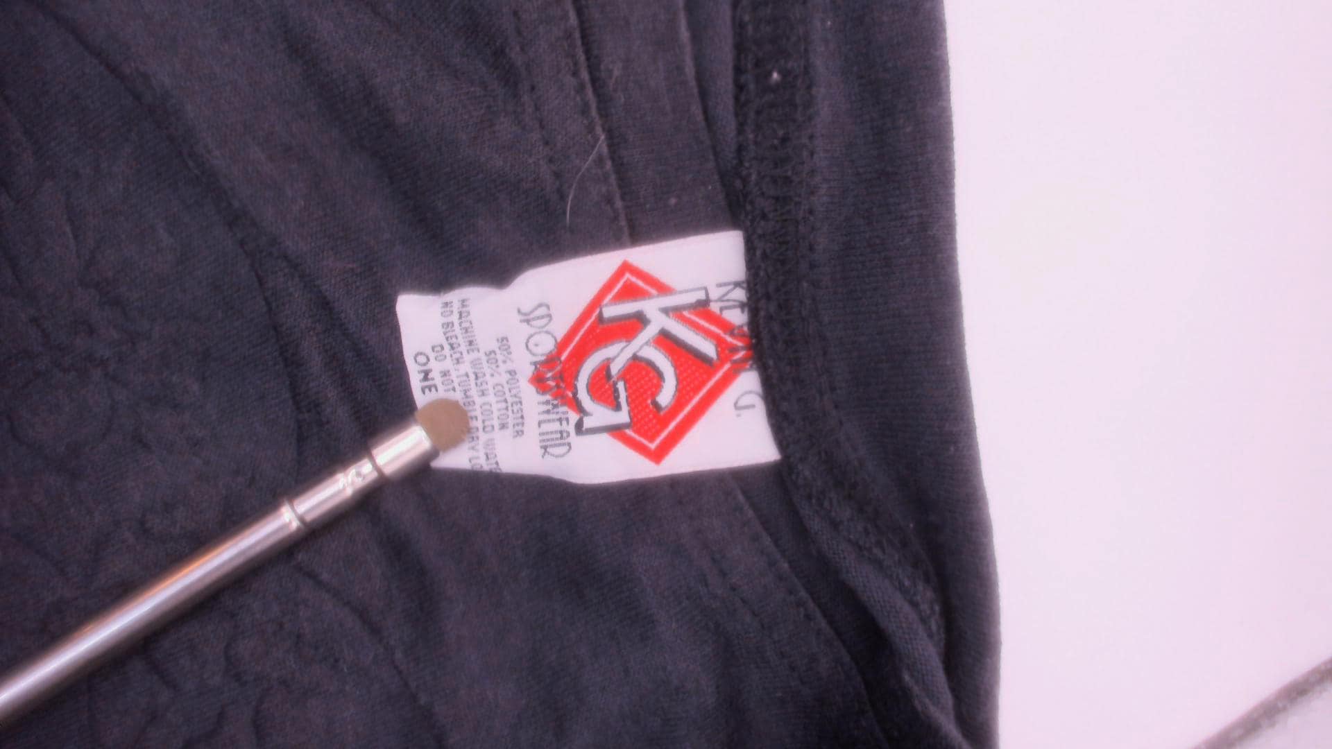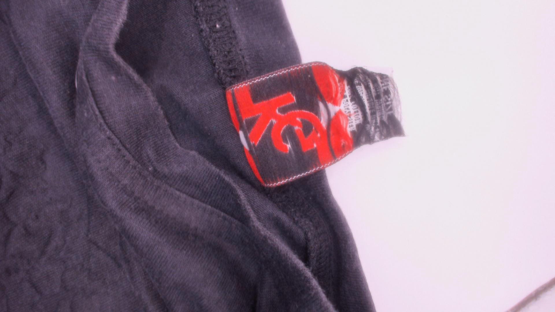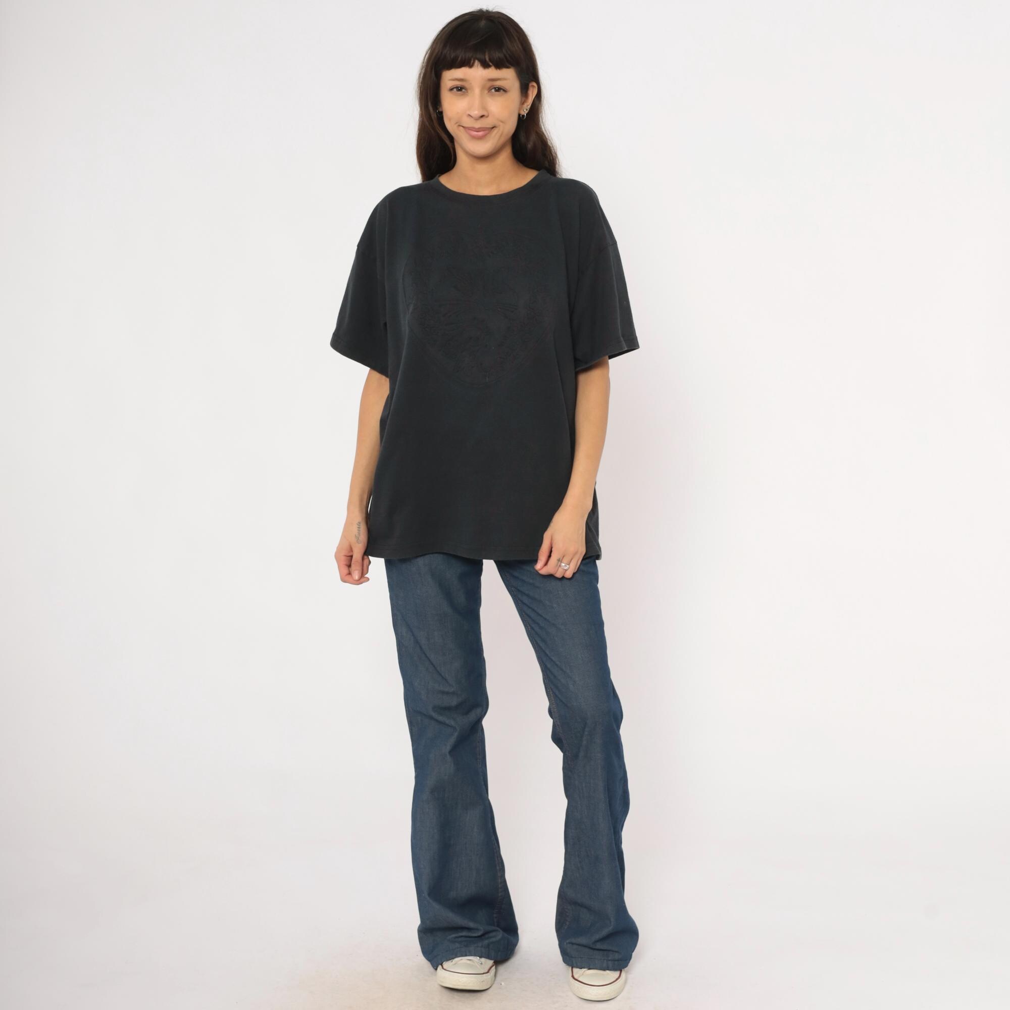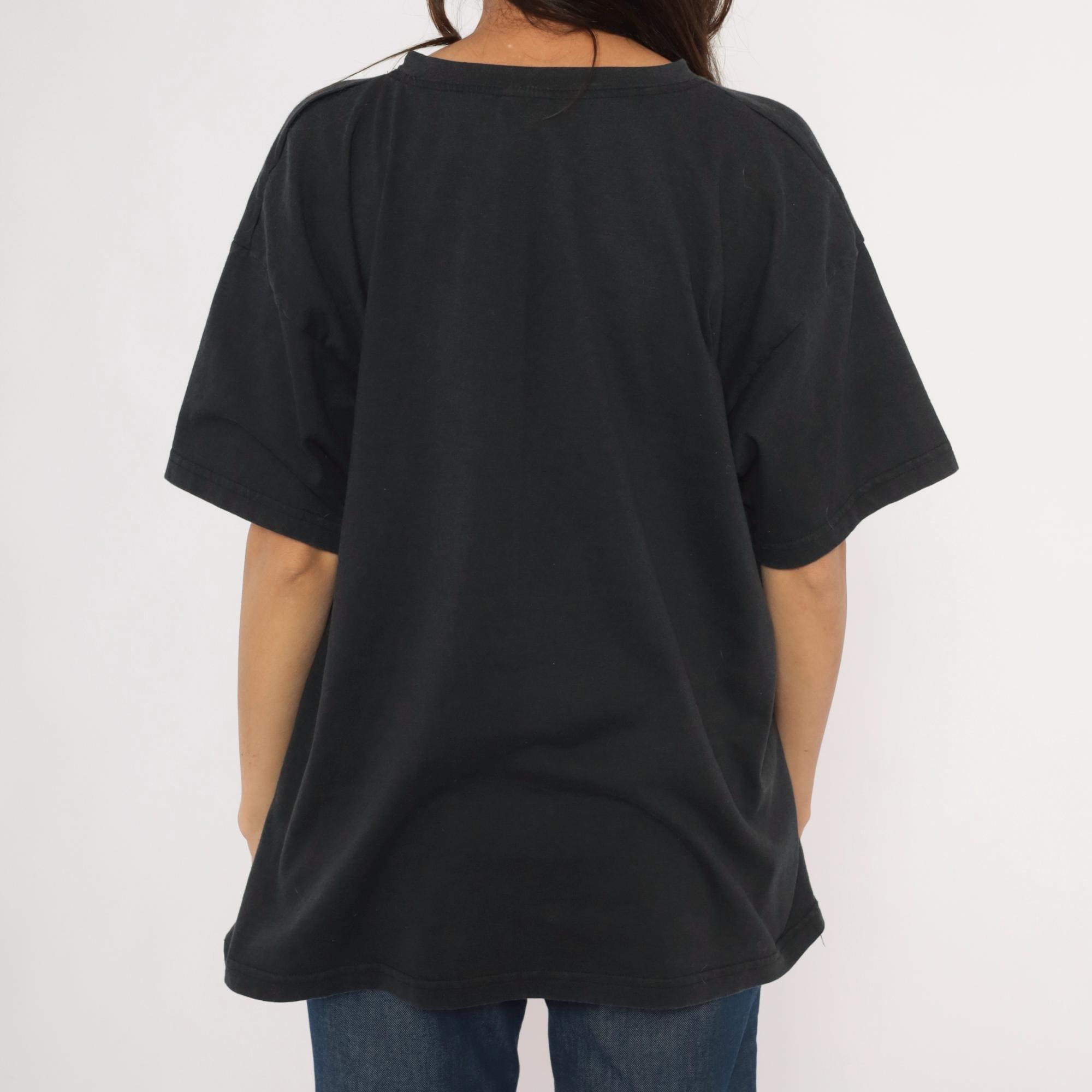 90s black crew neck tee from Kevin G Sportswear with a tonal embossed cat face graphic on the front chest, surrounded by a circular floral border design. Boxy, relaxed silhouette with dropped shoulders, short sleeves, and a straight hemline with small side slits.