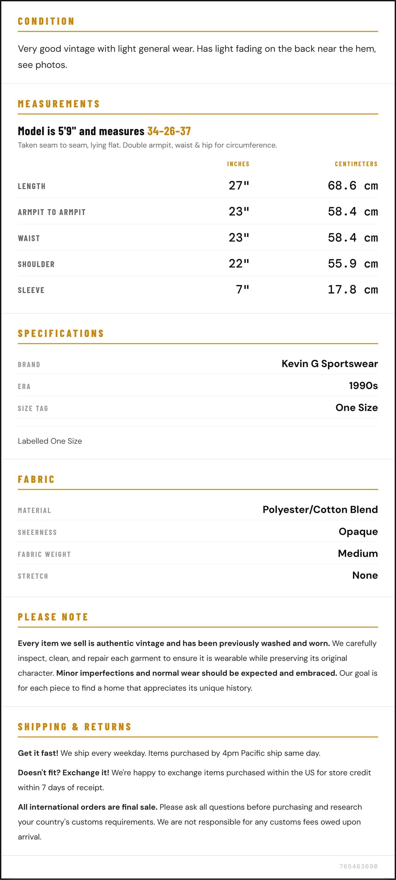 Condition: Very good vintage with light general wear. Has light fading on the back near the hem, see photos.