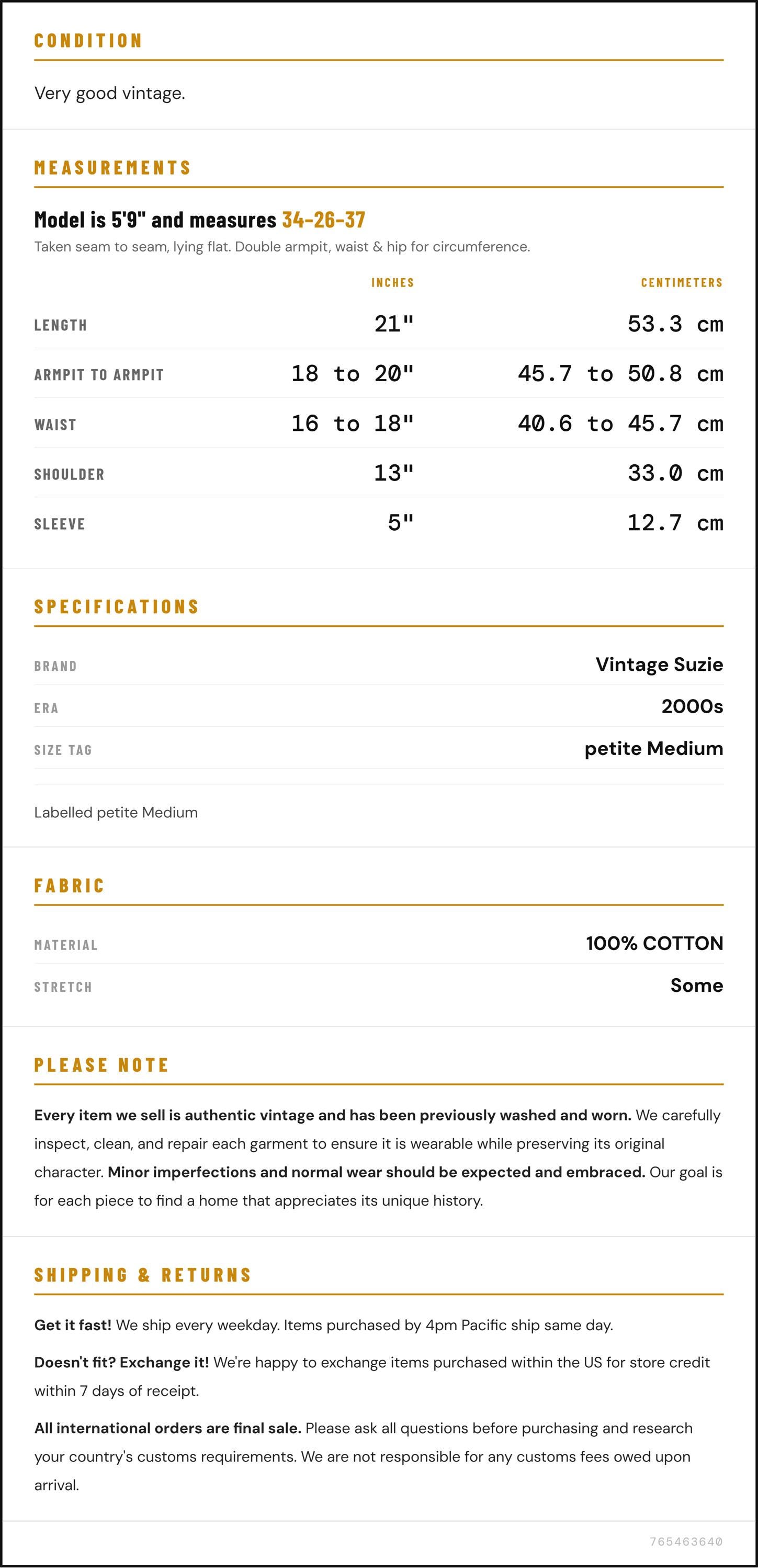 Vintage denim was usually made without any stretch, unlike modern jeans. Check the measurements to ensure proper fit, and remember to give yourself a little wiggle room in the waist and hips, depending on your preferred fit.