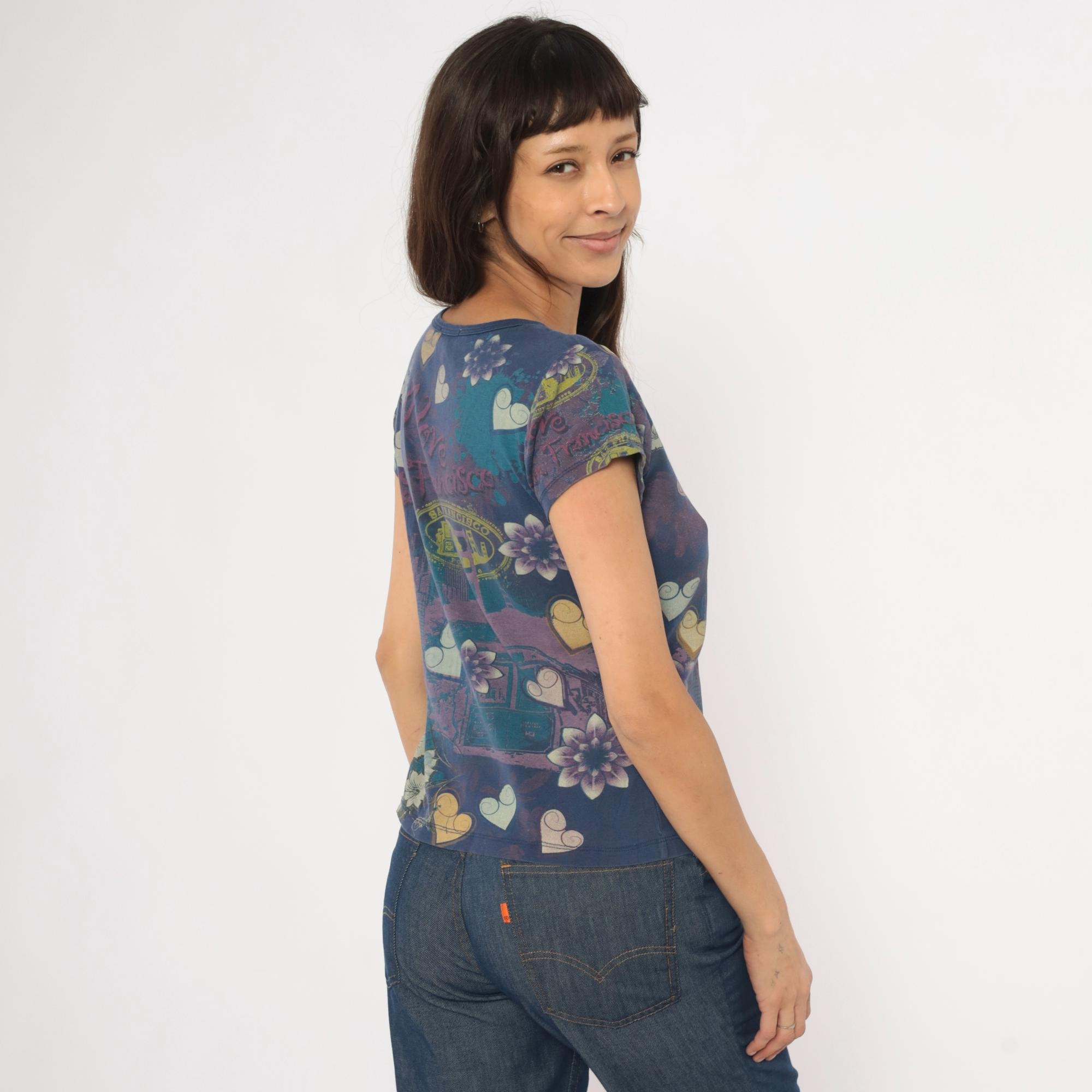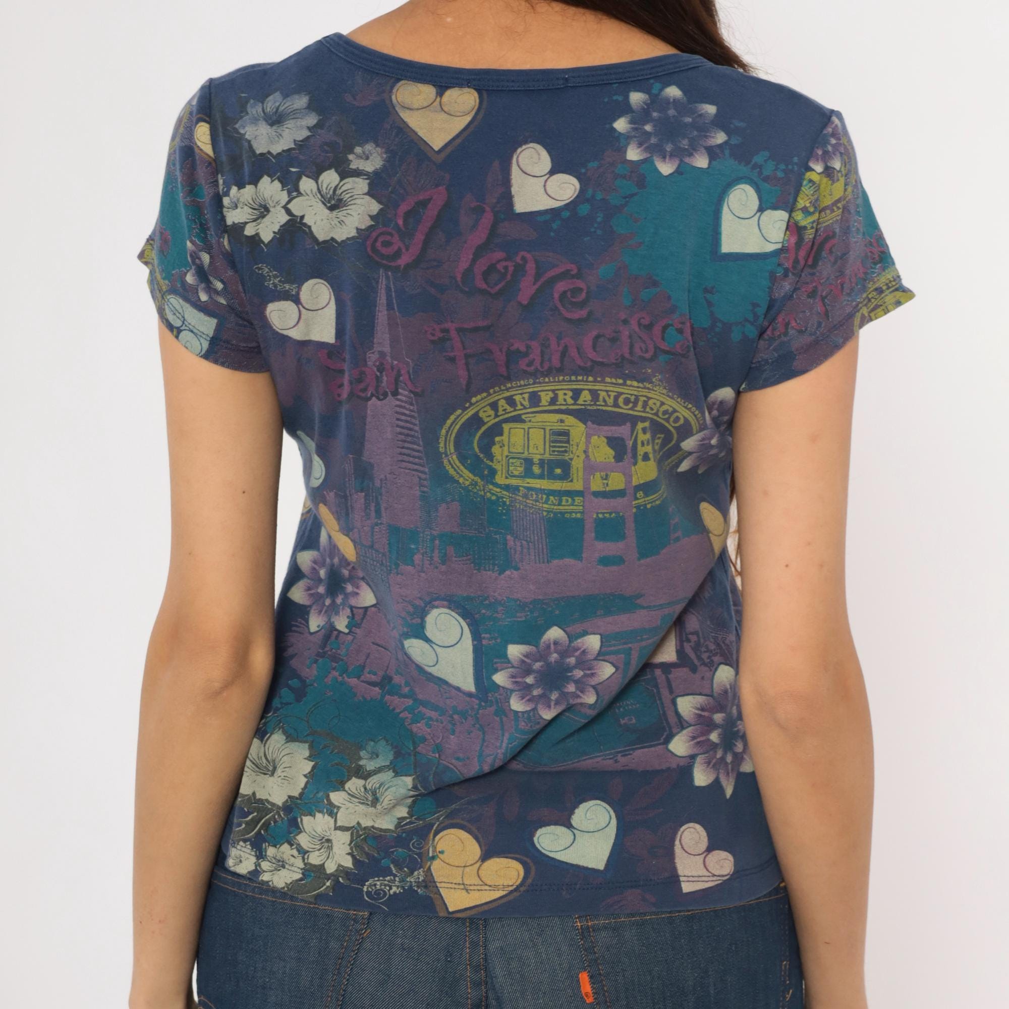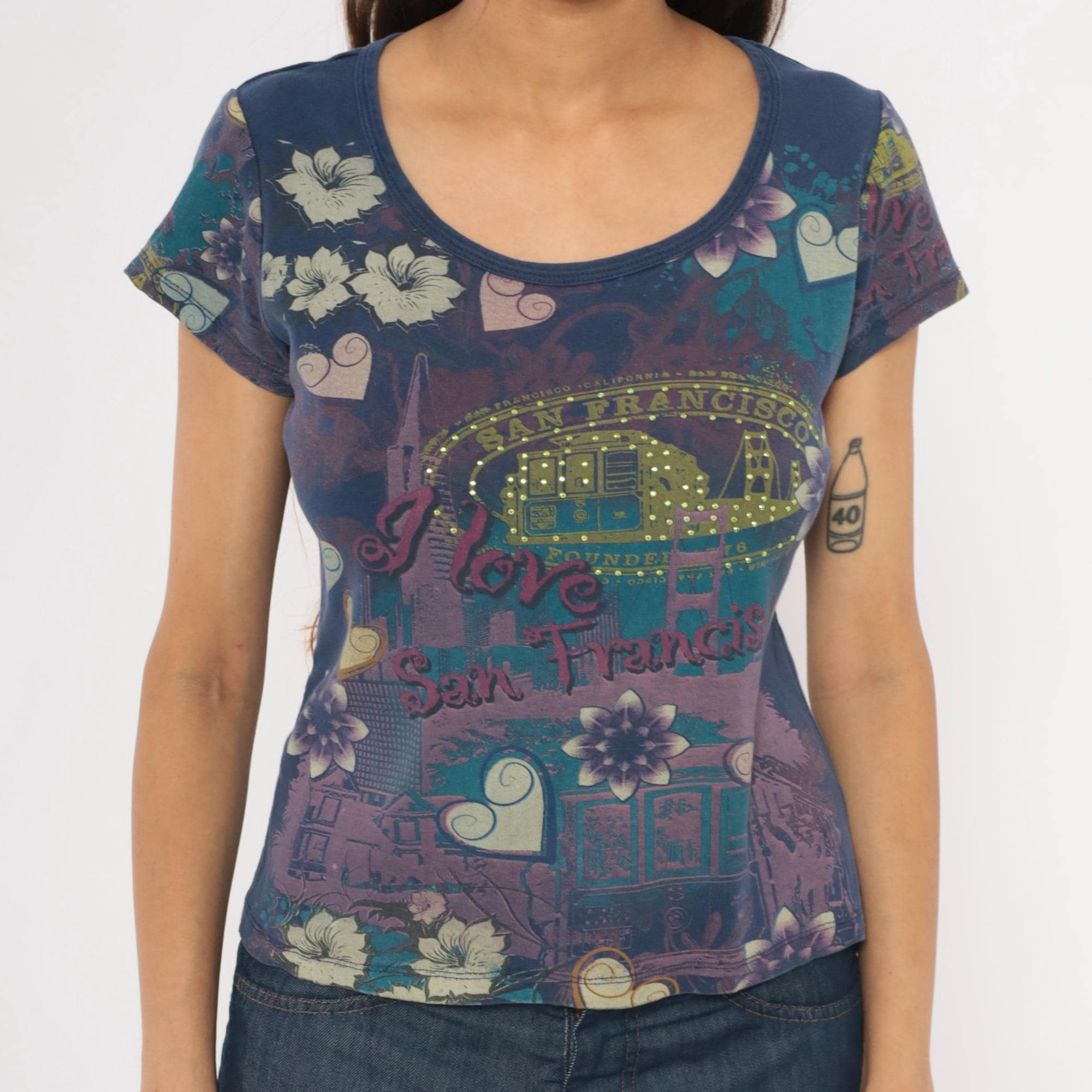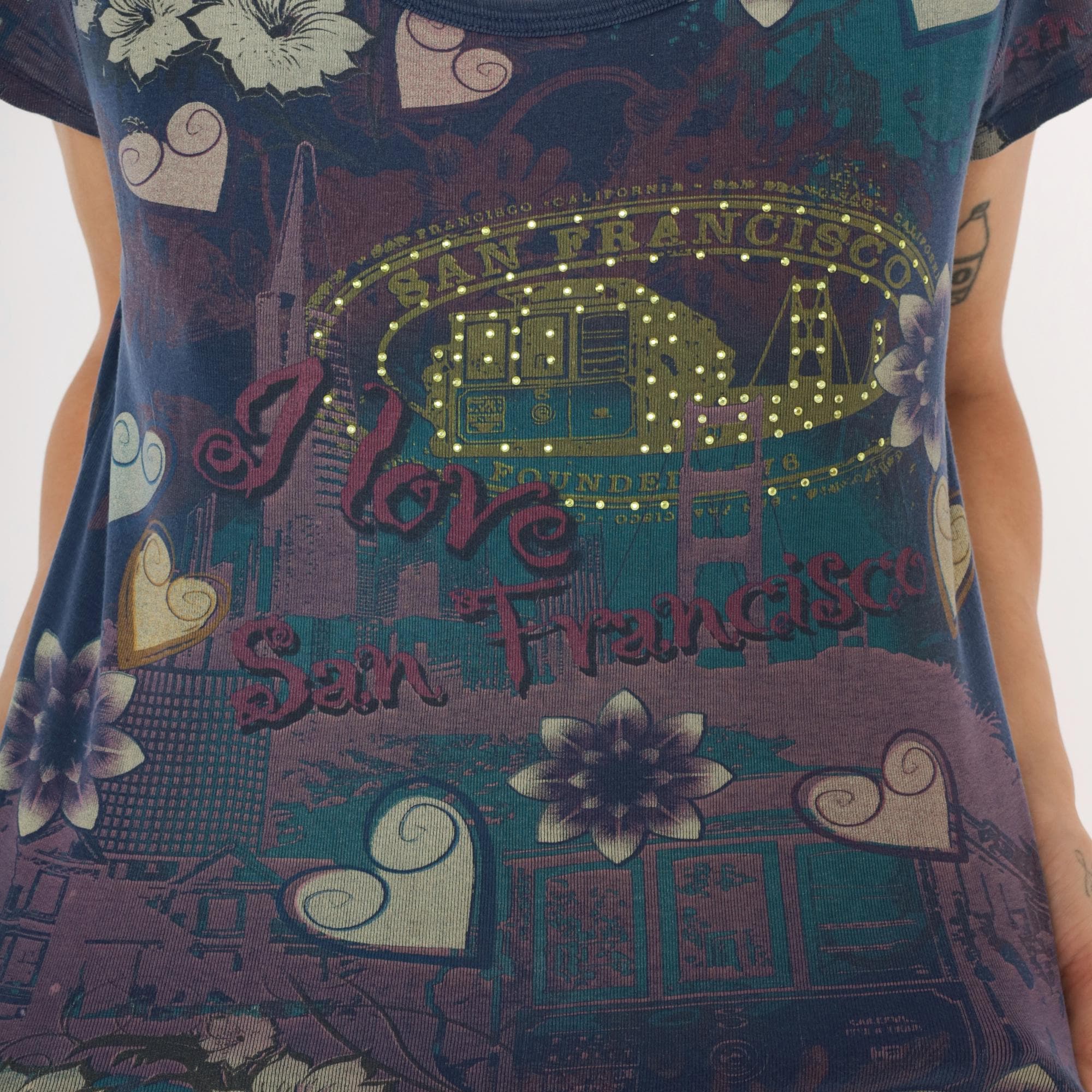 2000s all-over print tee from Vintage Suzie with a San Francisco souvenir graphic covering front, back, and sleeves. Scoop neckline, short sleeves, and a fitted silhouette in navy, purple, and teal tones. Gold-toned stud accents outline a cable car and bridge illustration at center chest, with "I Love San Francisco" script lettering. Floral motifs, hearts, and cityscape imagery layered throughout the print.