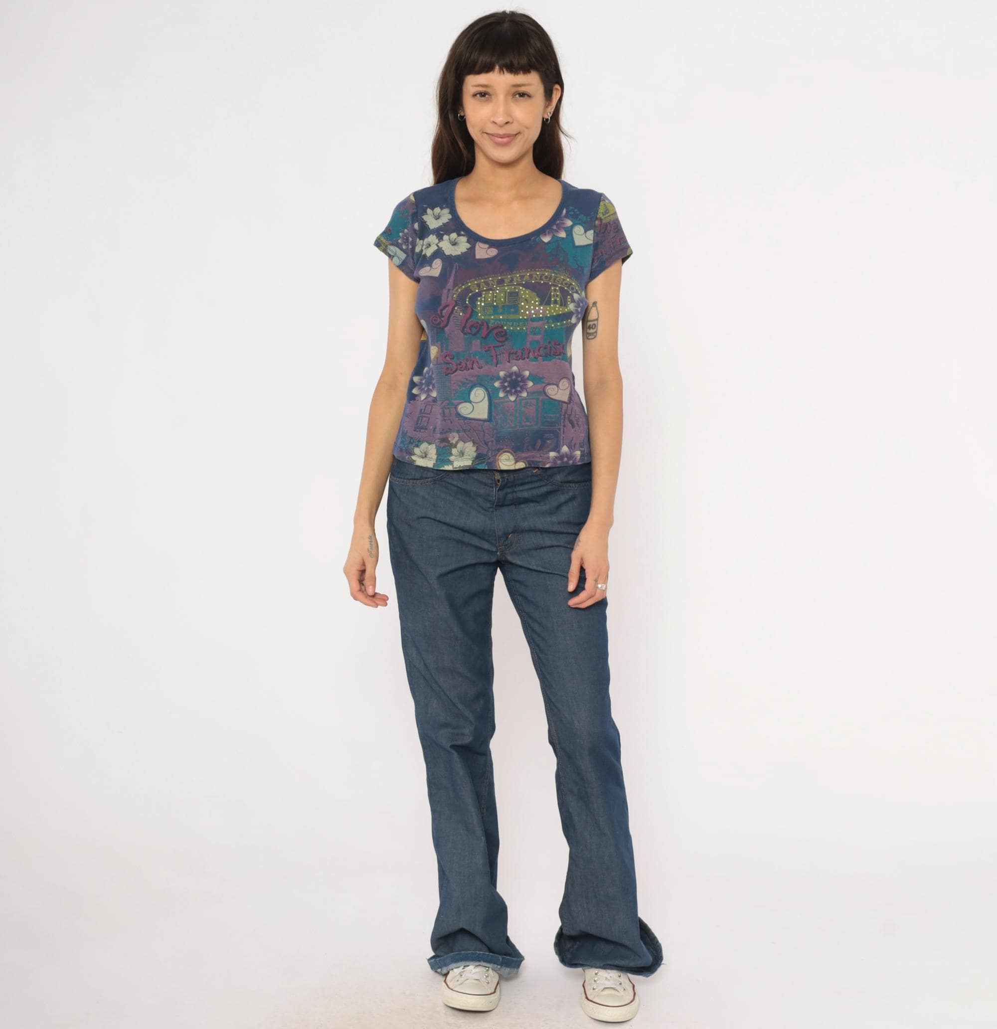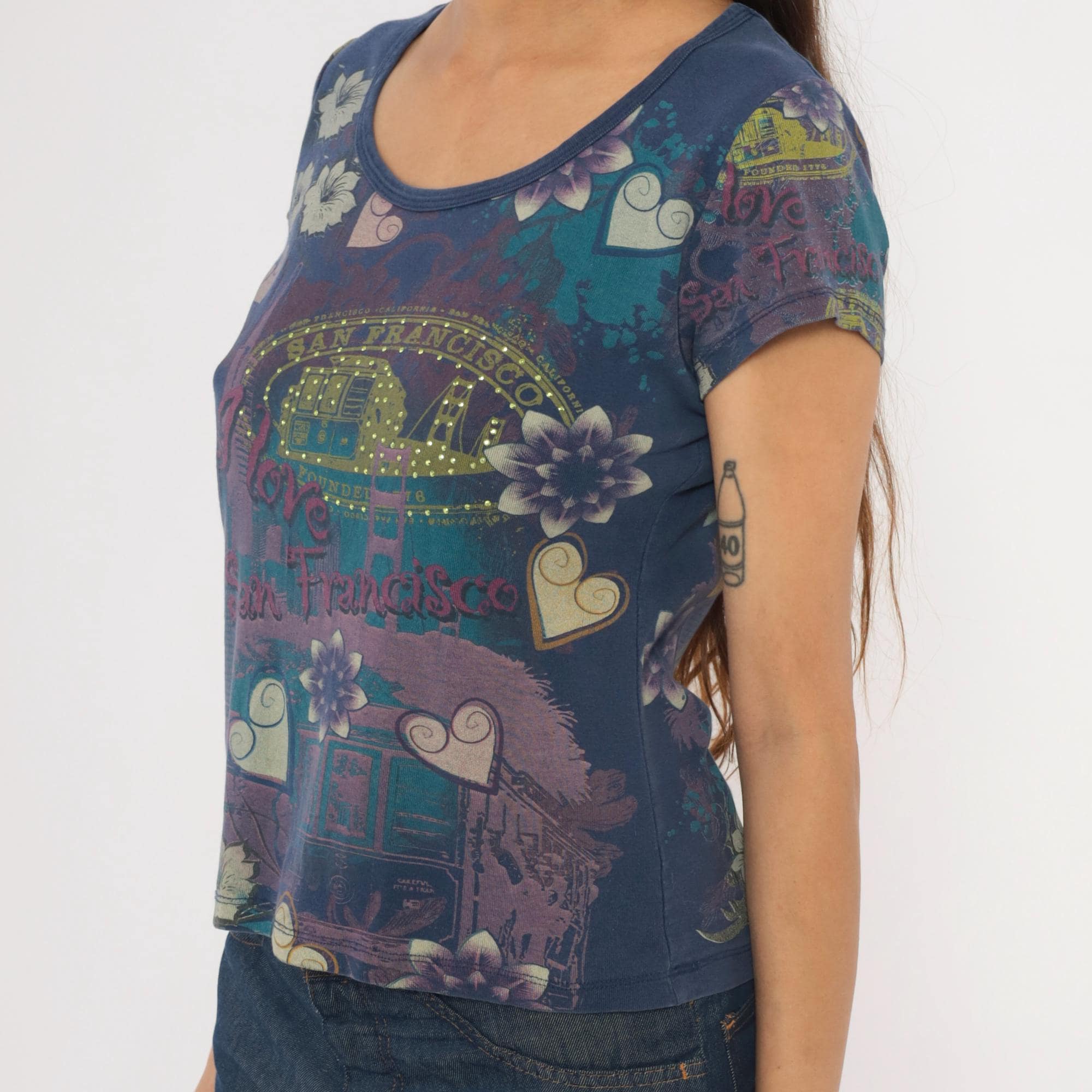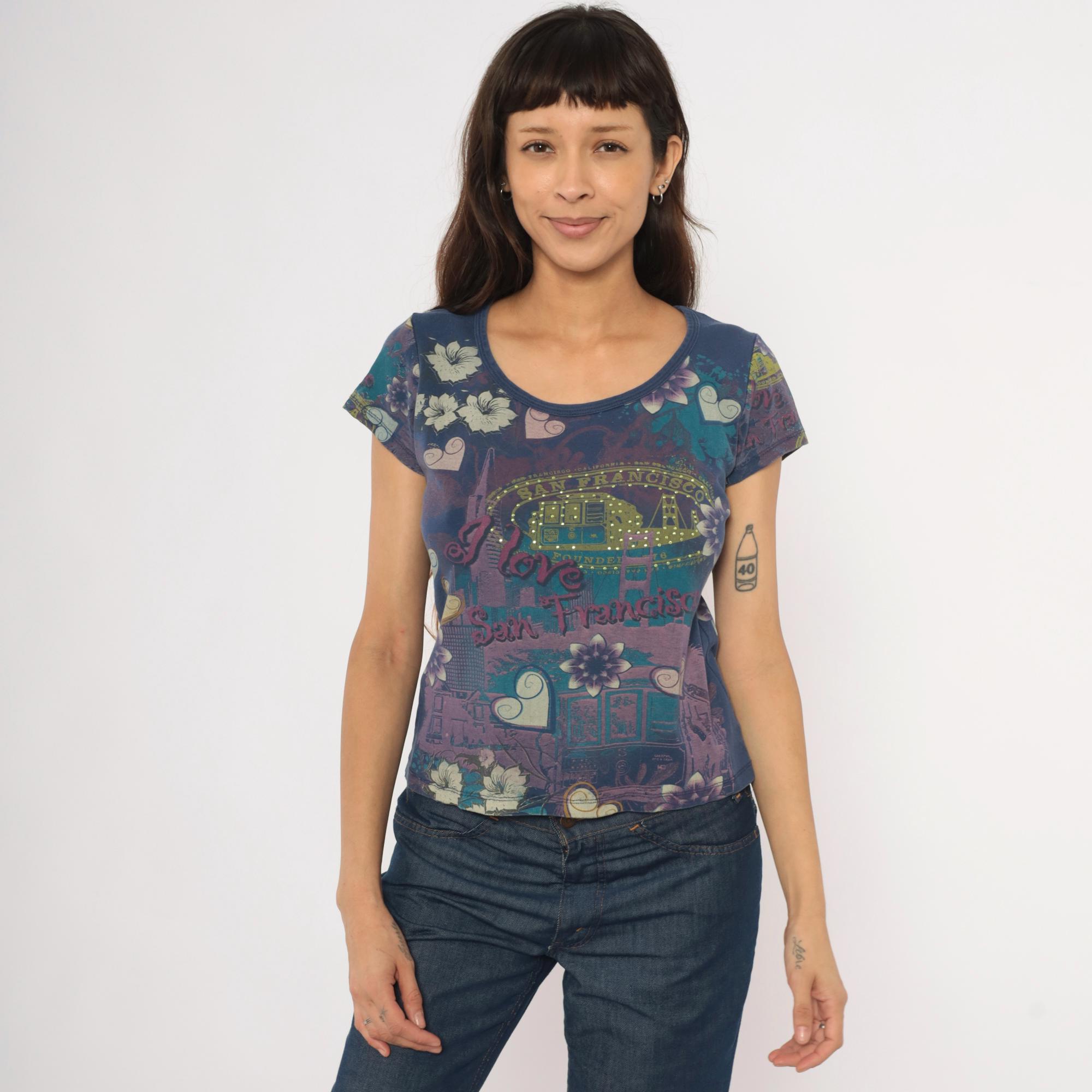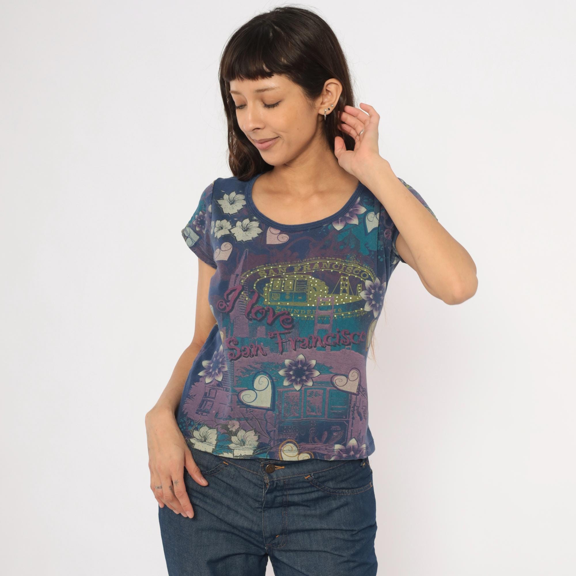 2000s all-over print tee from Vintage Suzie with a San Francisco souvenir graphic covering front, back, and sleeves. Scoop neckline, short sleeves, and a fitted silhouette in navy, purple, and teal tones. Gold-toned stud accents outline a cable car and bridge illustration at center chest, with "I Love San Francisco" script lettering. Floral motifs, hearts, and cityscape imagery layered throughout the print.