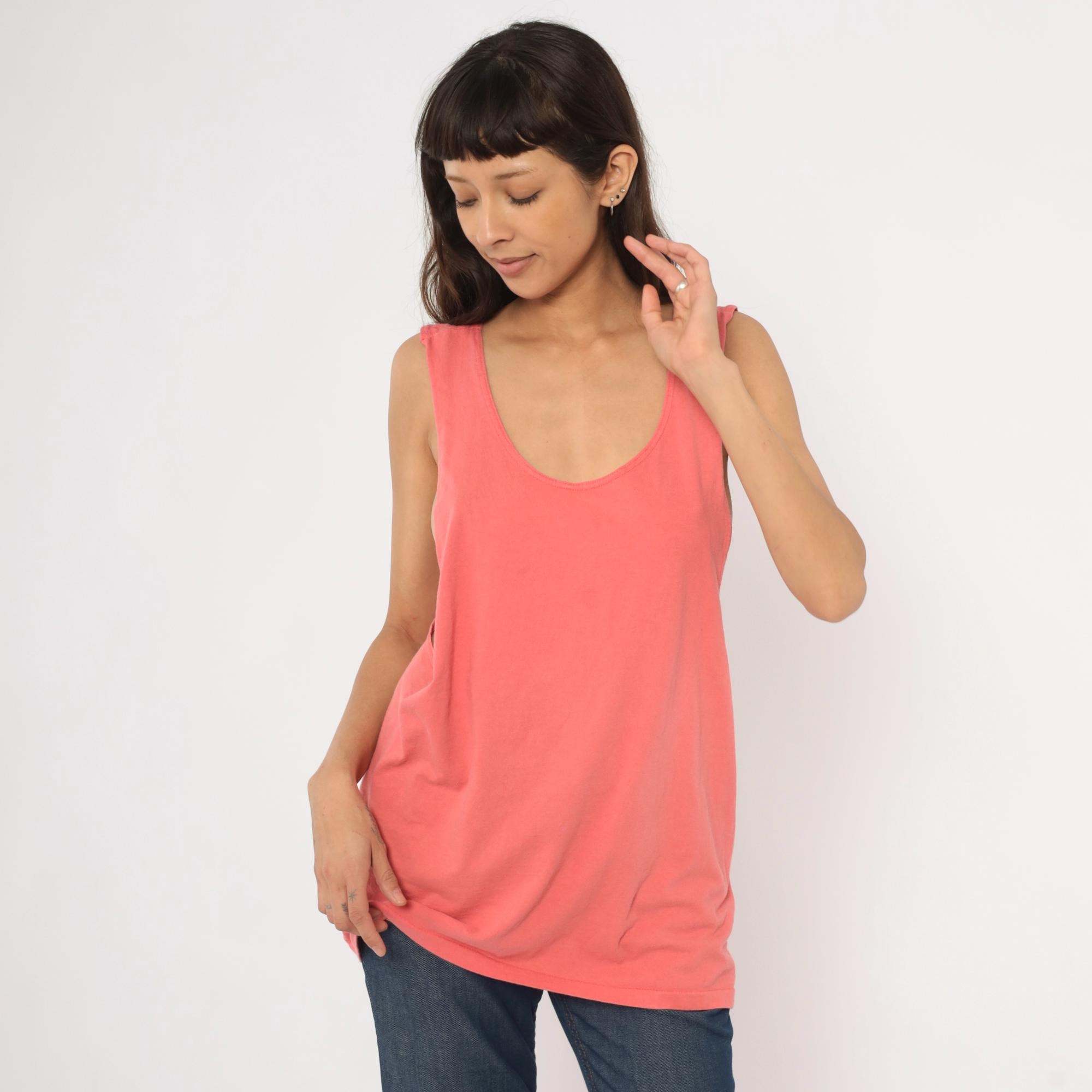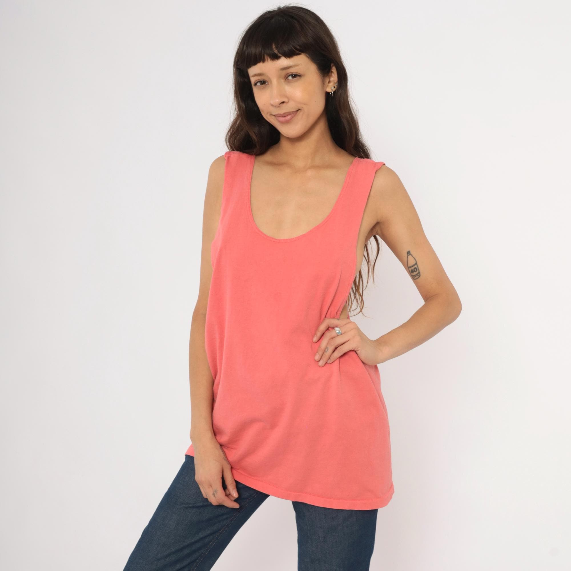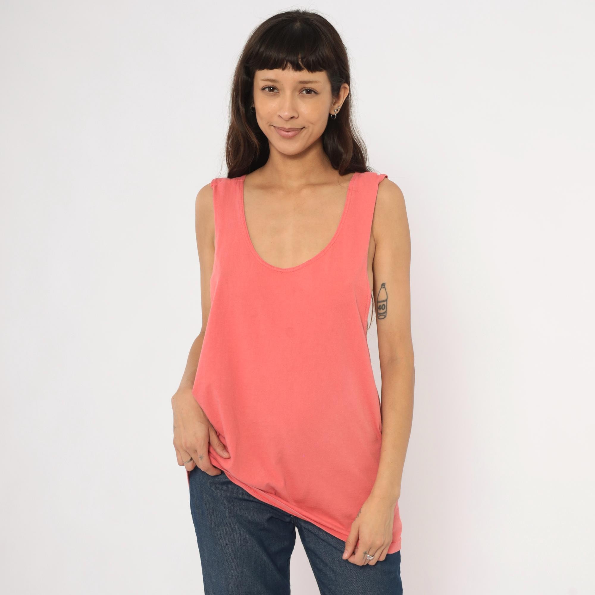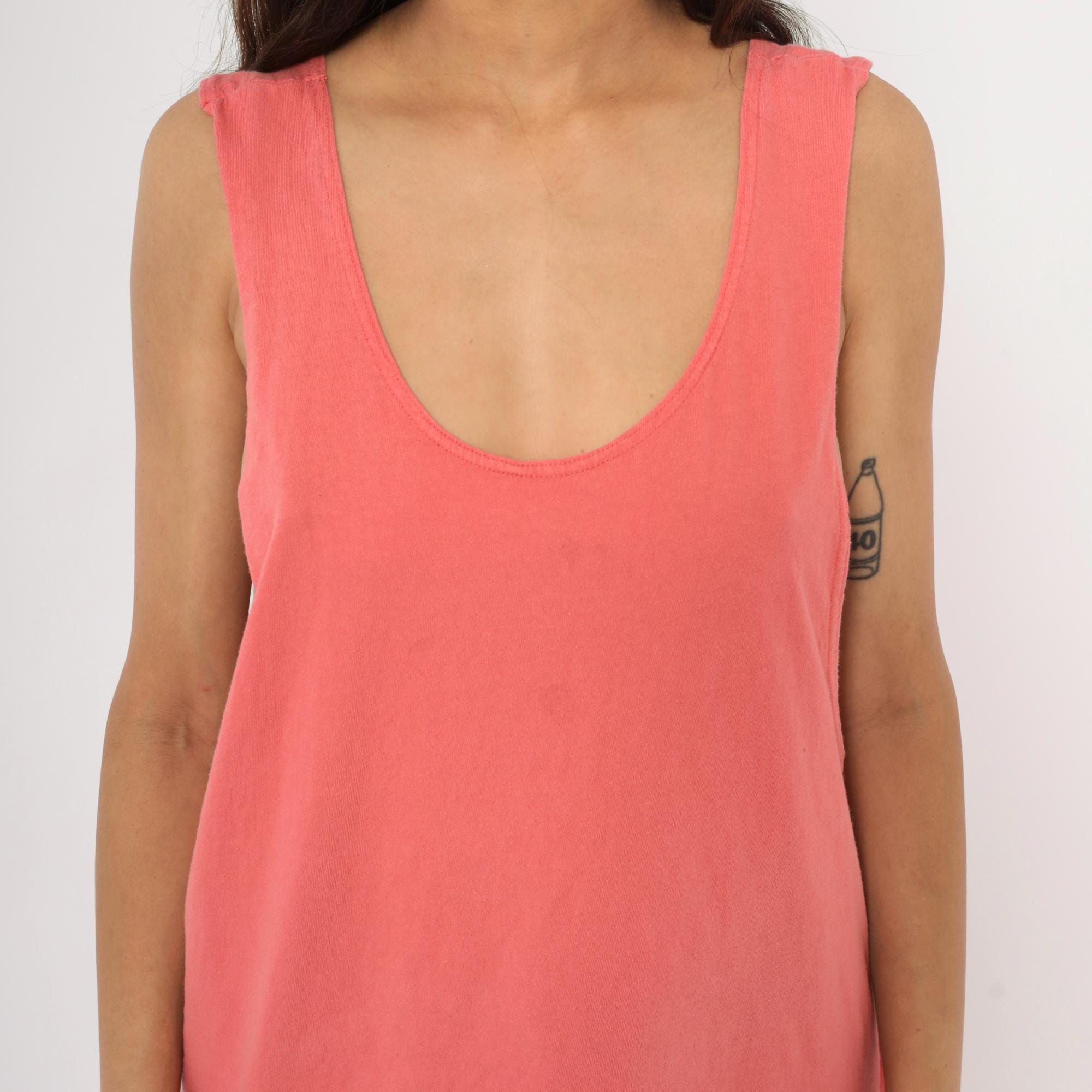 90s coral tank top from Todays News with a deep scoop neckline on both front and back. Wide shoulder straps, deep cut armholes, and a relaxed straight body with a slightly rounded hem. Garment-dyed cotton with a sun-washed, lived-in appearance in a salmon pink tone.