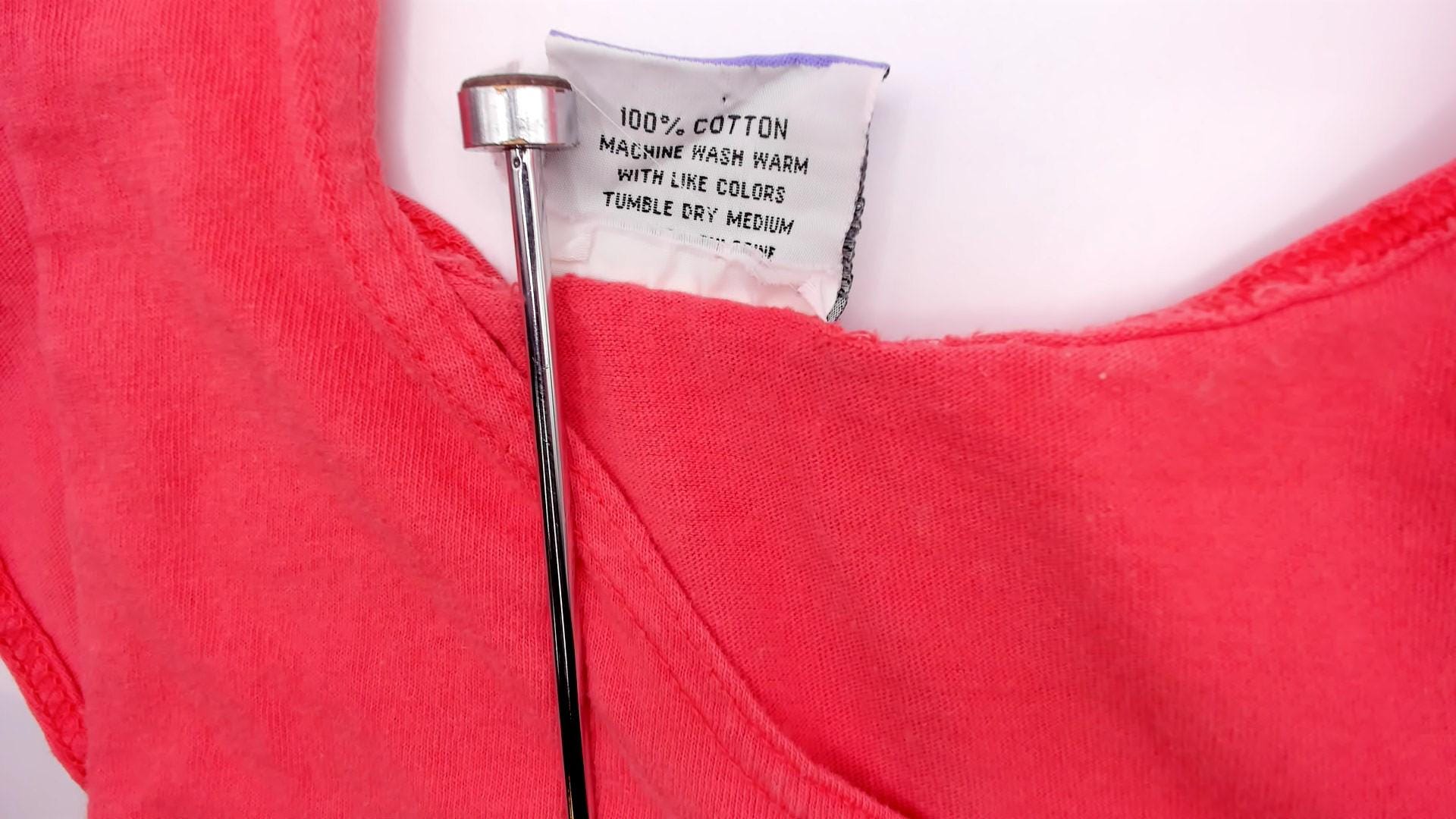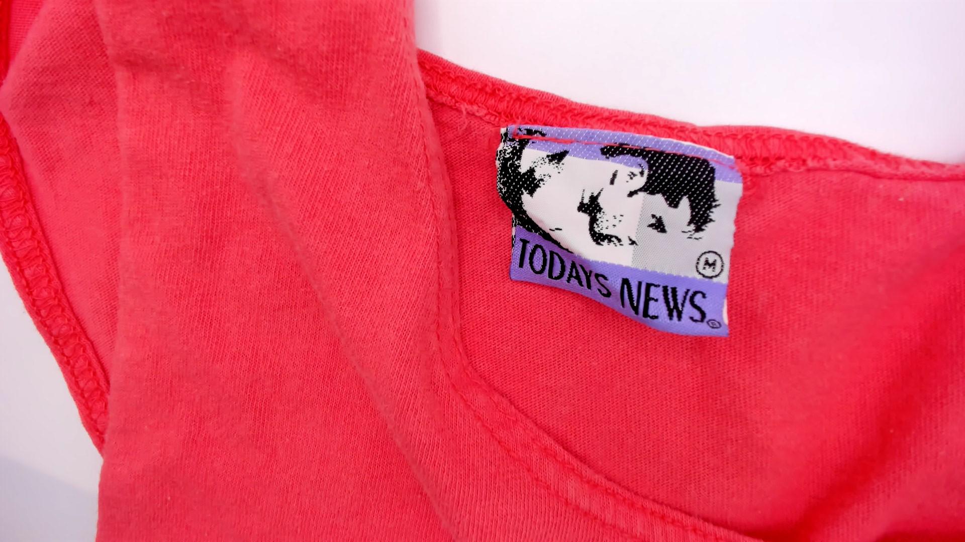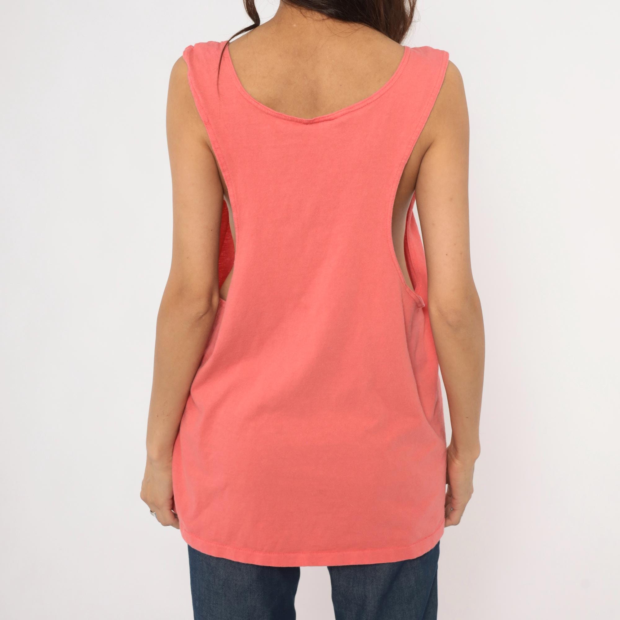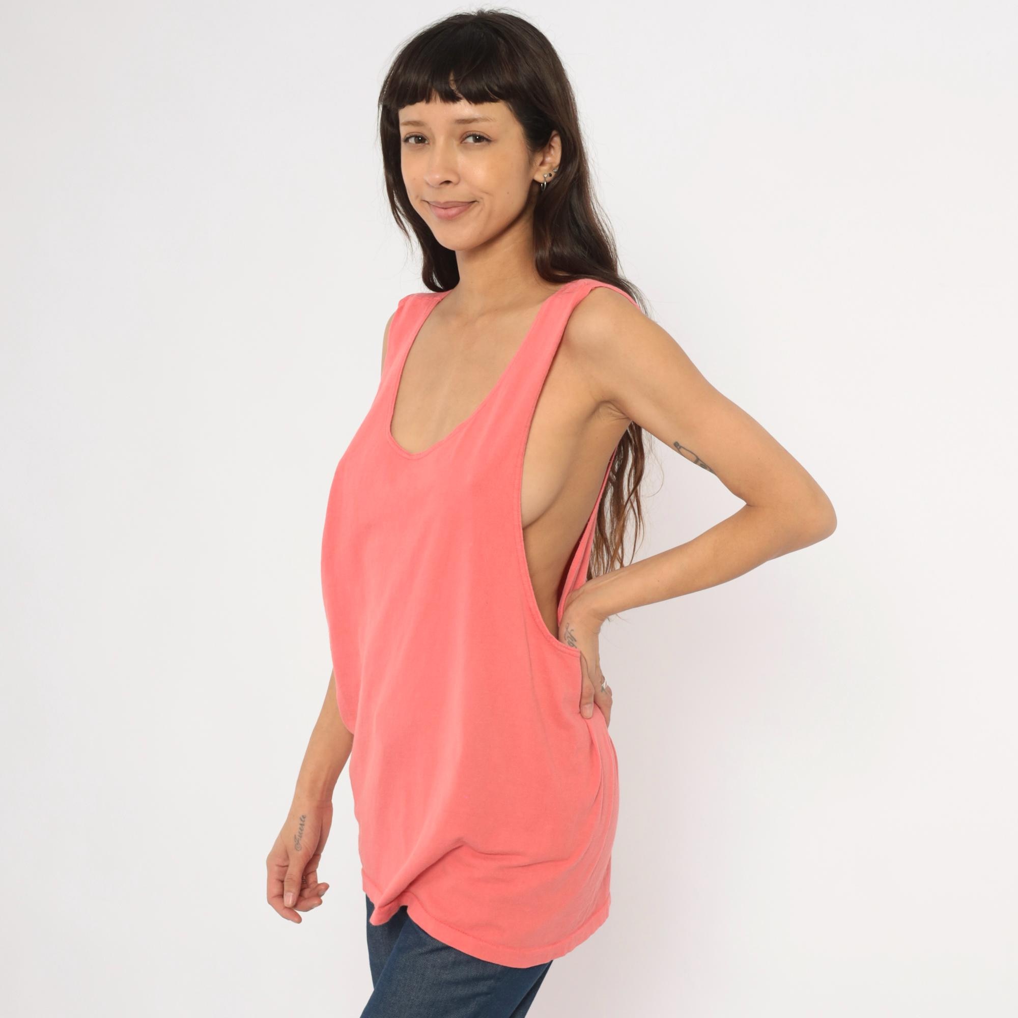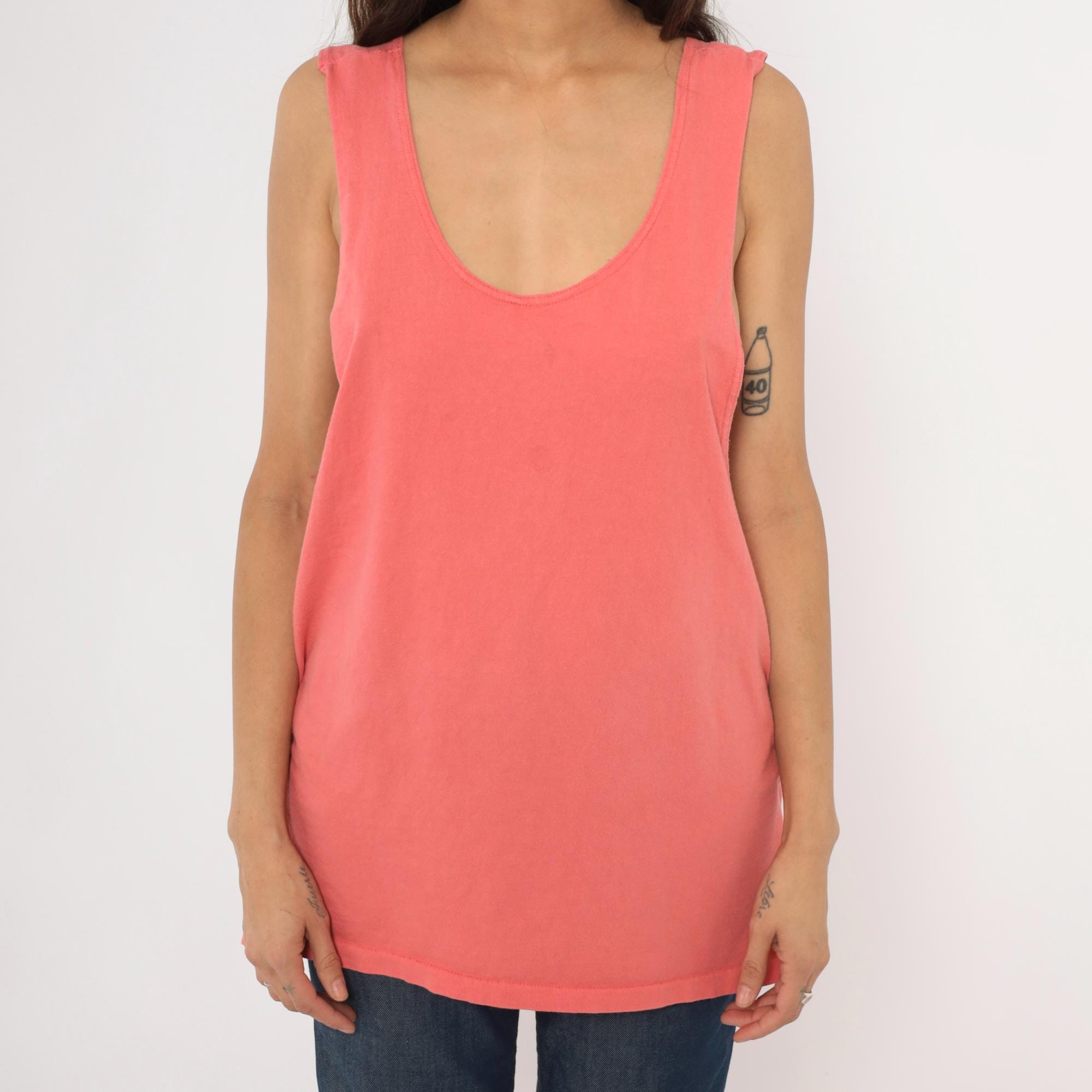 90s coral tank top from Todays News with a deep scoop neckline on both front and back. Wide shoulder straps, deep cut armholes, and a relaxed straight body with a slightly rounded hem. Garment-dyed cotton with a sun-washed, lived-in appearance in a salmon pink tone.
