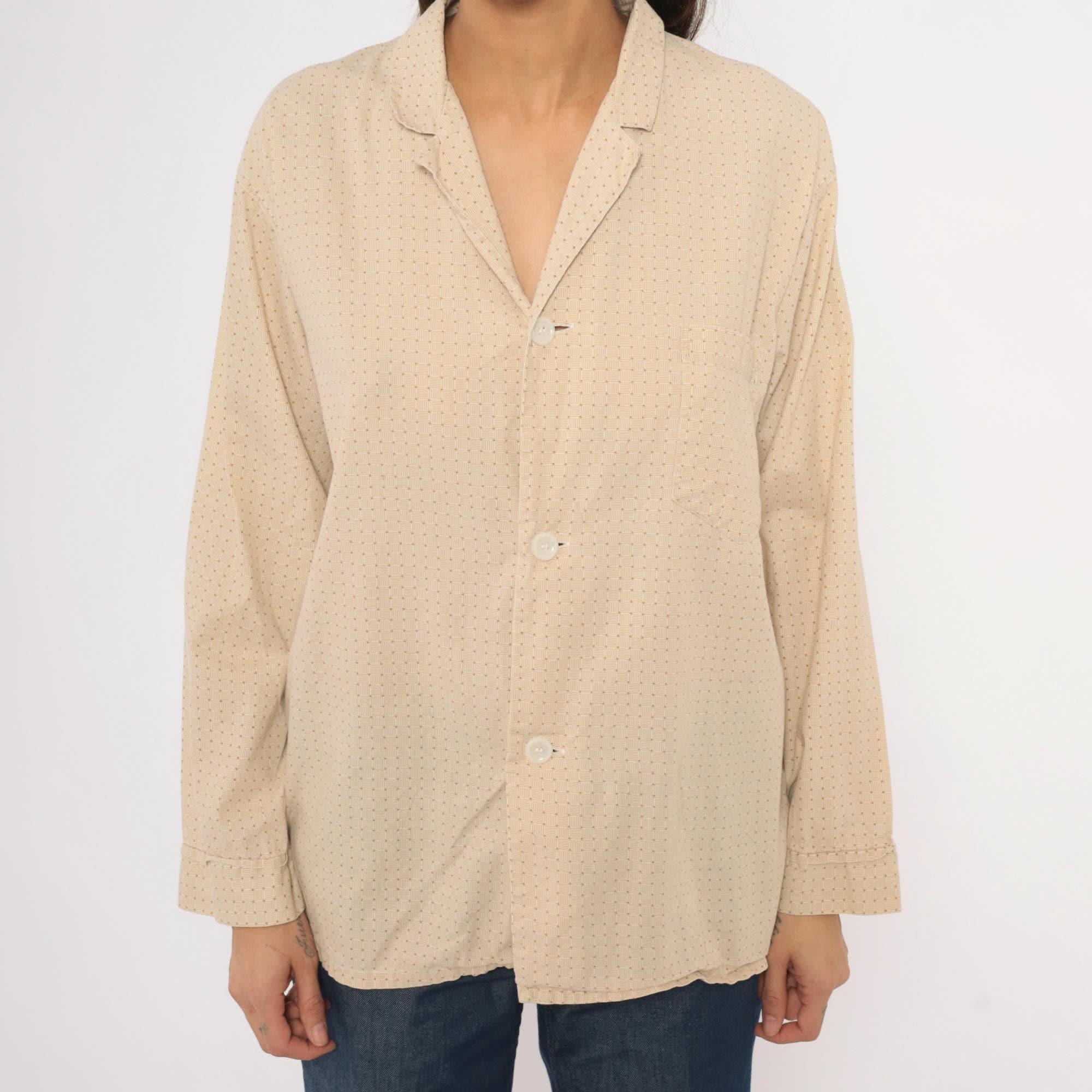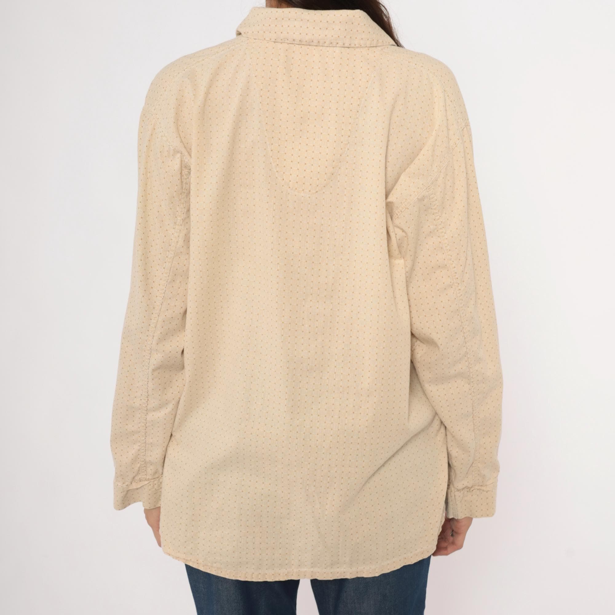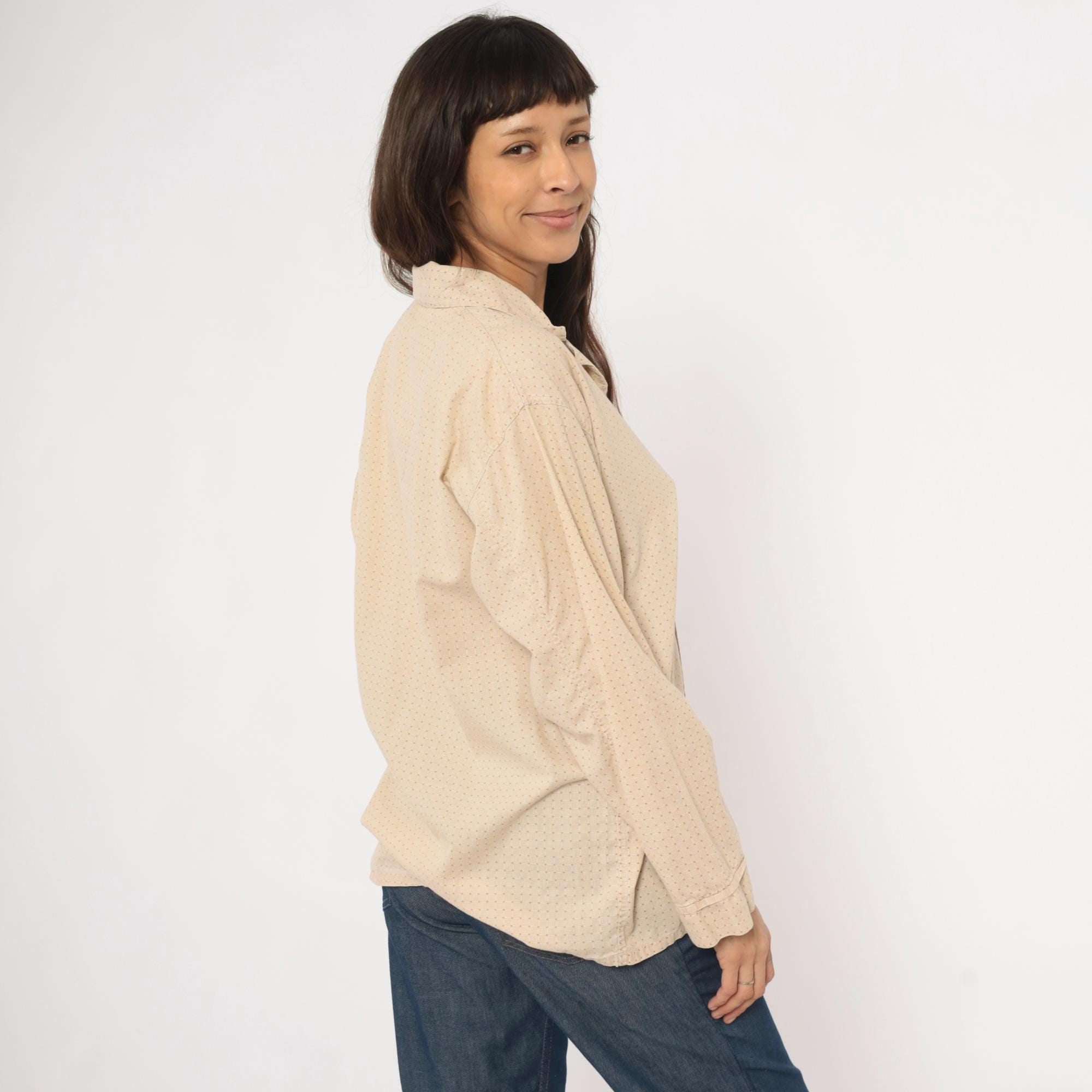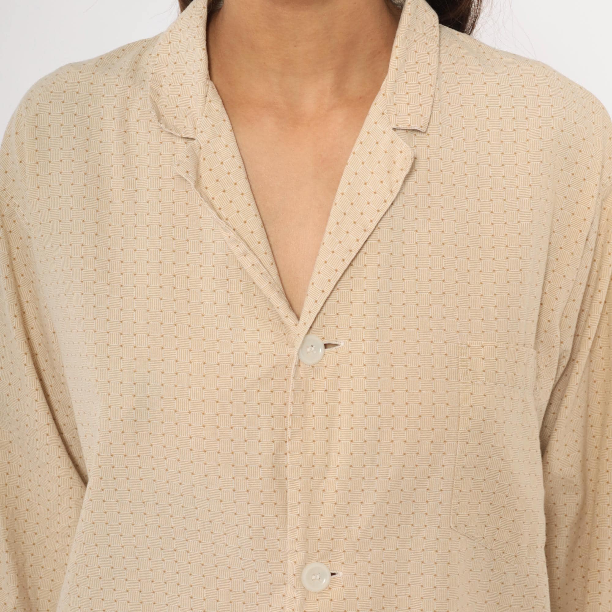 80s tan camp collar shirt from Faultless by Erro with a tonal basketweave texture across the entire fabric and small dot accents at each grid intersection. Notched lapel collar, button front closure with four translucent buttons, and a single chest pocket on the left side. Long sleeves with simple folded cuffs and a straight, untucked hem.