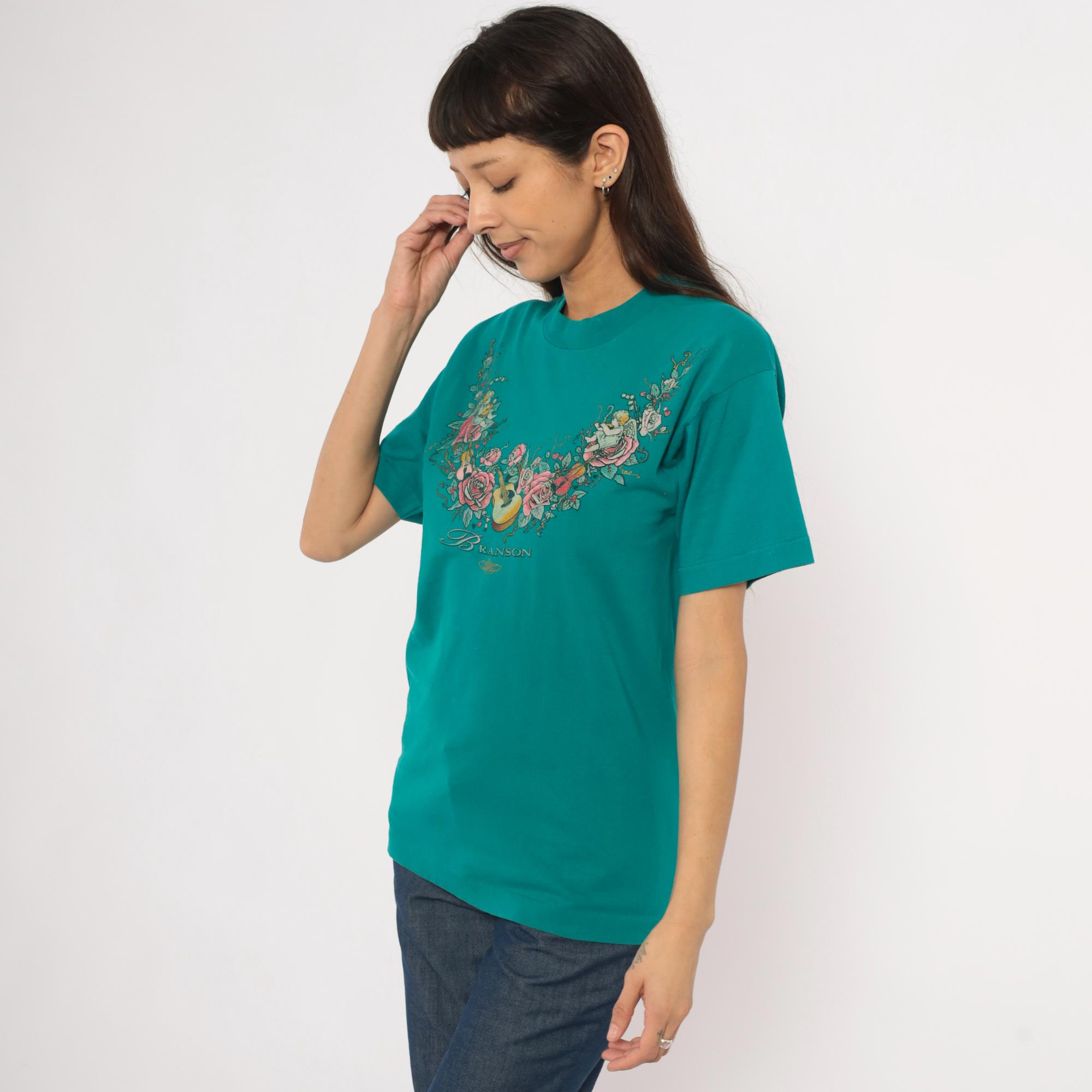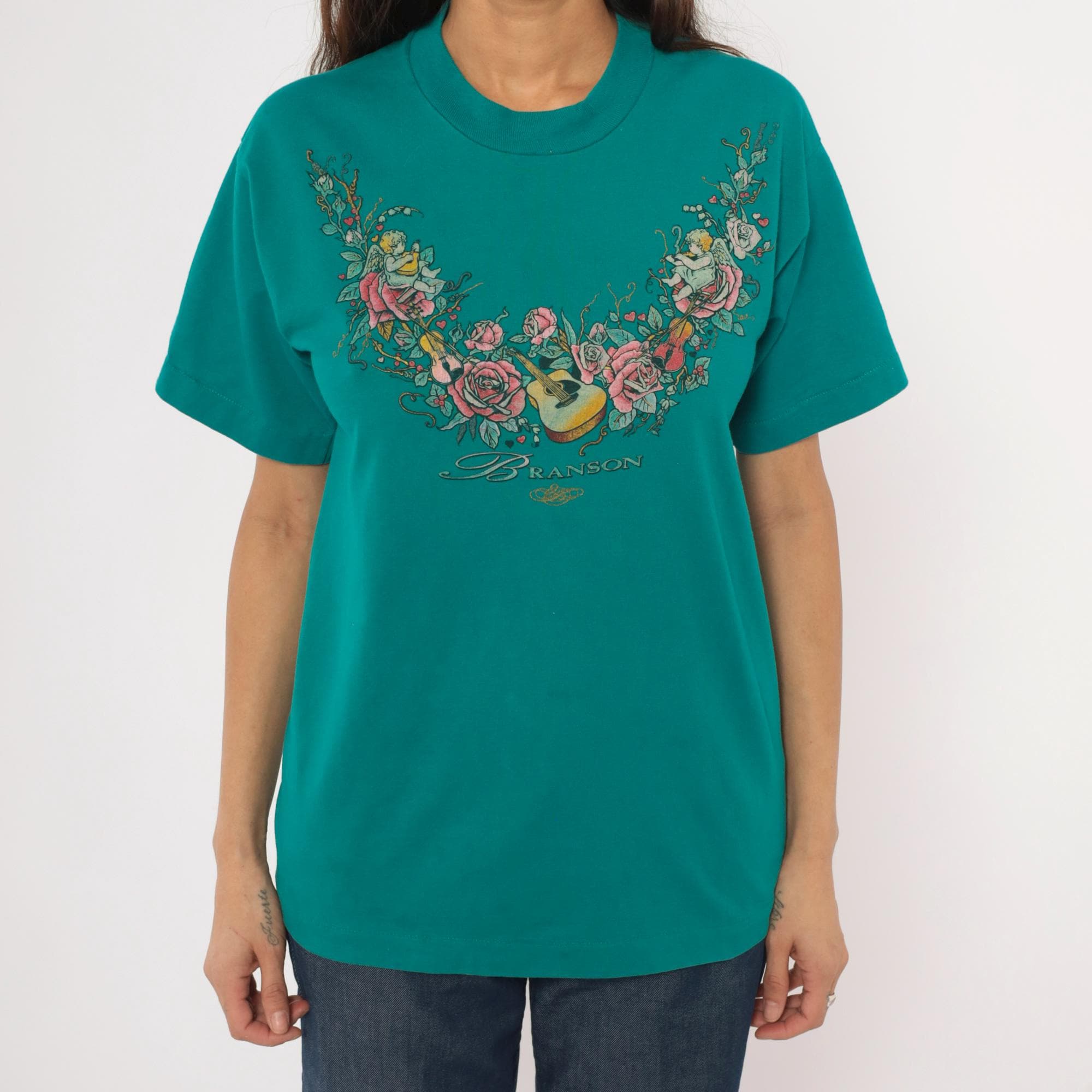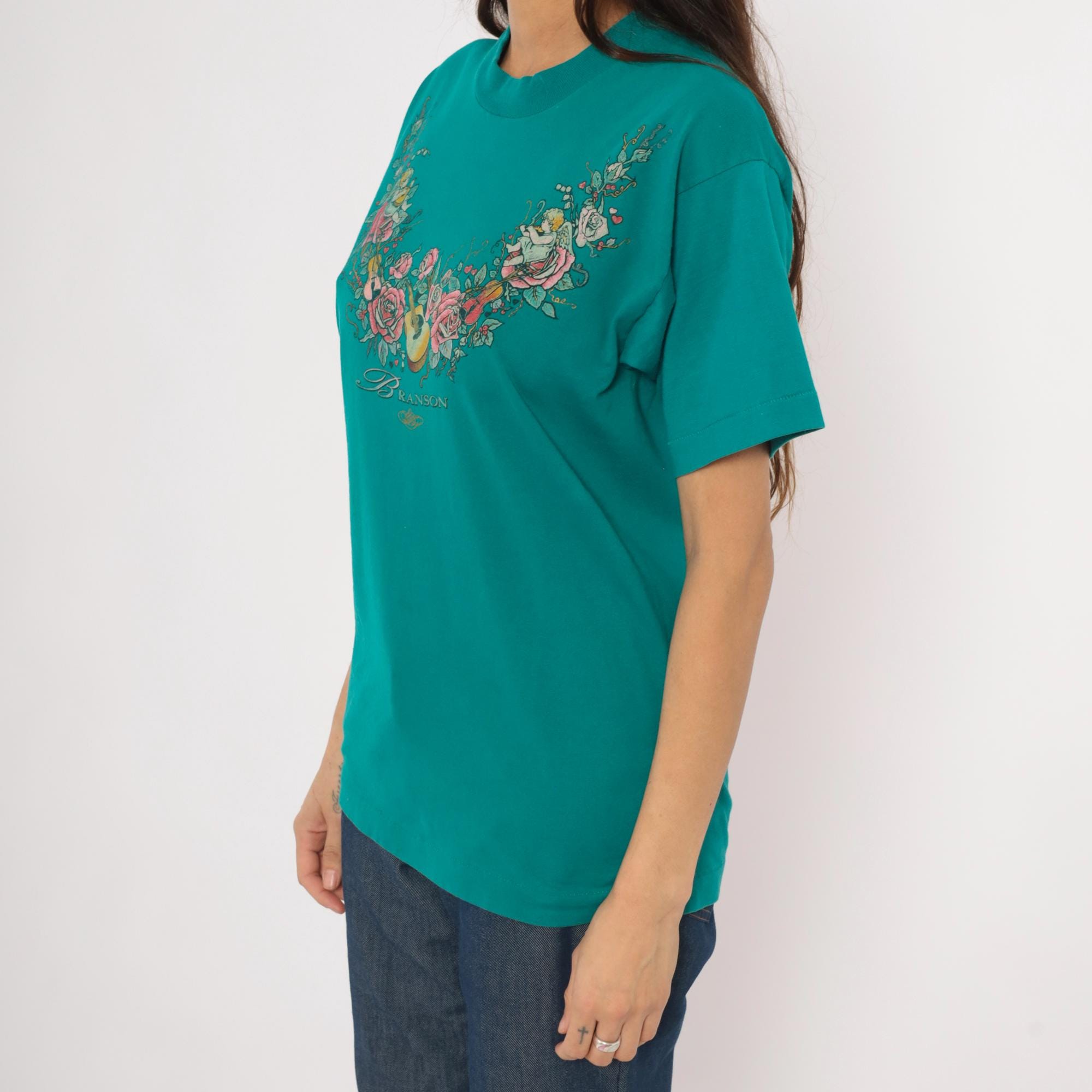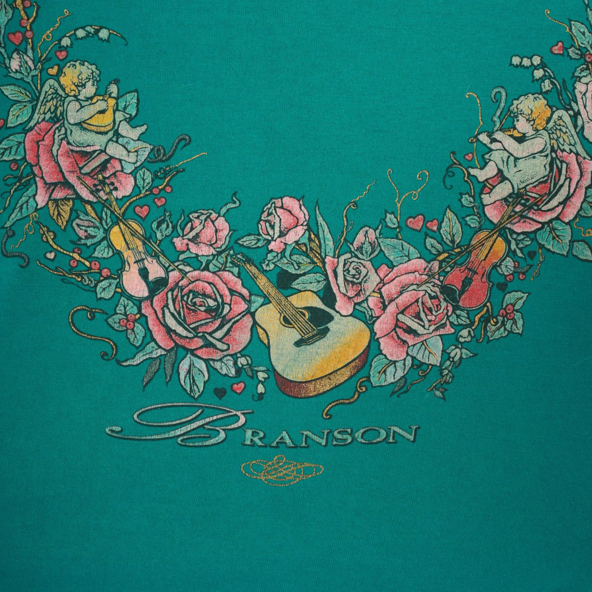 90s teal crew neck tee from Branson with a large front graphic of cherubs, roses, violins, and an acoustic guitar arranged in a garland arc across the chest. The word "Branson" is printed in script lettering beneath the floral arrangement, with small hearts and an ornamental flourish below. Short sleeves, pullover style, and a slightly mock neckline with a relaxed straight body through the hem.