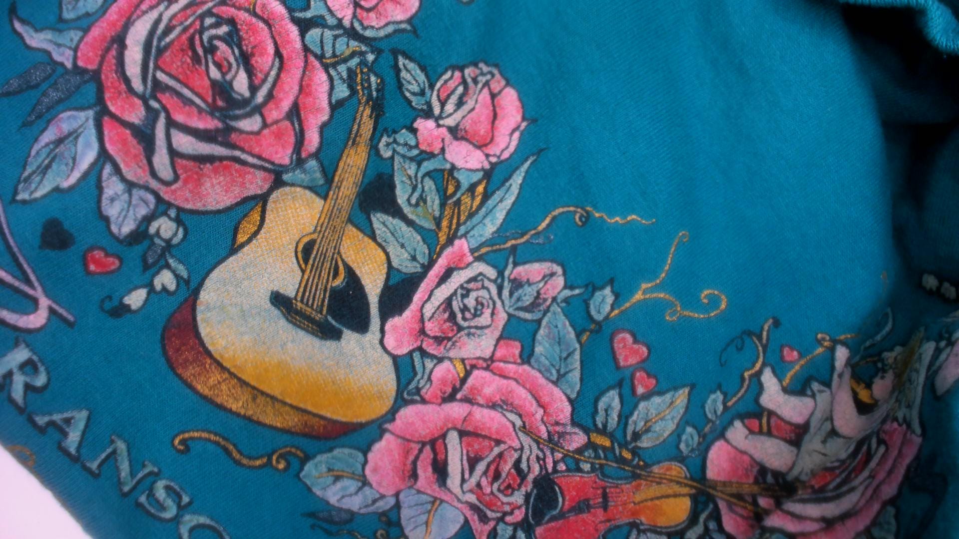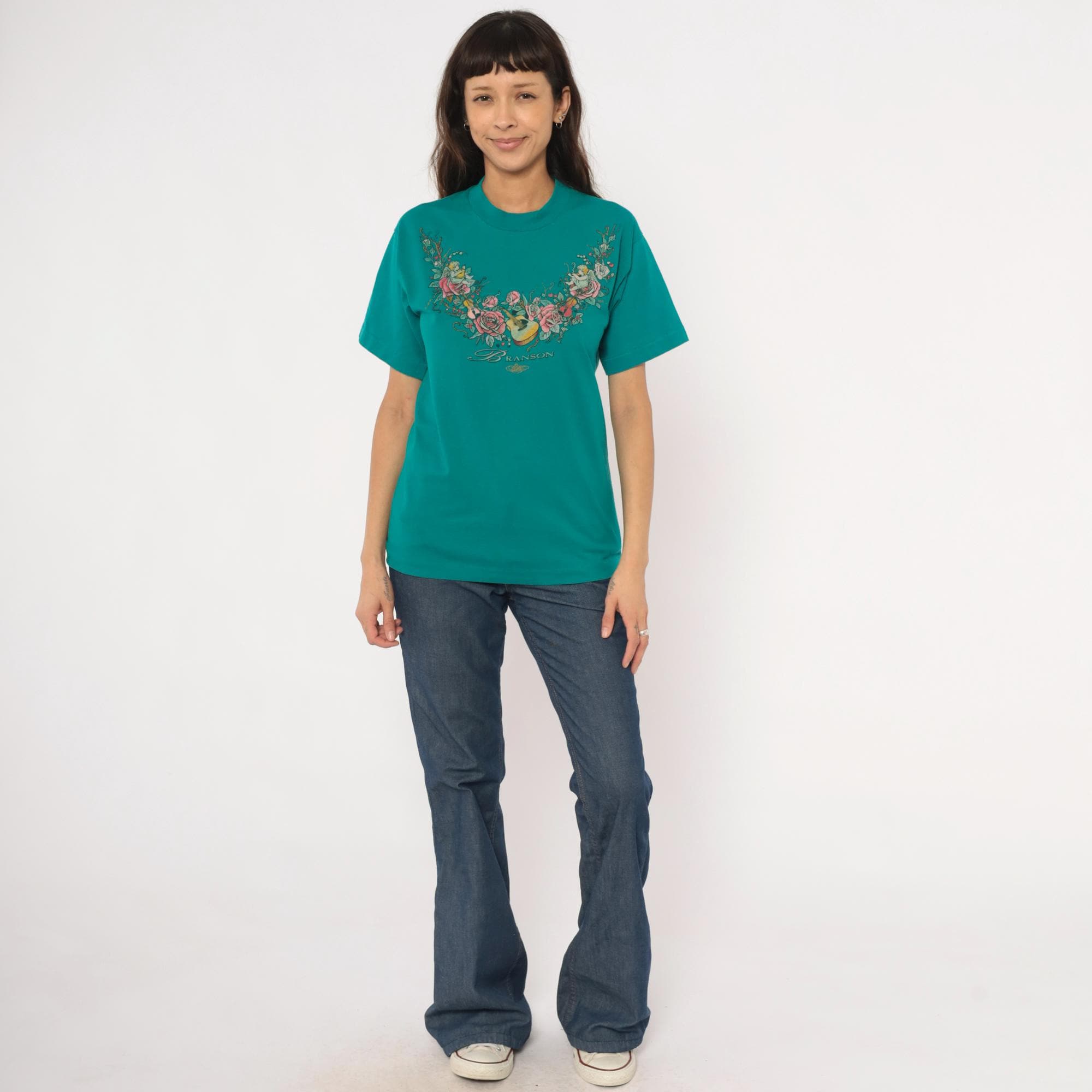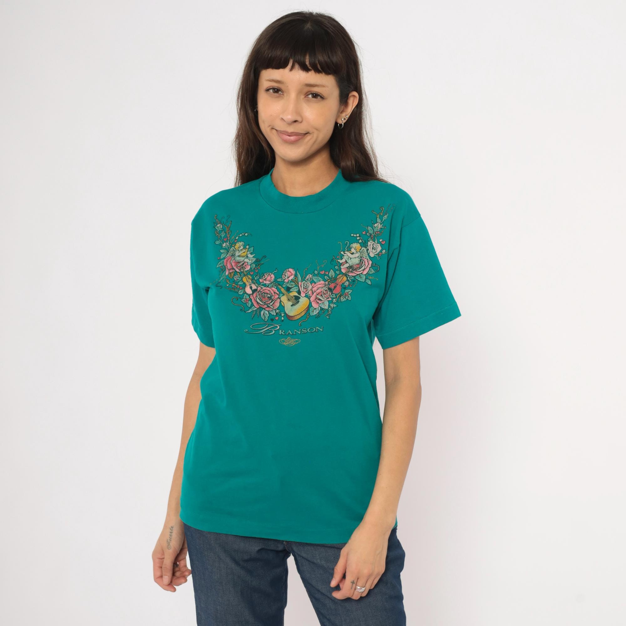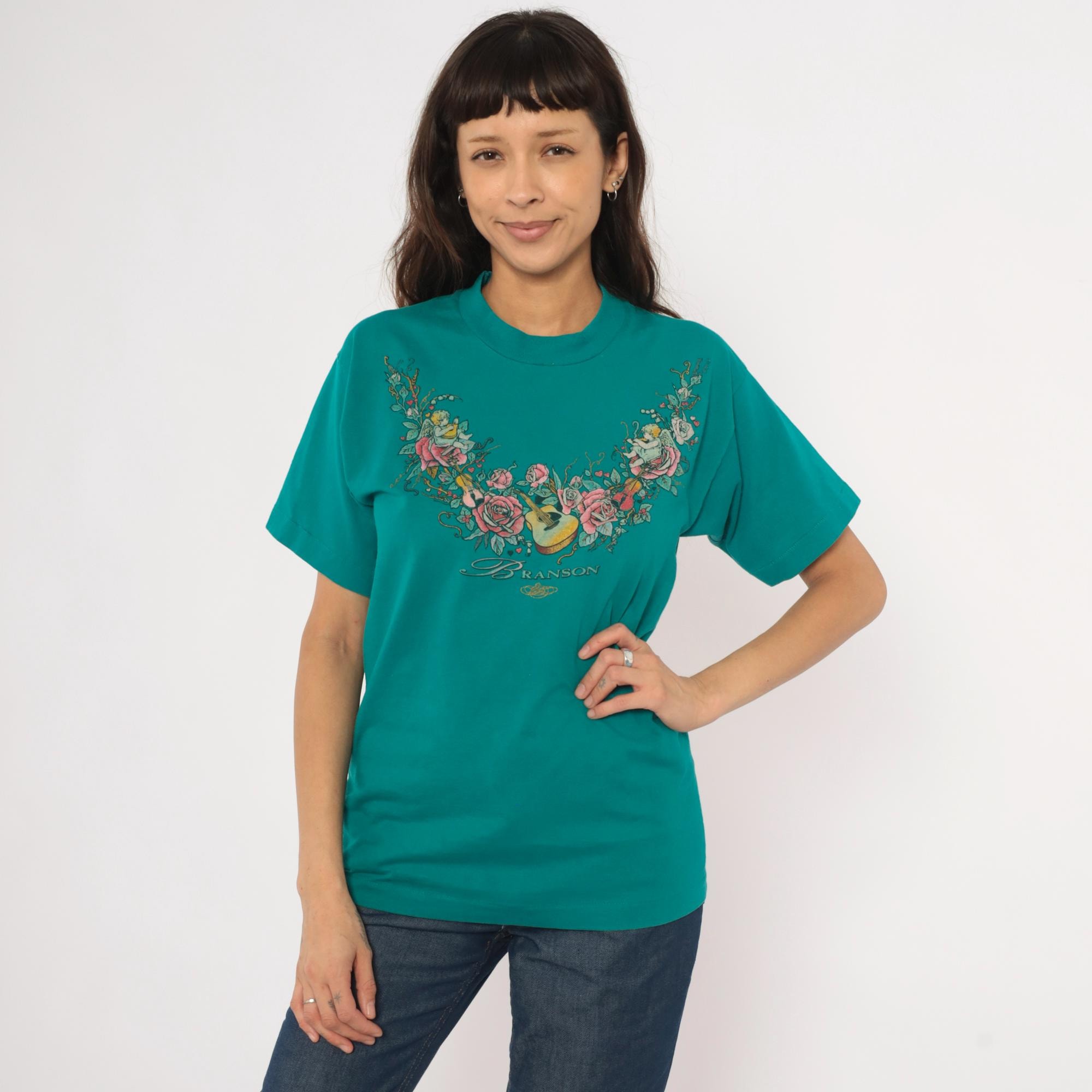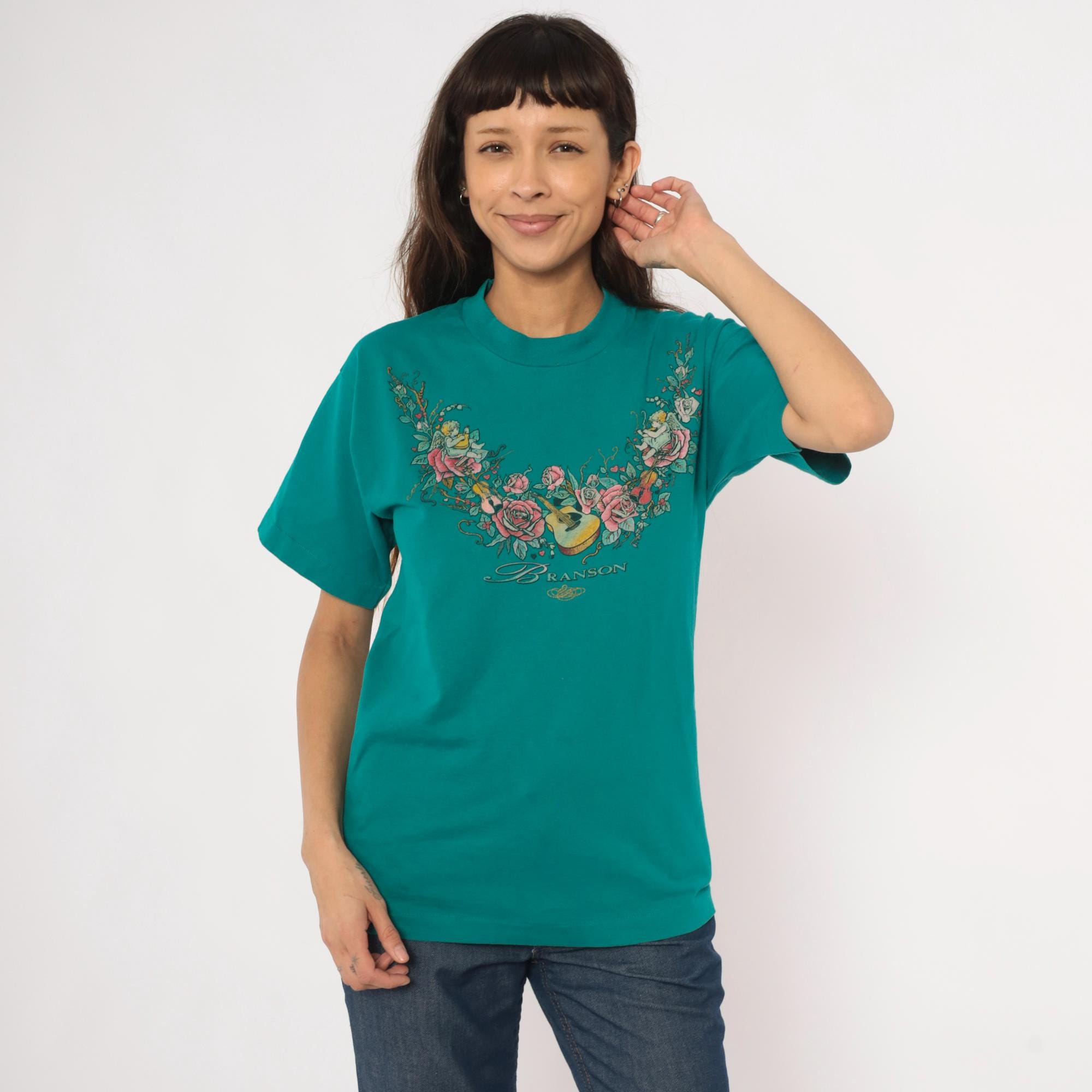 90s teal crew neck tee from Branson with a large front graphic of cherubs, roses, violins, and an acoustic guitar arranged in a garland arc across the chest. The word "Branson" is printed in script lettering beneath the floral arrangement, with small hearts and an ornamental flourish below. Short sleeves, pullover style, and a slightly mock neckline with a relaxed straight body through the hem.