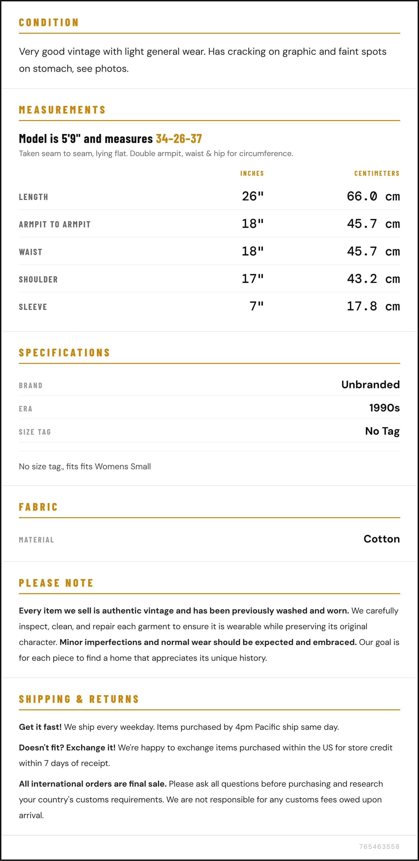 Condition: Very good vintage with light general wear. Has cracking on graphic and faint spots on stomach, see photos.