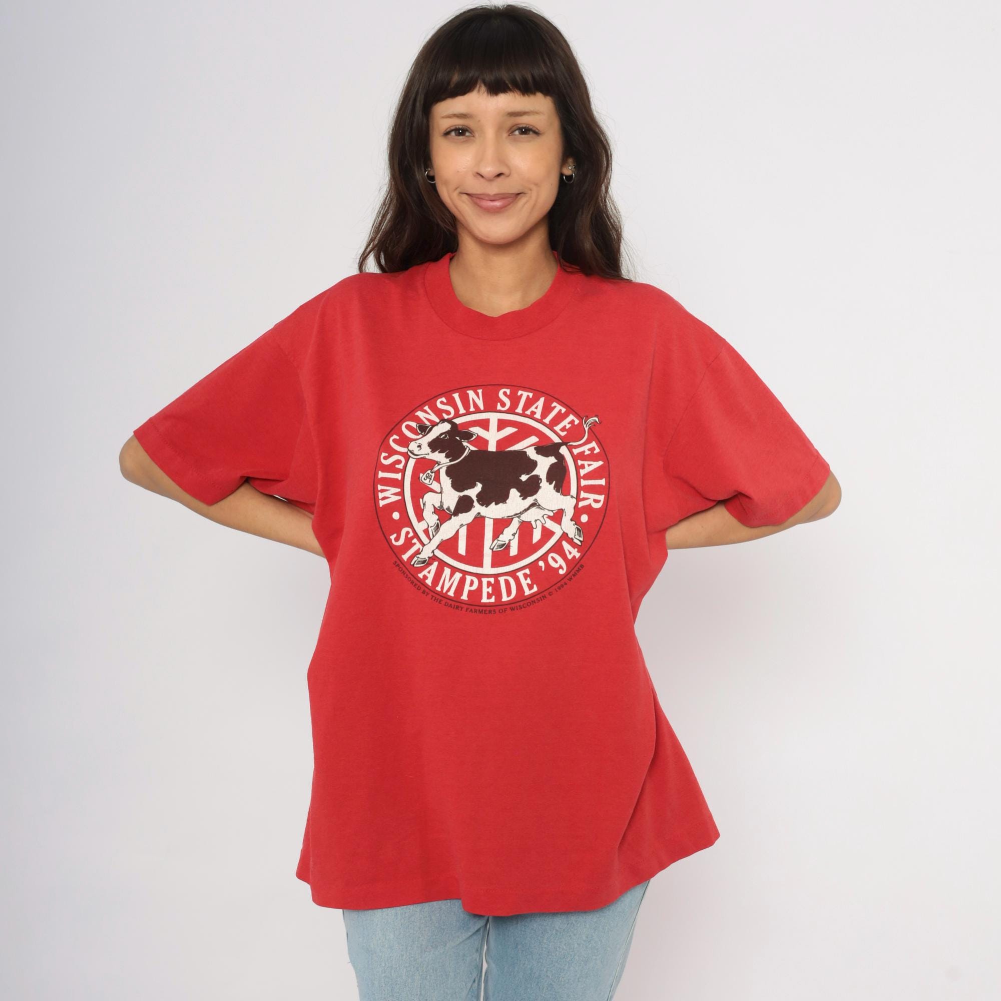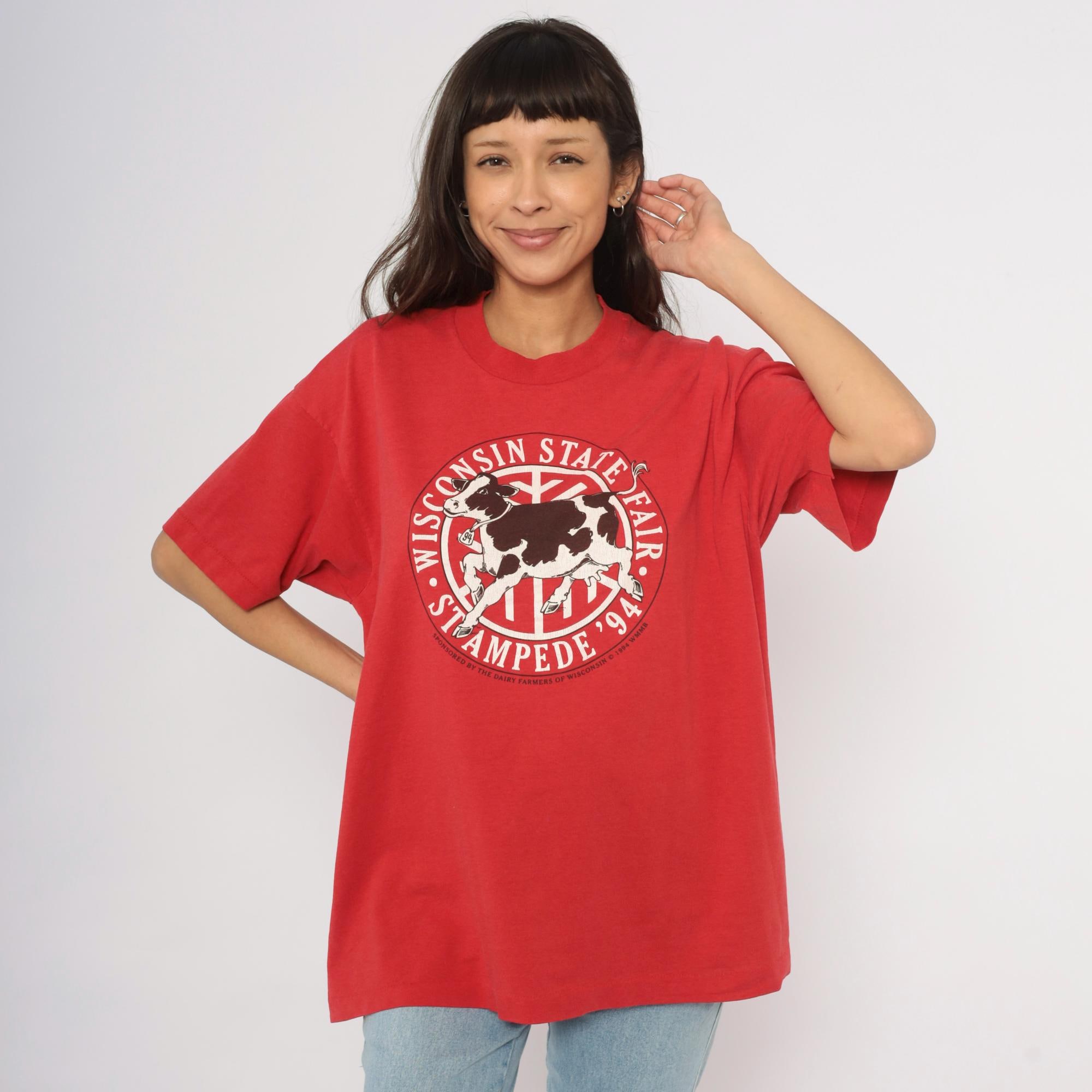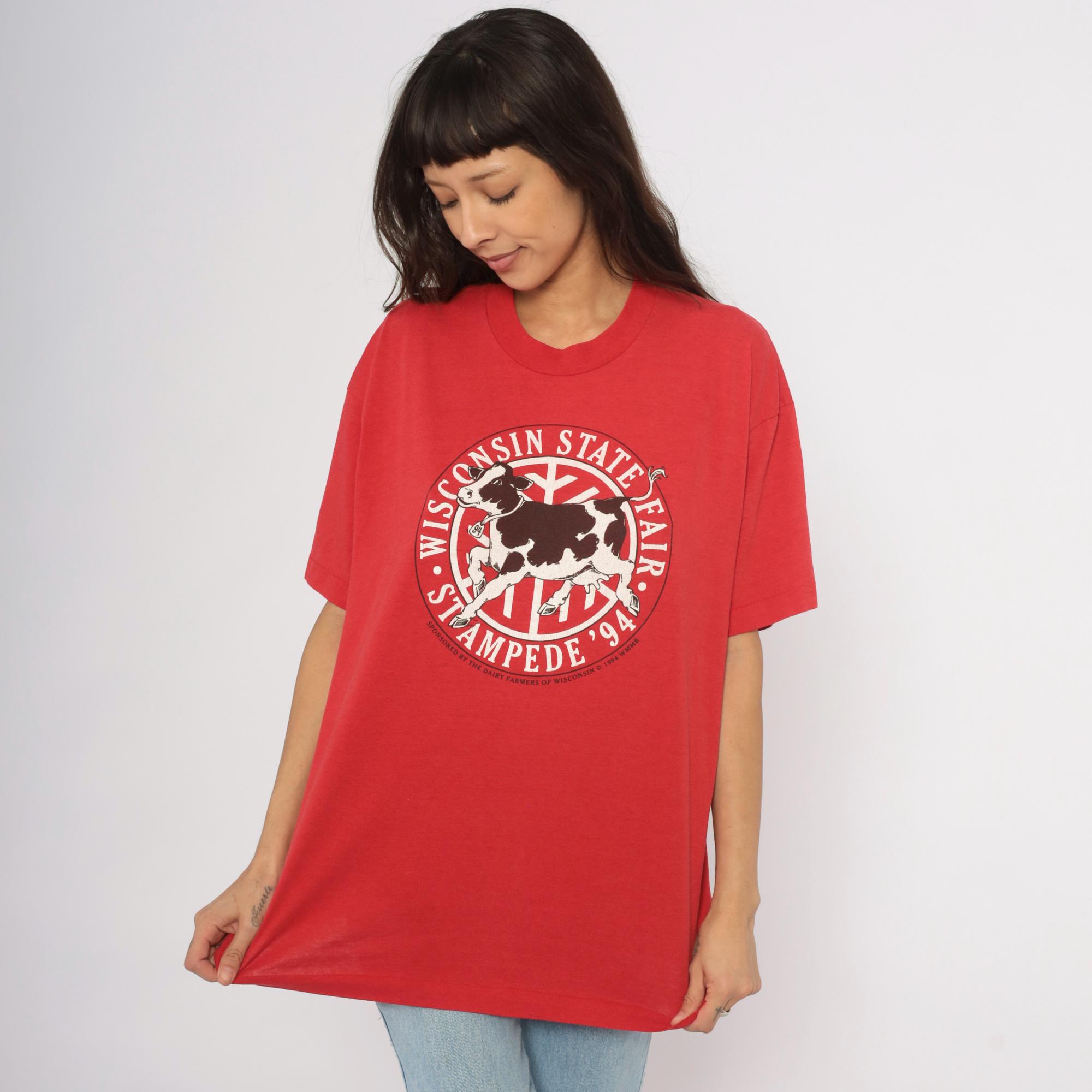 Red 90s graphic tee from the Wisconsin State Fair Stampede '94, with a large circular logo on the chest depicting a black and white Holstein cow in mid-stride. "Wisconsin State Fair" arcs across the top of the circle and "Stampede '94" curves along the bottom, with "Sponsored by the Dairy Farmers of Wisconsin © 1994 WMMB" printed beneath.