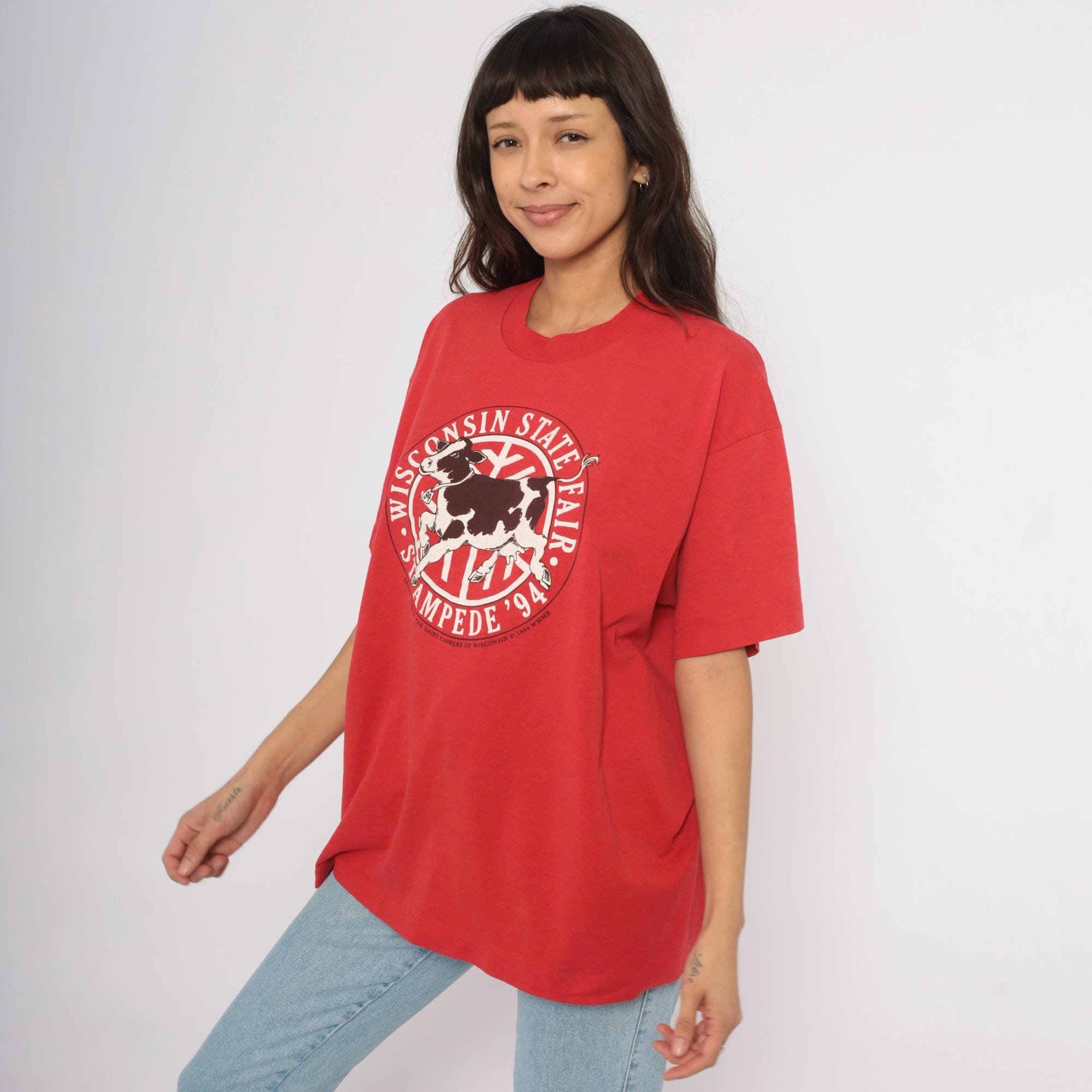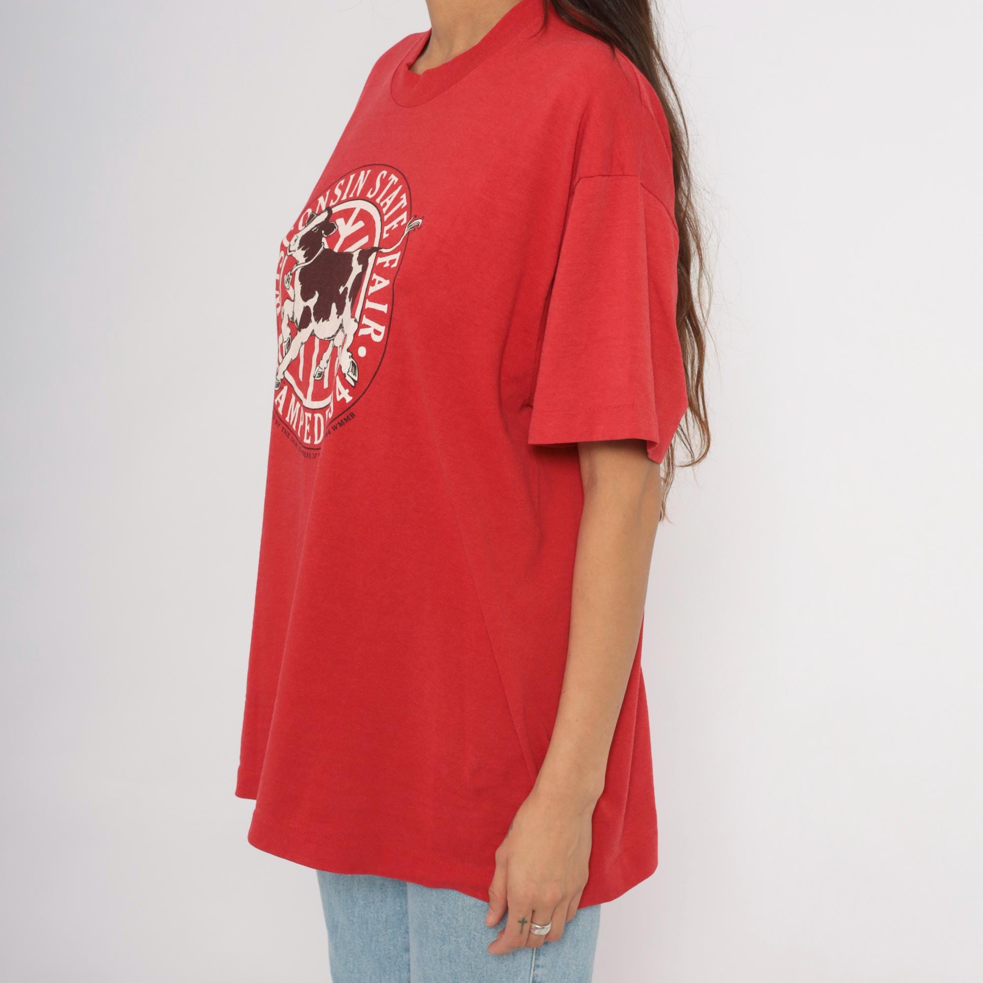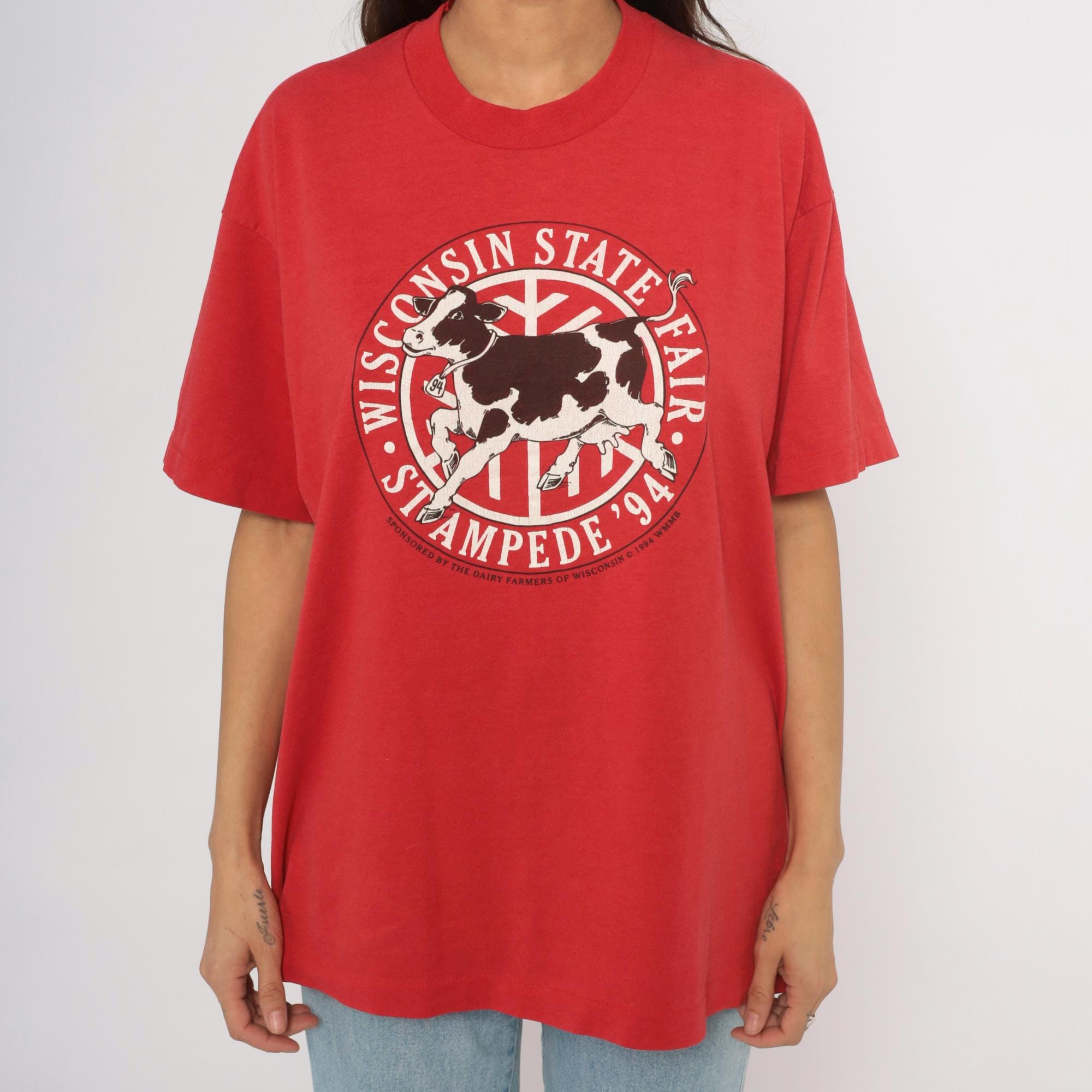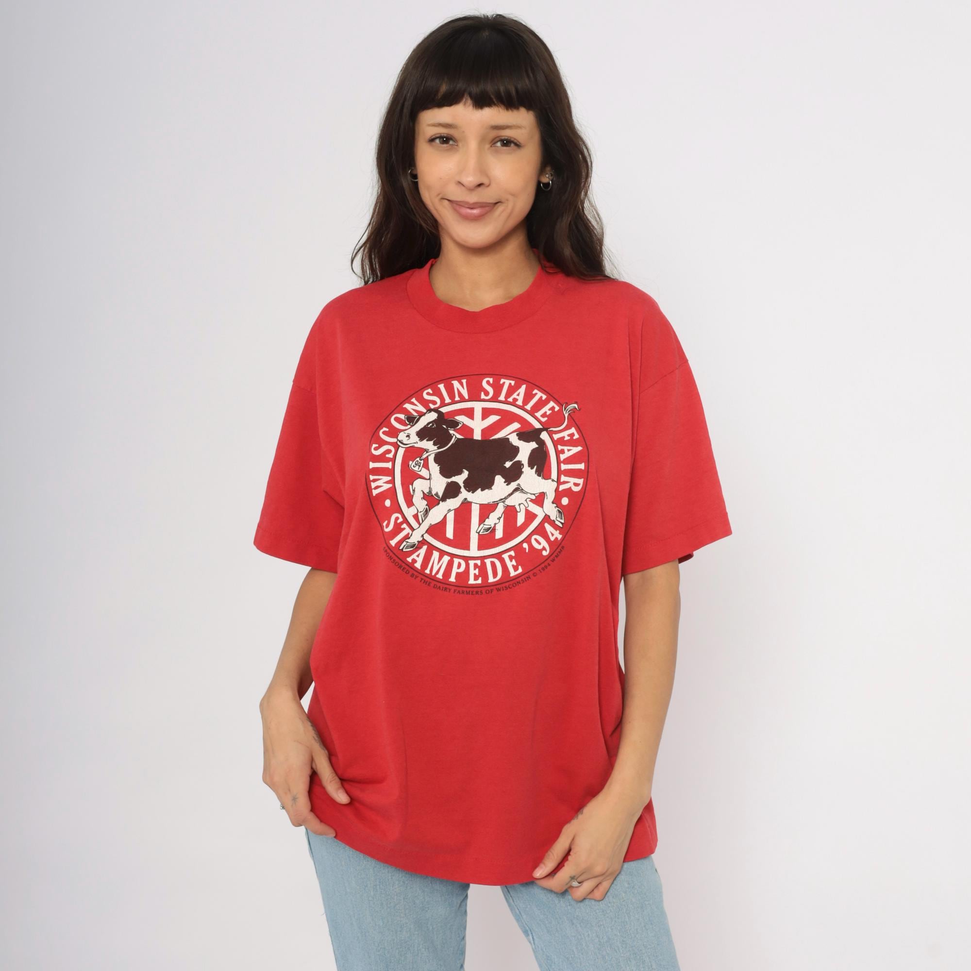 Red 90s graphic tee from the Wisconsin State Fair Stampede '94, with a large circular logo on the chest depicting a black and white Holstein cow in mid-stride. "Wisconsin State Fair" arcs across the top of the circle and "Stampede '94" curves along the bottom, with "Sponsored by the Dairy Farmers of Wisconsin © 1994 WMMB" printed beneath.