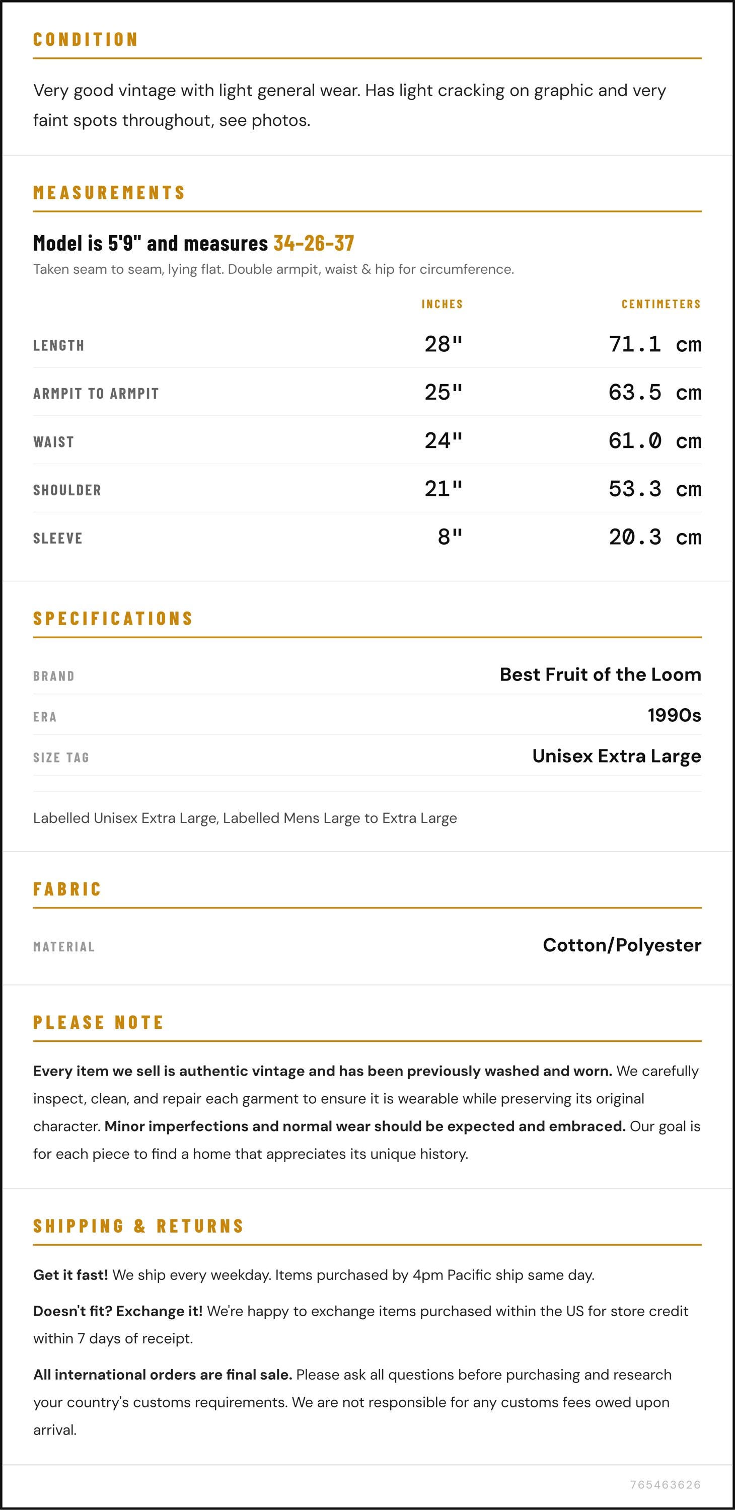 Condition: Very good vintage with light general wear. Has light cracking on graphic and very faint spots throughout, see photos.