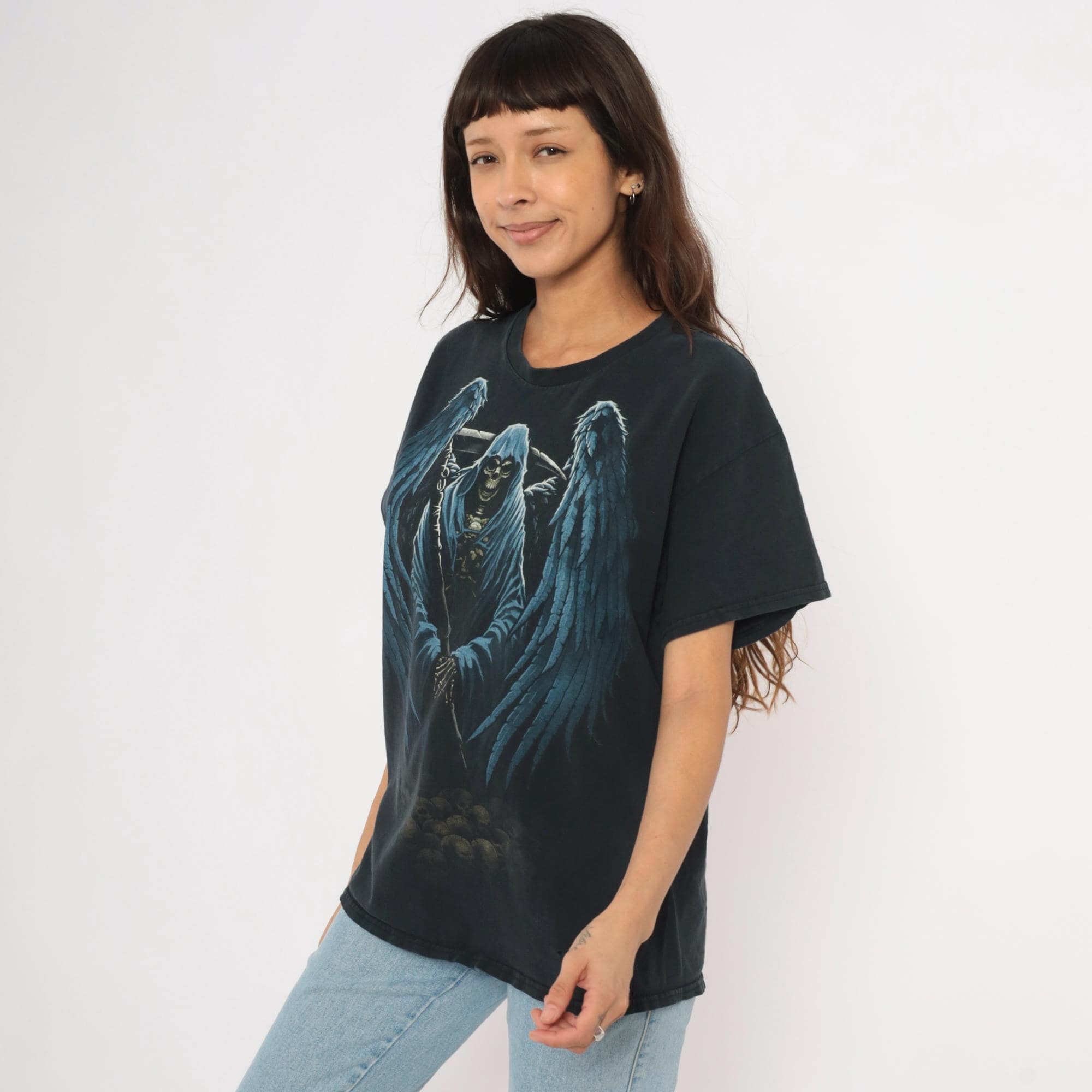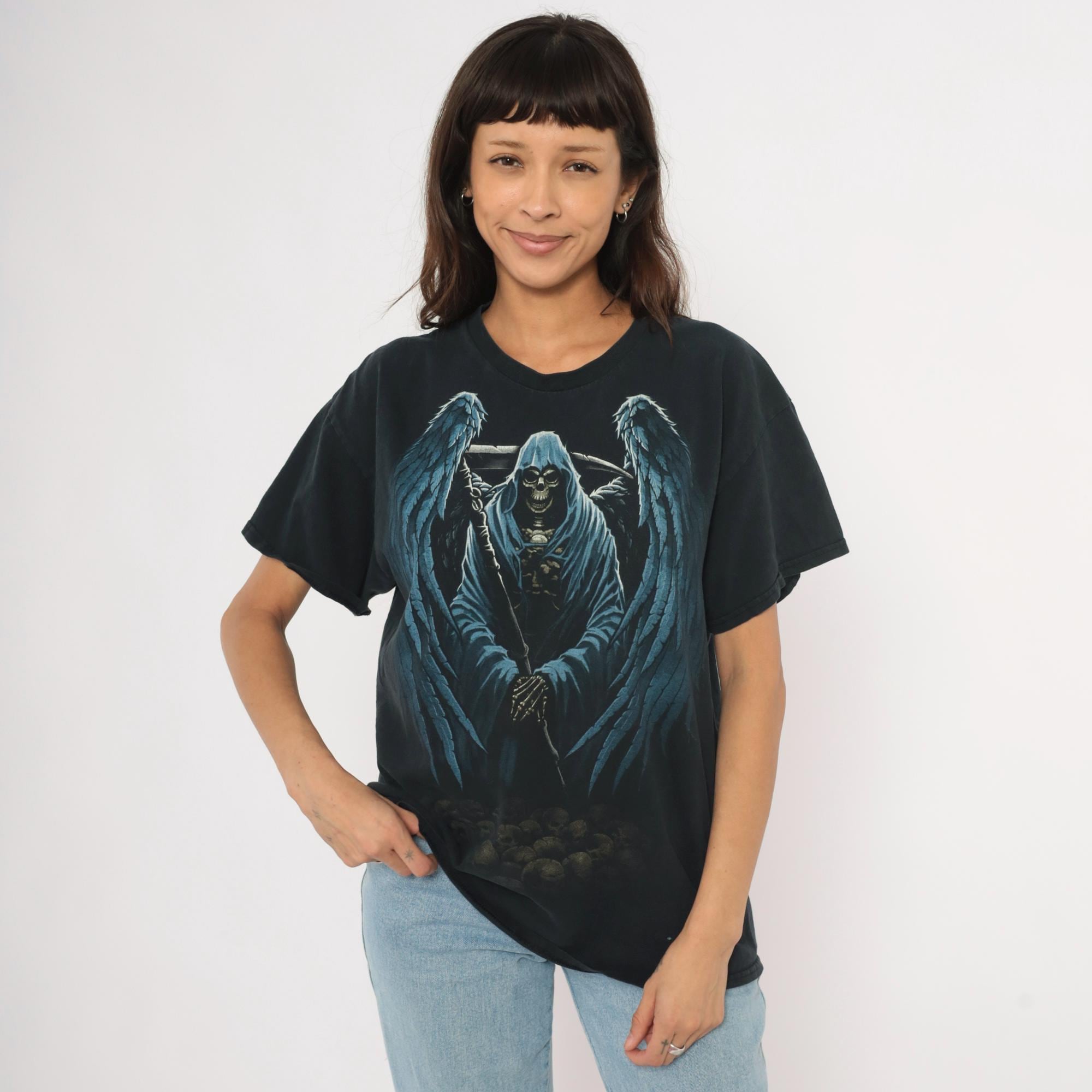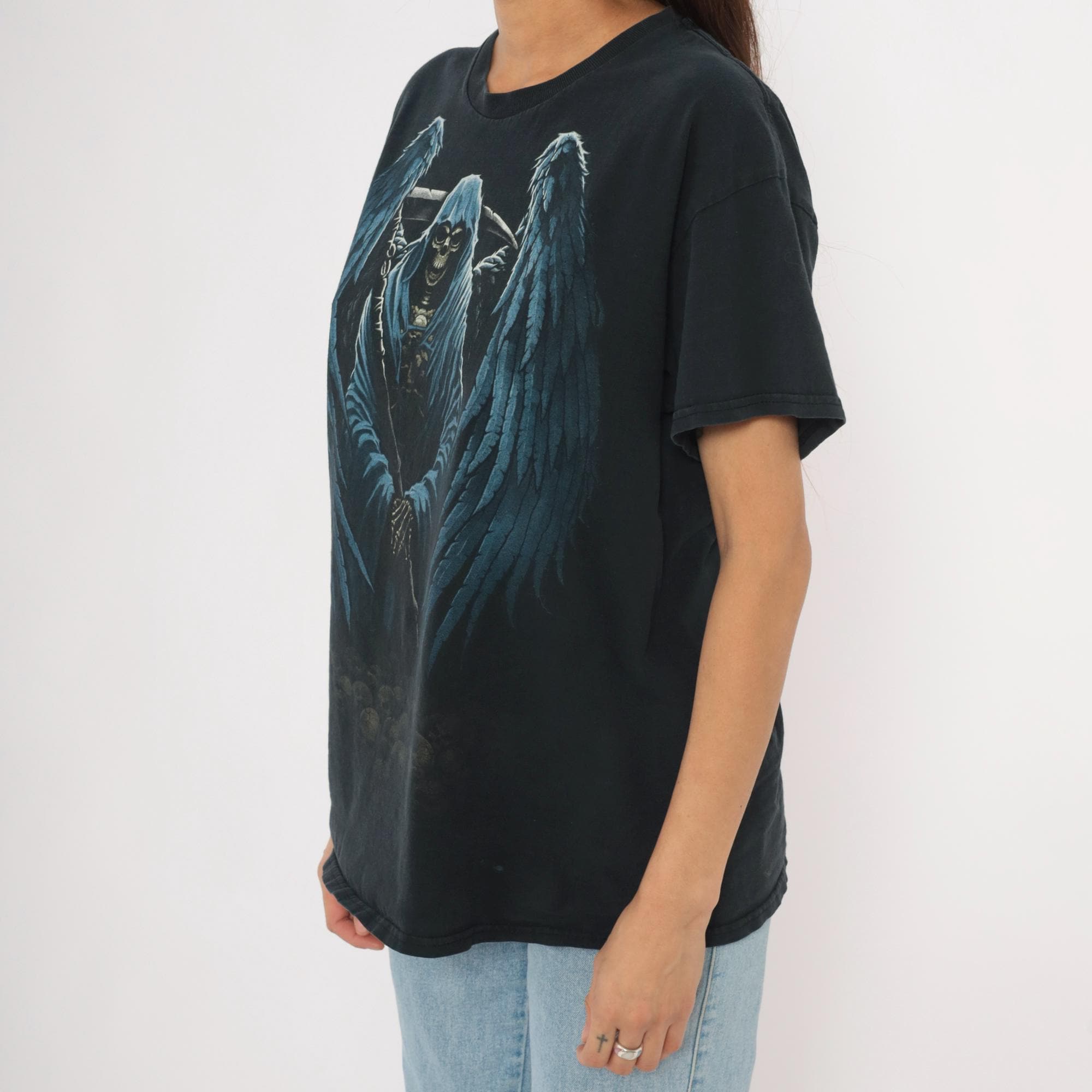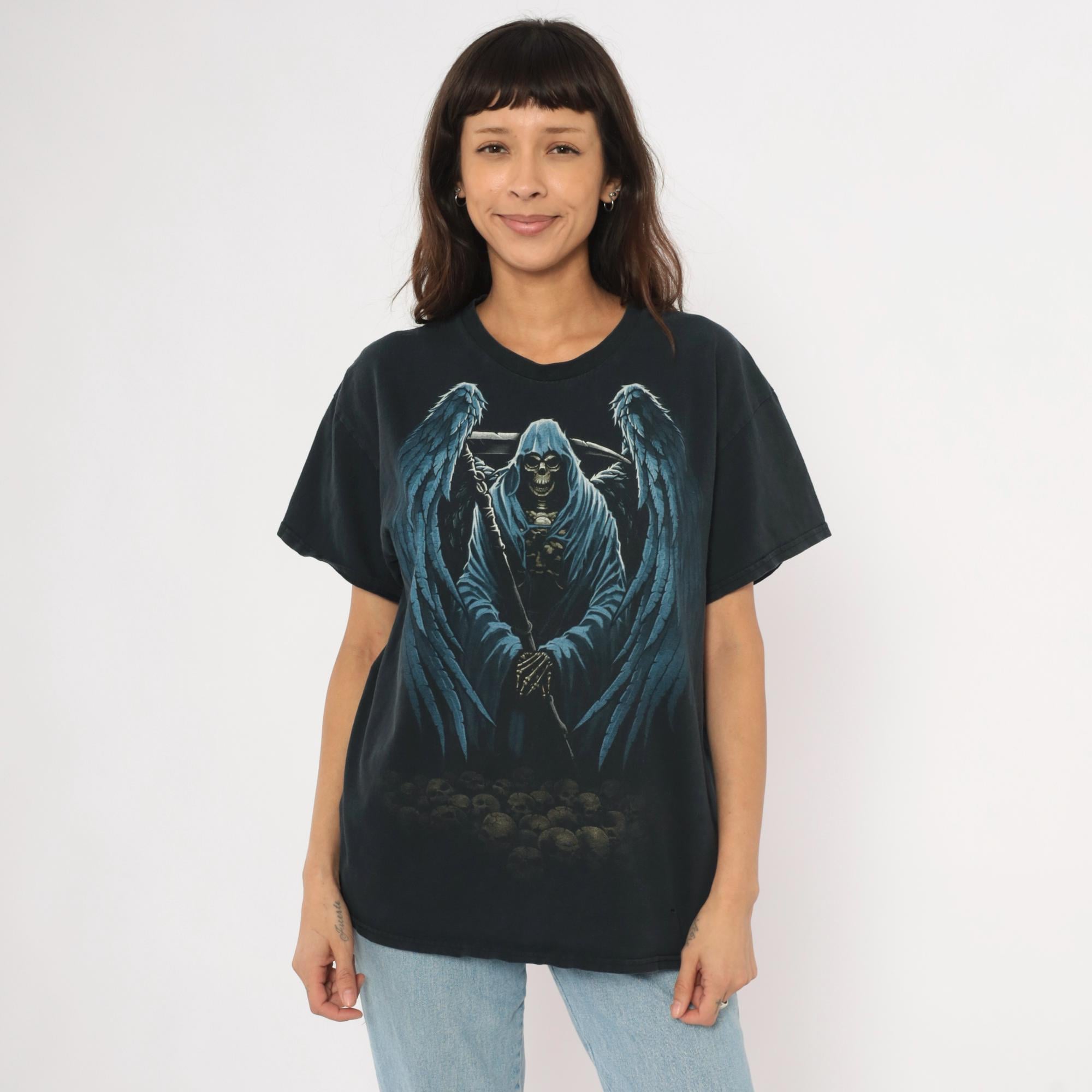 2000s black Gildan graphic tee with a large winged grim reaper angel of death printed across the front in blue and gray tones. Hooded skeleton figure holding a scythe with outstretched feathered wings, standing over a pile of skulls at the base. Crew neck, short sleeves, and a plain back with no print.