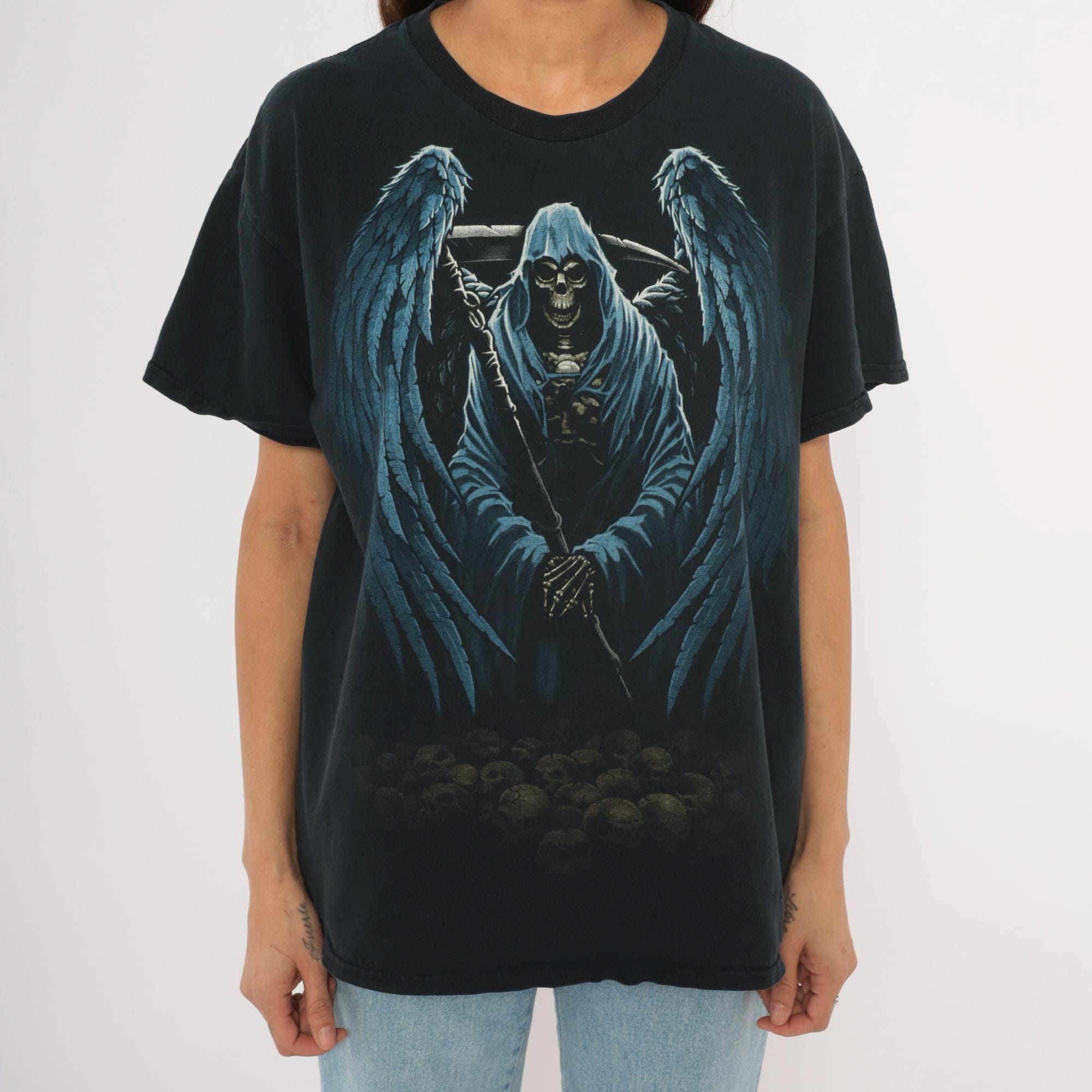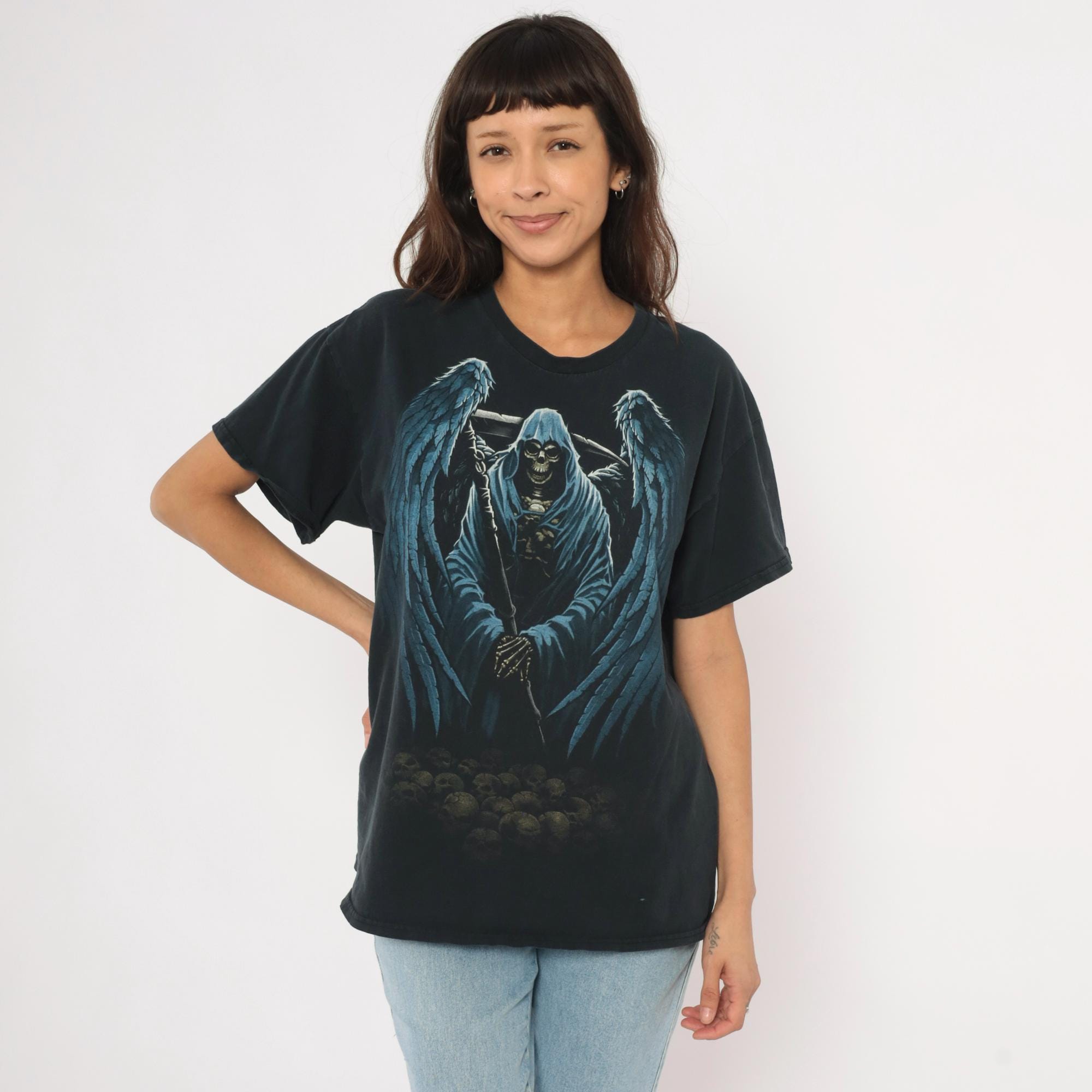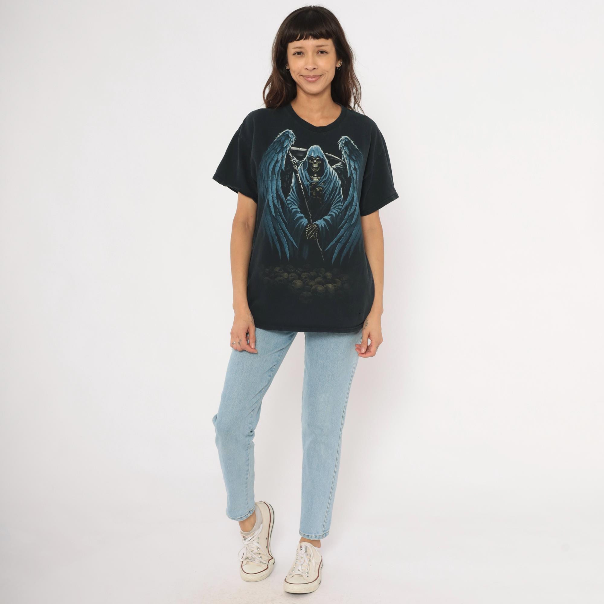 2000s black Gildan graphic tee with a large winged grim reaper angel of death printed across the front in blue and gray tones. Hooded skeleton figure holding a scythe with outstretched feathered wings, standing over a pile of skulls at the base. Crew neck, short sleeves, and a plain back with no print.