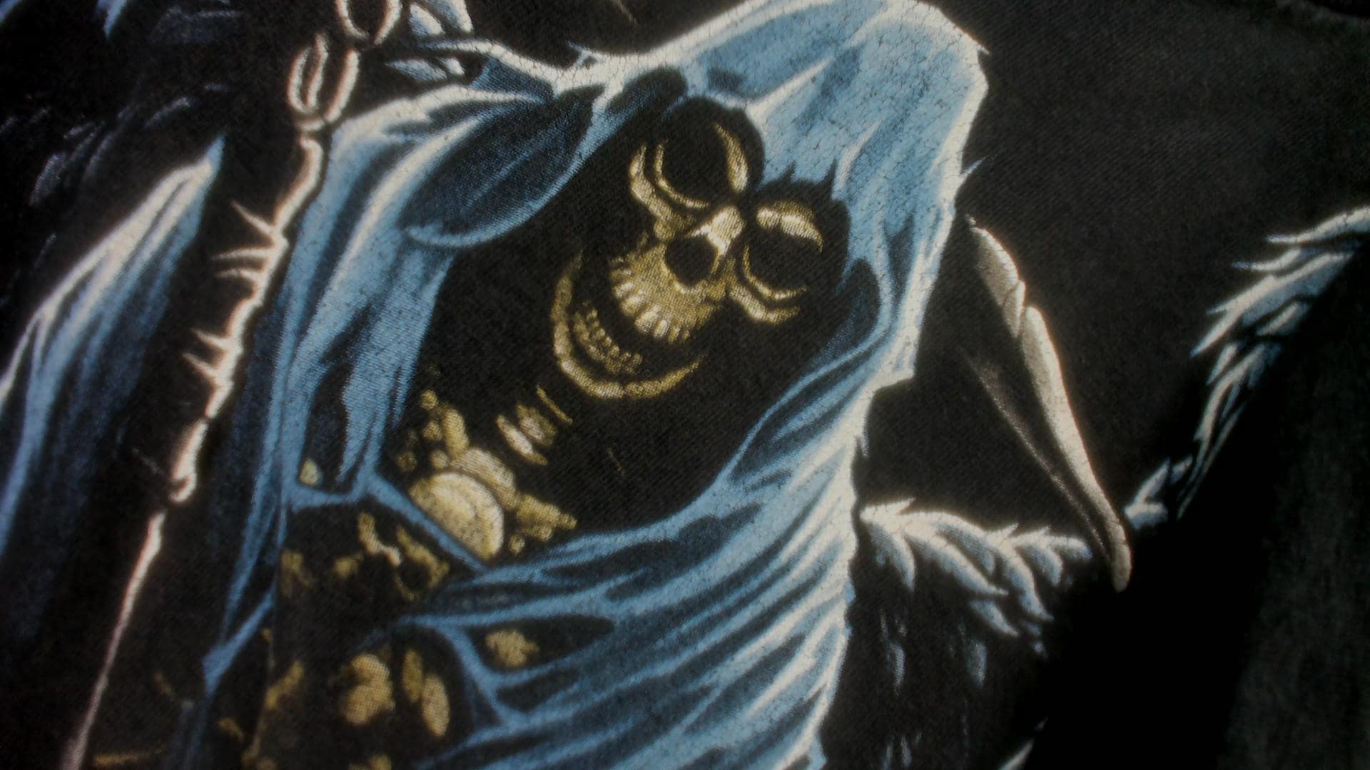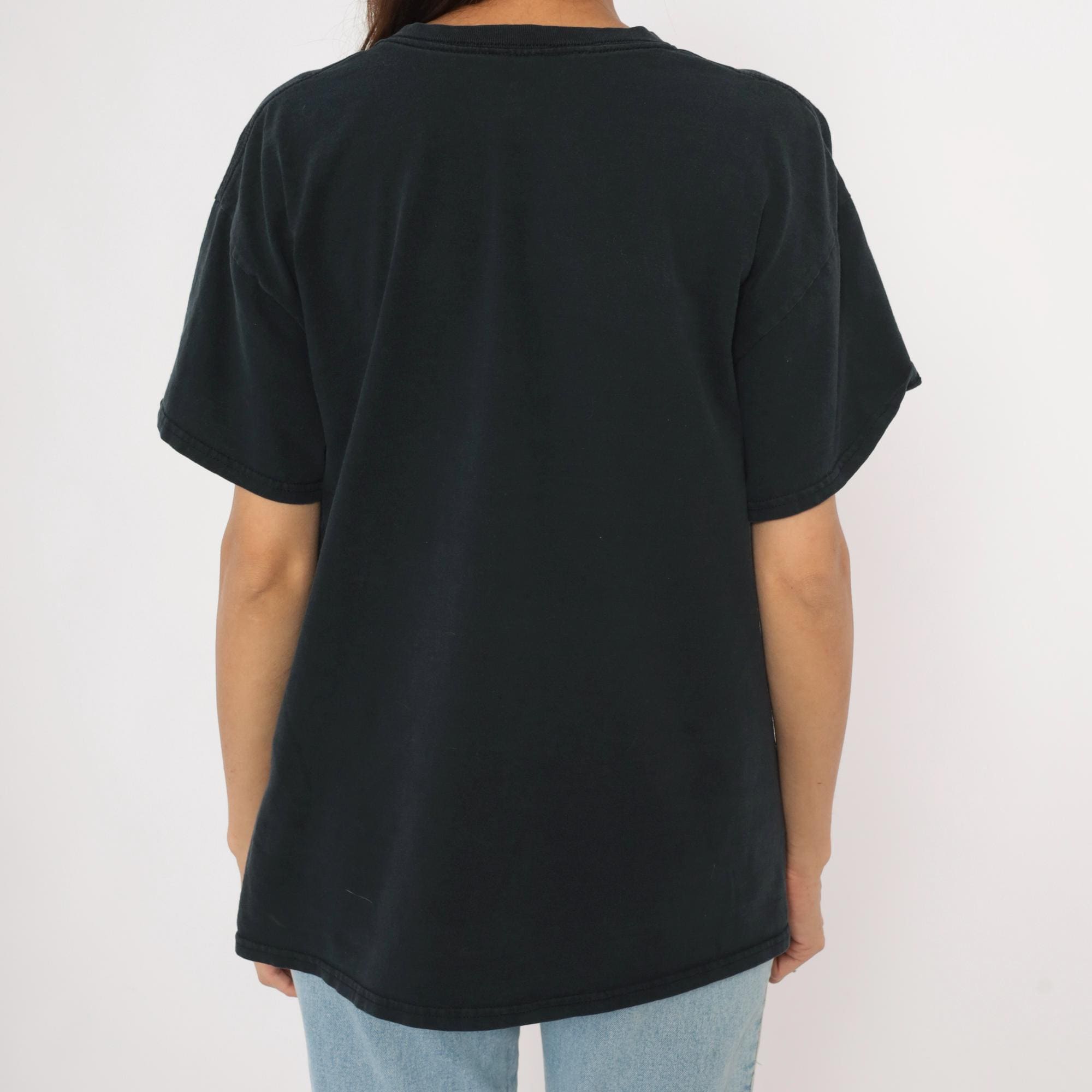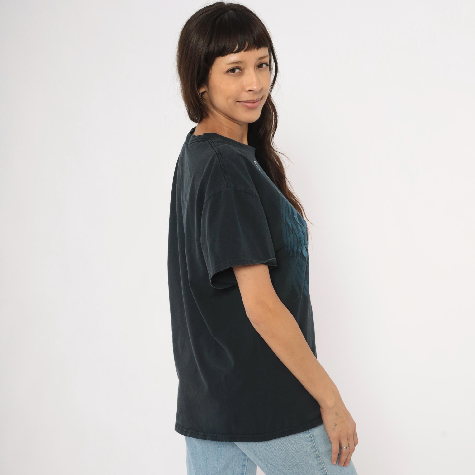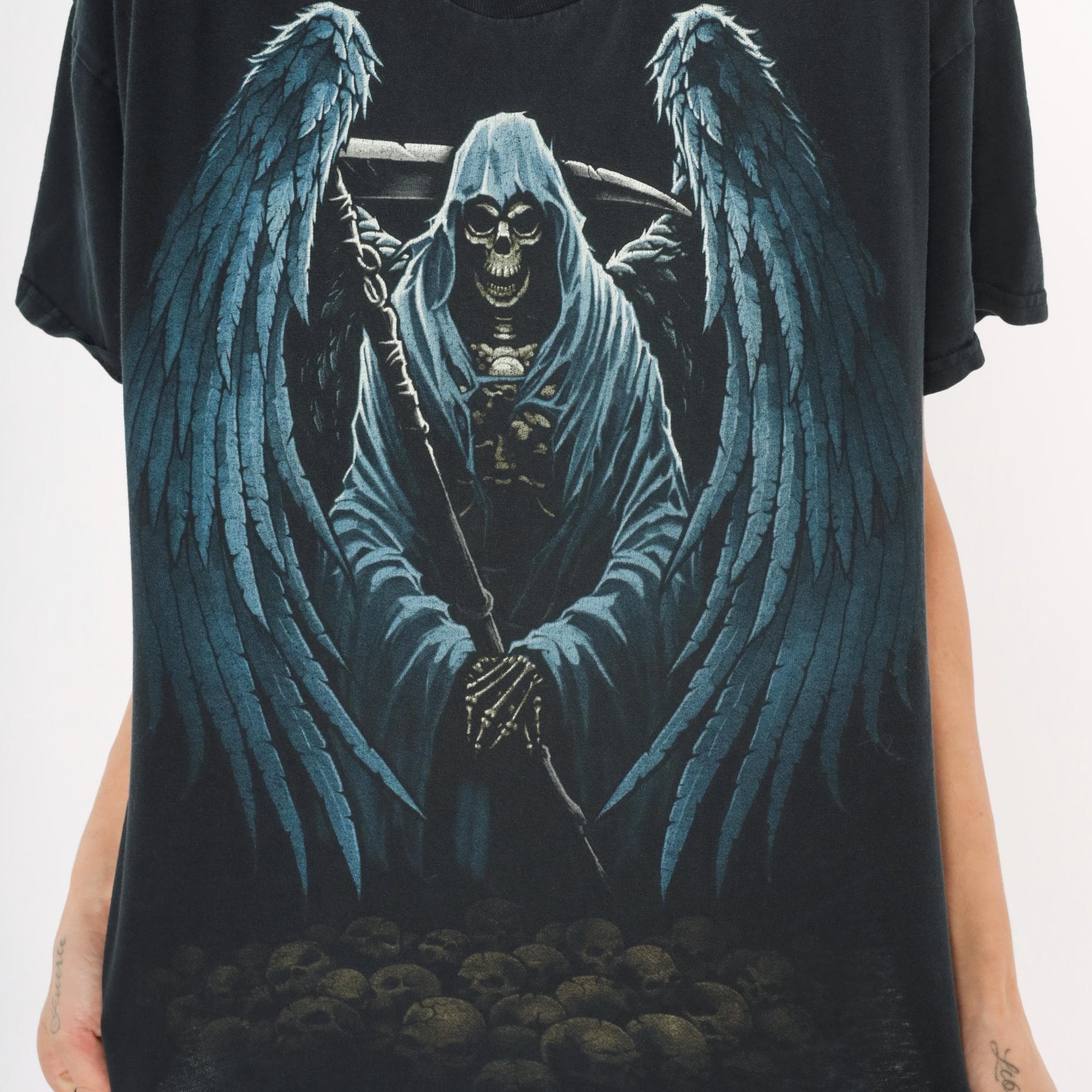 2000s black Gildan graphic tee with a large winged grim reaper angel of death printed across the front in blue and gray tones. Hooded skeleton figure holding a scythe with outstretched feathered wings, standing over a pile of skulls at the base. Crew neck, short sleeves, and a plain back with no print.