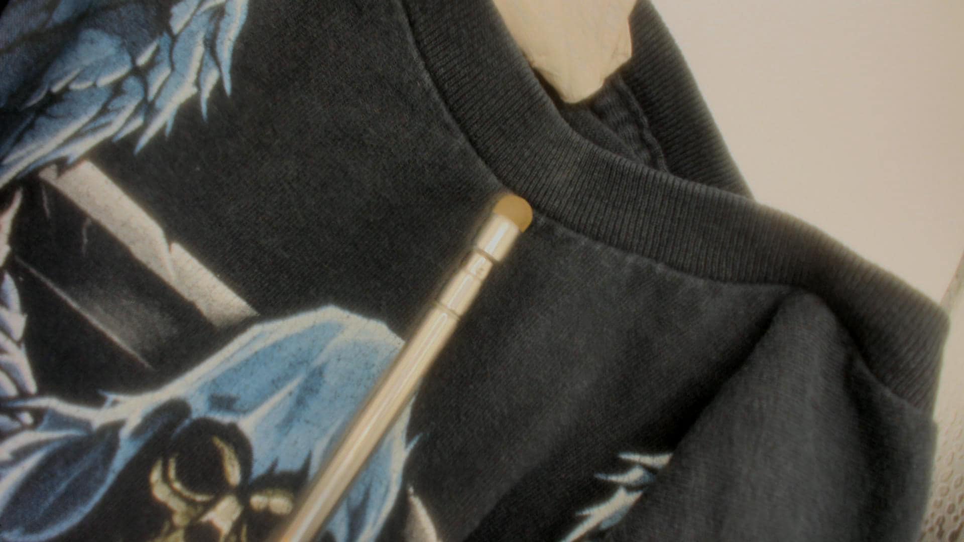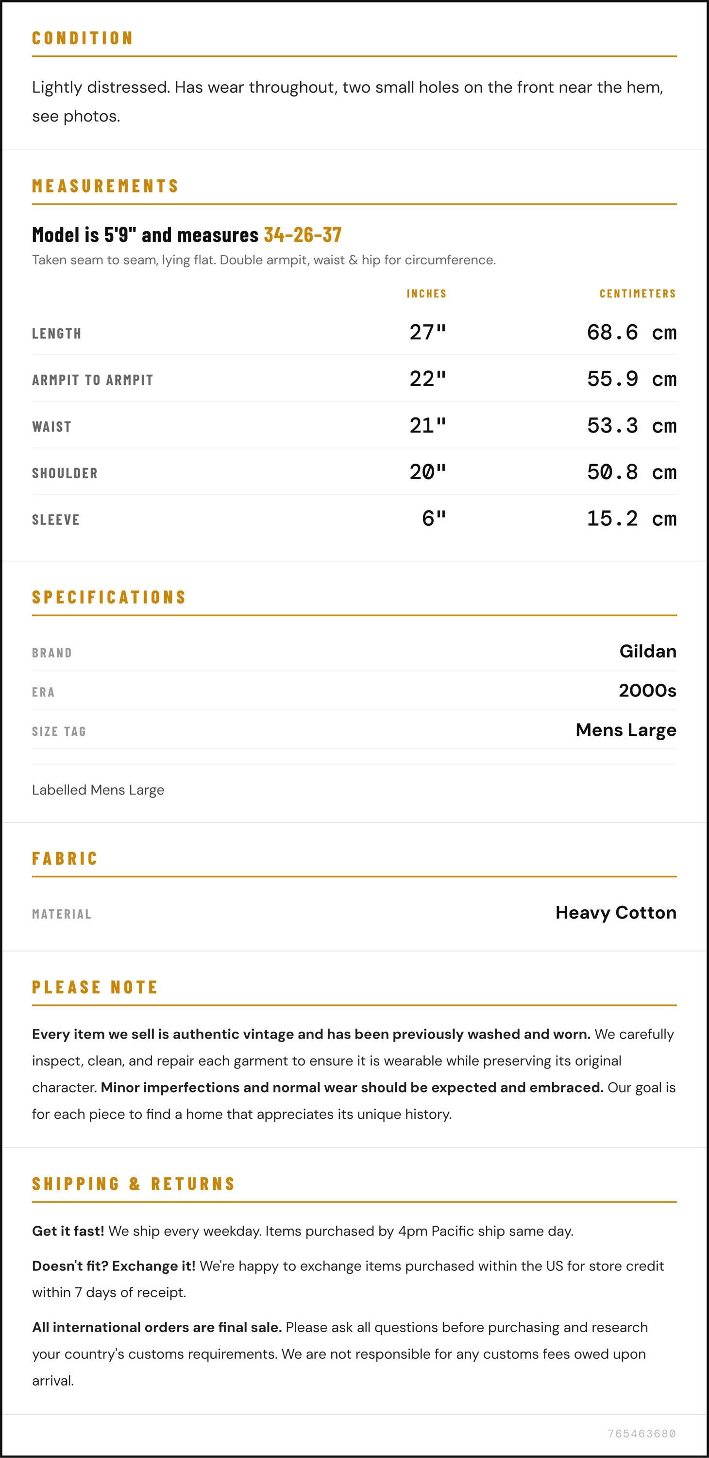 Condition: Lightly distressed. Has wear throughout, two small holes on the front near the hem, see photos.