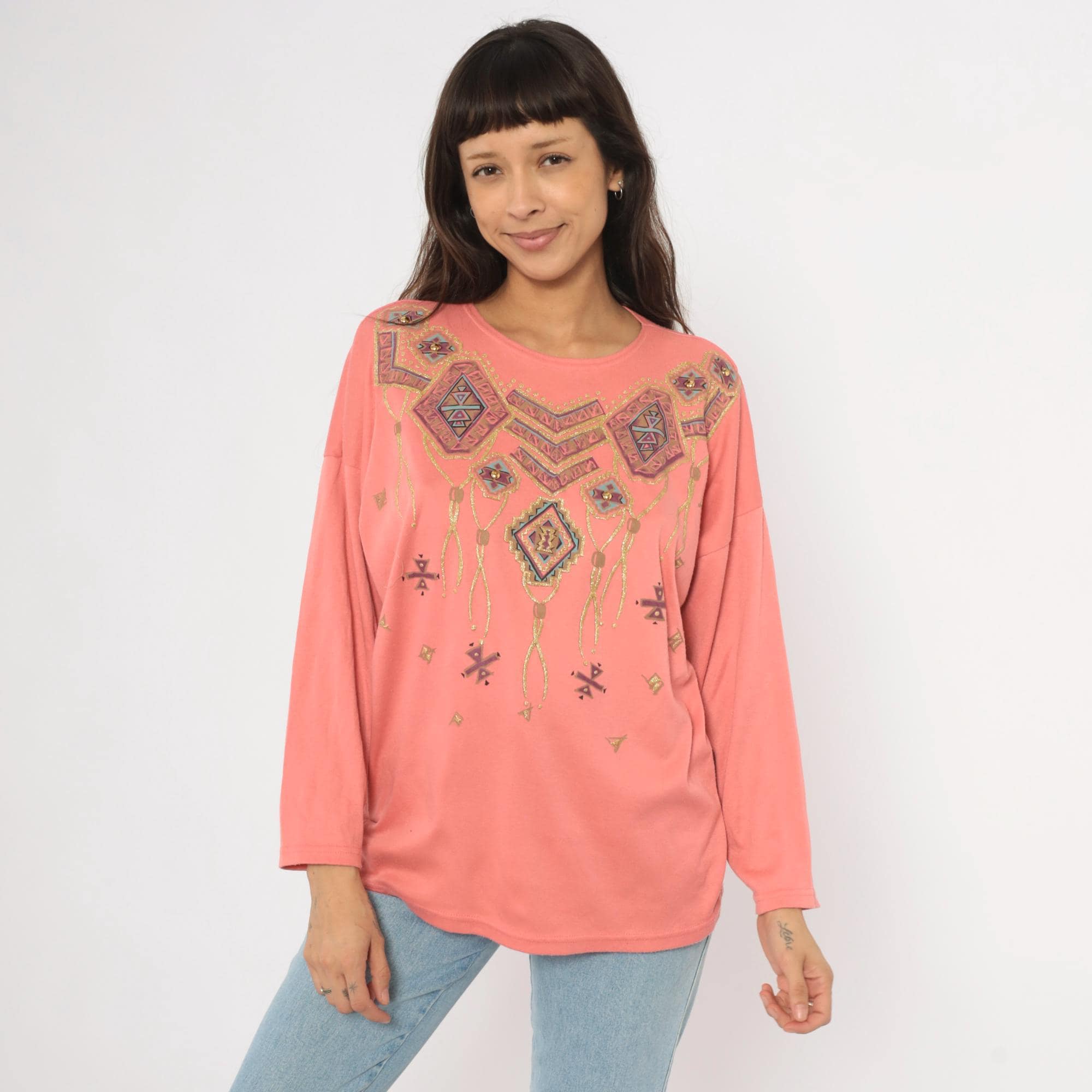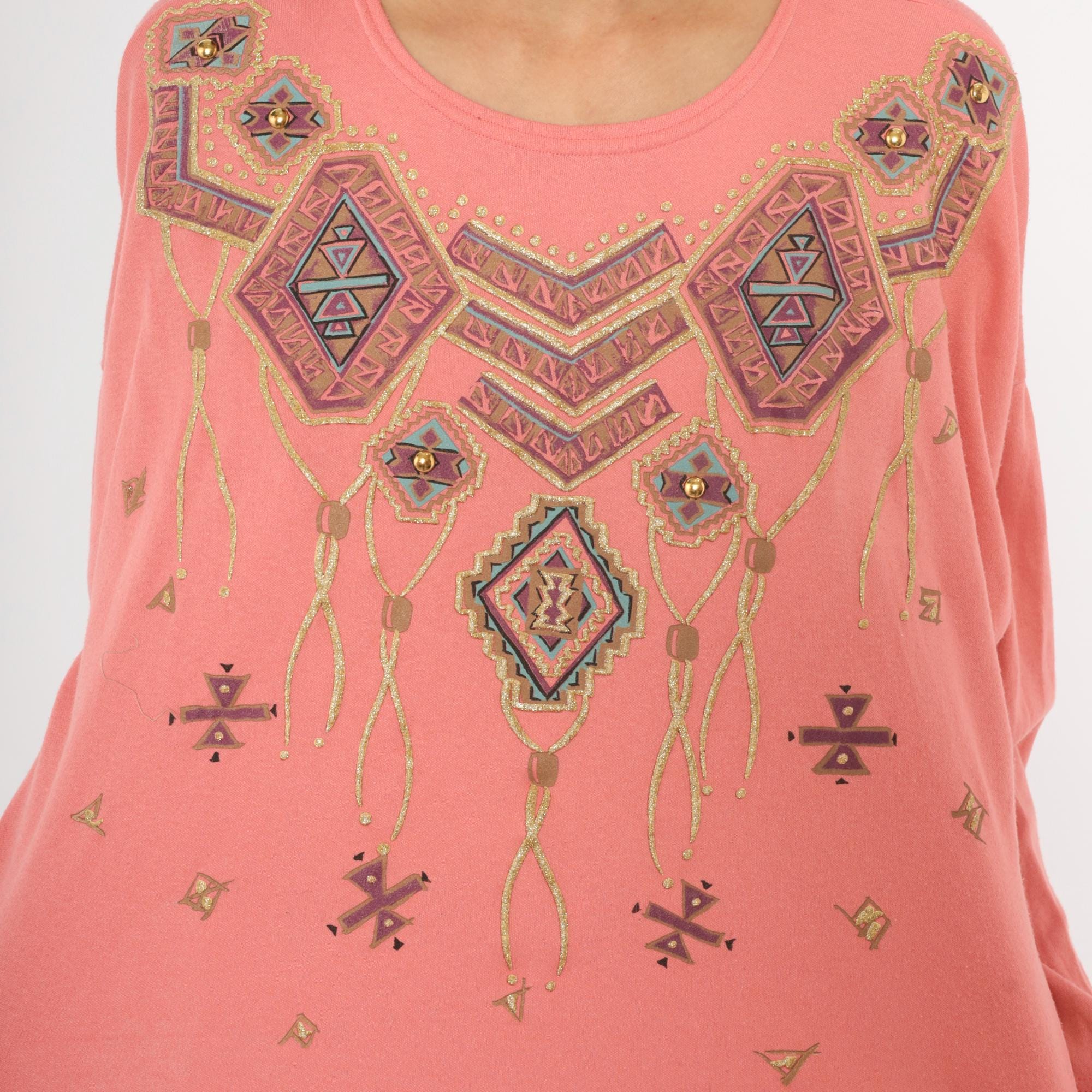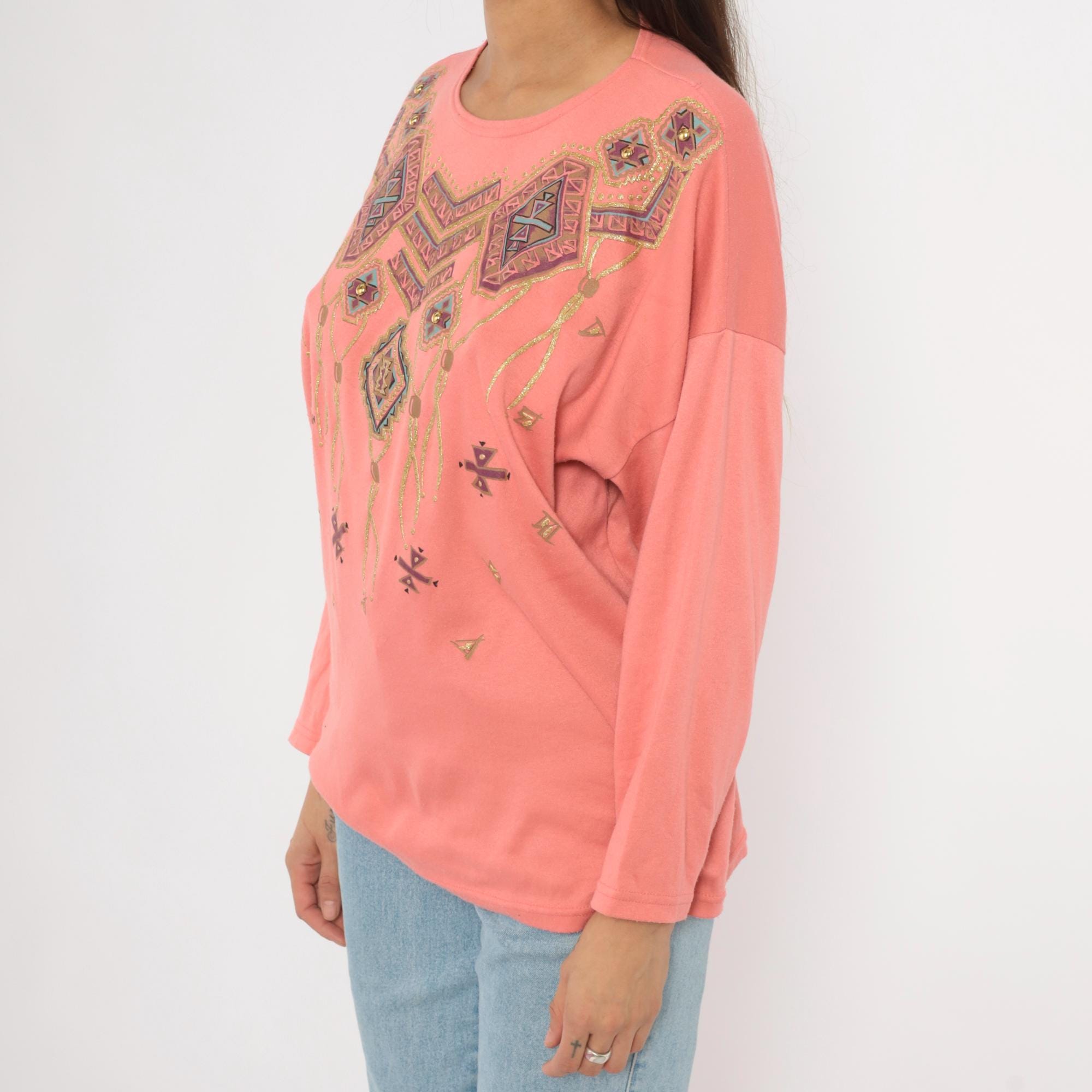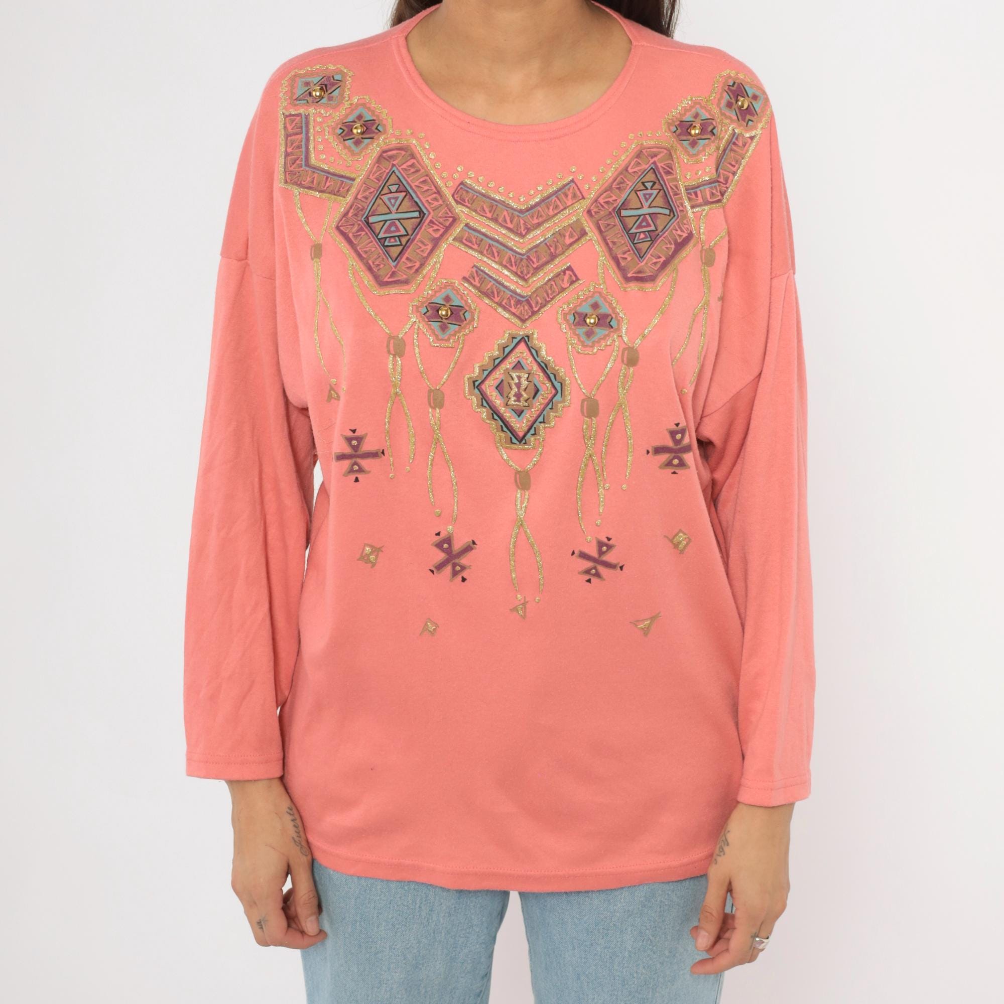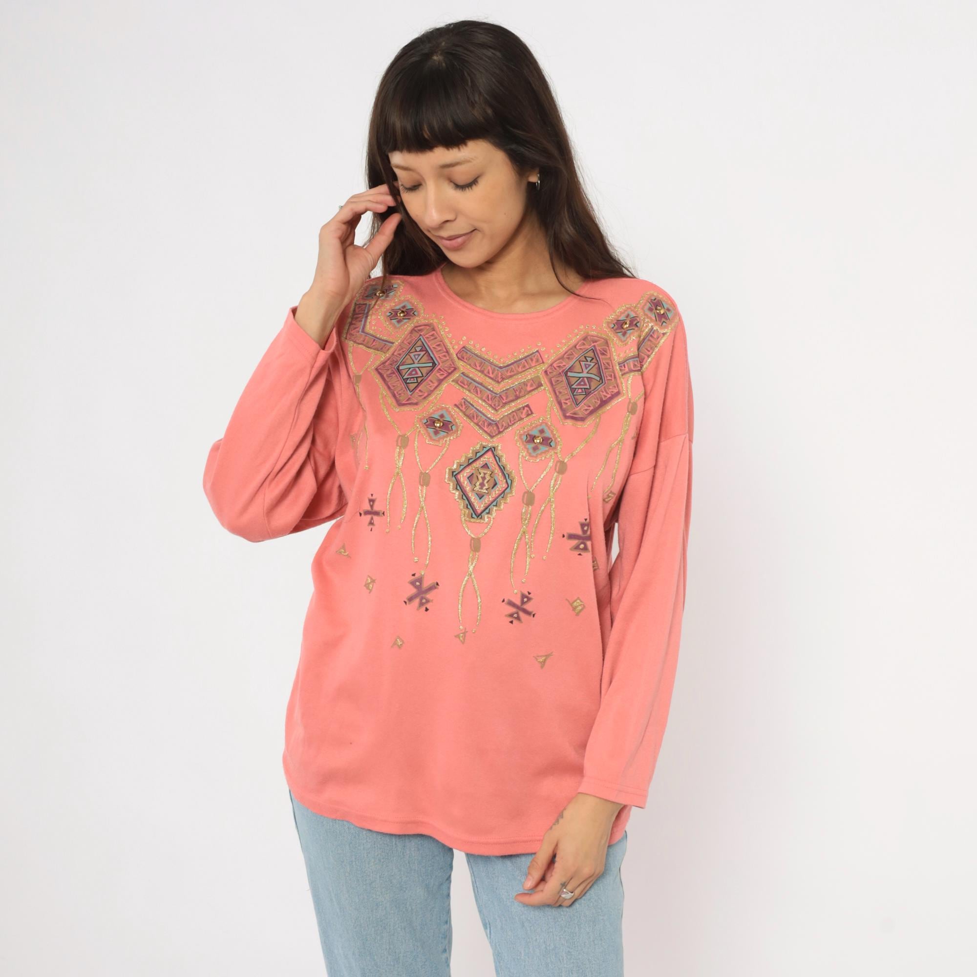 Coral pink 90s crewneck pullover from Sassy Sport with a large Southwestern-inspired necklace graphic across the chest and shoulders. Diamond and cross motifs in purple, blue, and mauve with gold metallic accents and gold dome studs scattered throughout the design.