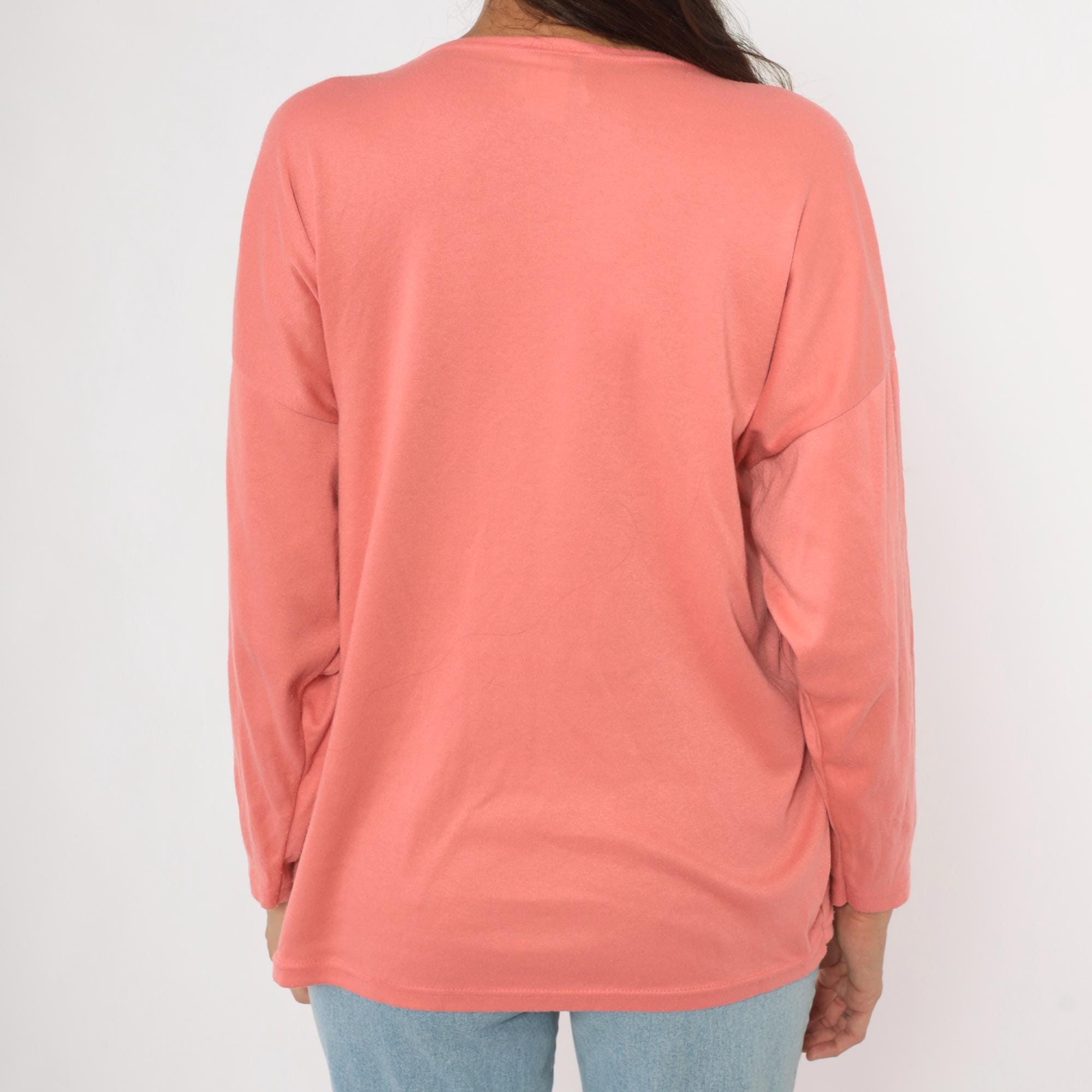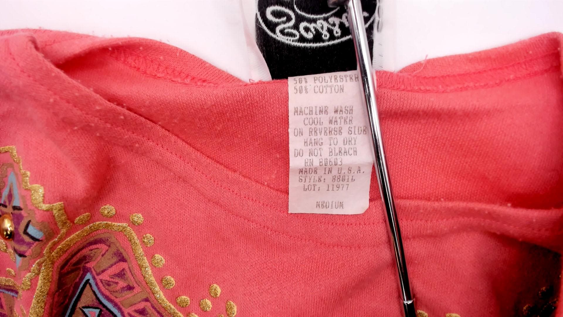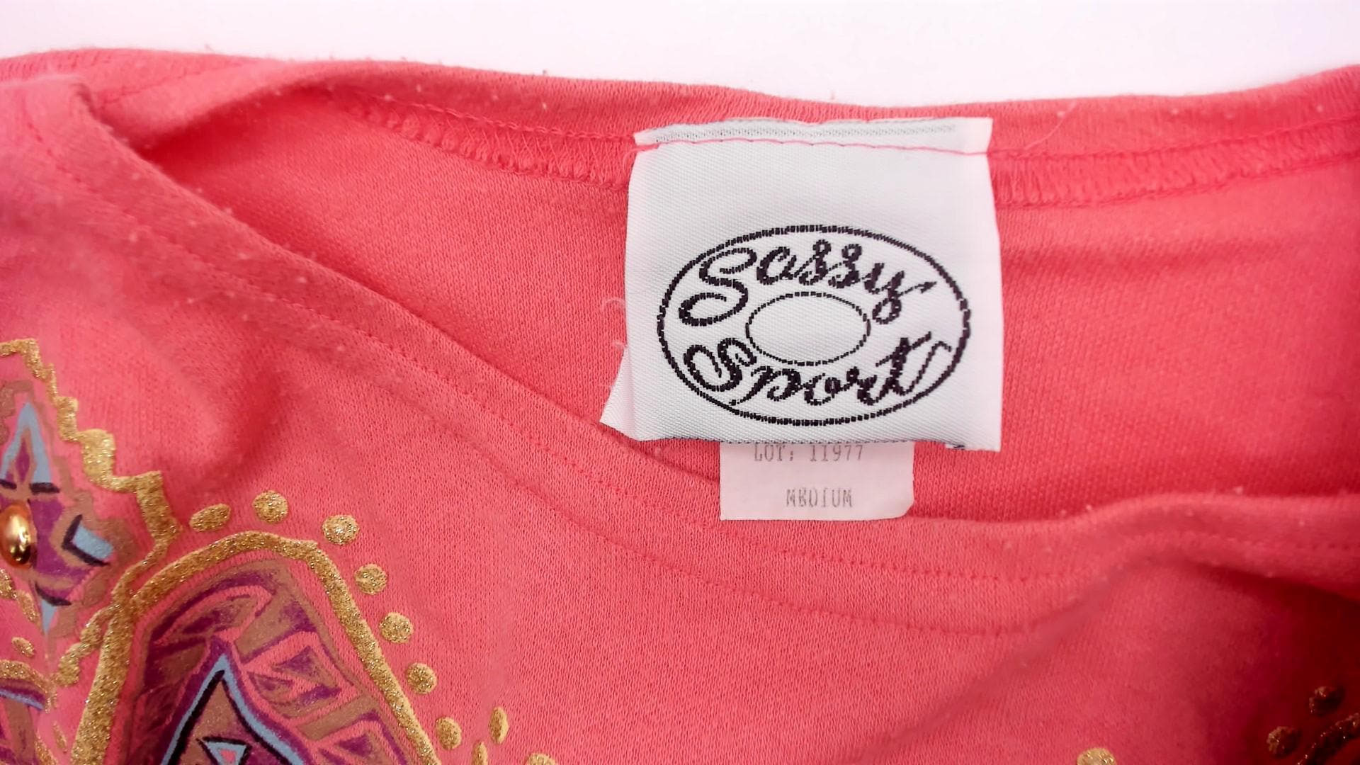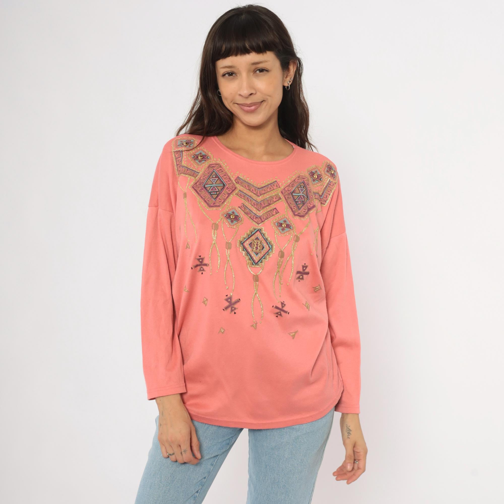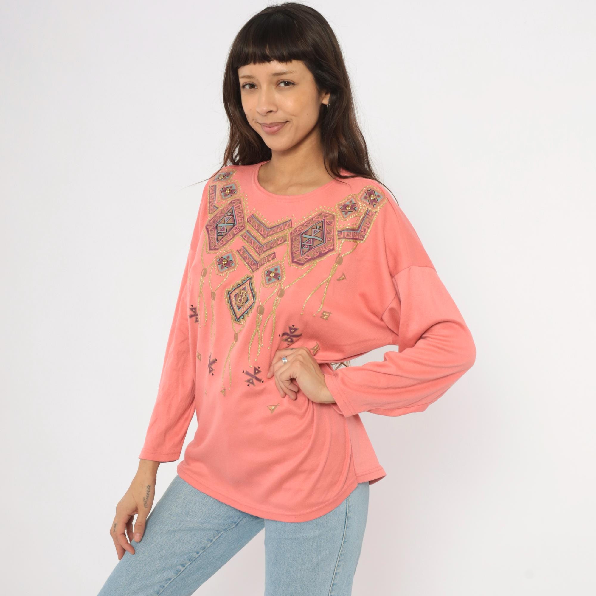 Coral pink 90s crewneck pullover from Sassy Sport with a large Southwestern-inspired necklace graphic across the chest and shoulders. Diamond and cross motifs in purple, blue, and mauve with gold metallic accents and gold dome studs scattered throughout the design.