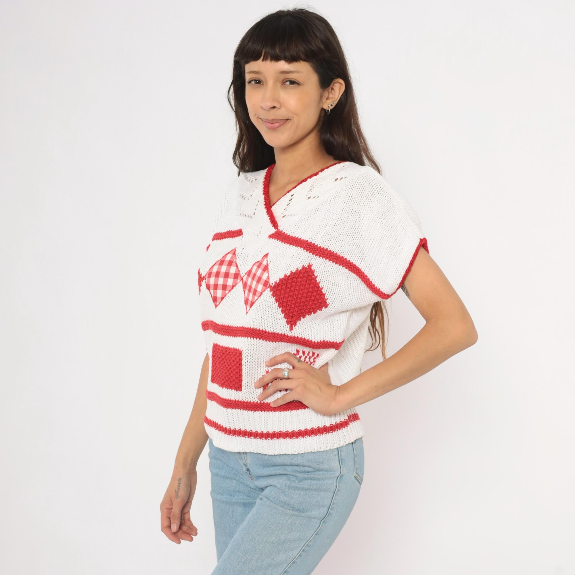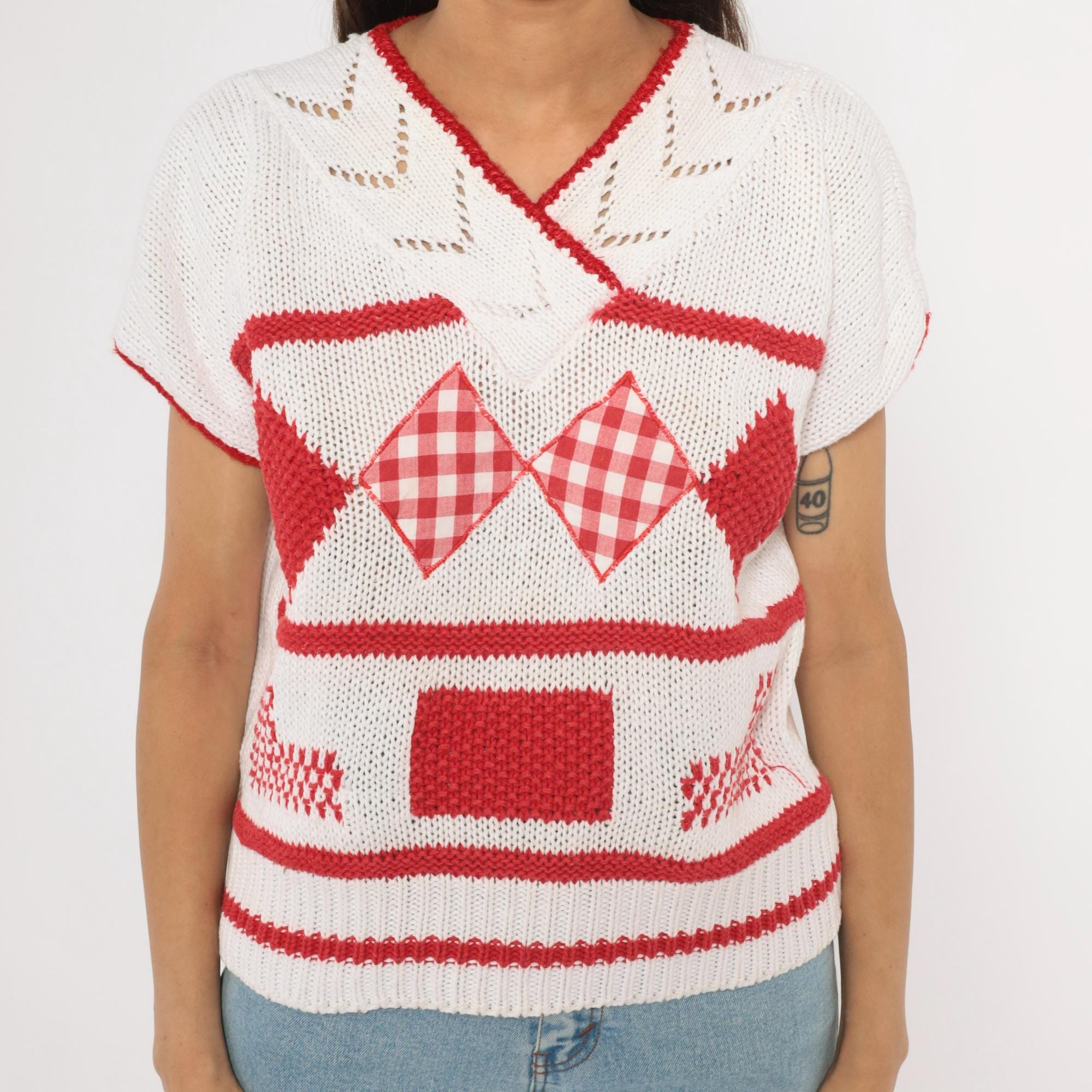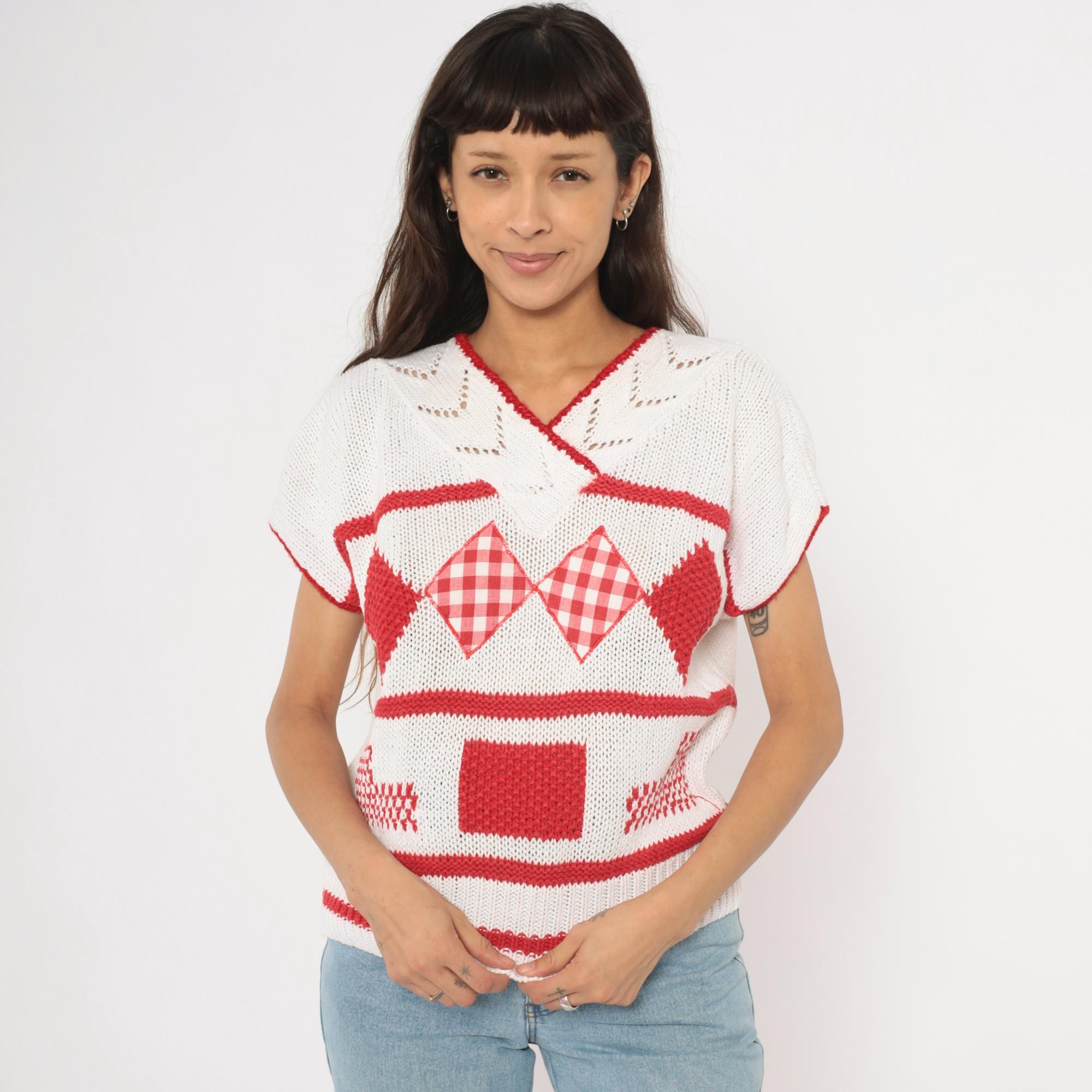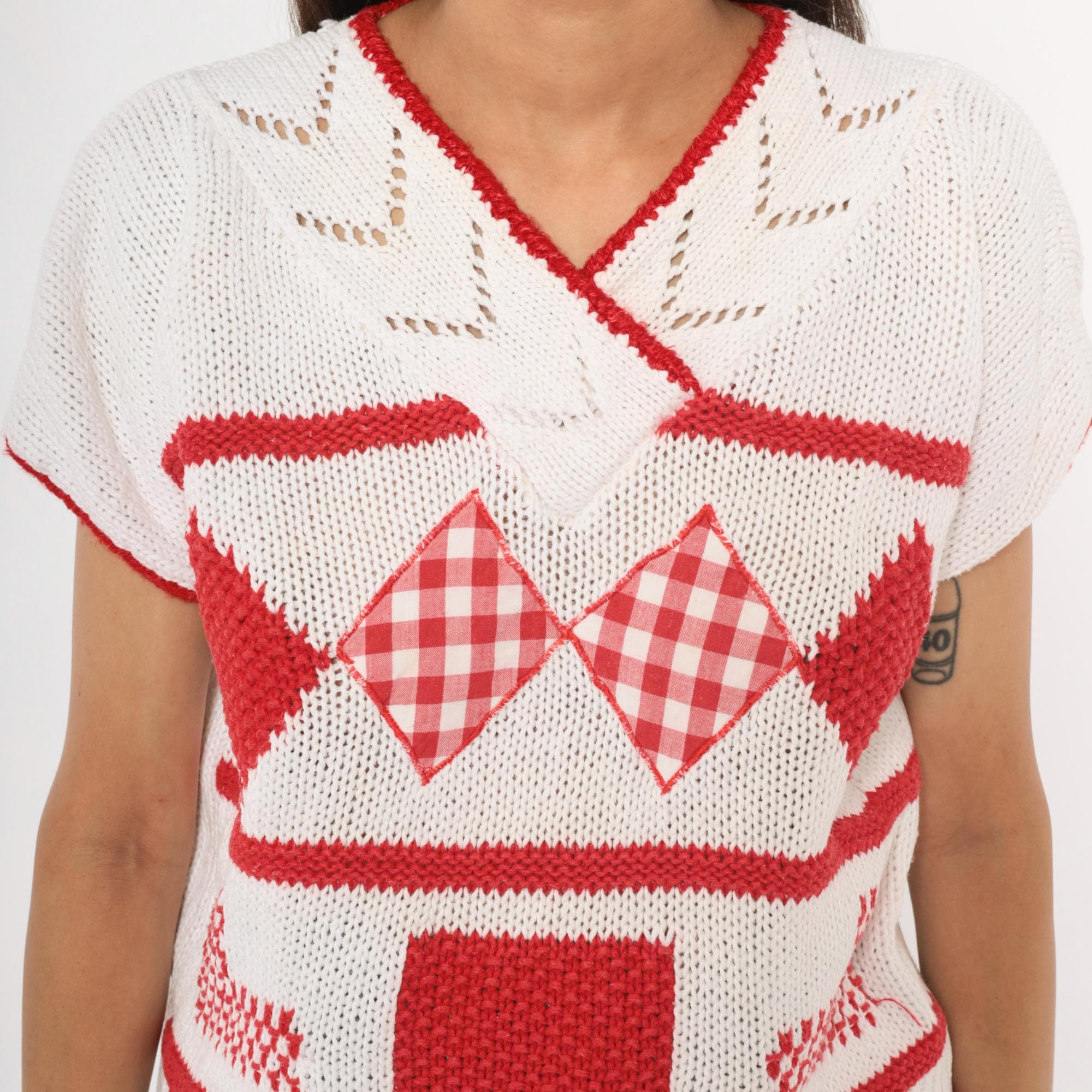80s white and red knit top from SML Sport with a crossover V-neckline trimmed in red. Two gingham fabric diamond patches sit at the chest, surrounded by red knit geometric shapes, a red square pocket detail, and horizontal red stripes. Short cap sleeves with red edging, open pointelle knit detail across the upper chest and shoulders, and a ribbed hem with red accent stripe.